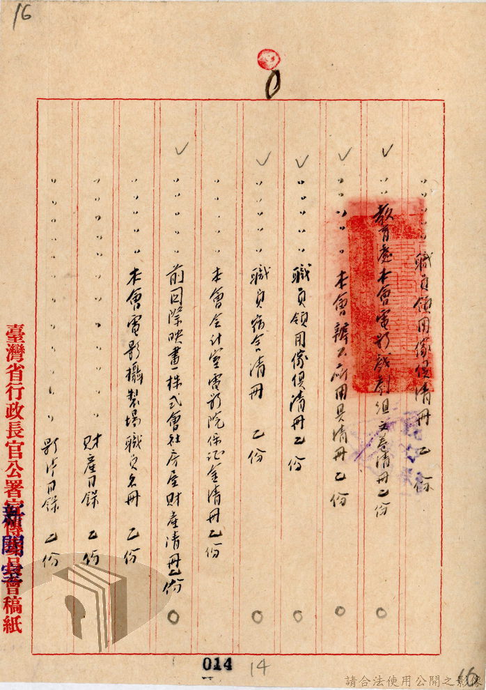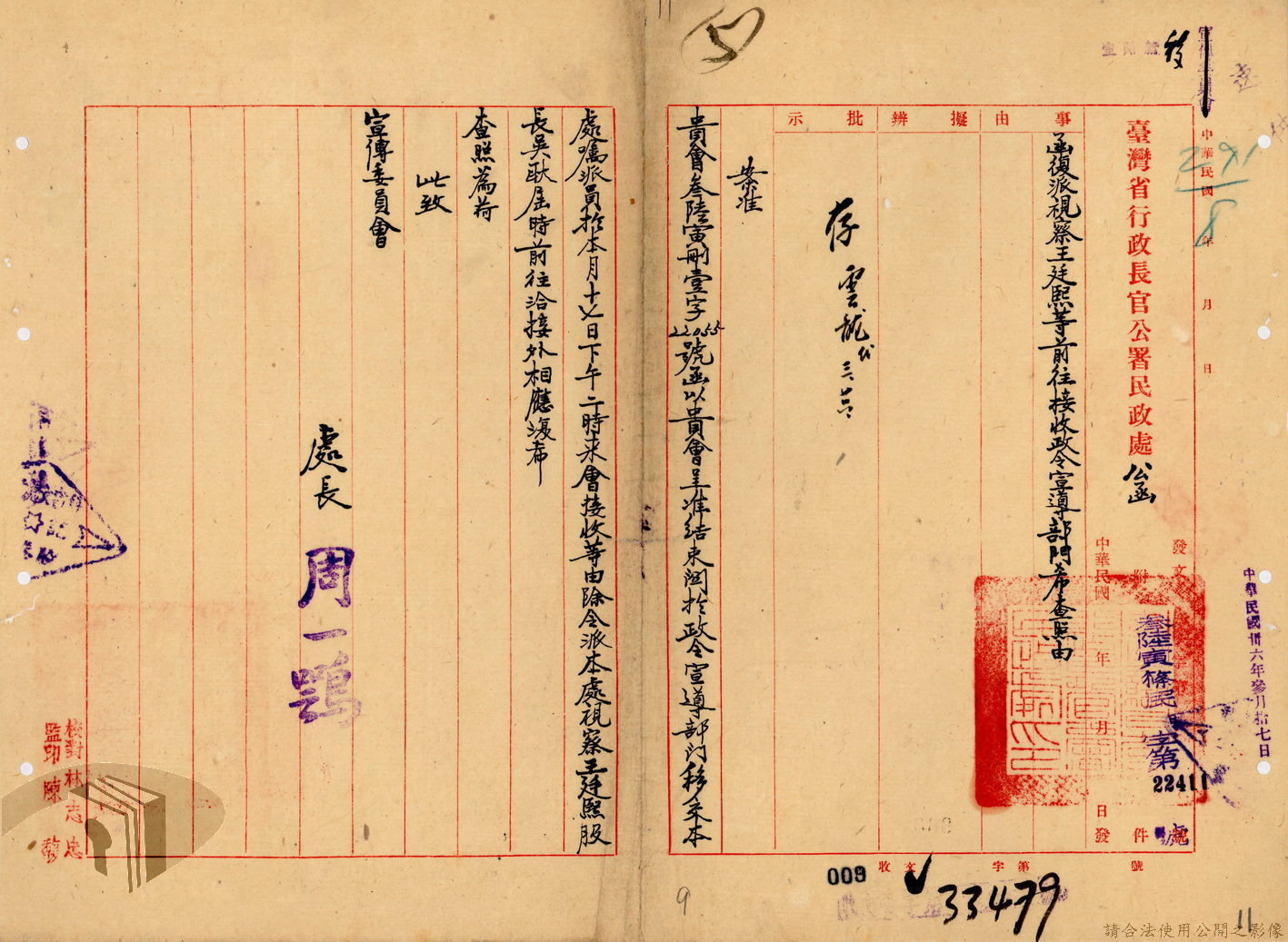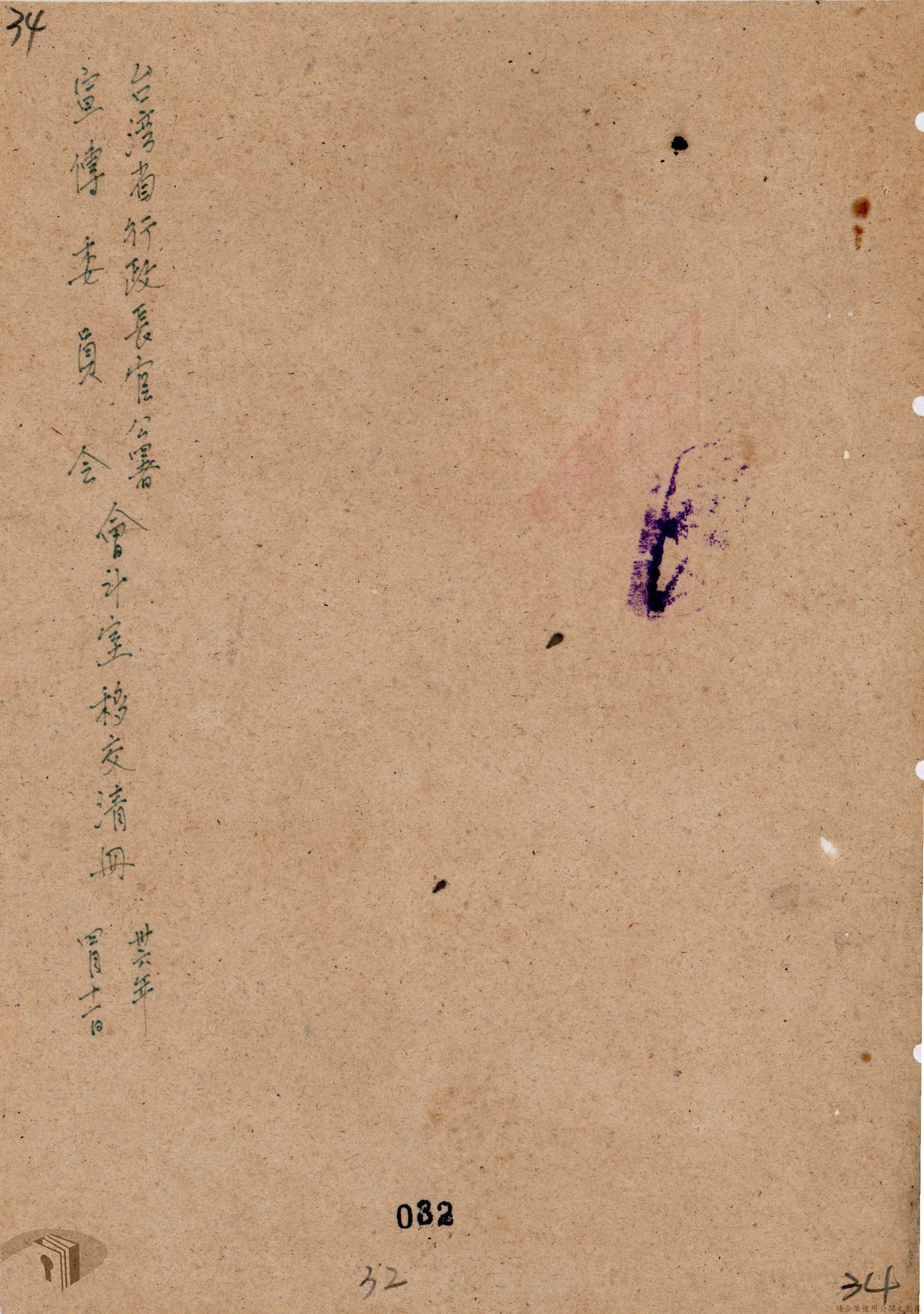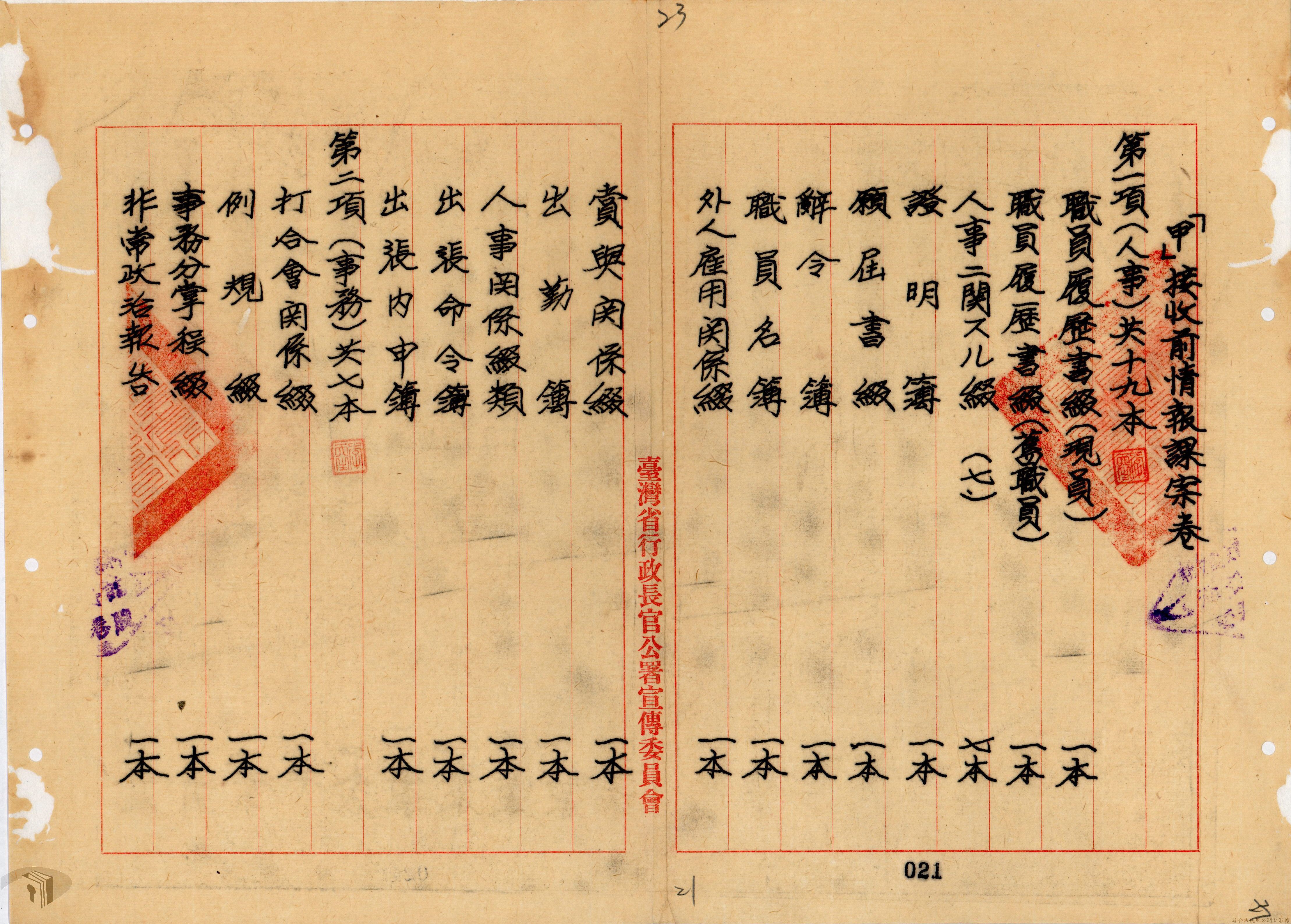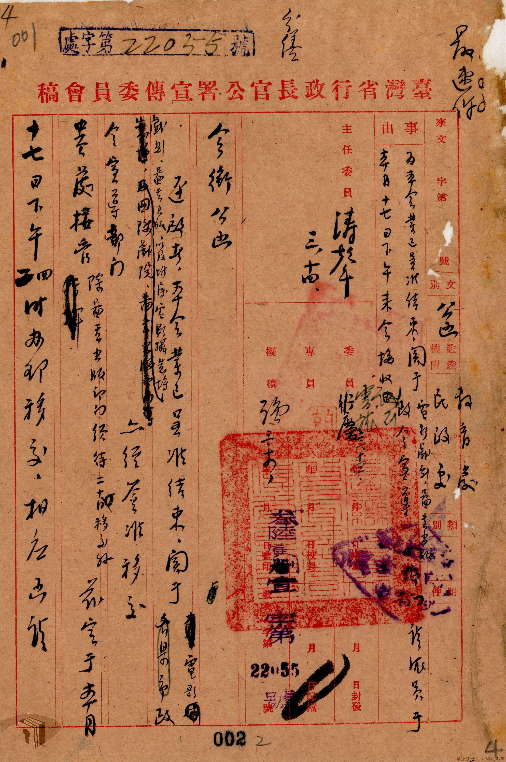 本案為36年間,臺灣省行政長官公署宣傳委員會因即將撤銷,函請該署教育處、新聞室、國際戲院等單位前來接收該會電影戲劇、圖書出版、政令宣導等項目的部門、業務與財產,該會亦函送日本統治時期檔案與會計帳冊單據表報予該署秘書室,且臺灣省接收委員會日產處理委員會為該會房屋移交一事,函請該署核示,後獲該署新聞室回覆;該署令知宣傳委員會向二二八事件賠償委員會領回代墊的賠償費,該會回復已領回入庫,並檢附單據送歸回證單。
