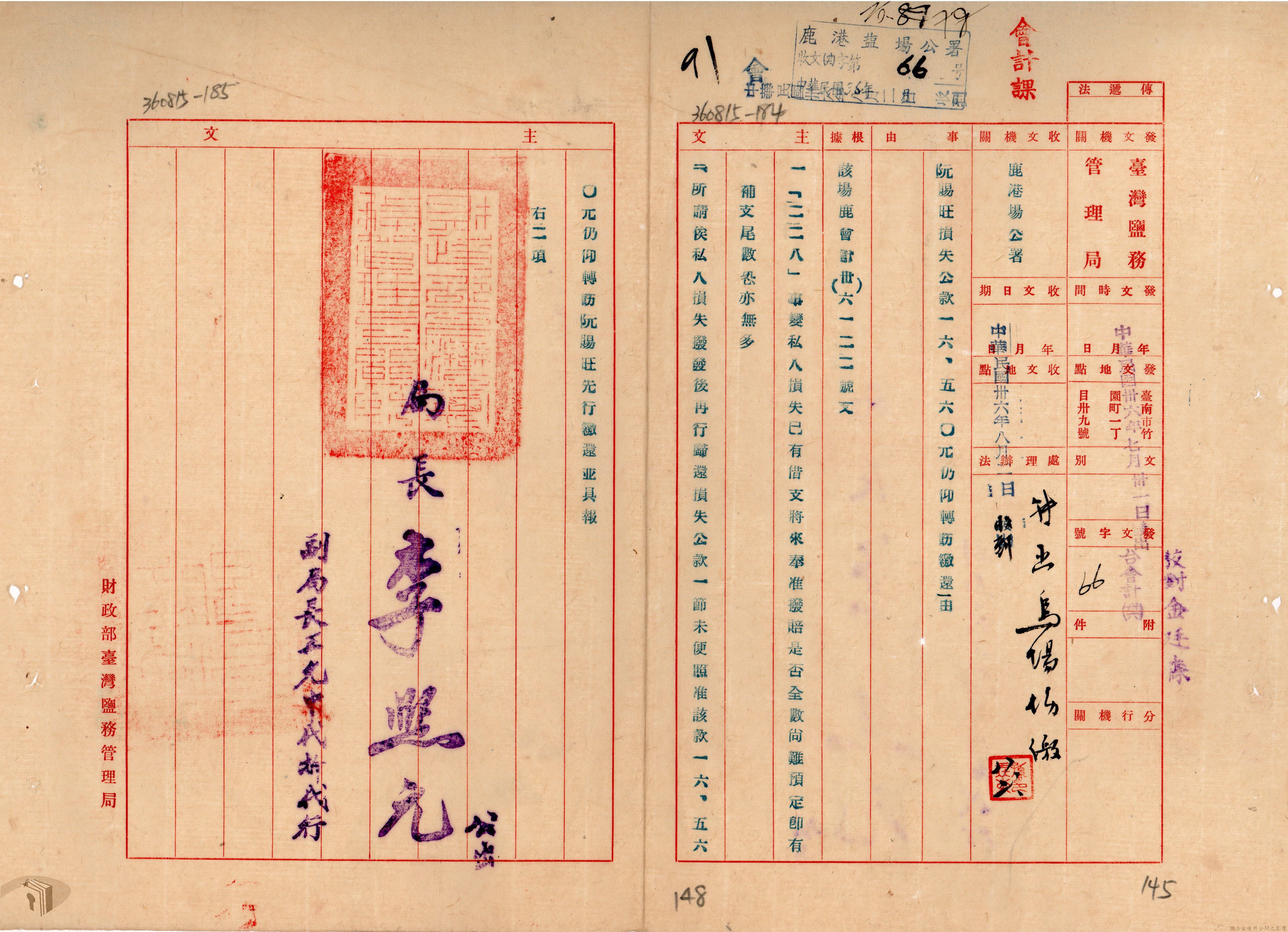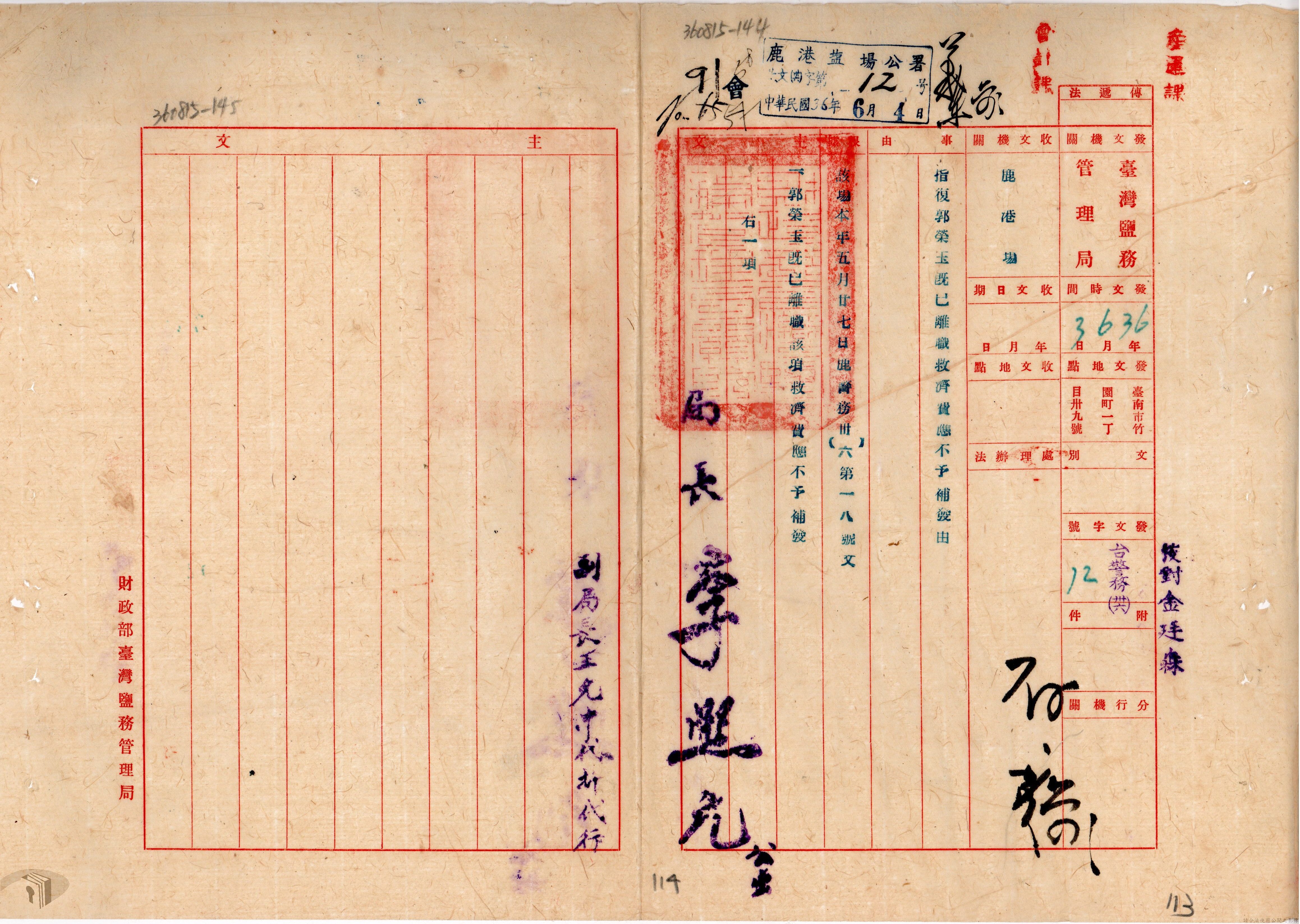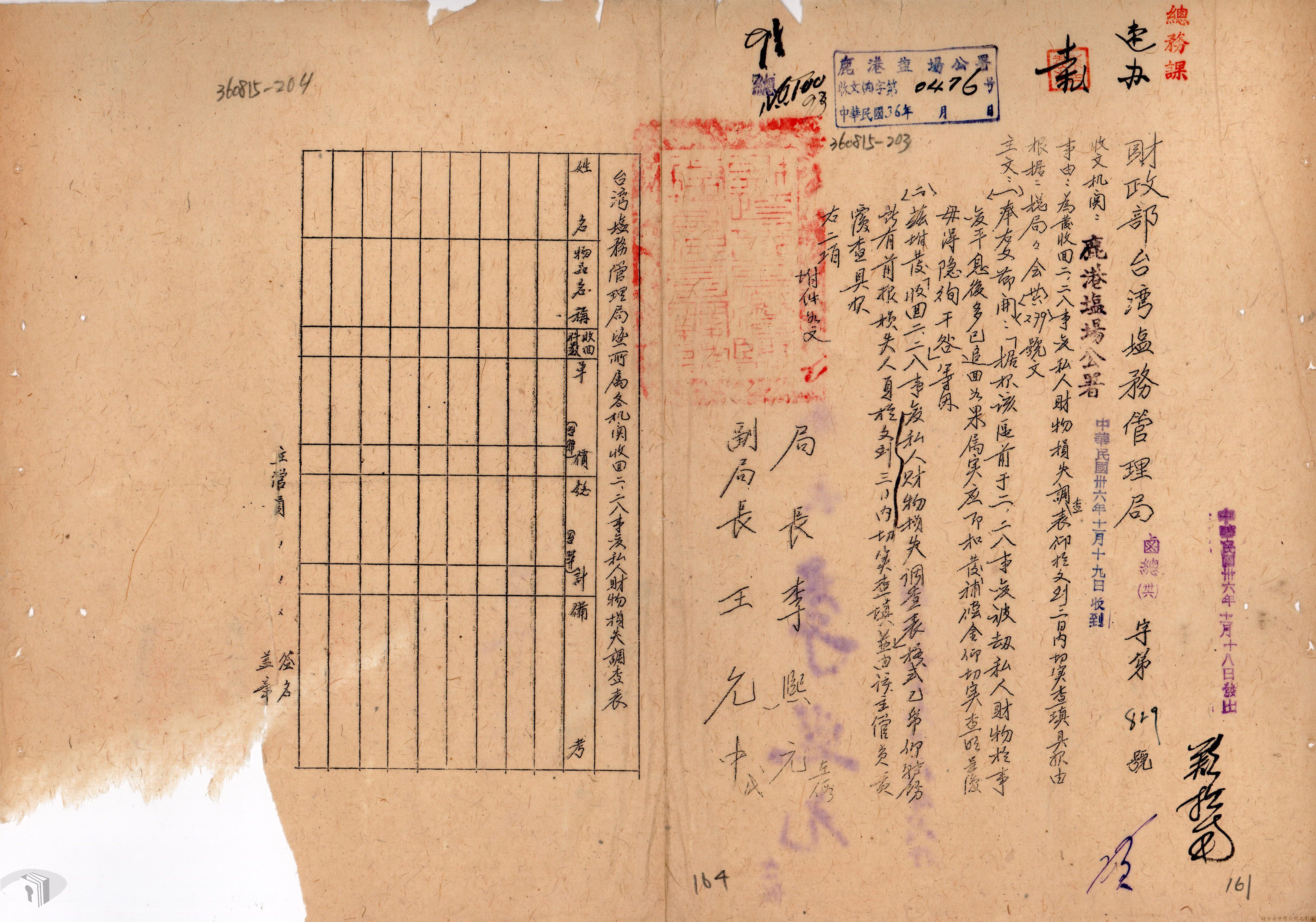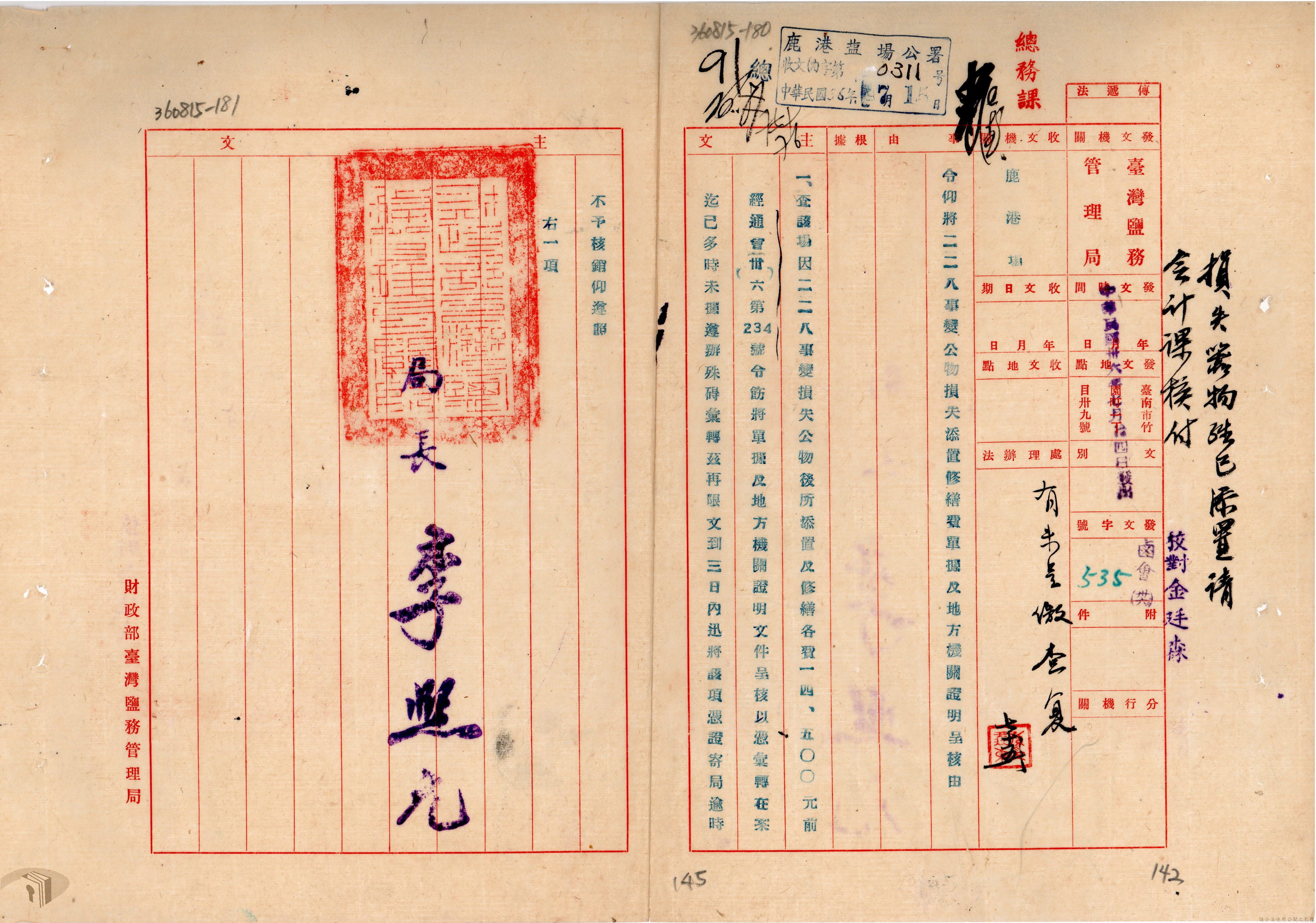 本案為36至38年間,鹿港鹽場公署為了職員於二二八事件時守護倉庫與公物等事項,函請財政部臺灣鹽務管理局准予給予員工獎勵,後獲該局核准。鹿港鹽場公署亦向該局報告因事變影響而造成的公私損失,該局函復請檢送損失證明書修繕費單據,並訂定損失救濟辦法,後該署核發救濟費予受損職員。