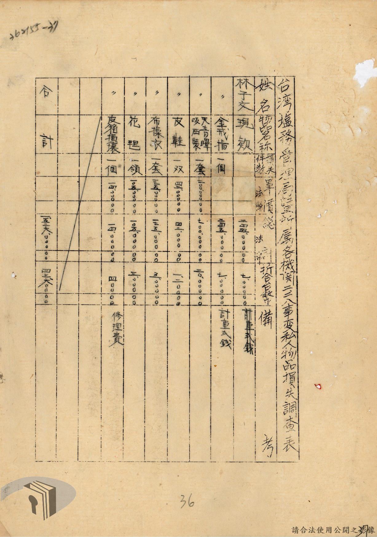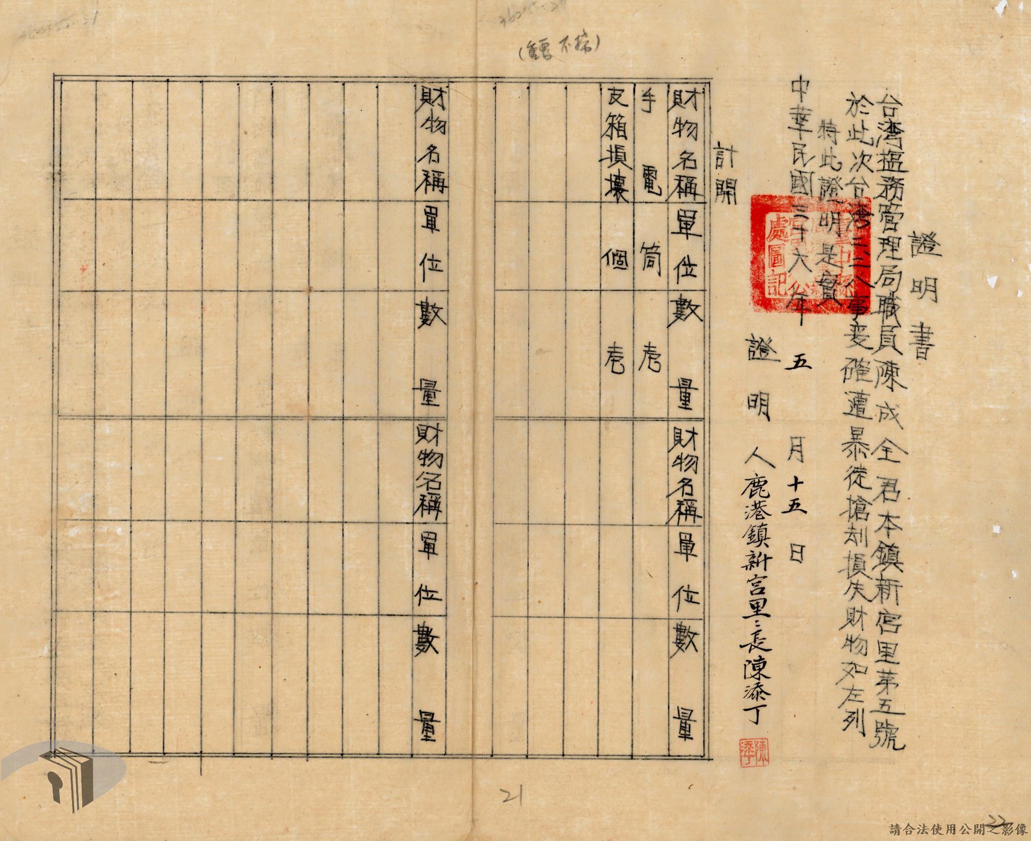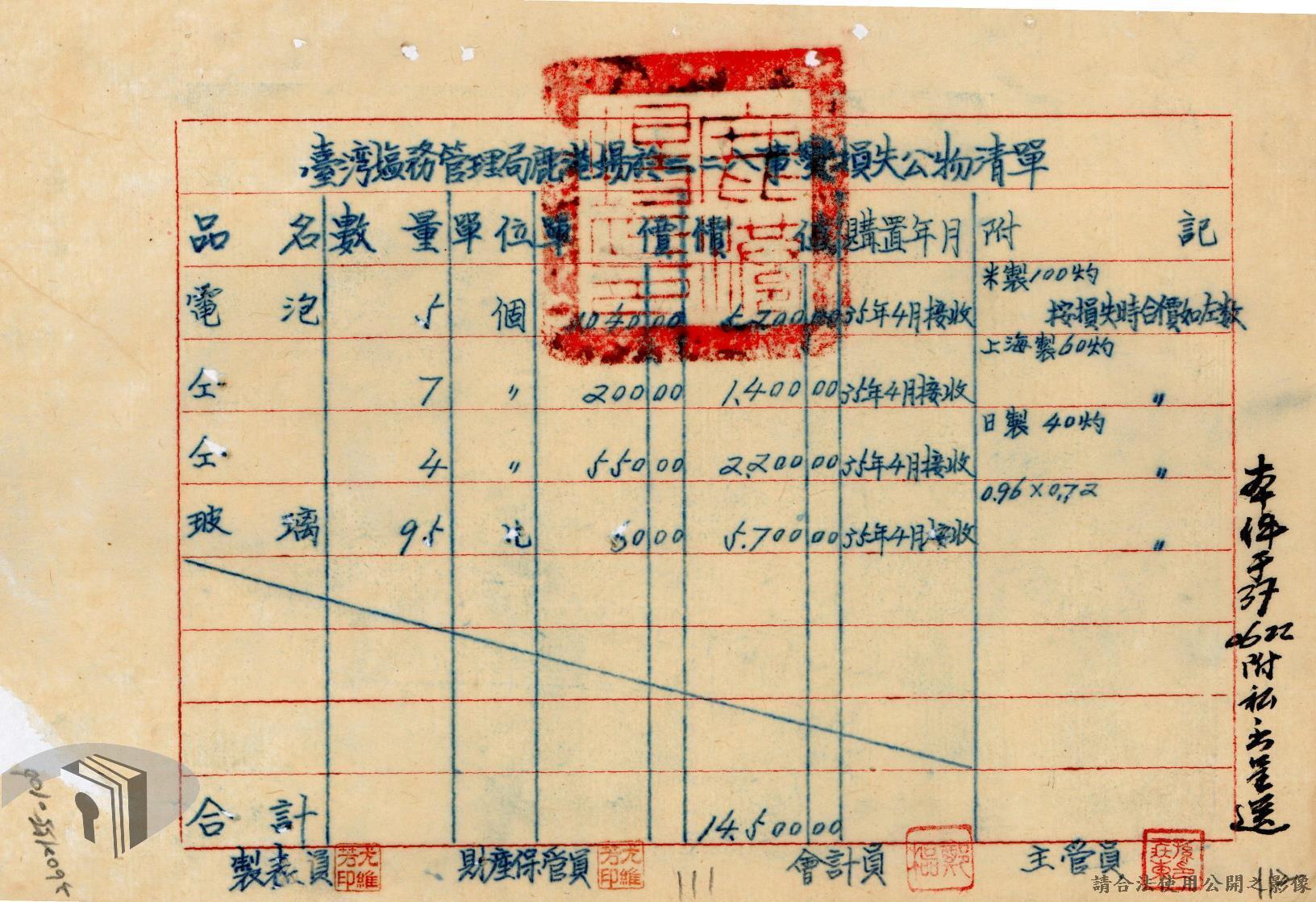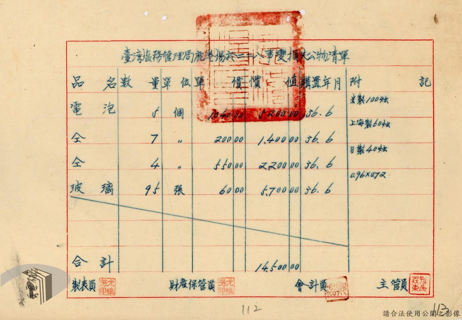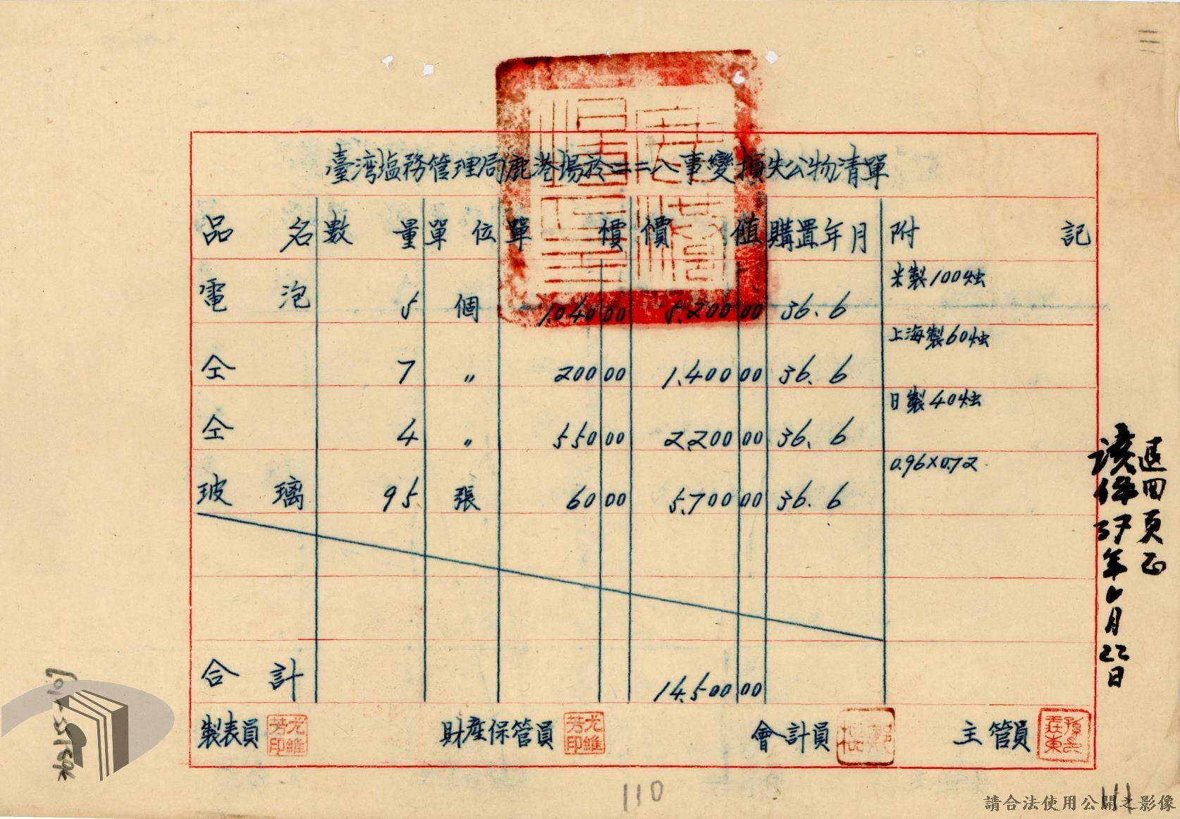 本案為36至37年間,財政部臺灣鹽務管理局函請鹿港鹽場公署報告公私損失情形予該局,該署函送員工損失清單,並函請該局給予救濟金,後臺灣鹽務管理局函請該公署發還該局墊付費用。附證明書。