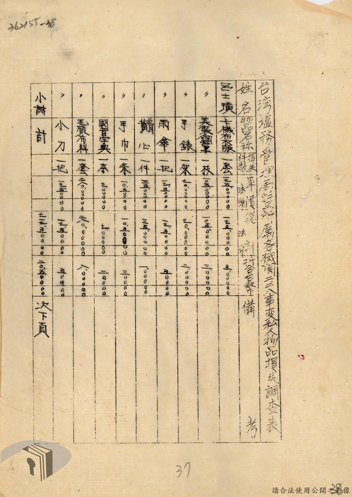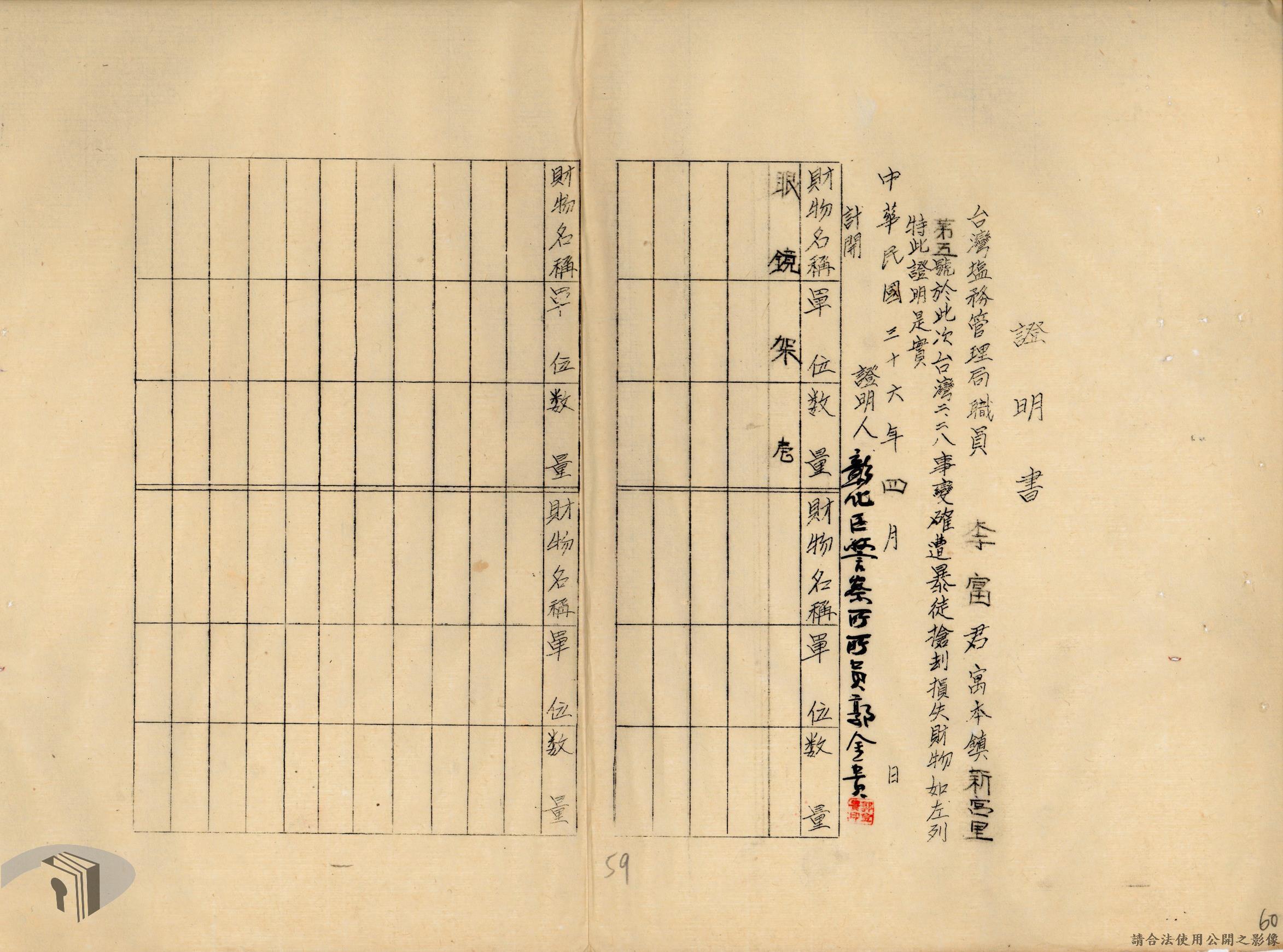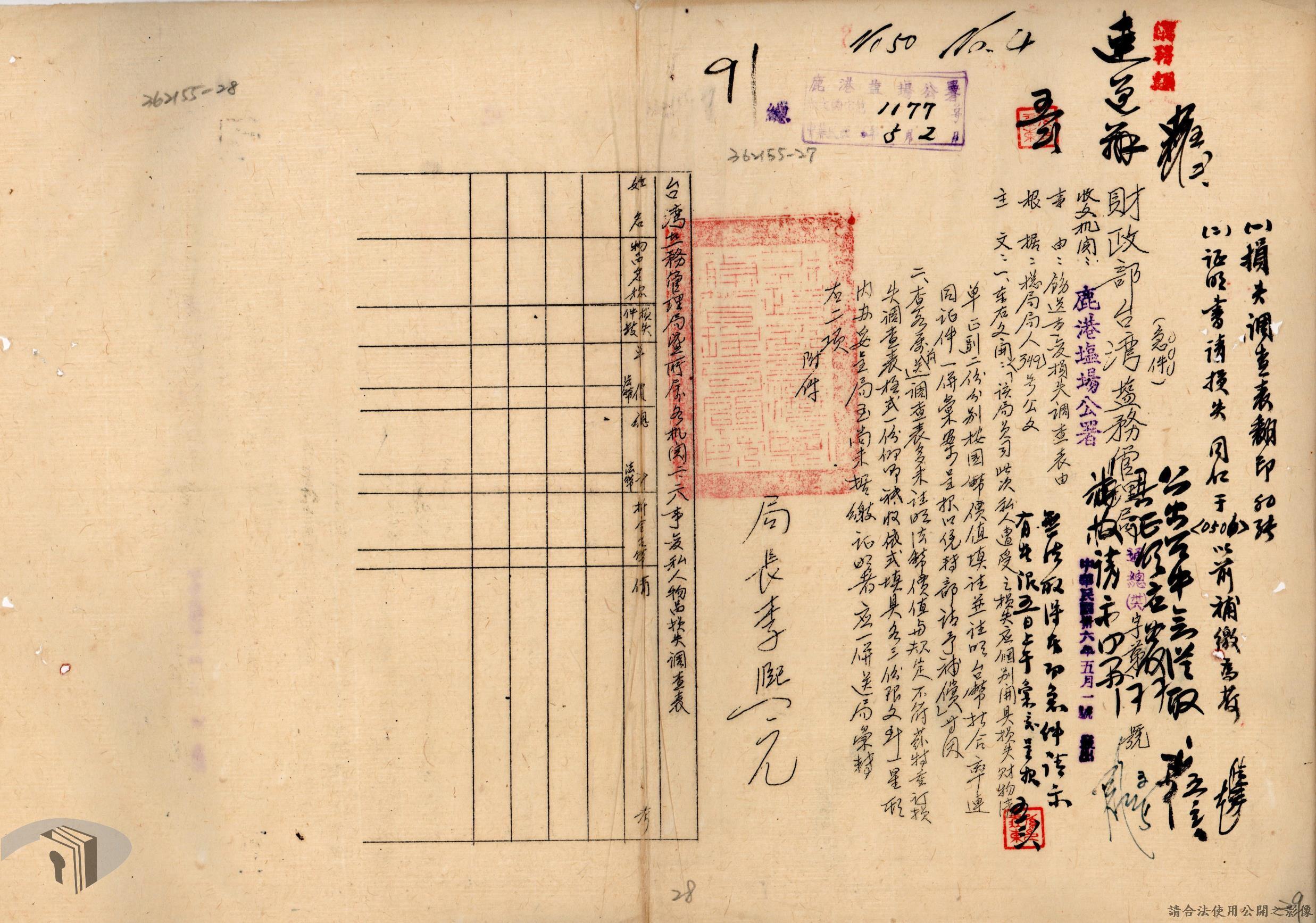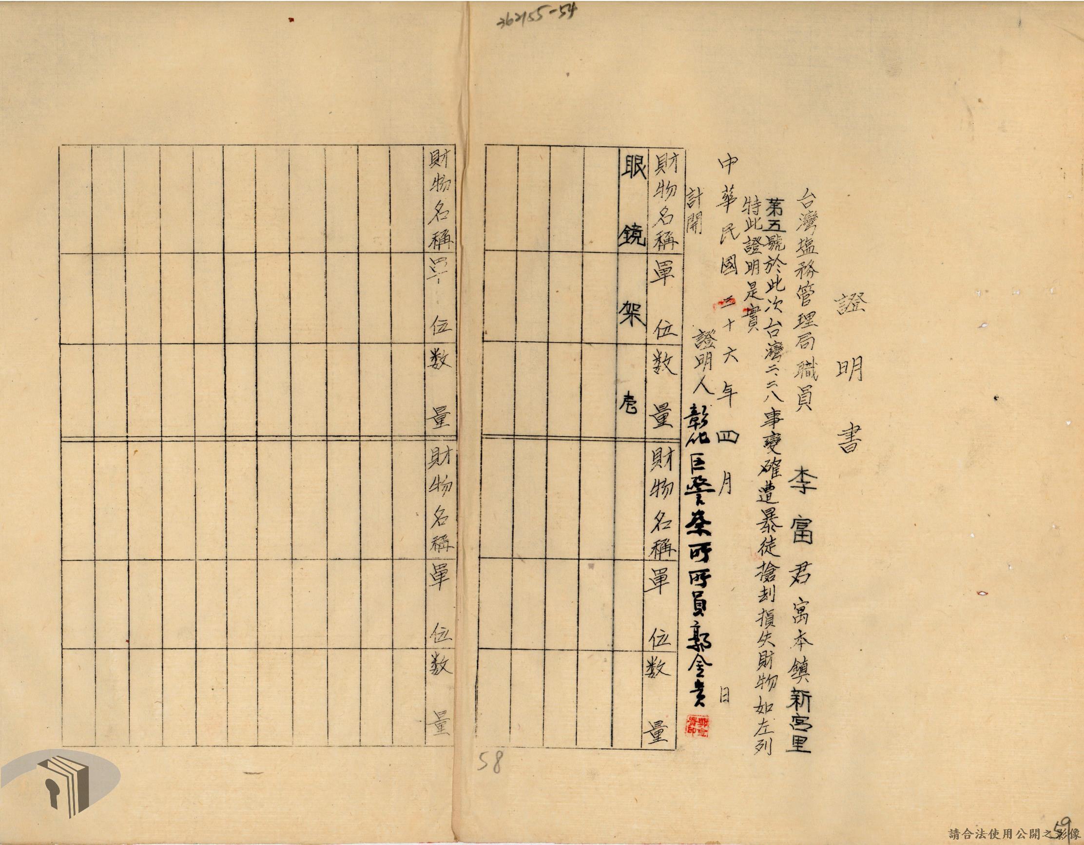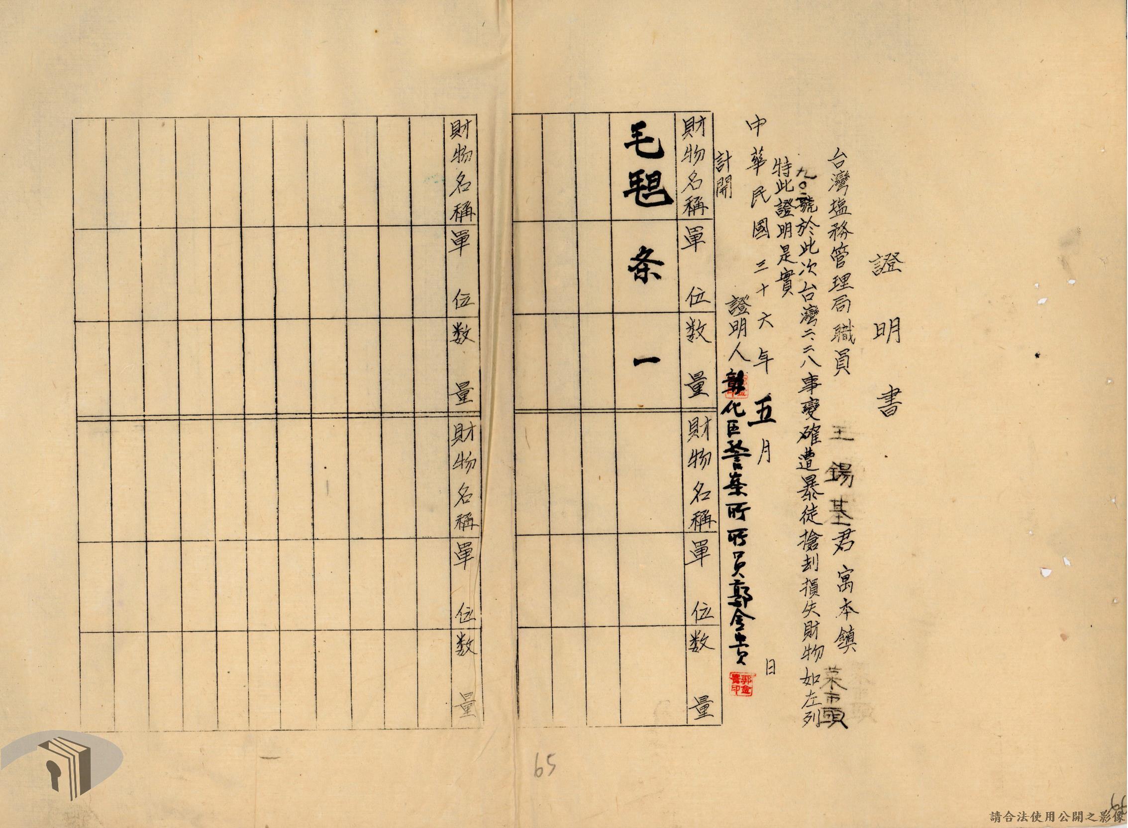 本案為36至37年間,財政部臺灣鹽務管理局函請鹿港鹽場公署報告公私損失情形予該局,該署函送員工損失清單,並函請該局給予救濟金,後臺灣鹽務管理局函請該公署發還該局墊付費用。附證明書。