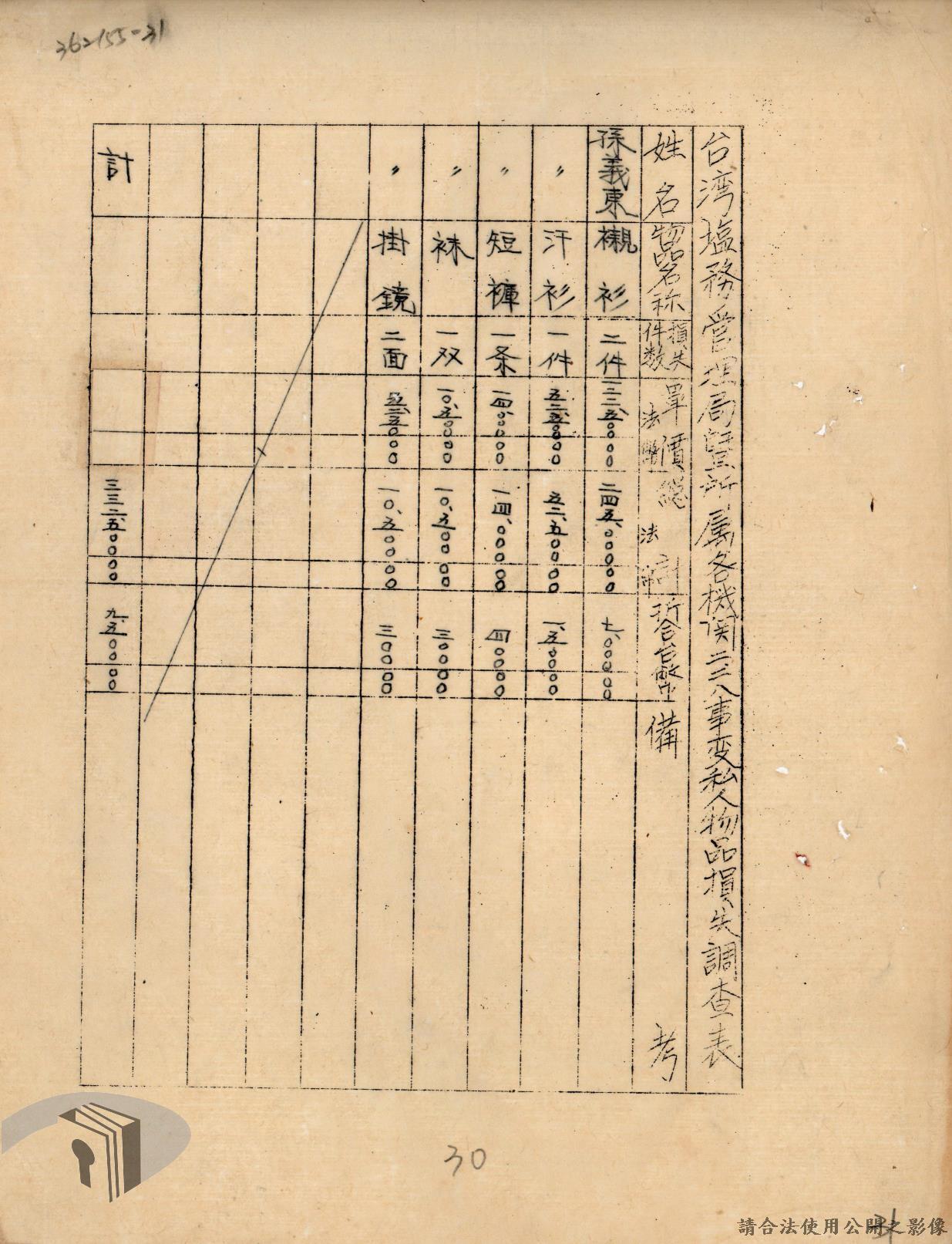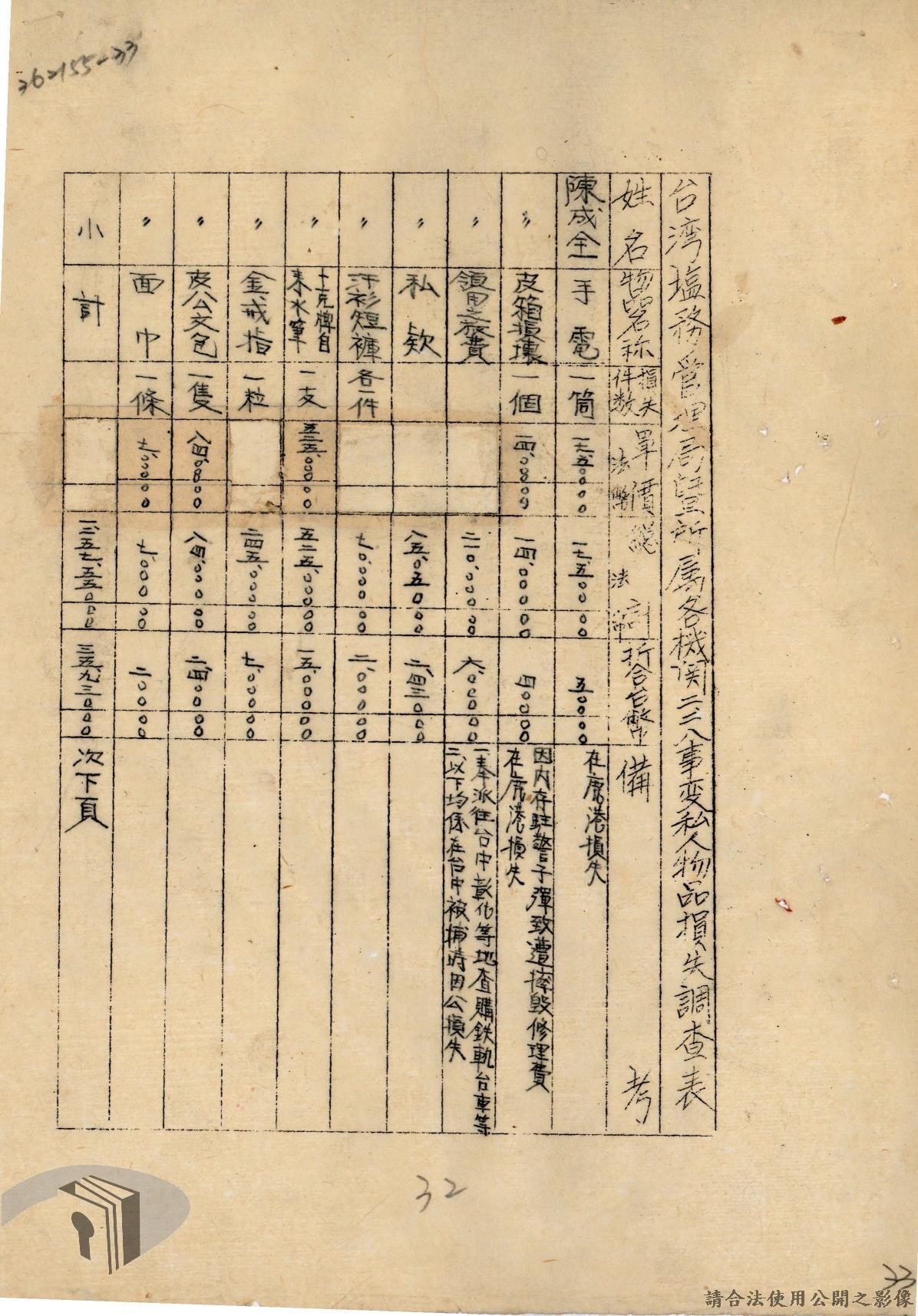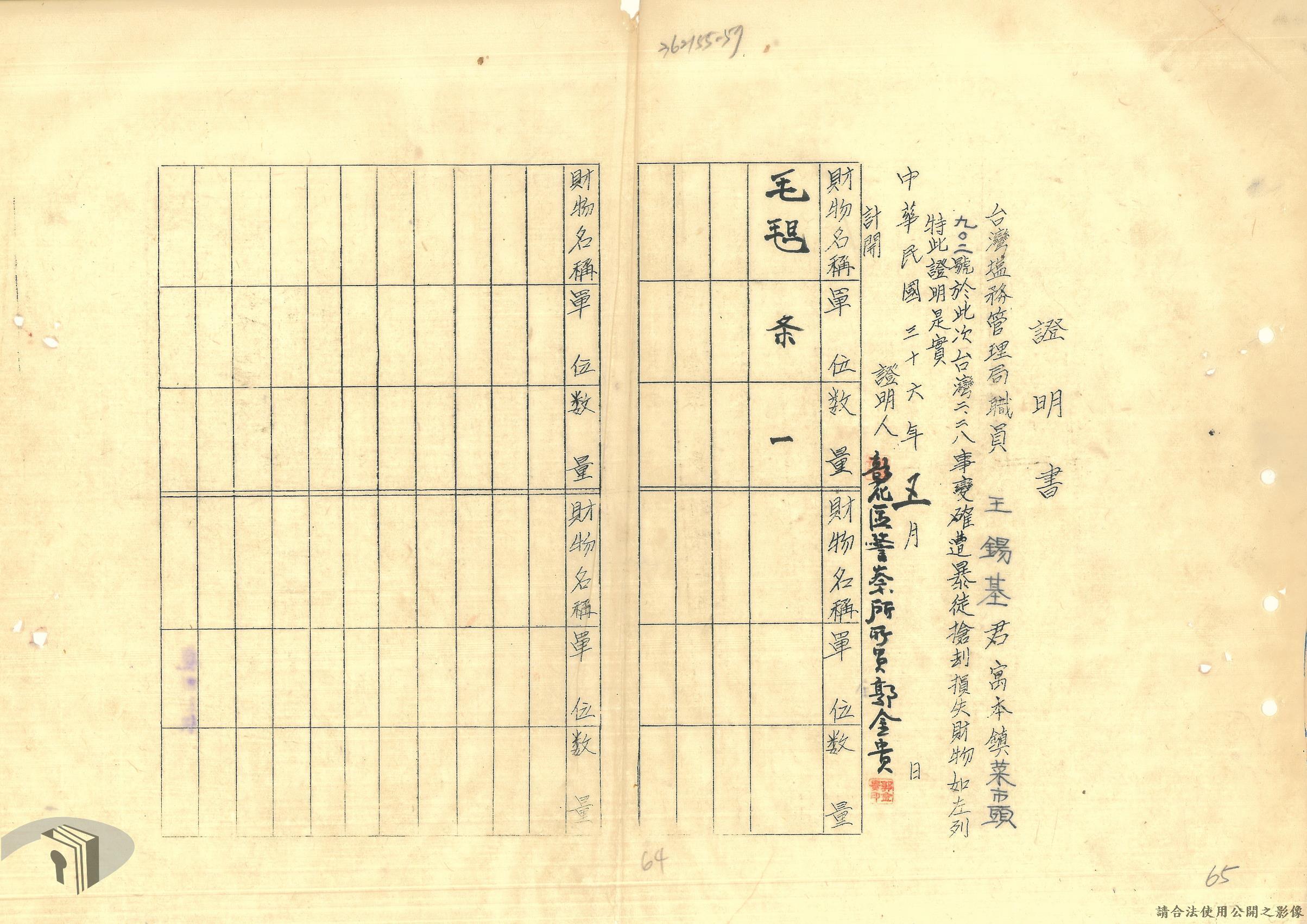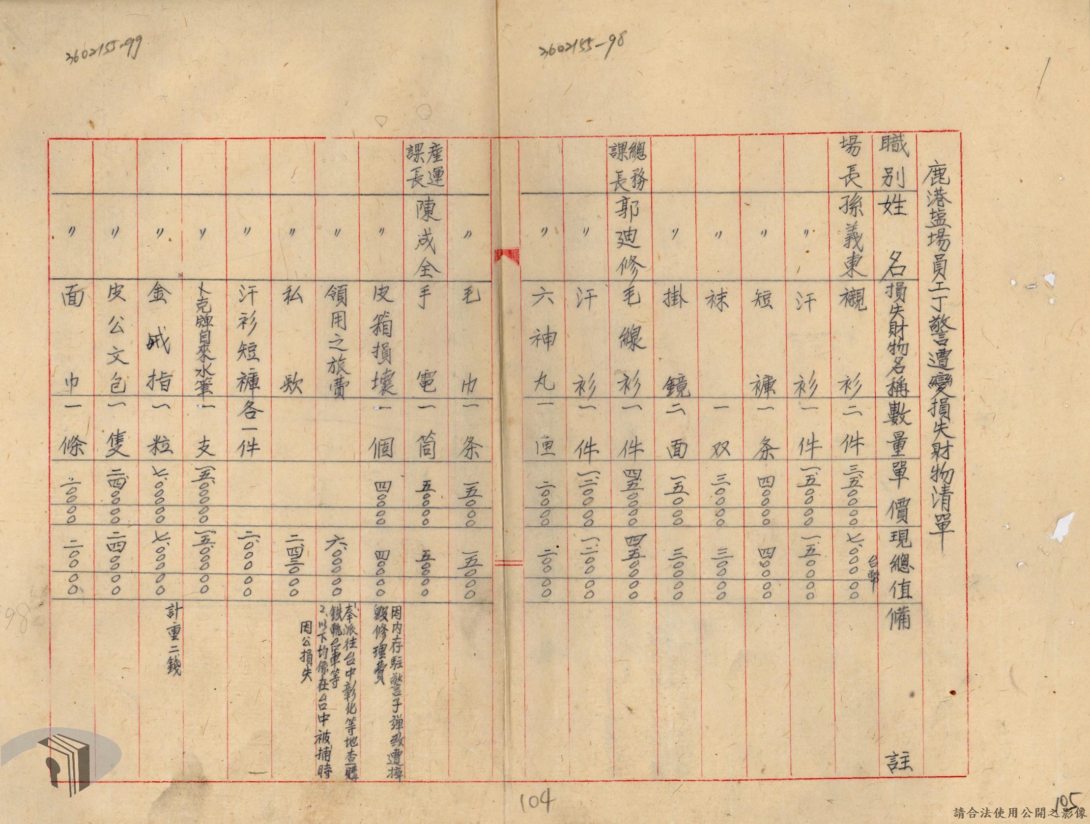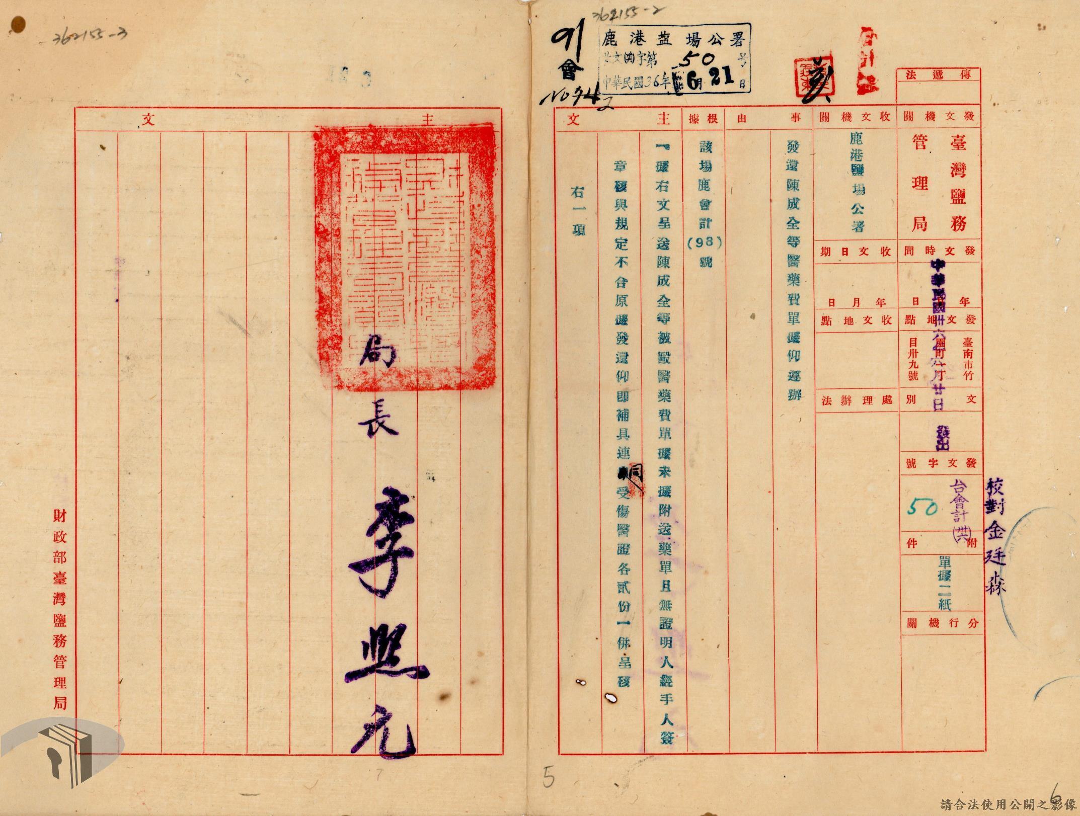 本案為36至37年間,財政部臺灣鹽務管理局函請鹿港鹽場公署報告公私損失情形予該局,該署函送員工損失清單,並函請該局給予救濟金,後臺灣鹽務管理局函請該公署發還該局墊付費用。附證明書。