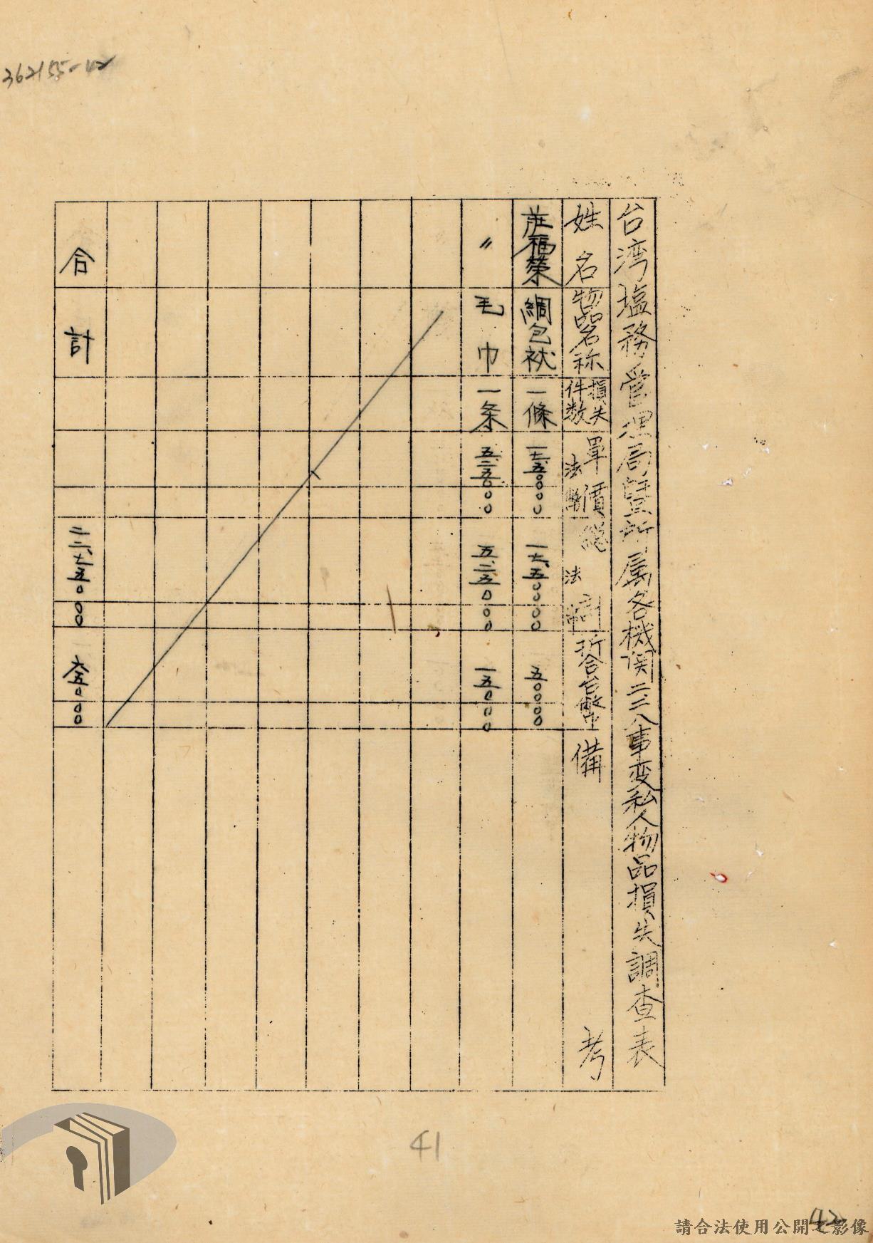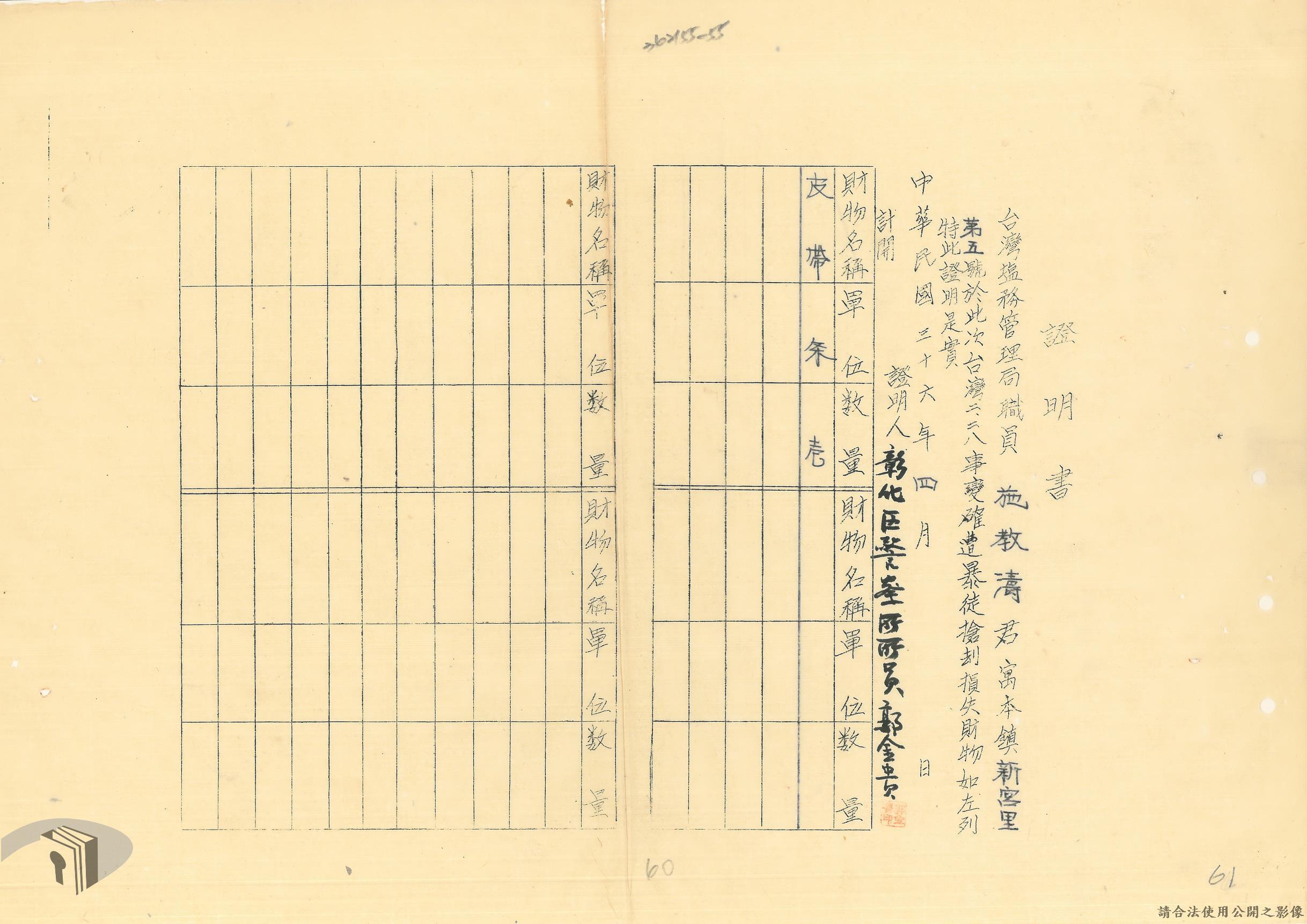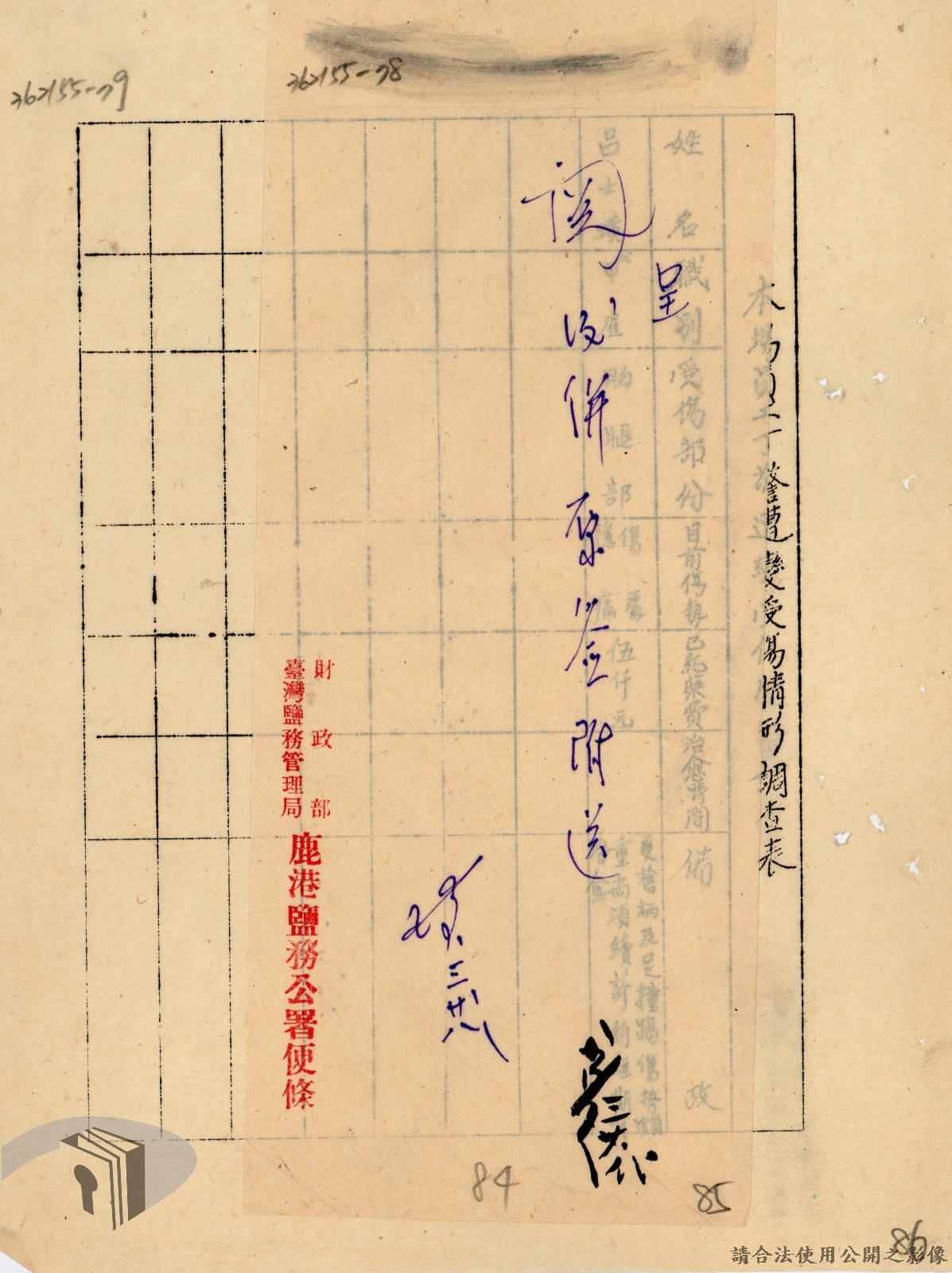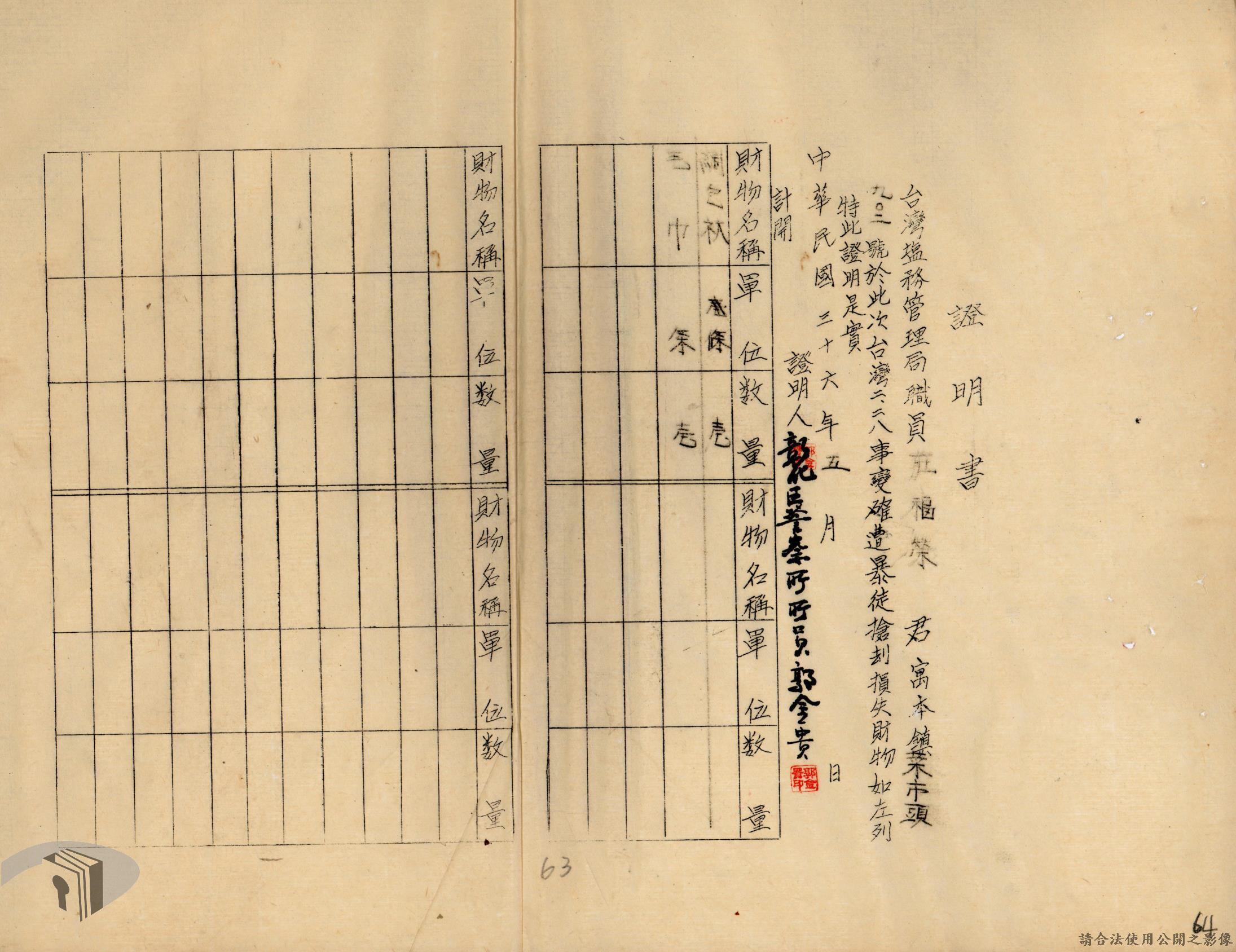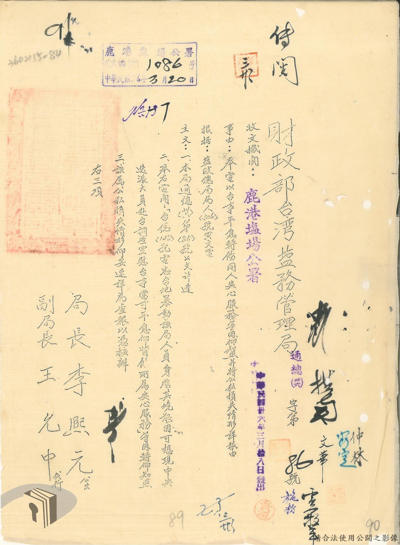 本案為36至37年間,財政部臺灣鹽務管理局函請鹿港鹽場公署報告公私損失情形予該局,該署函送員工損失清單,並函請該局給予救濟金,後臺灣鹽務管理局函請該公署發還該局墊付費用。附證明書。