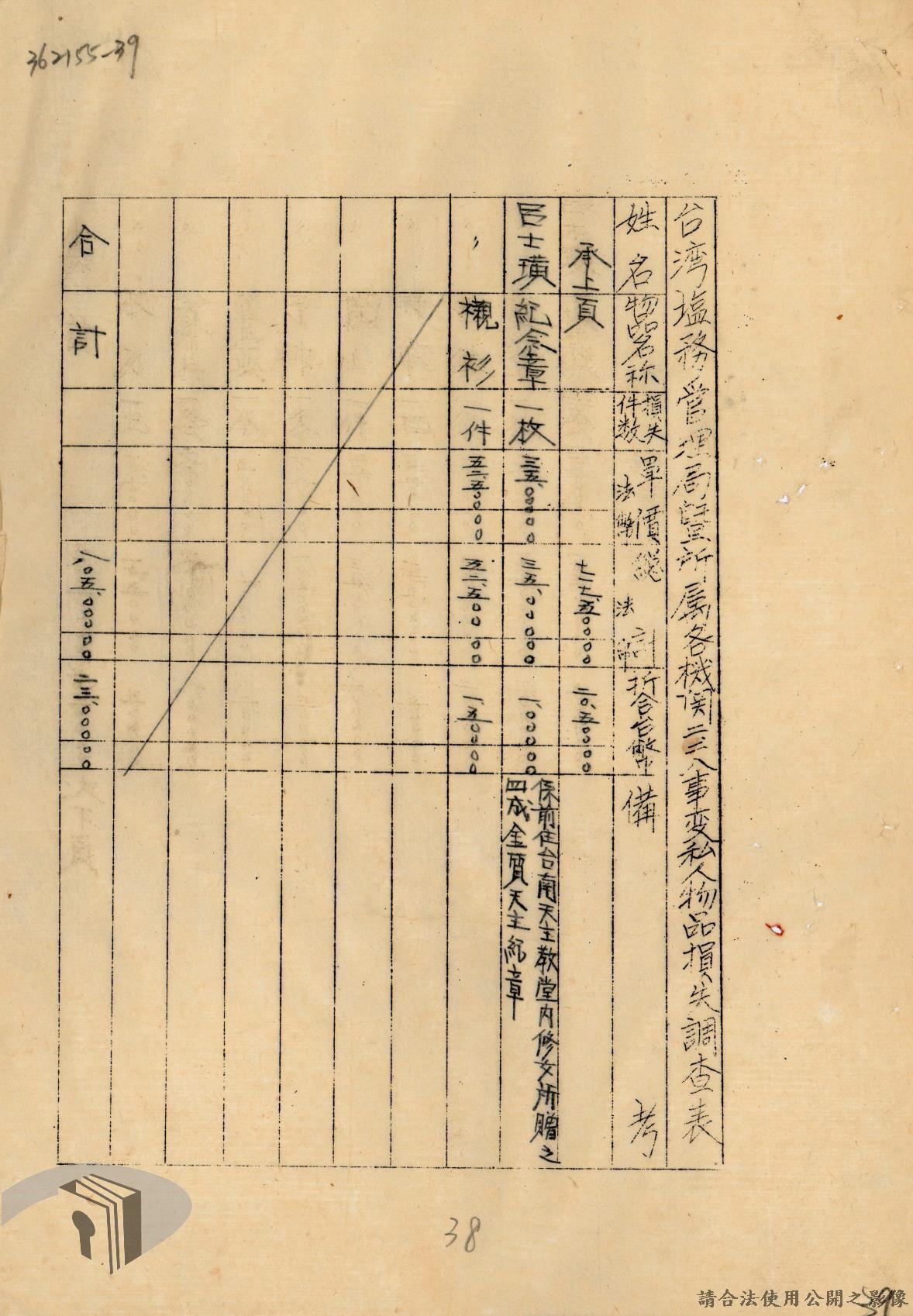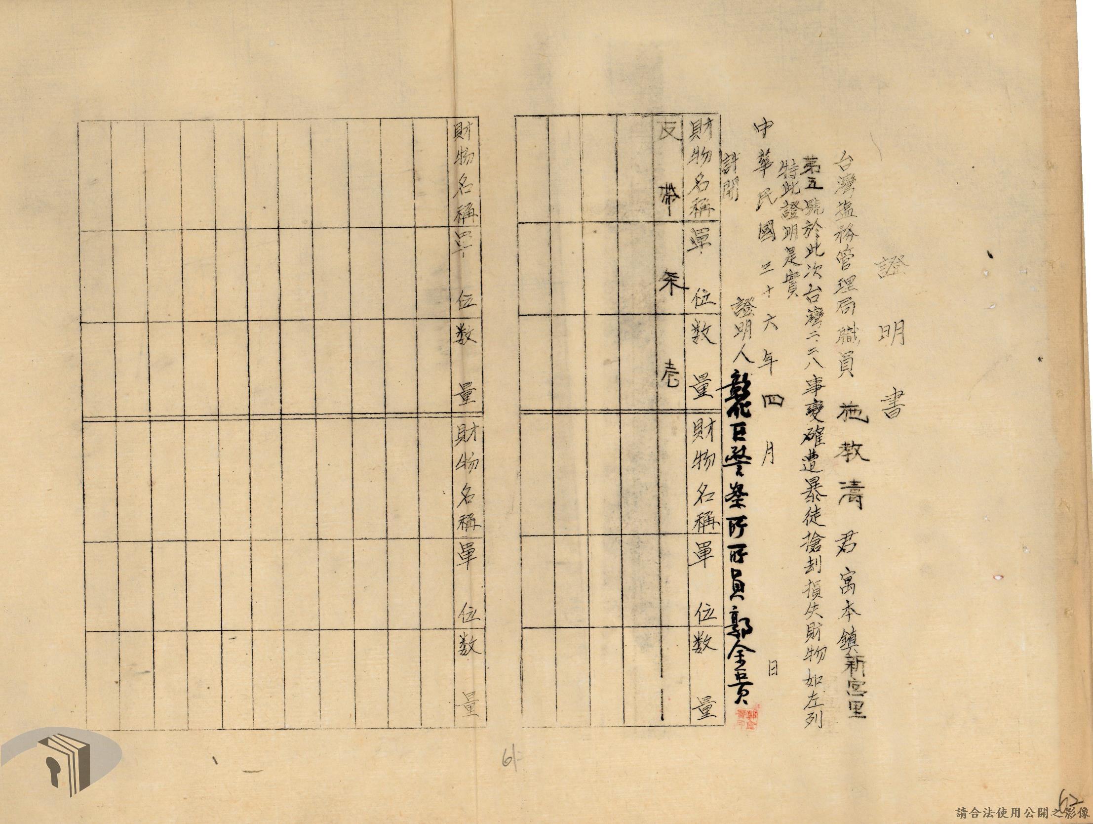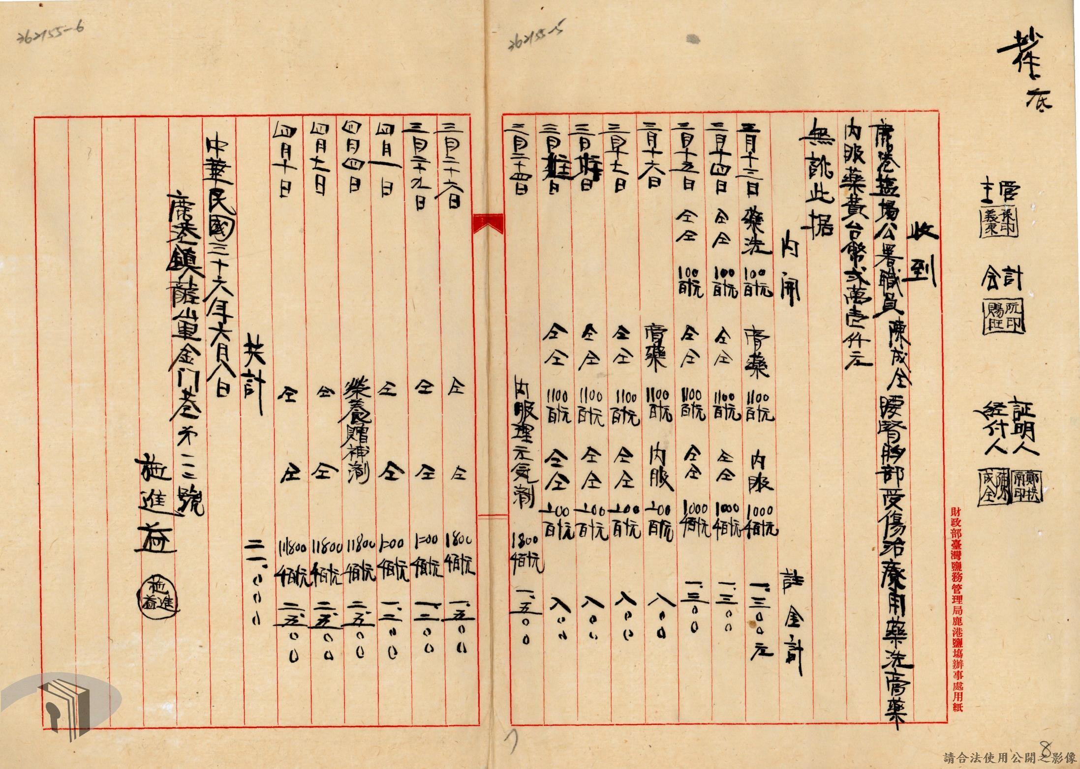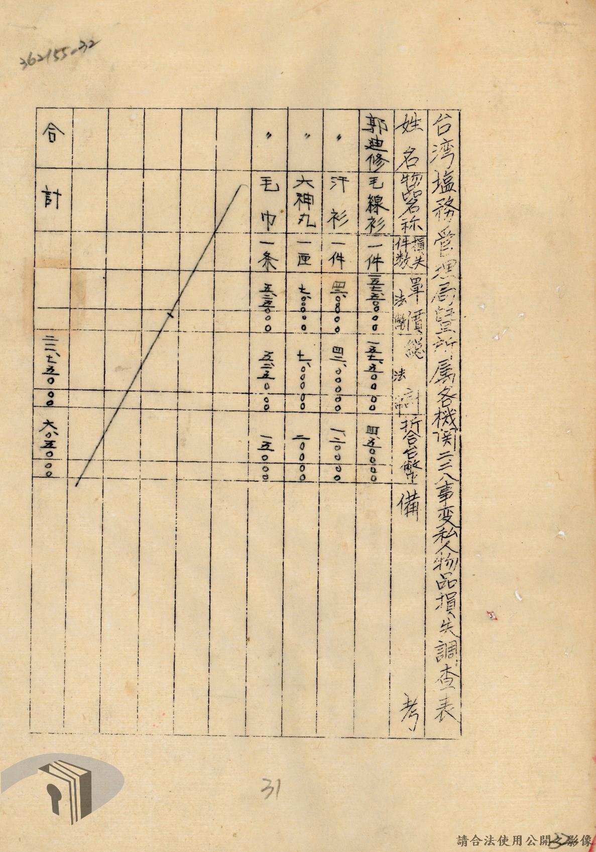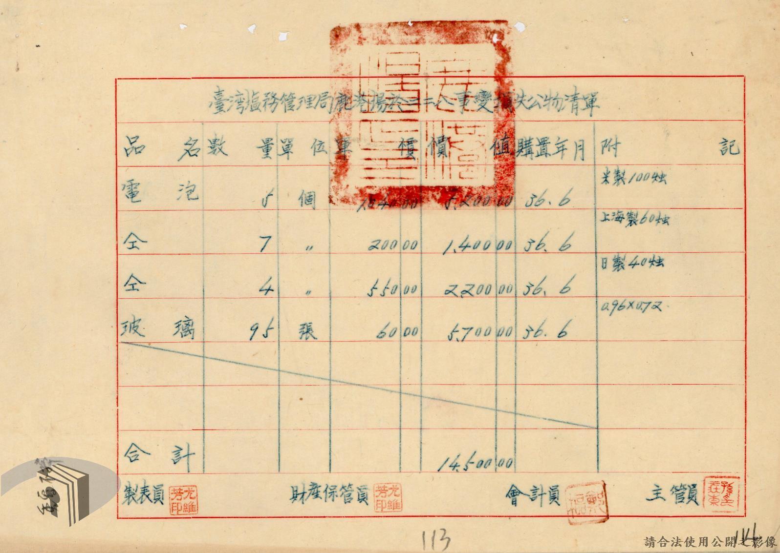 本案為36至37年間,財政部臺灣鹽務管理局函請鹿港鹽場公署報告公私損失情形予該局,該署函送員工損失清單,並函請該局給予救濟金,後臺灣鹽務管理局函請該公署發還該局墊付費用。附證明書。