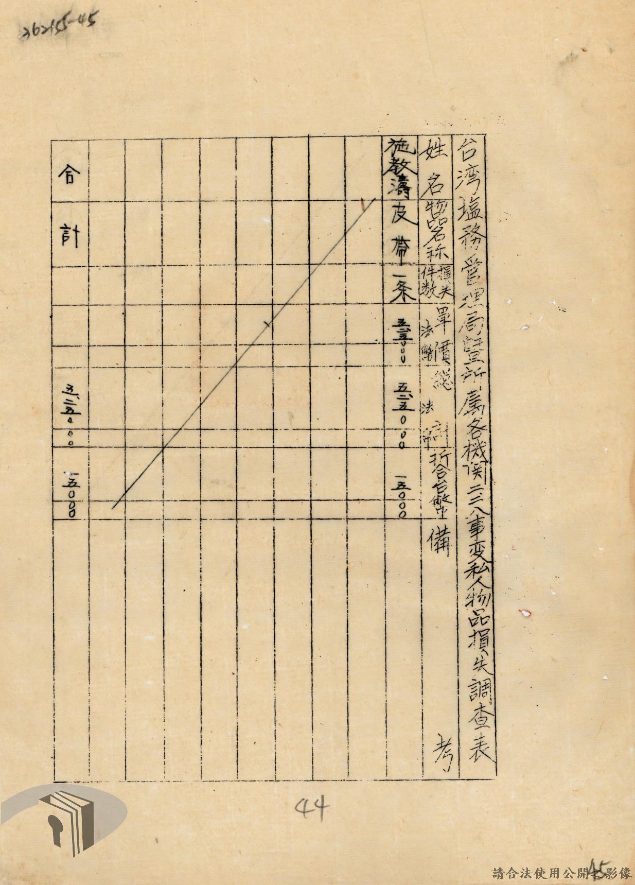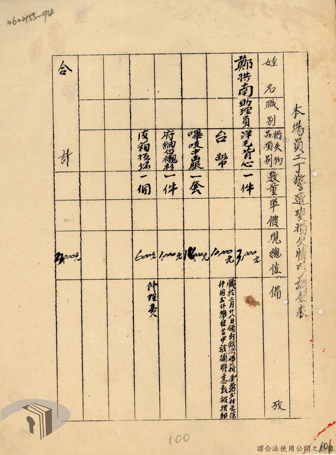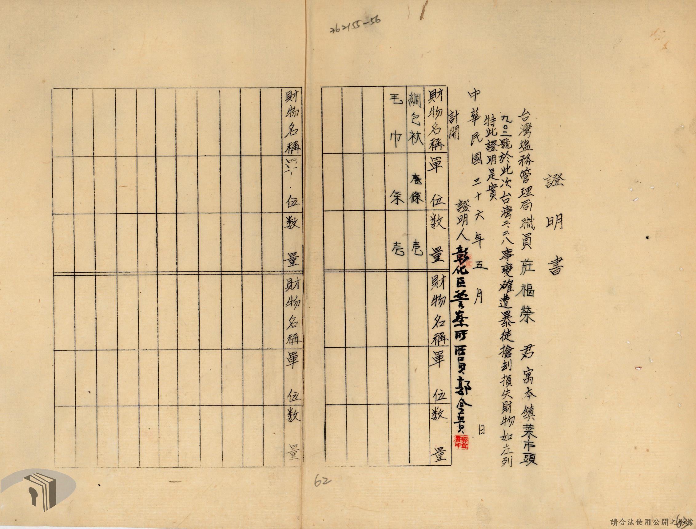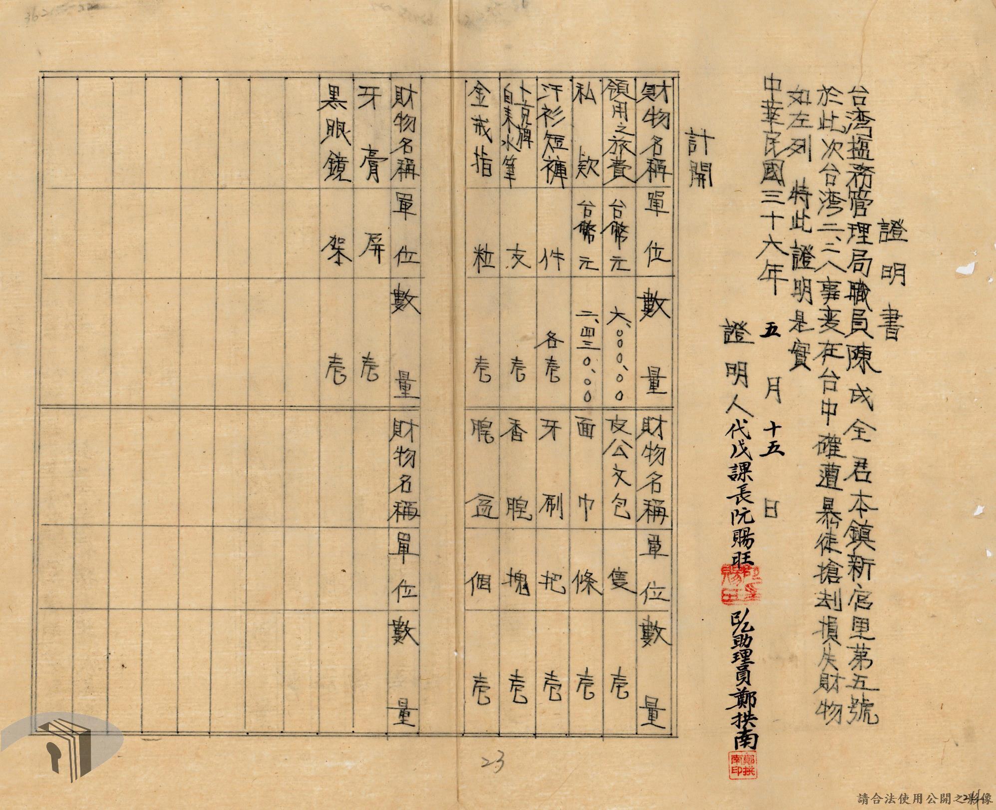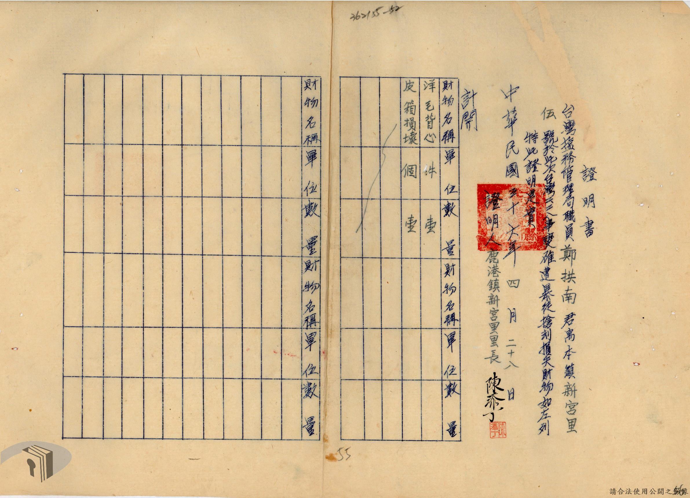本案為36至37年間,財政部臺灣鹽務管理局函請鹿港鹽場公署報告公私損失情形予該局,該署函送員工損失清單,並函請該局給予救濟金,後臺灣鹽務管理局函請該公署發還該局墊付費用。附證明書。