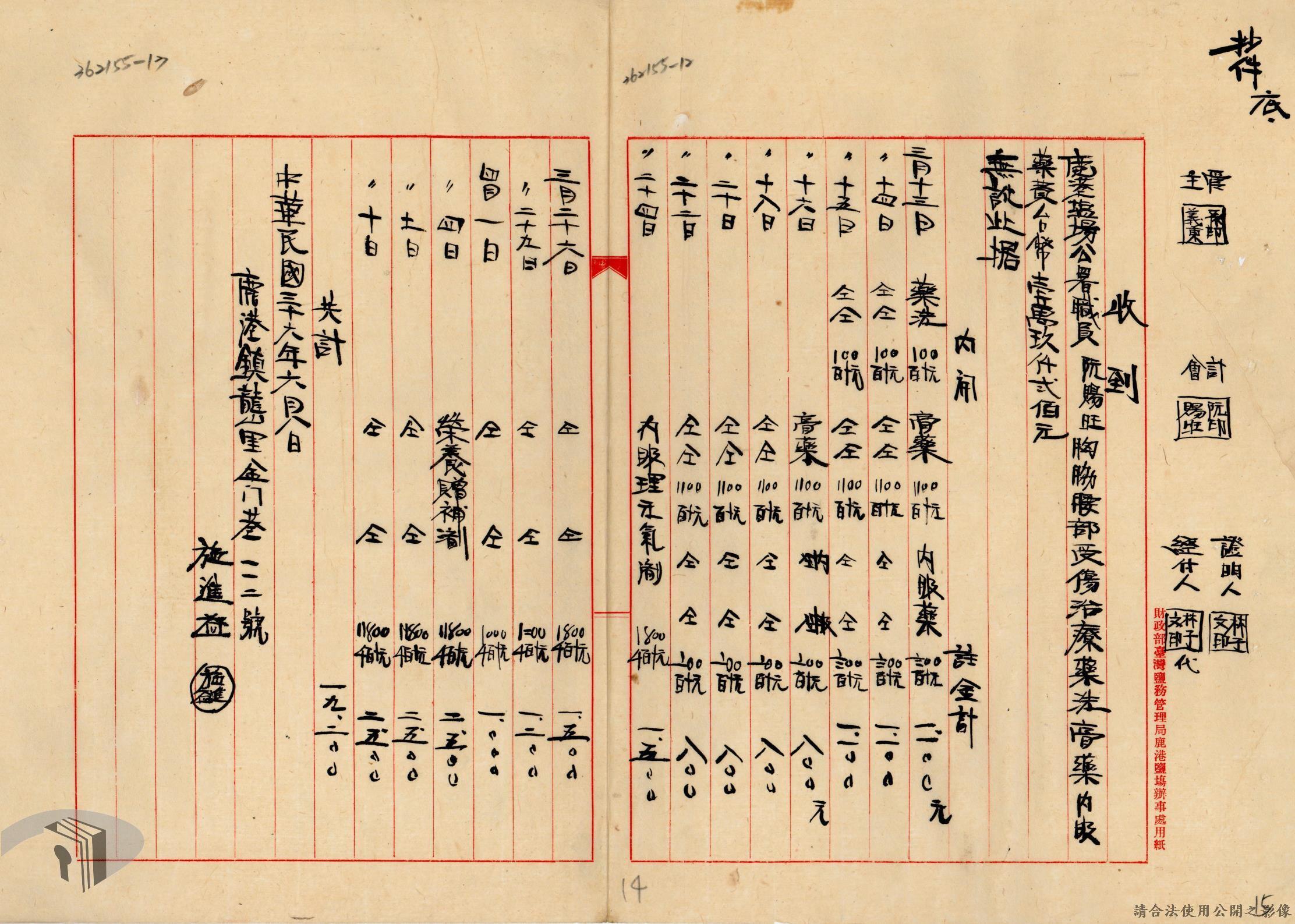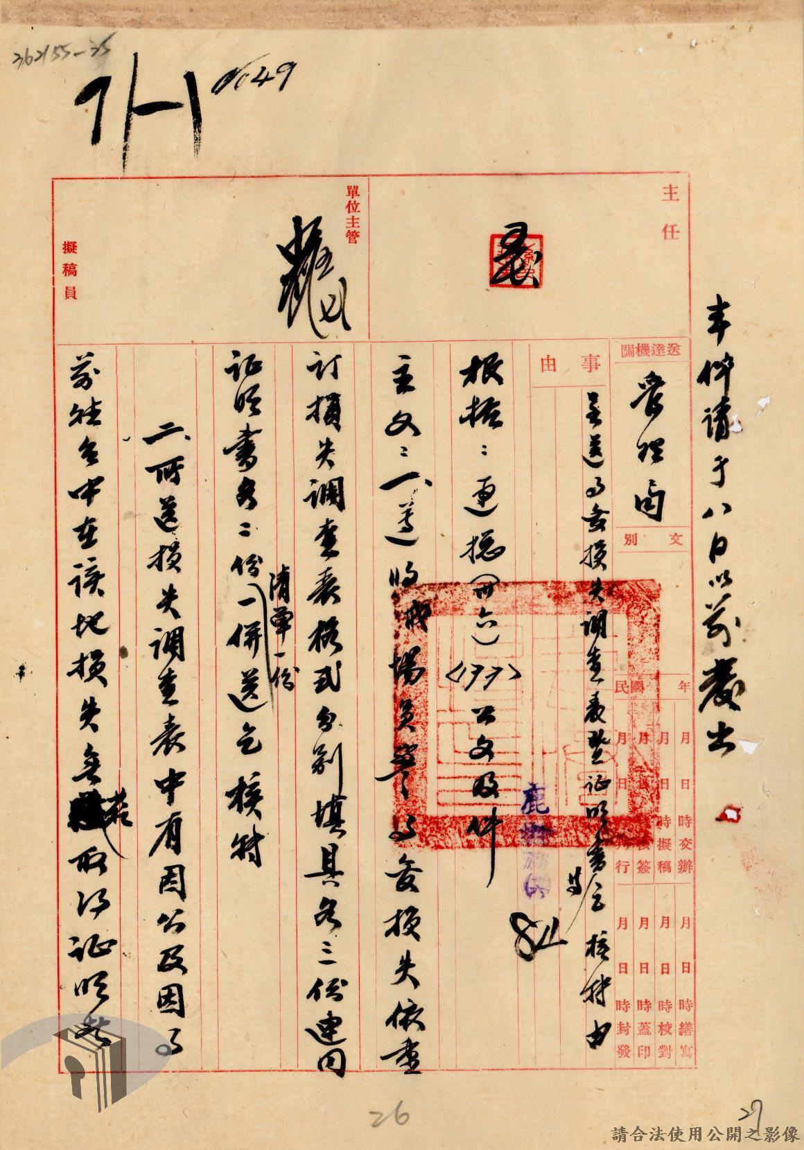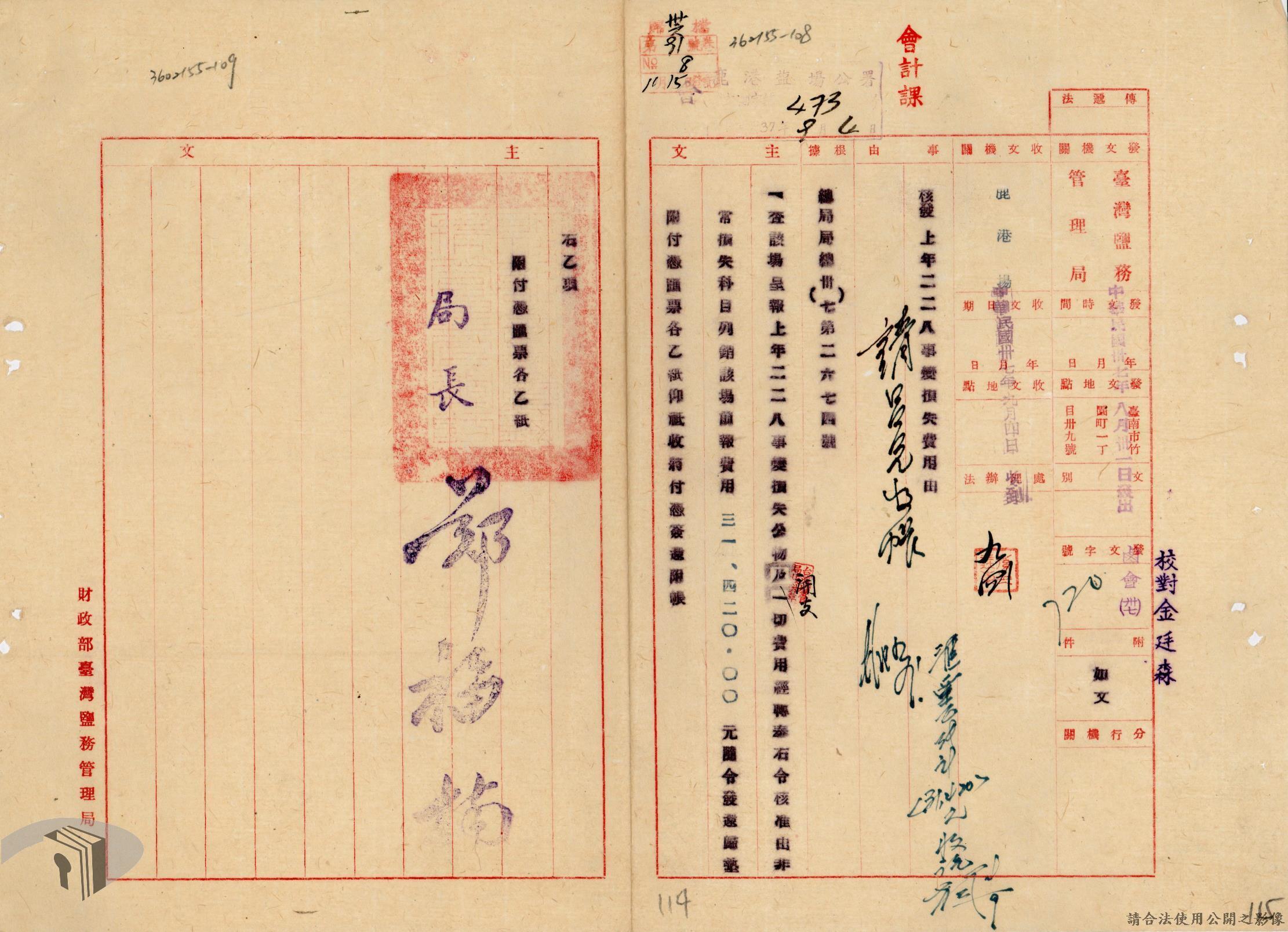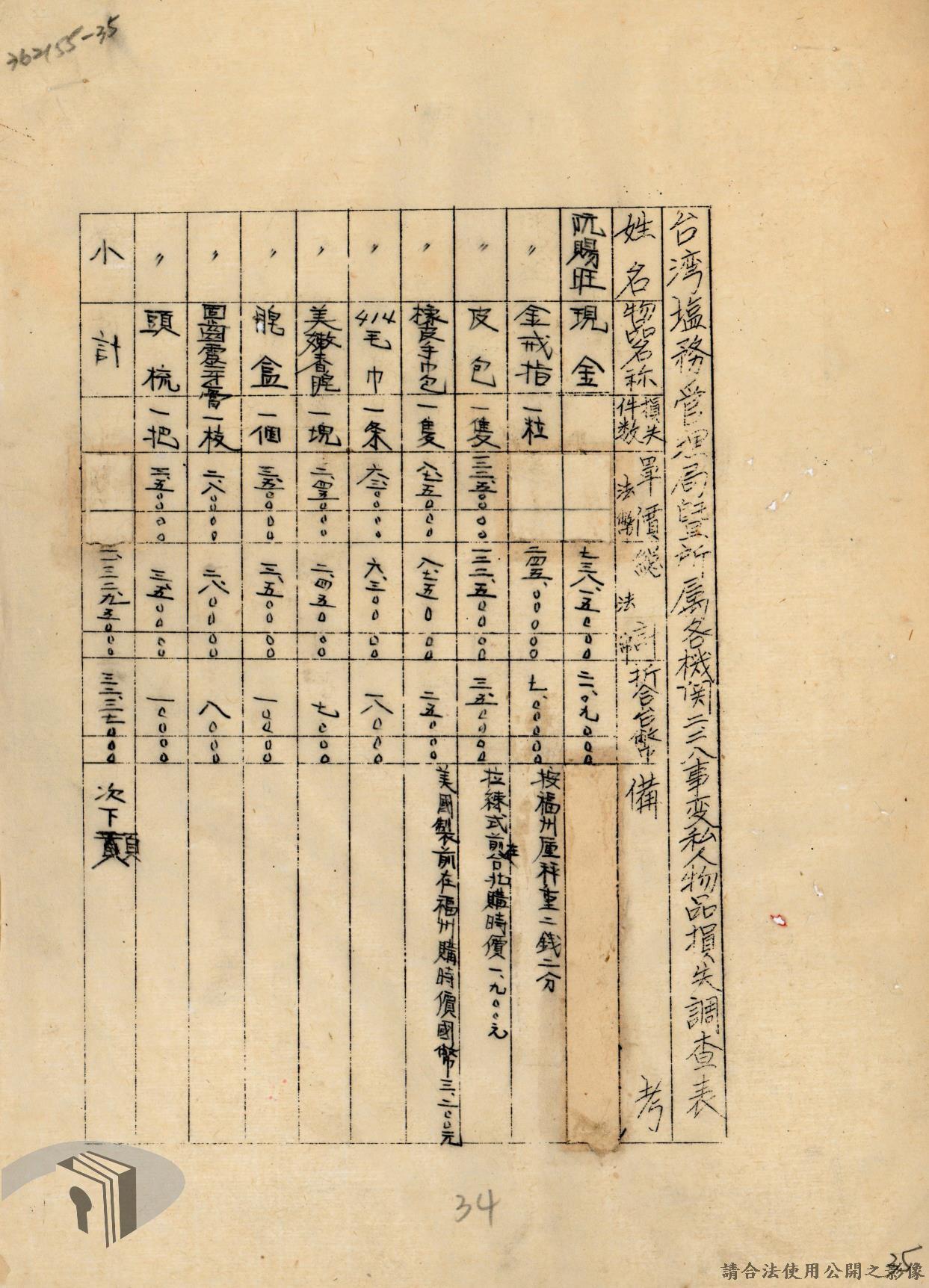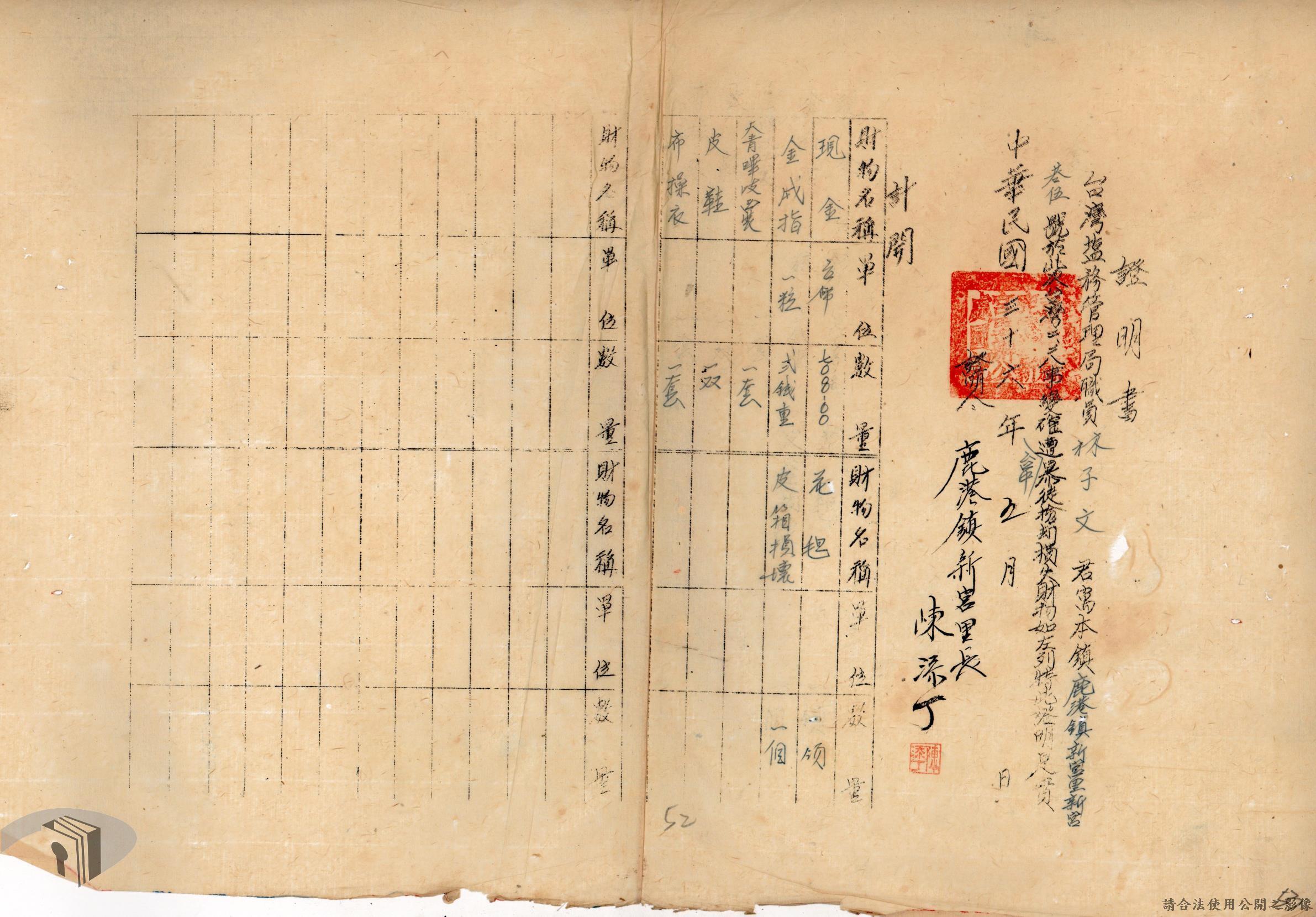 本案為36至37年間,財政部臺灣鹽務管理局函請鹿港鹽場公署報告公私損失情形予該局,該署函送員工損失清單,並函請該局給予救濟金,後臺灣鹽務管理局函請該公署發還該局墊付費用。附證明書。