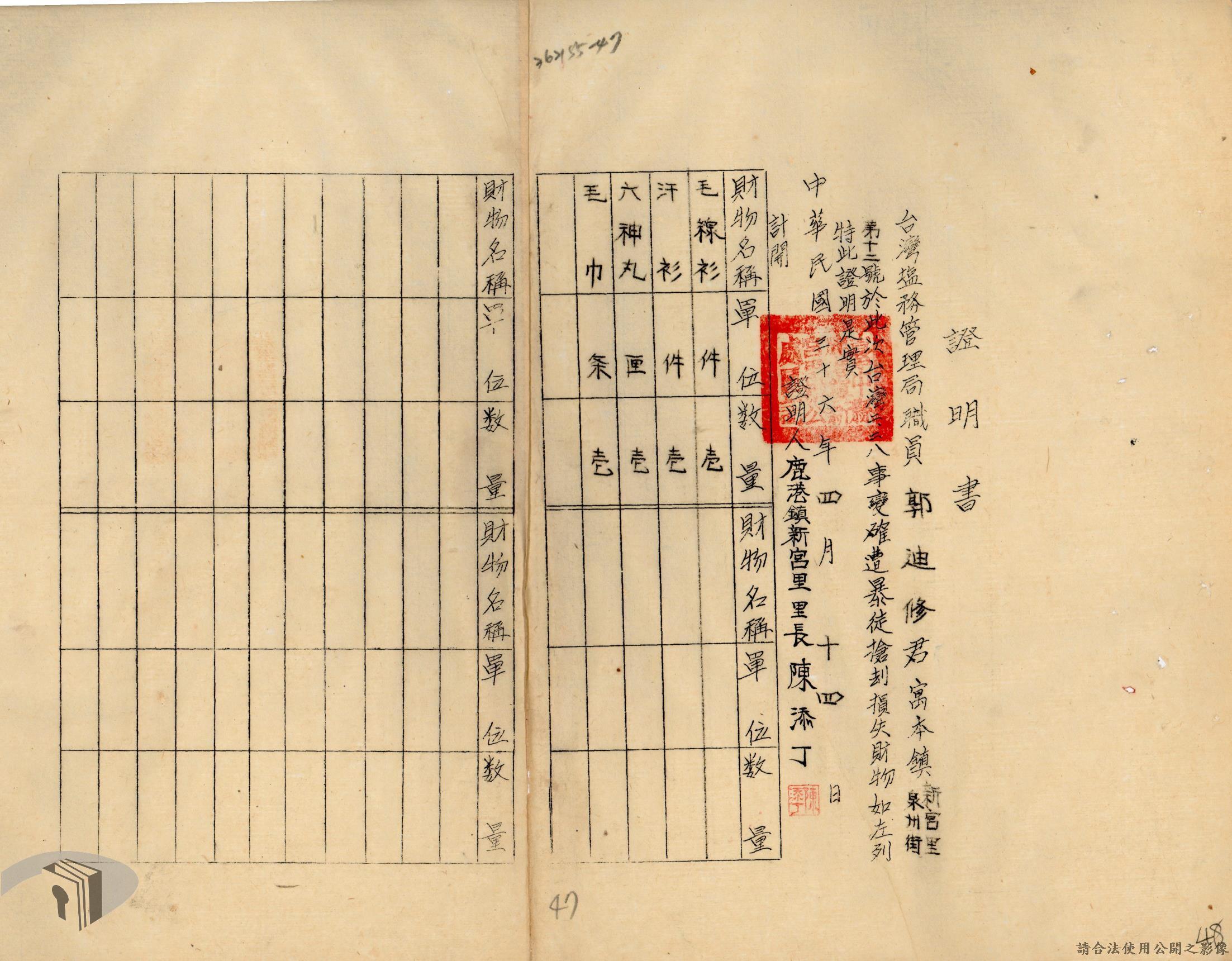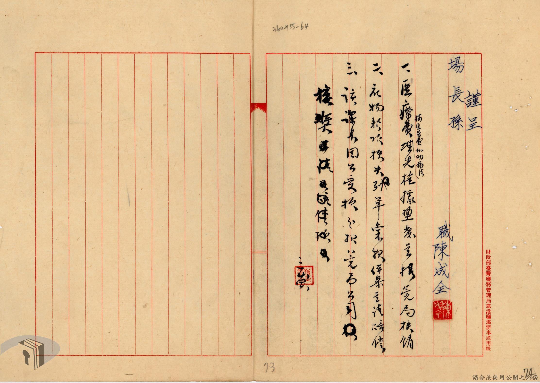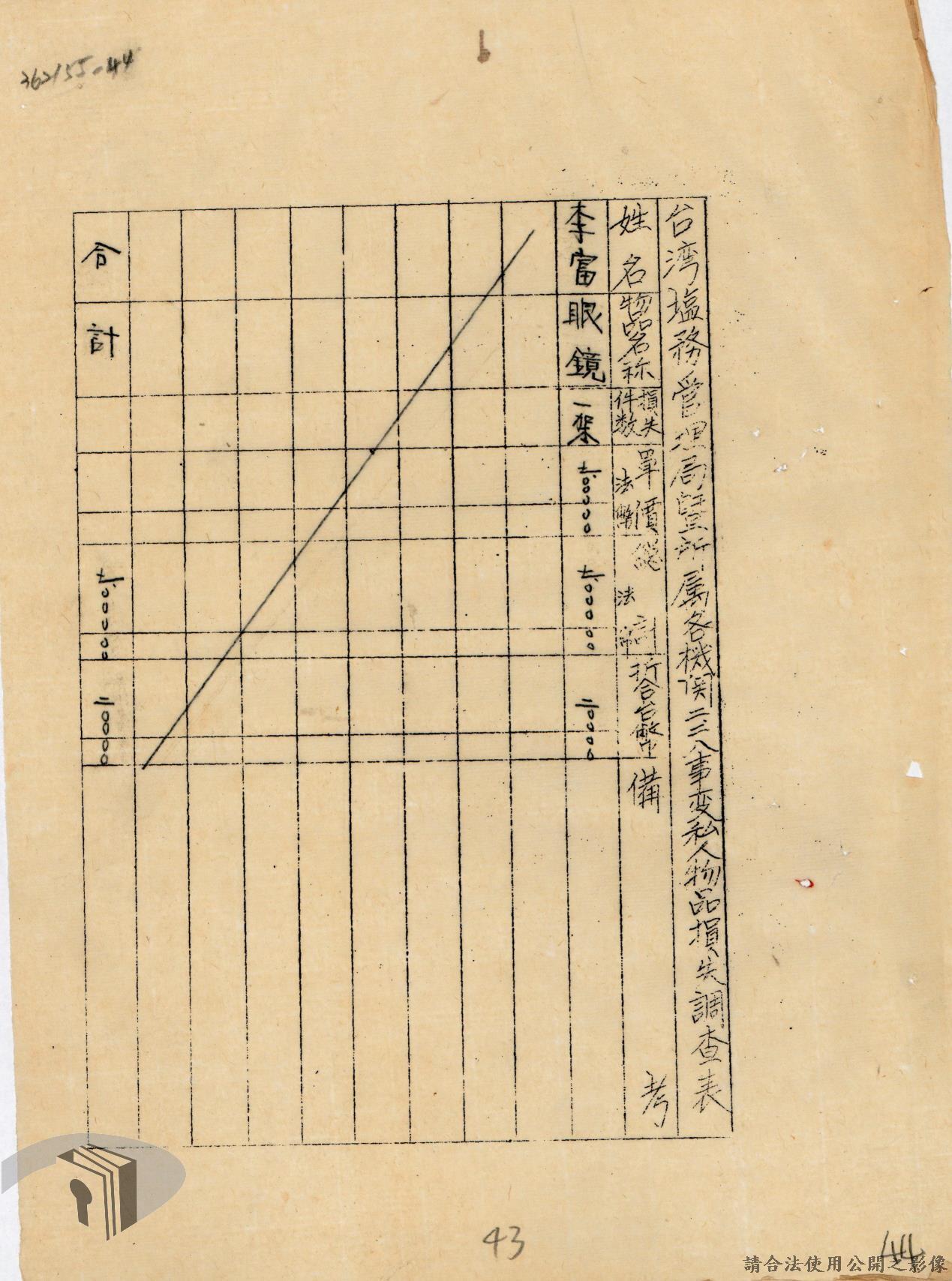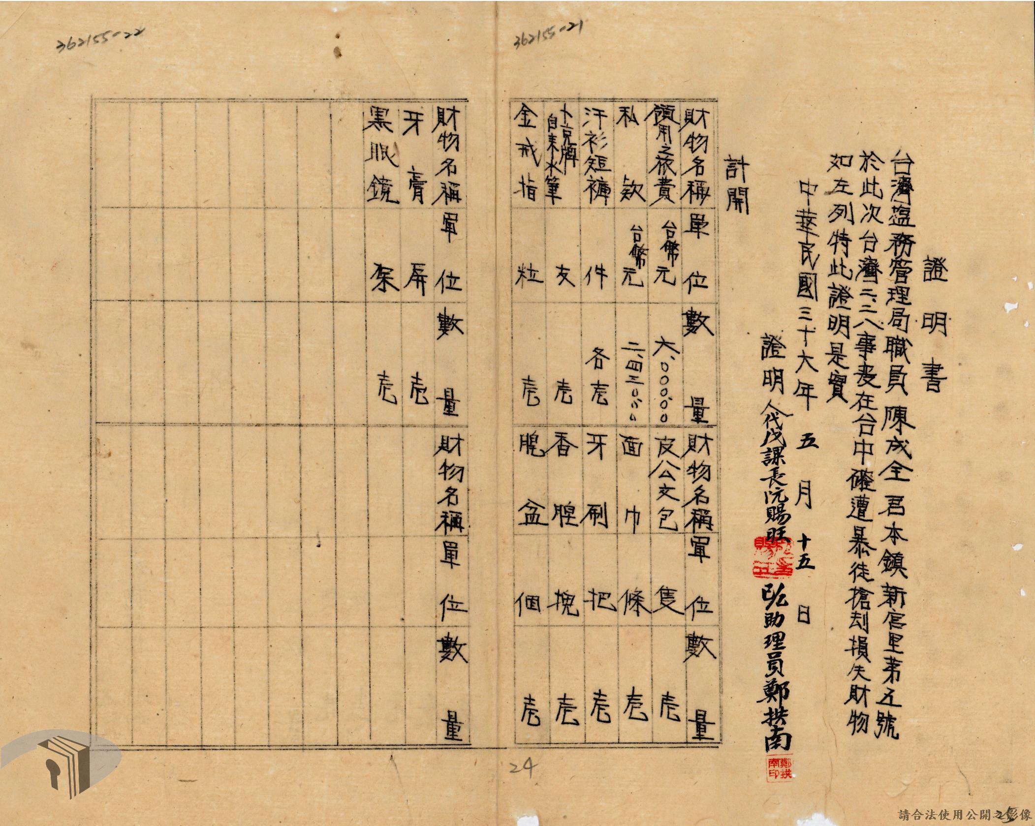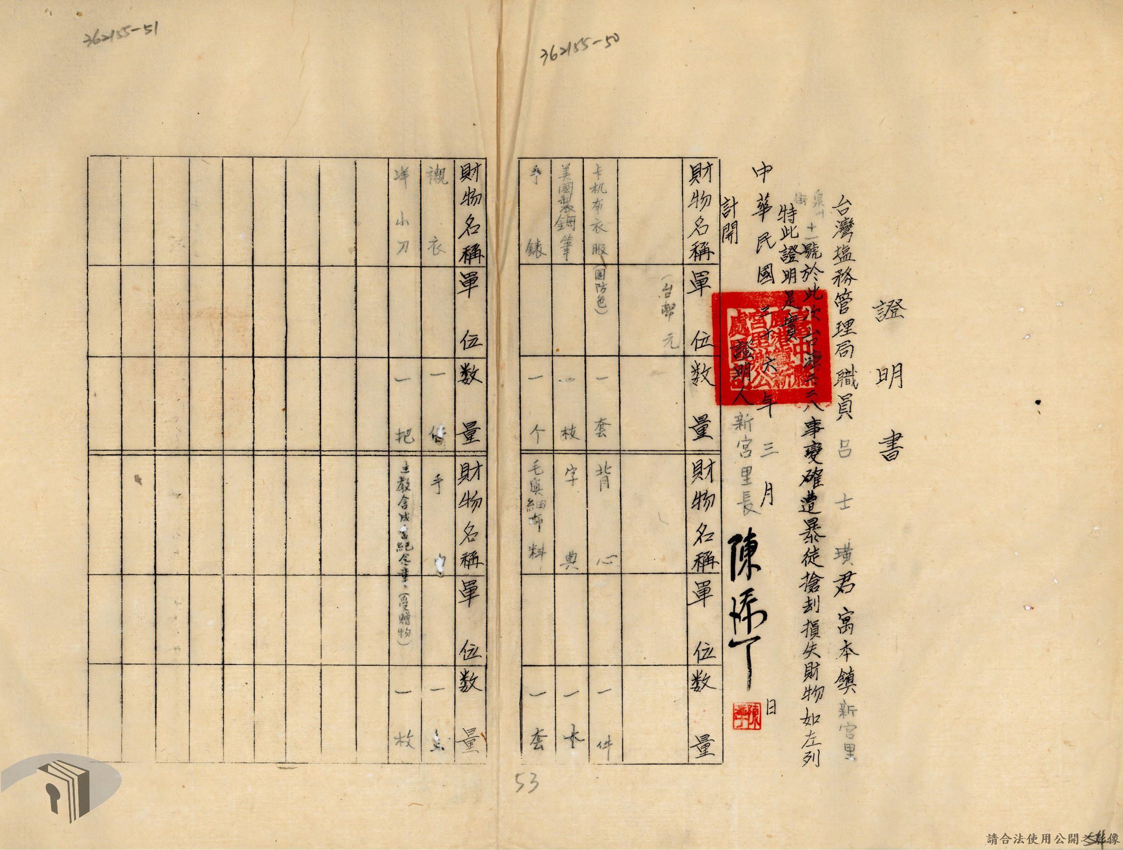 本案為36至37年間,財政部臺灣鹽務管理局函請鹿港鹽場公署報告公私損失情形予該局,該署函送員工損失清單,並函請該局給予救濟金,後臺灣鹽務管理局函請該公署發還該局墊付費用。附證明書。