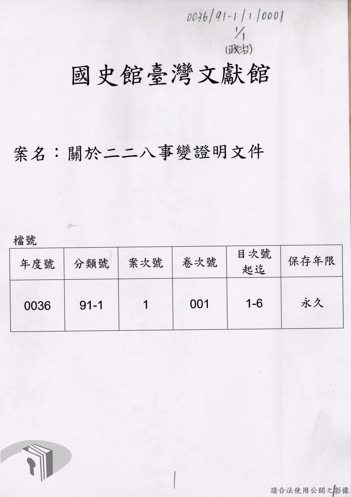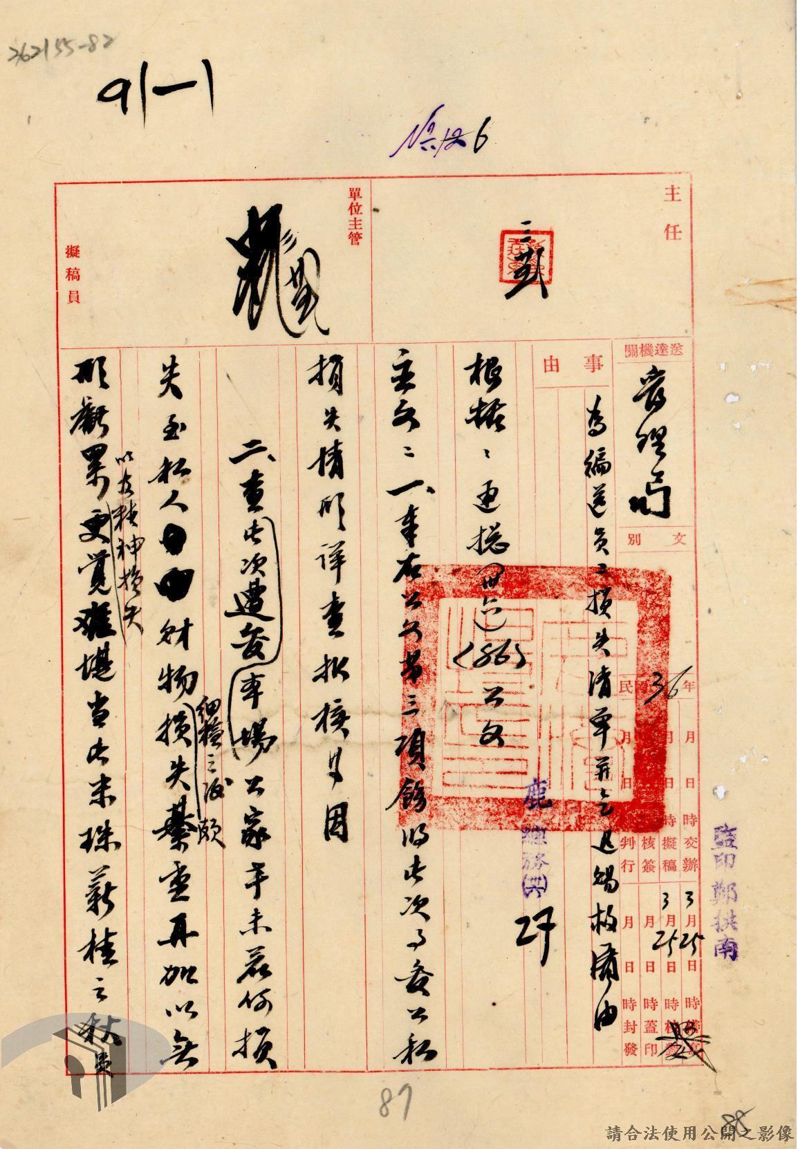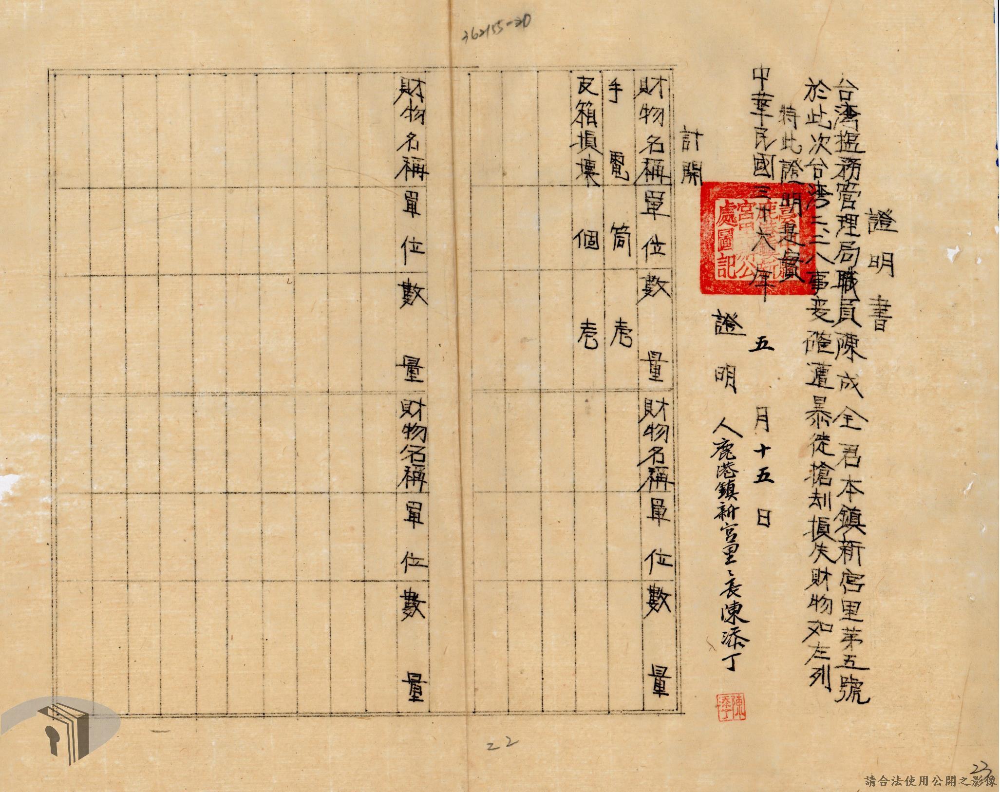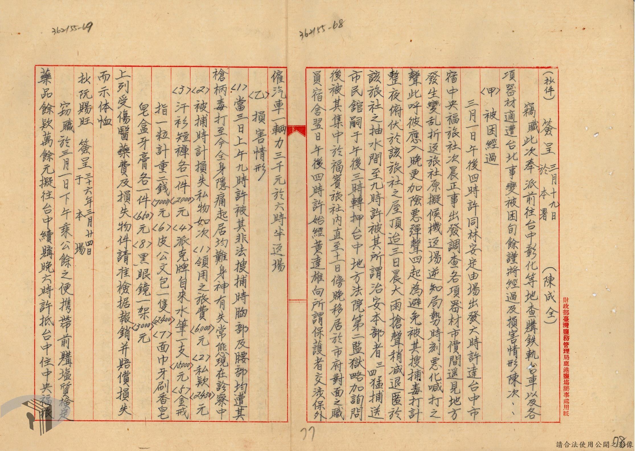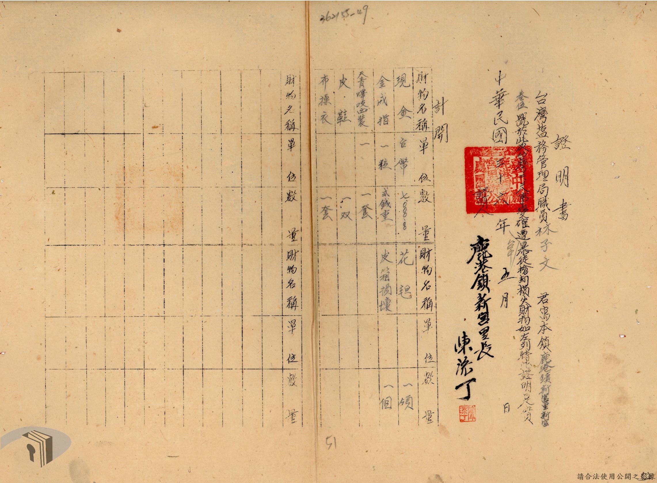本案為36至37年間,財政部臺灣鹽務管理局函請鹿港鹽場公署報告公私損失情形予該局,該署函送員工損失清單,並函請該局給予救濟金,後臺灣鹽務管理局函請該公署發還該局墊付費用。附證明書。
