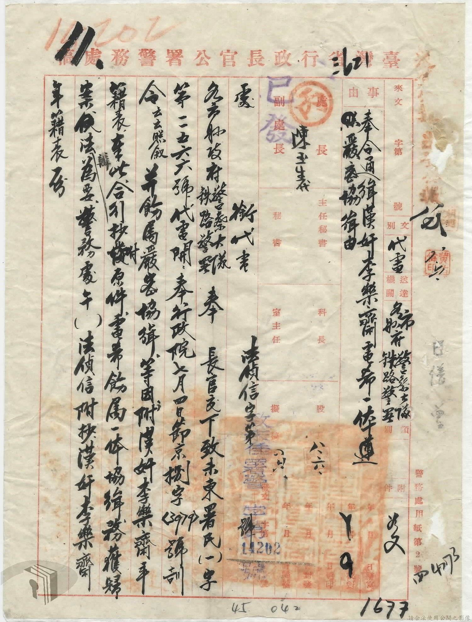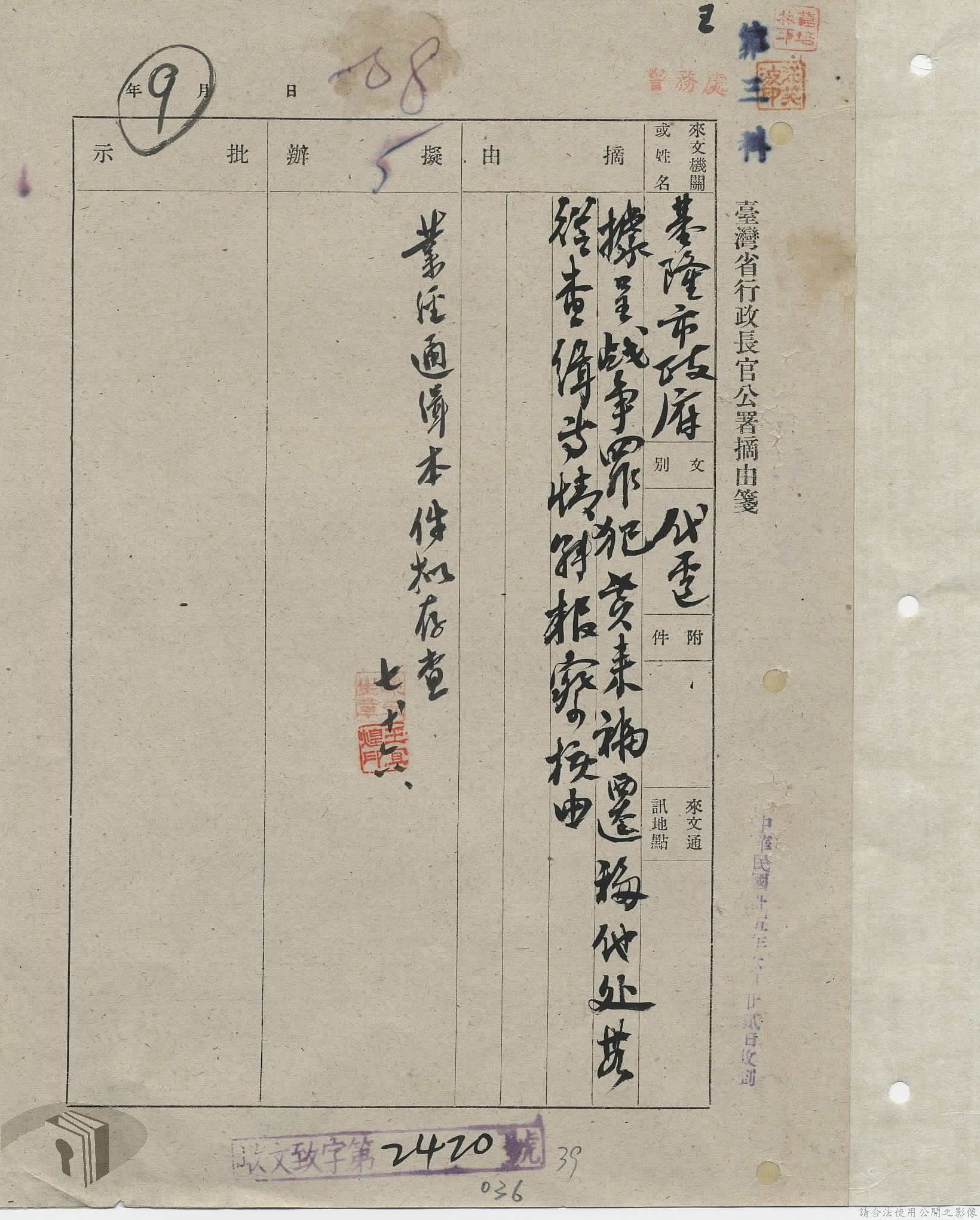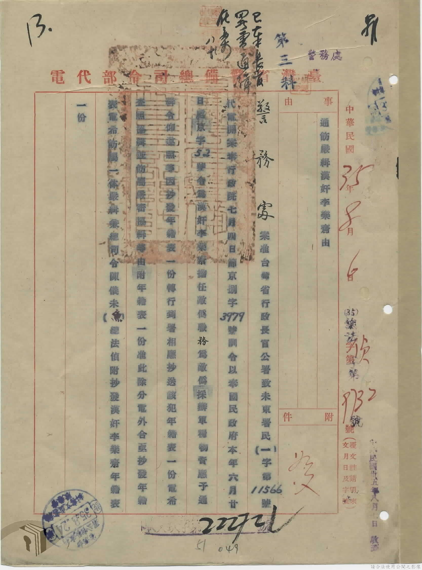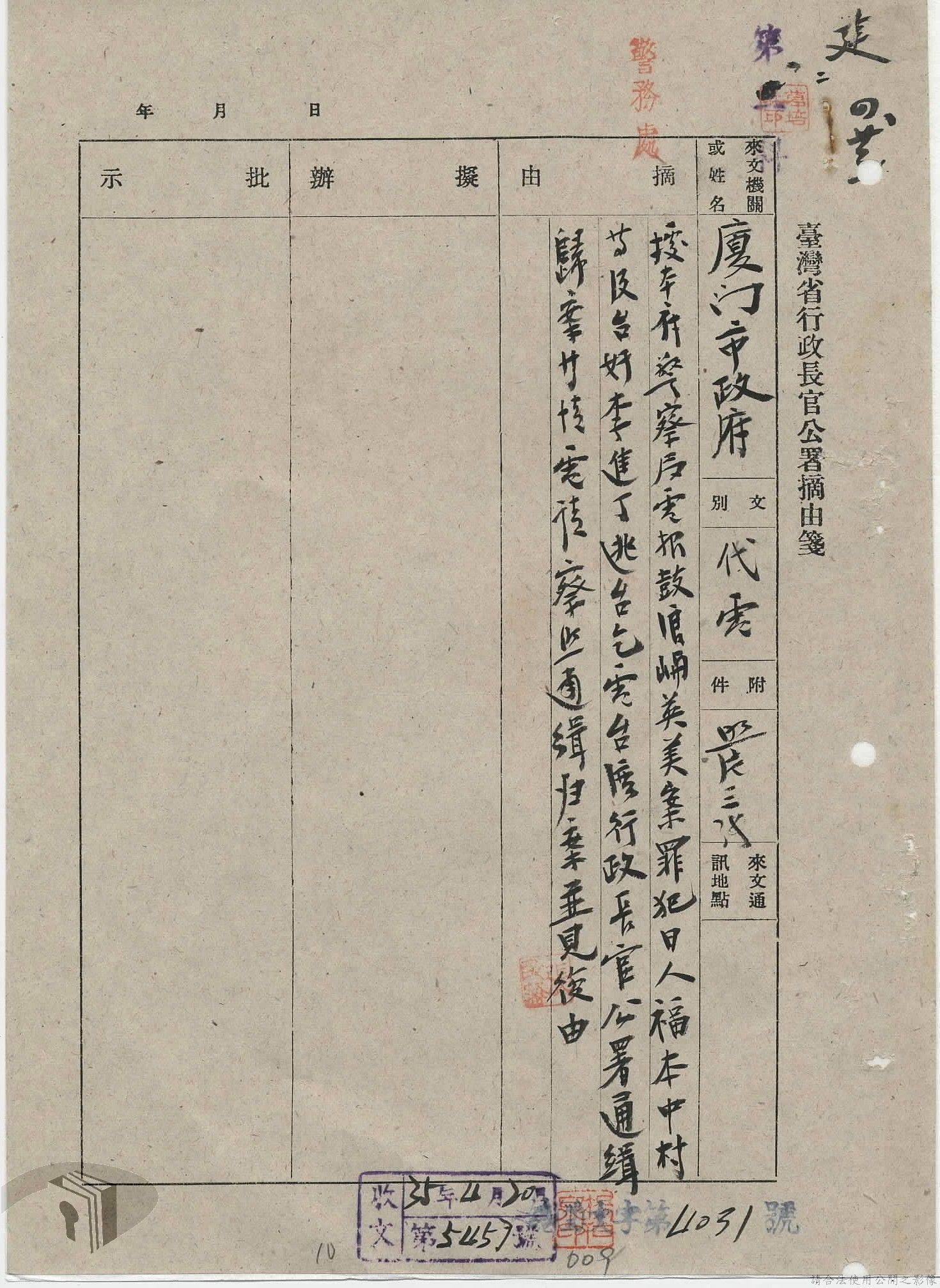 本案為35年間,國民政府電請臺灣省行政長官公署拘捕涉案人員歸案,長官公署電請臺灣省警備總司令部協助辦理;臺南縣政府將涉案人員及相關資料解送臺灣省行政長官公署警務處,警務處後將該案移送警備總部辦理;警務處電請相關單位將涉案人員緝捕歸案等。