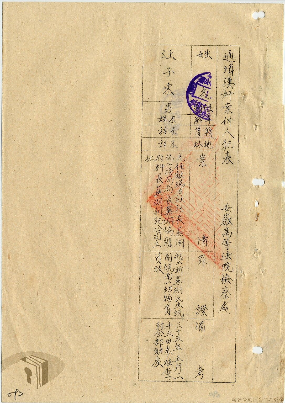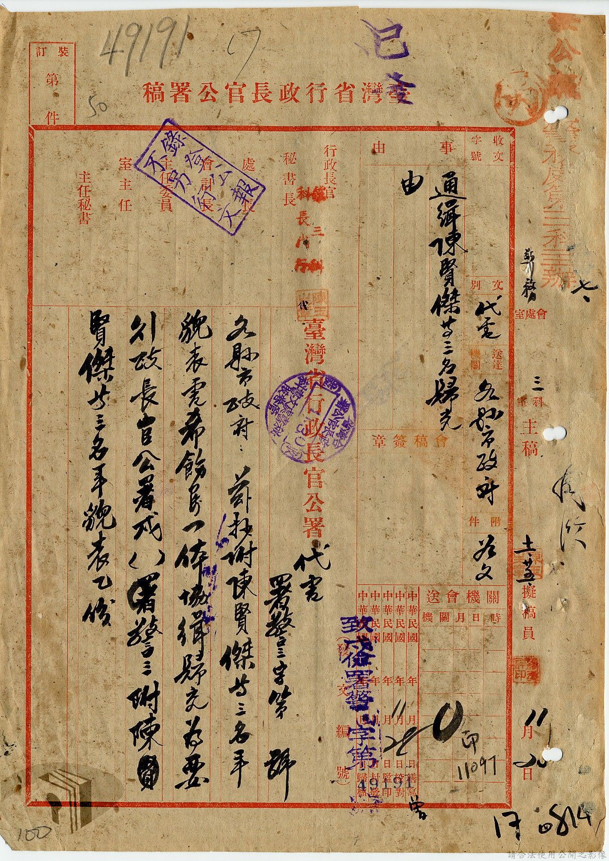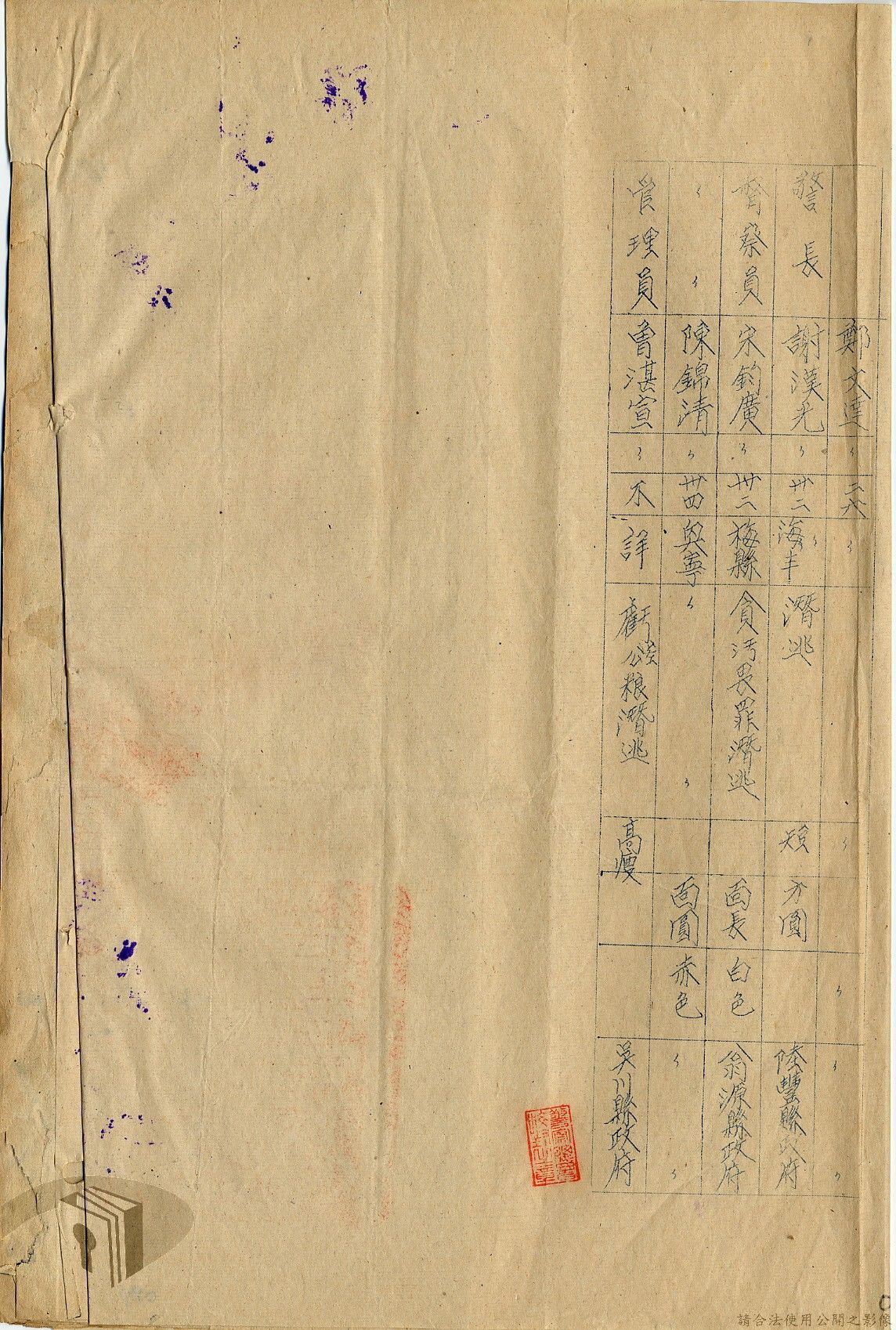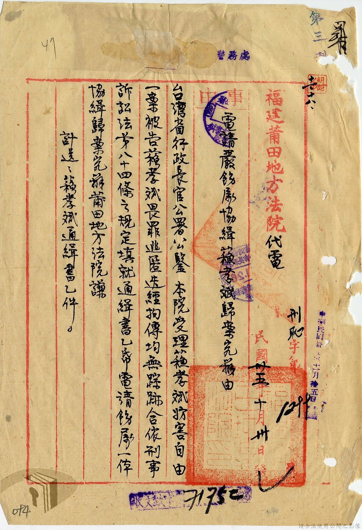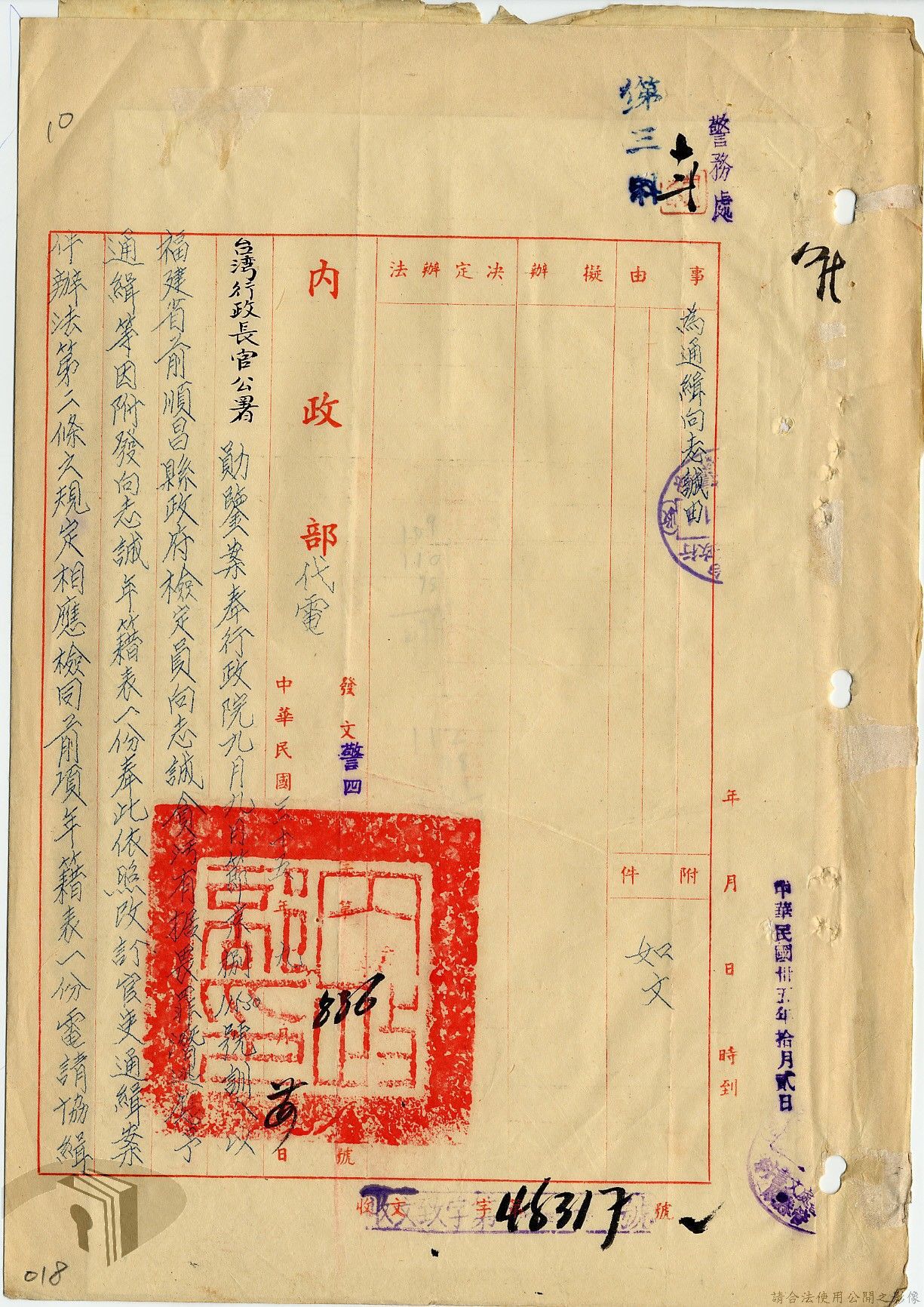 本案為35年間,內政部依照行政院令發有關各省潛逃官員之通緝逃犯資料給臺灣省行政長官公署警務處,內容包括江西省龍南縣長、湖北應山縣長瀆職殺人,恩施站長私運銅礦等案,後行政長官公署警務處發電報請各縣市政府將逃亡官員緝捕歸案。