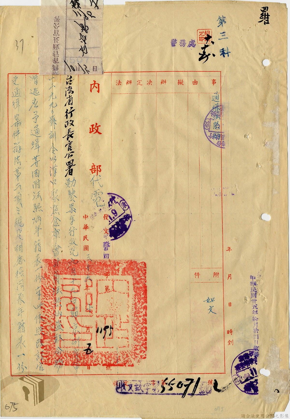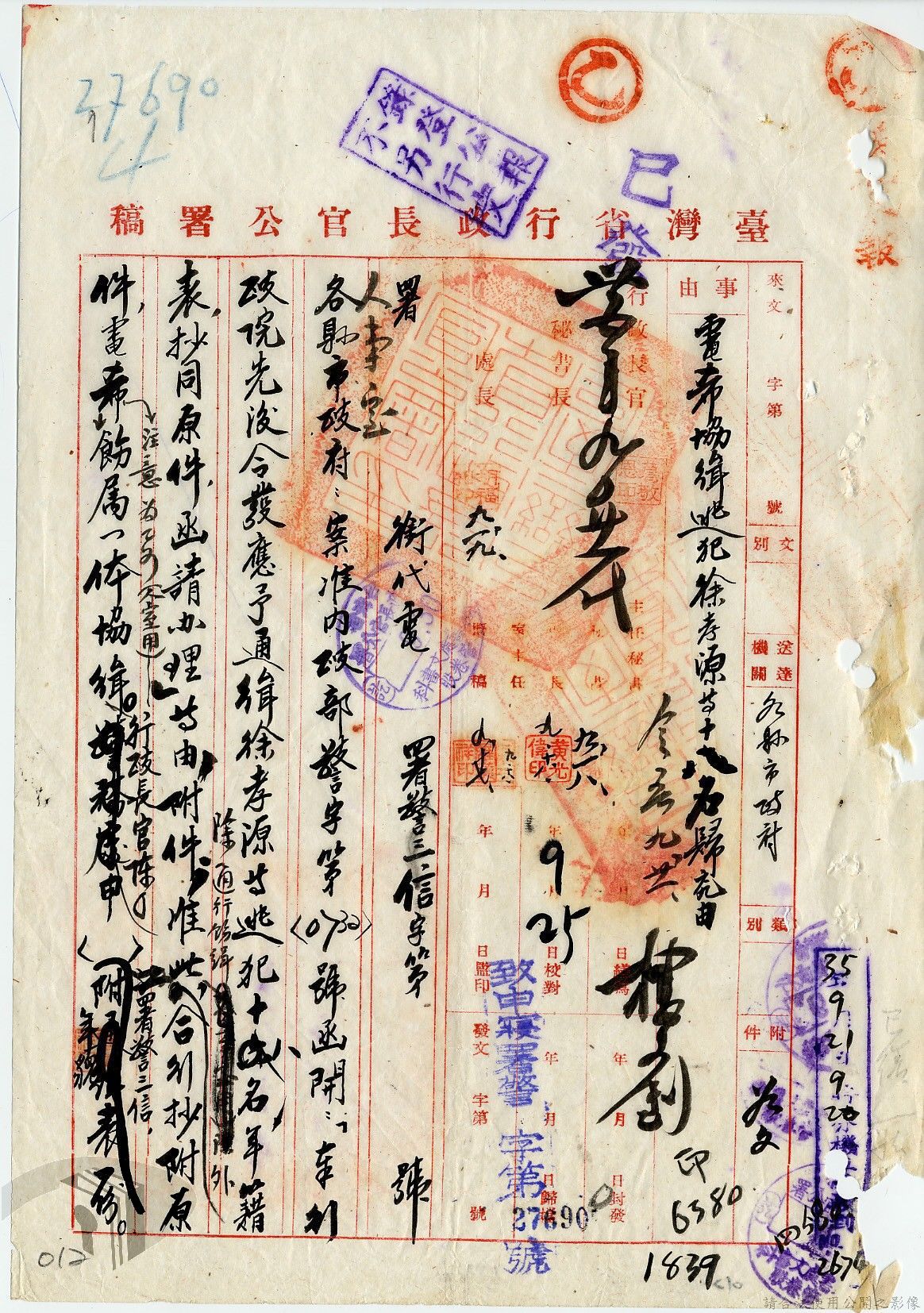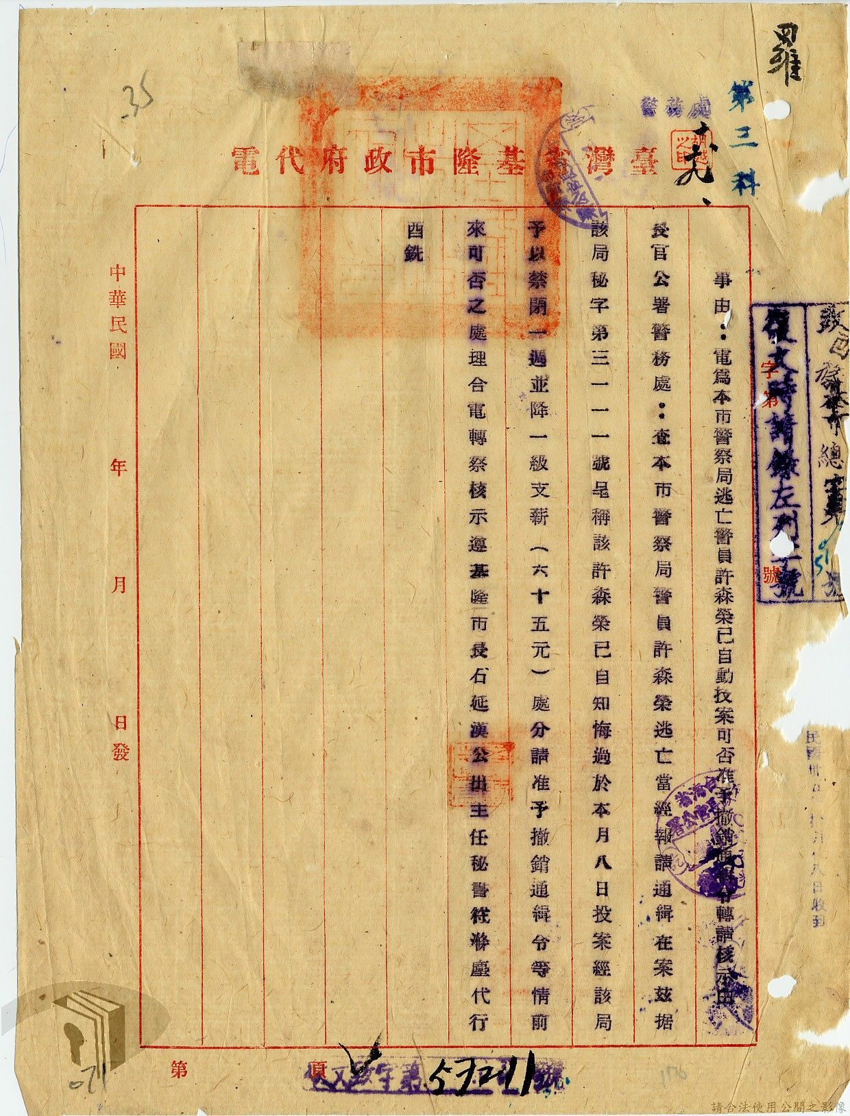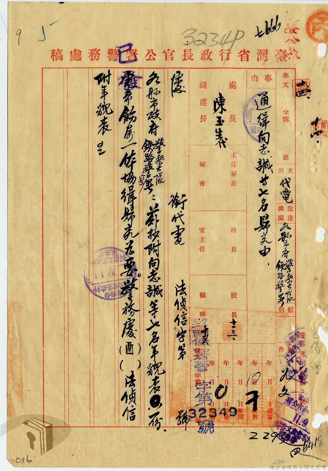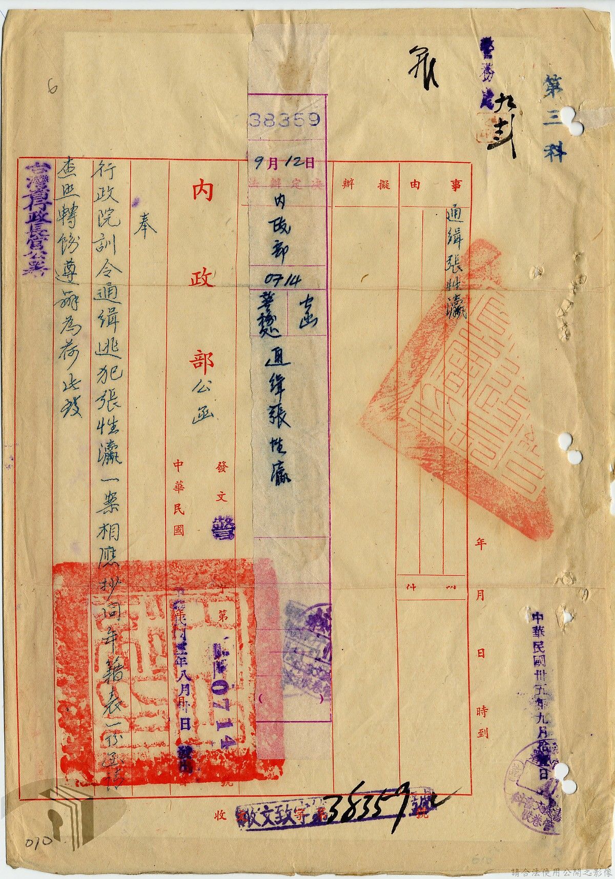 本案為35年間,內政部依照行政院令發有關各省潛逃官員之通緝逃犯資料給臺灣省行政長官公署警務處,內容包括江西省龍南縣長、湖北應山縣長瀆職殺人,恩施站長私運銅礦等案,後行政長官公署警務處發電報請各縣市政府將逃亡官員緝捕歸案。