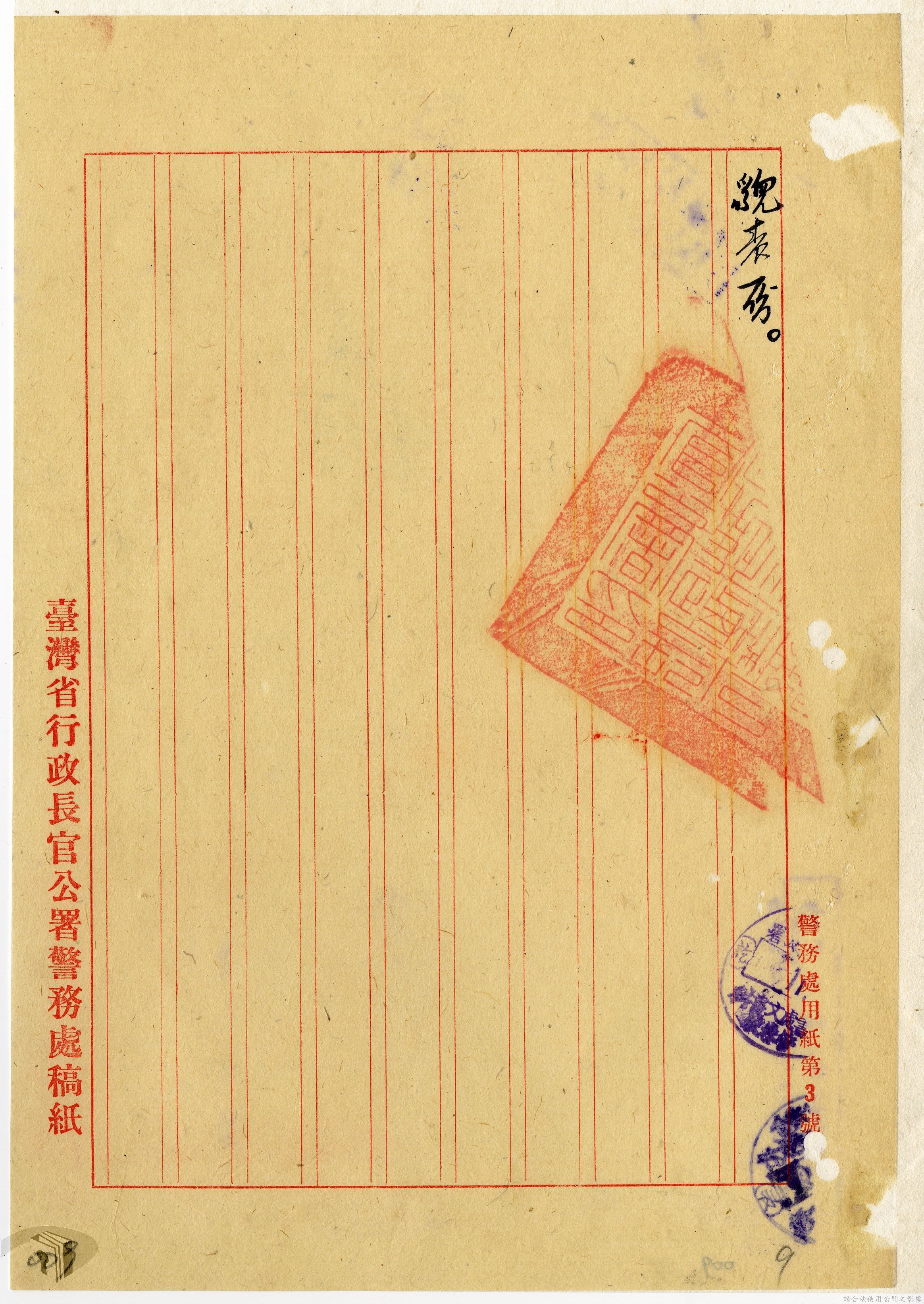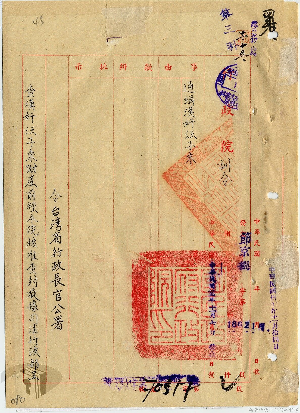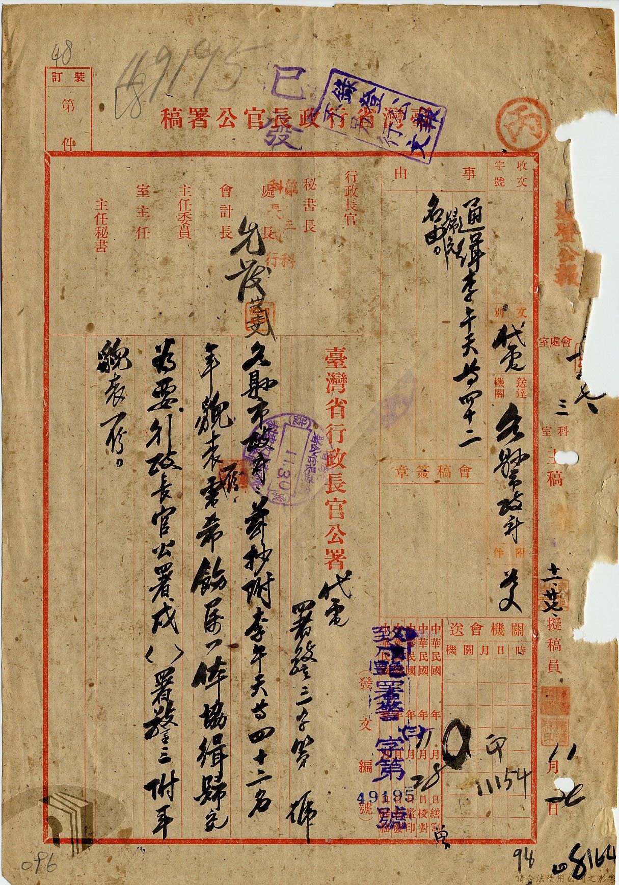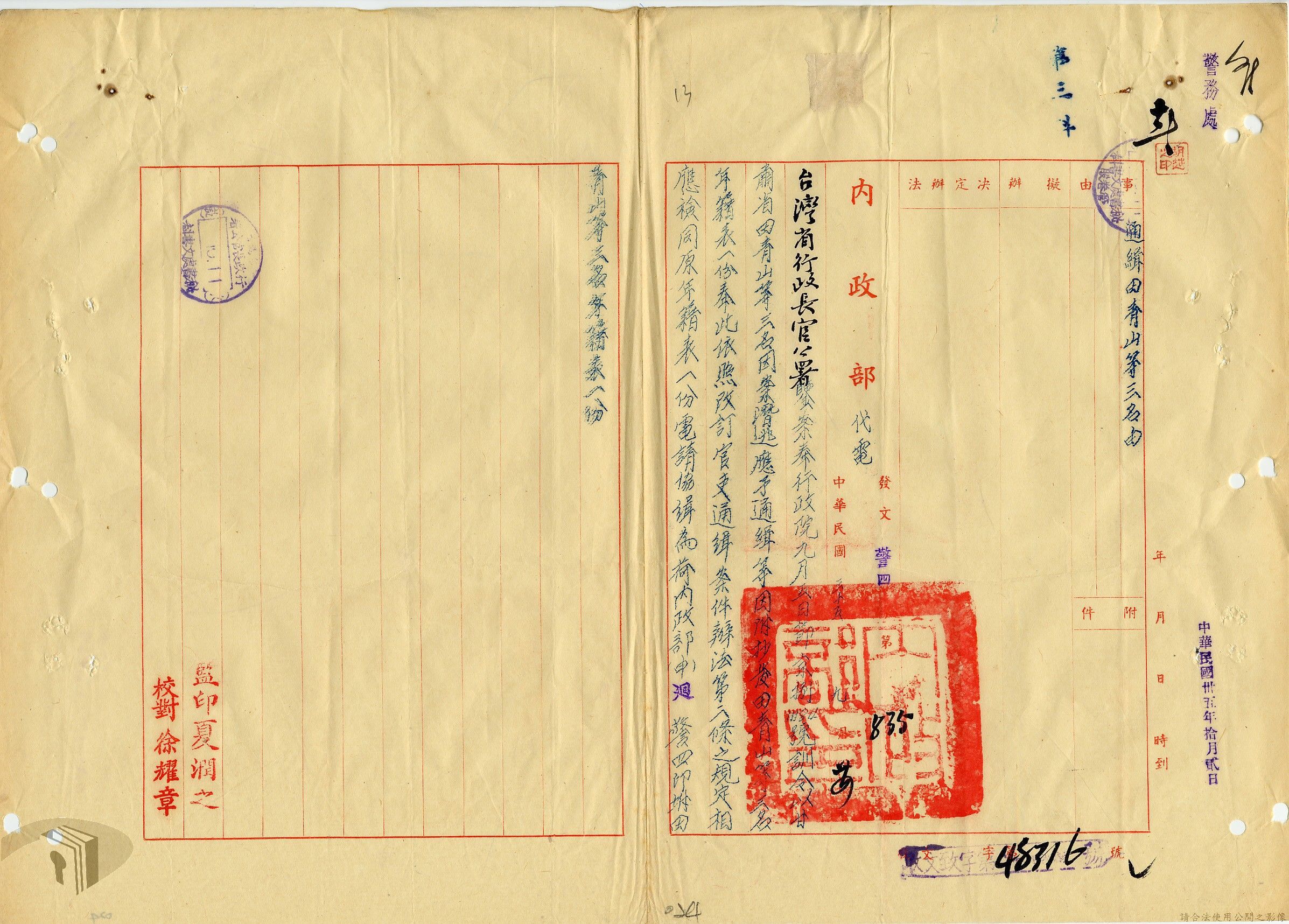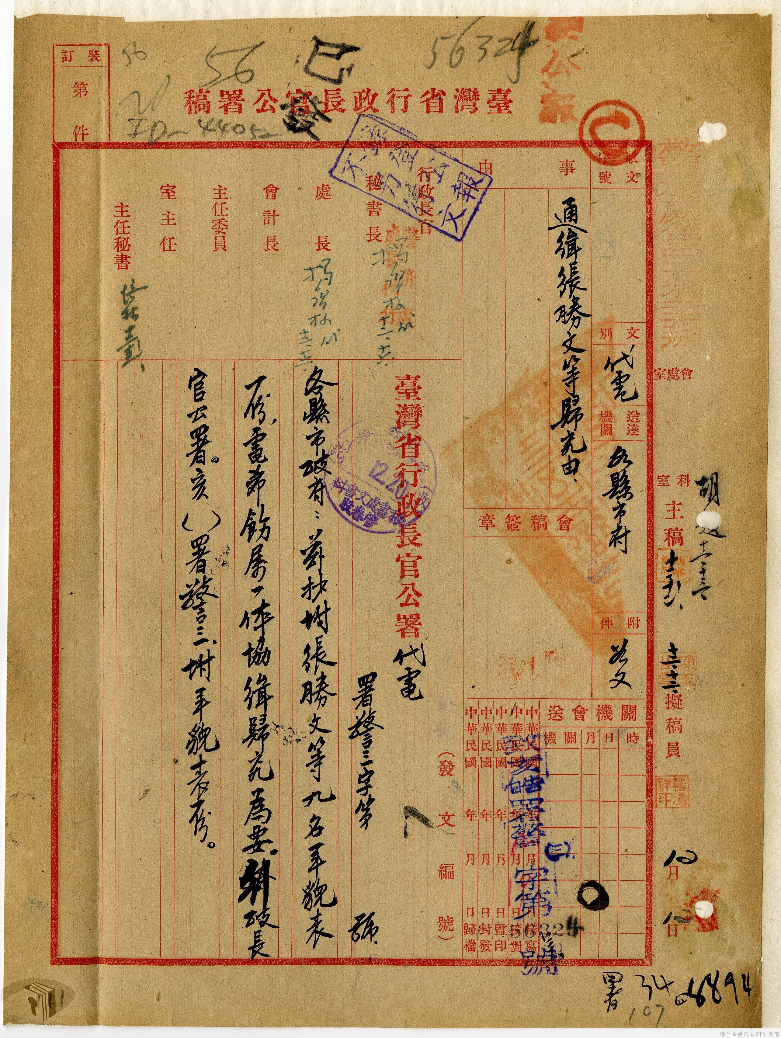本案為35年間,內政部依照行政院令發有關各省潛逃官員之通緝逃犯資料給臺灣省行政長官公署警務處,內容包括江西省龍南縣長、湖北應山縣長瀆職殺人,恩施站長私運銅礦等案,後行政長官公署警務處發電報請各縣市政府將逃亡官員緝捕歸案。