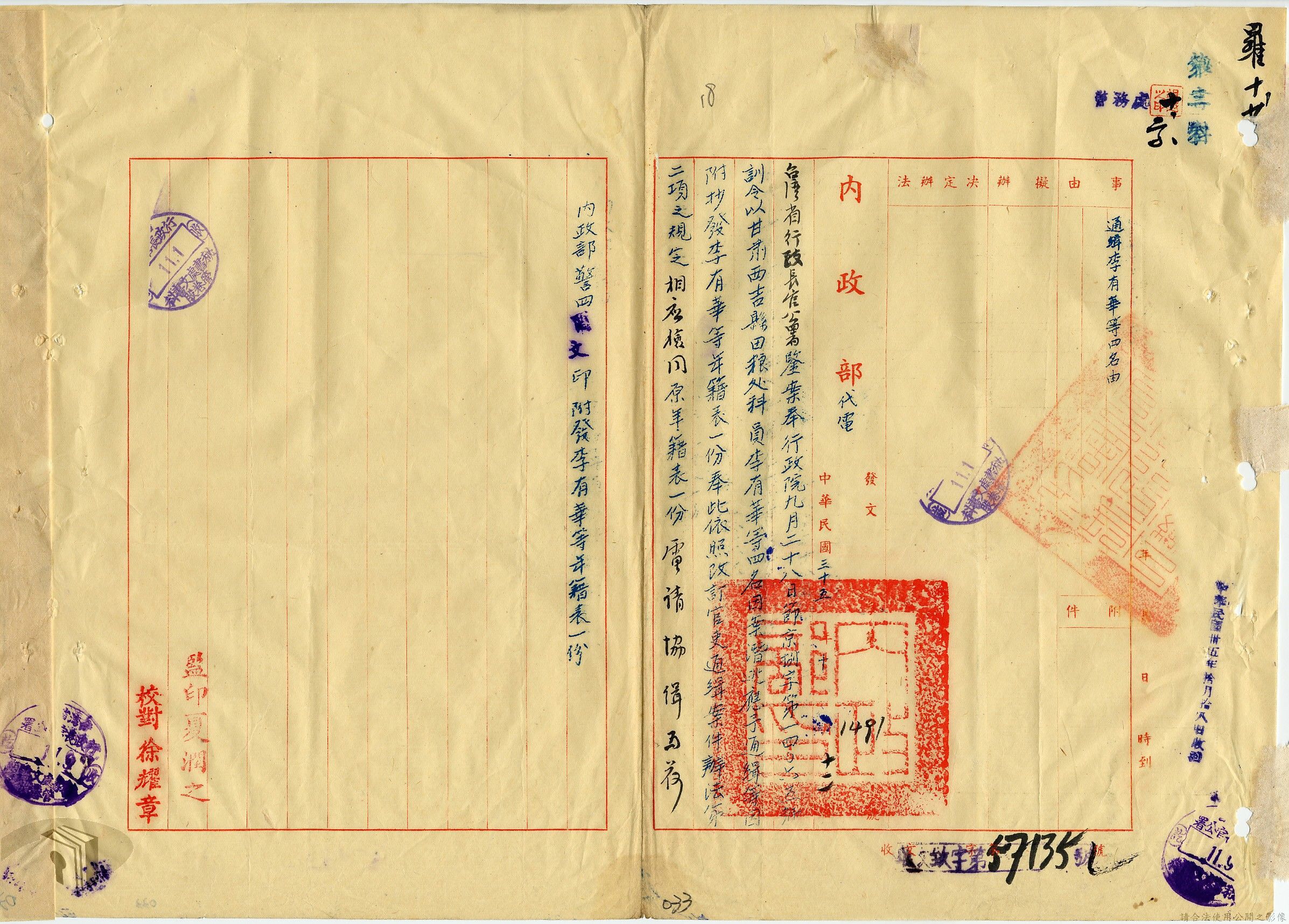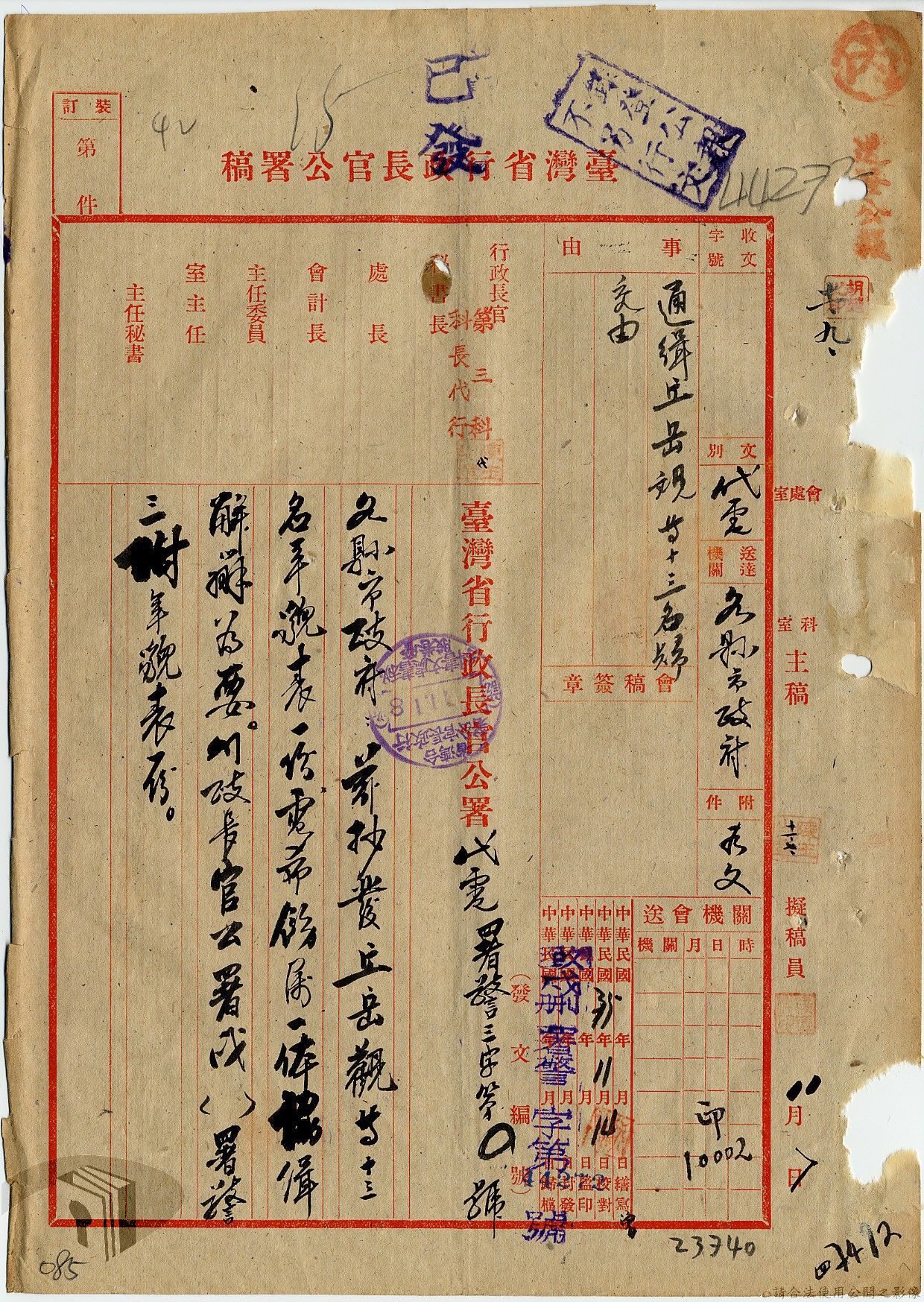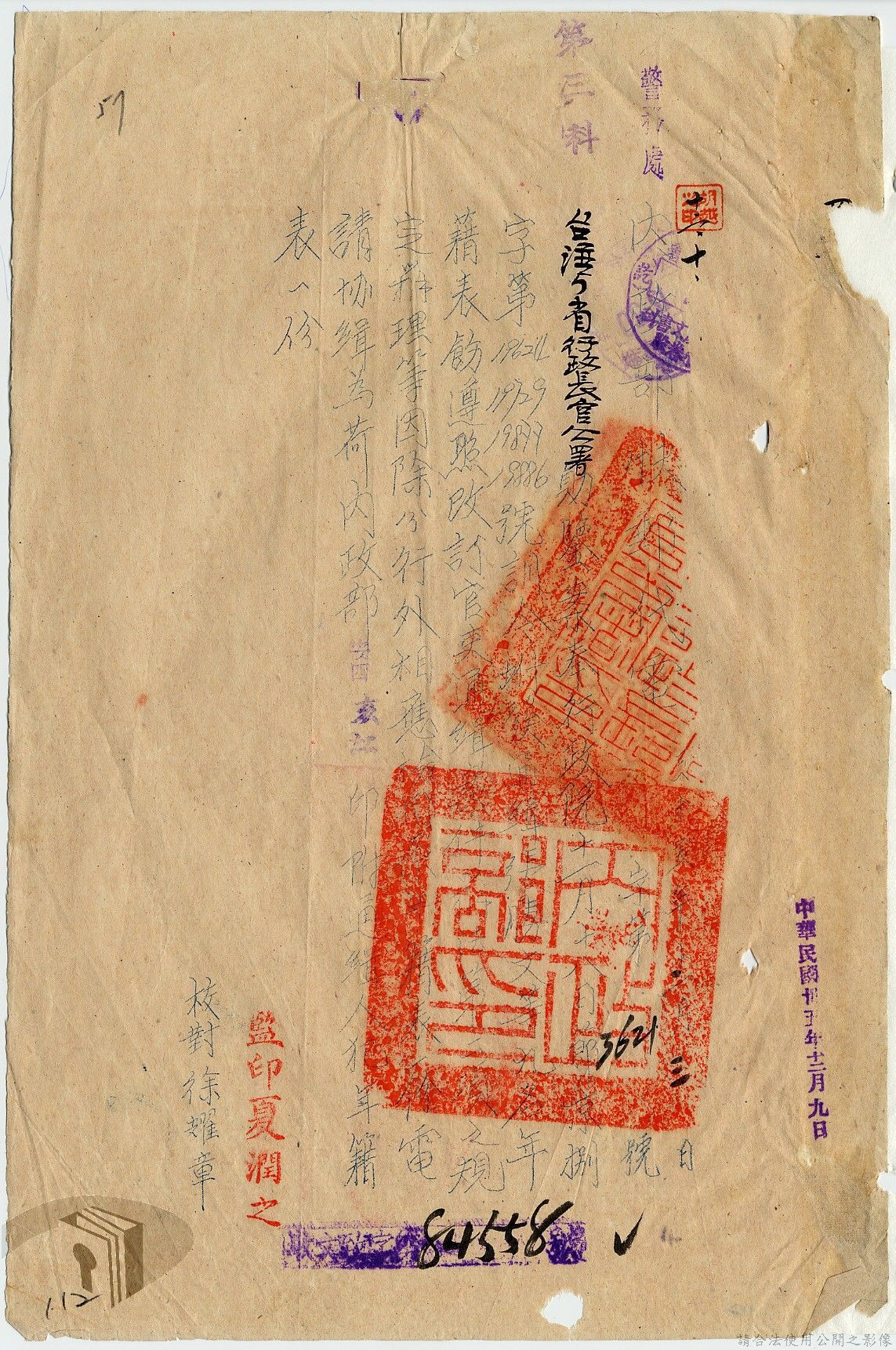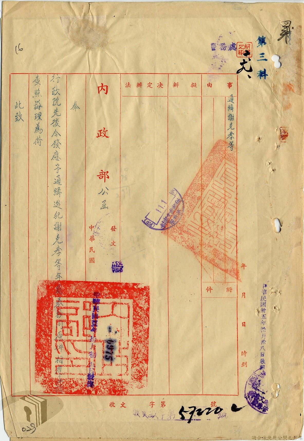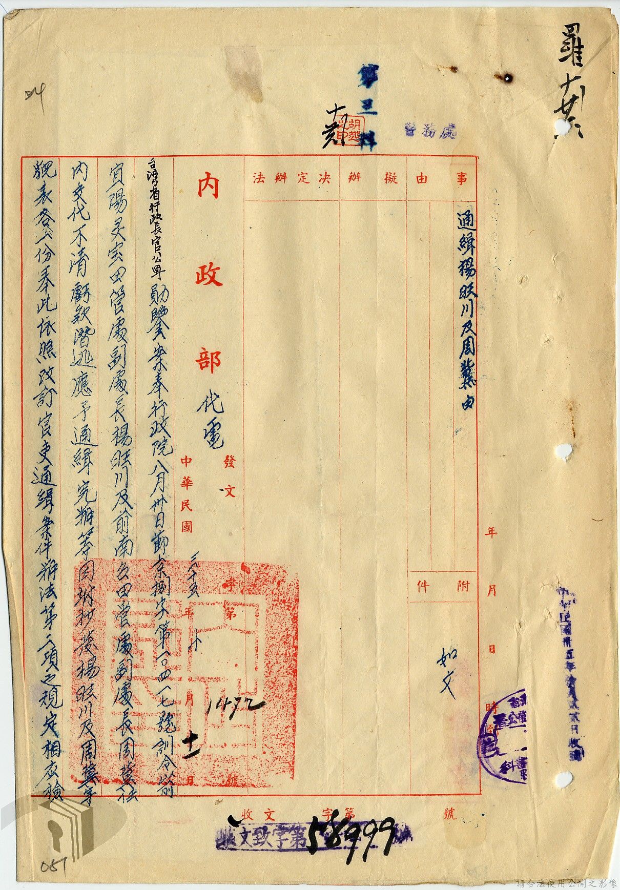 本案為35年間,內政部依照行政院令發有關各省潛逃官員之通緝逃犯資料給臺灣省行政長官公署警務處,內容包括江西省龍南縣長、湖北應山縣長瀆職殺人,恩施站長私運銅礦等案,後行政長官公署警務處發電報請各縣市政府將逃亡官員緝捕歸案。