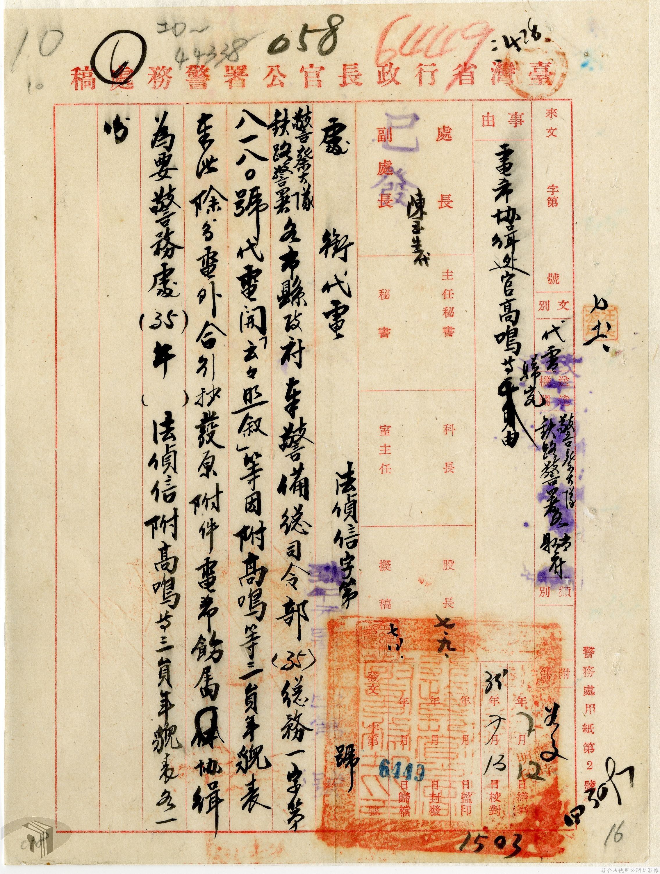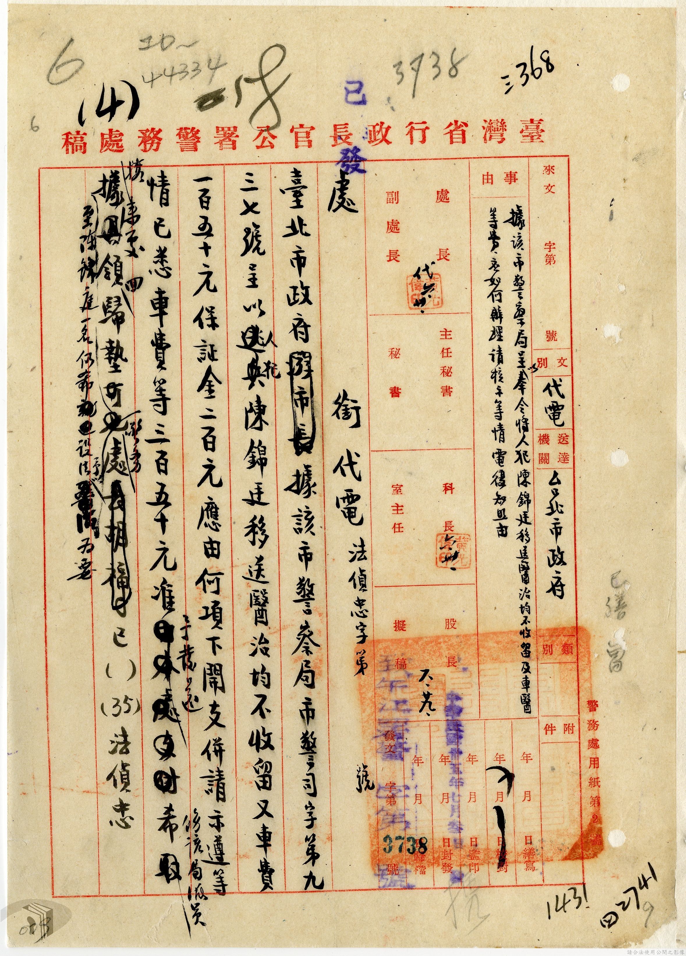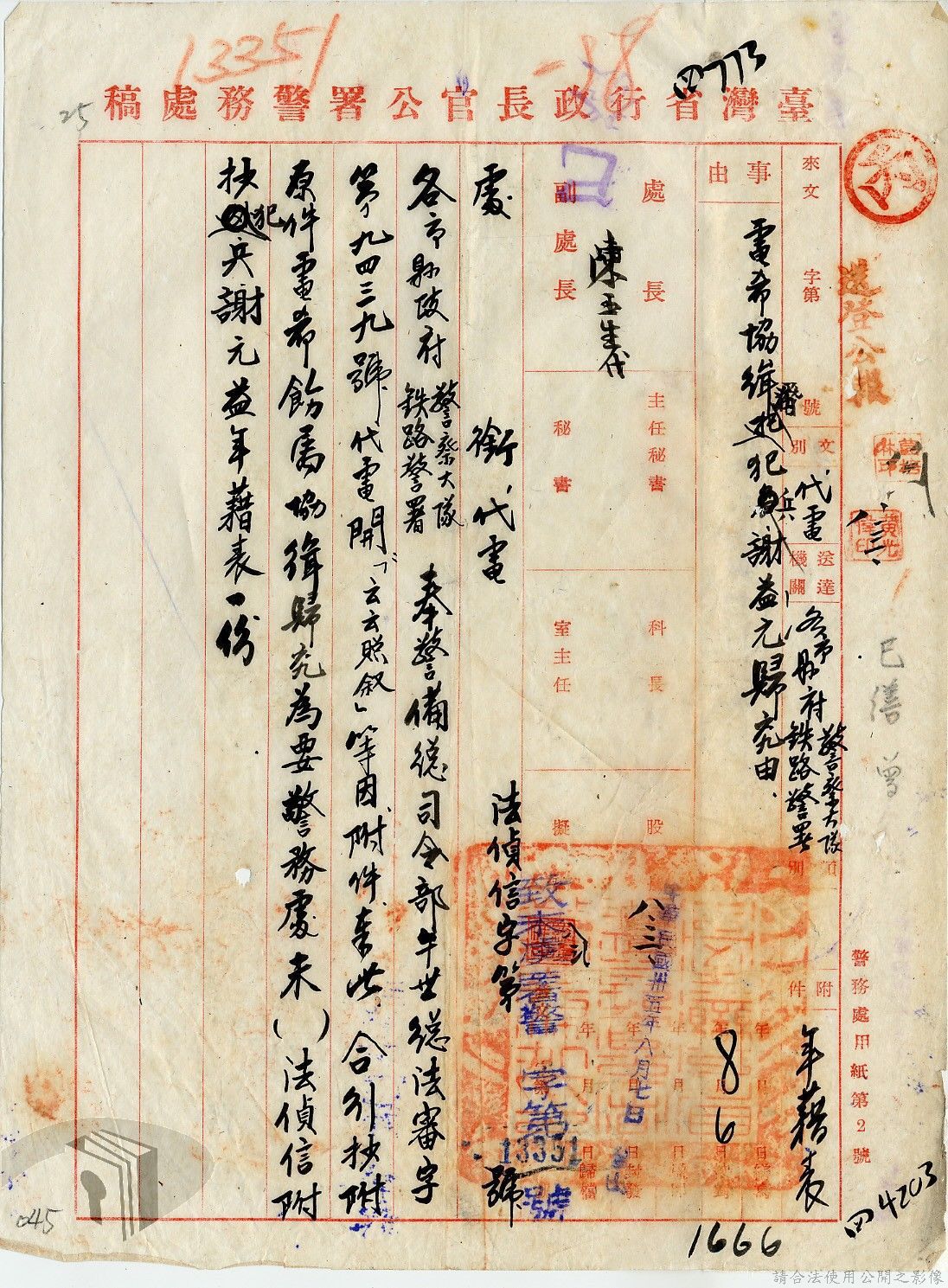 本案為35至36年間,高雄縣政府因為東港區、恆春區警所拘留人犯脫逃的關係,陳請臺灣省行政長官公署警務處予以通緝,並檢送脫逃人員年貌表給警務處,後行政長官公署警務處發電報請各縣市政府、警察大隊、鐵路警察署將脫逃人員緝捕歸案;警務處檢送緝私會議紀錄給糧食局、貿易局等。