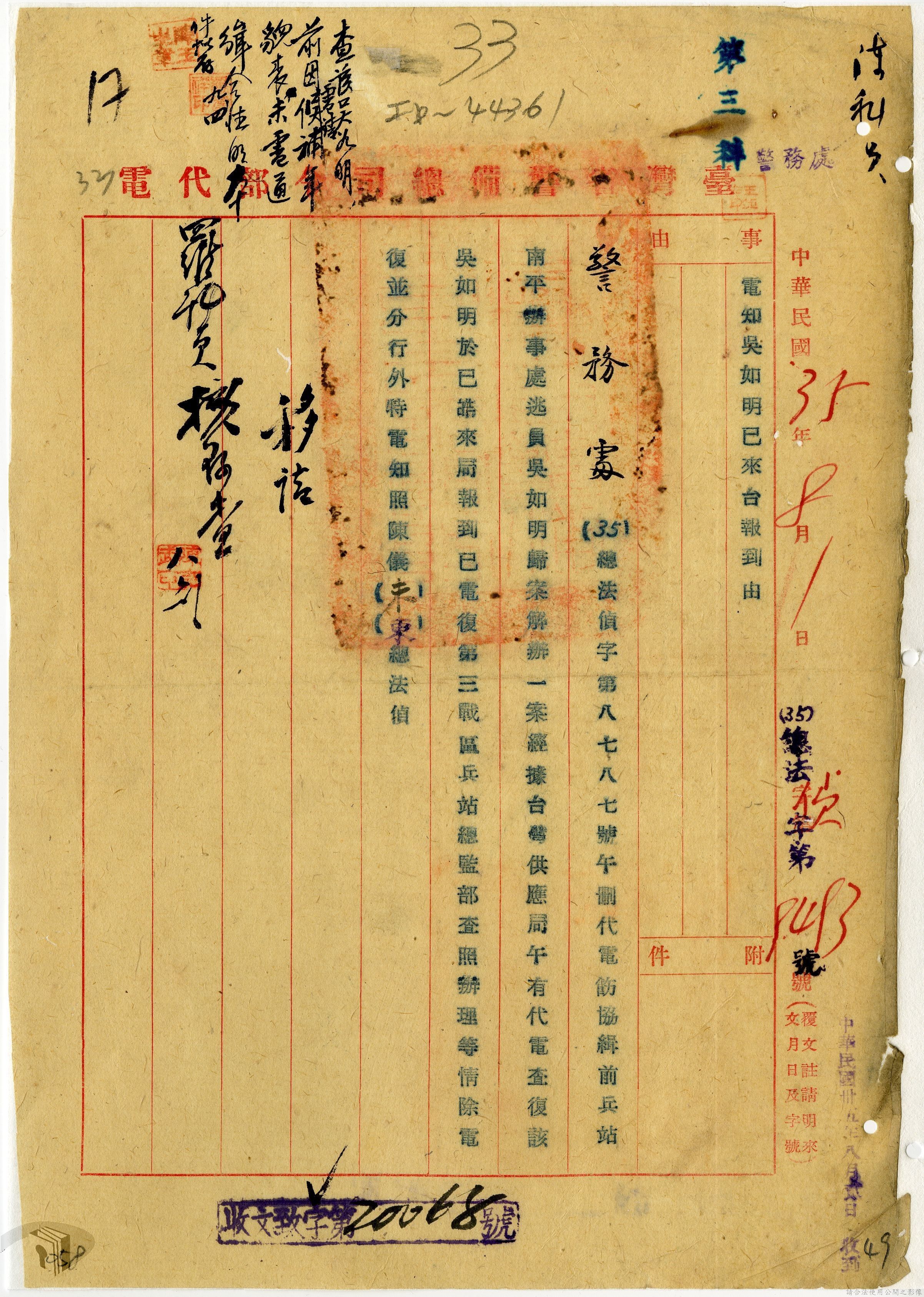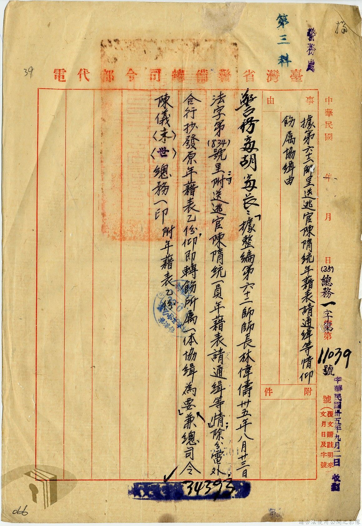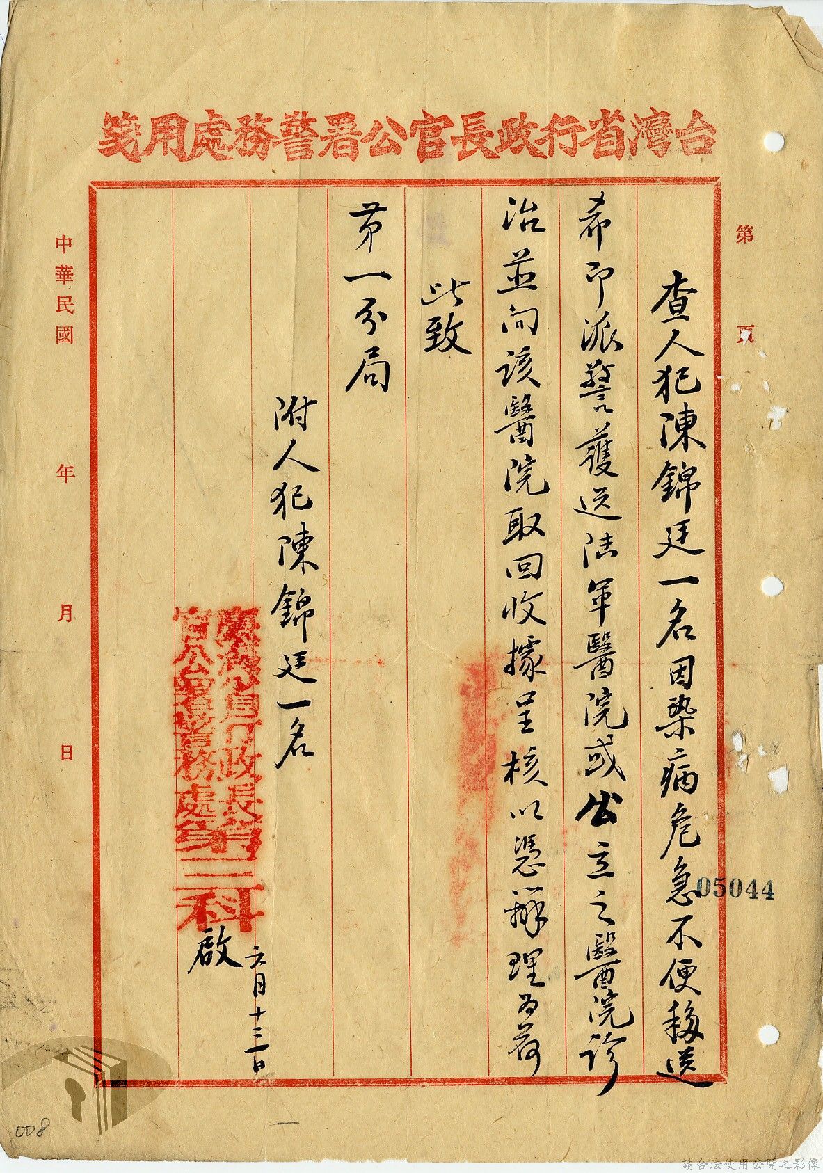 本案為35至36年間,高雄縣政府因為東港區、恆春區警所拘留人犯脫逃的關係,陳請臺灣省行政長官公署警務處予以通緝,並檢送脫逃人員年貌表給警務處,後行政長官公署警務處發電報請各縣市政府、警察大隊、鐵路警察署將脫逃人員緝捕歸案;警務處檢送緝私會議紀錄給糧食局、貿易局等。