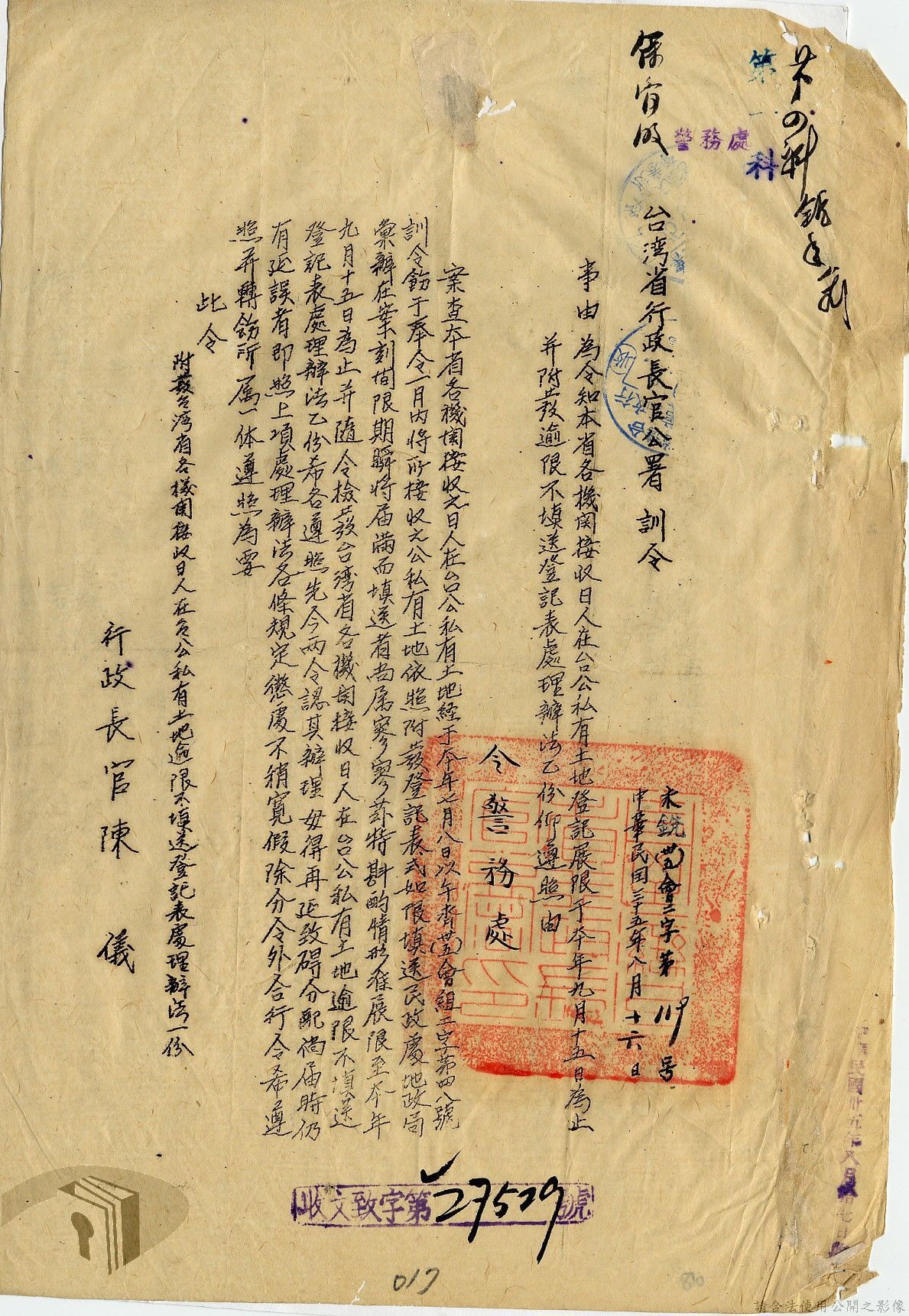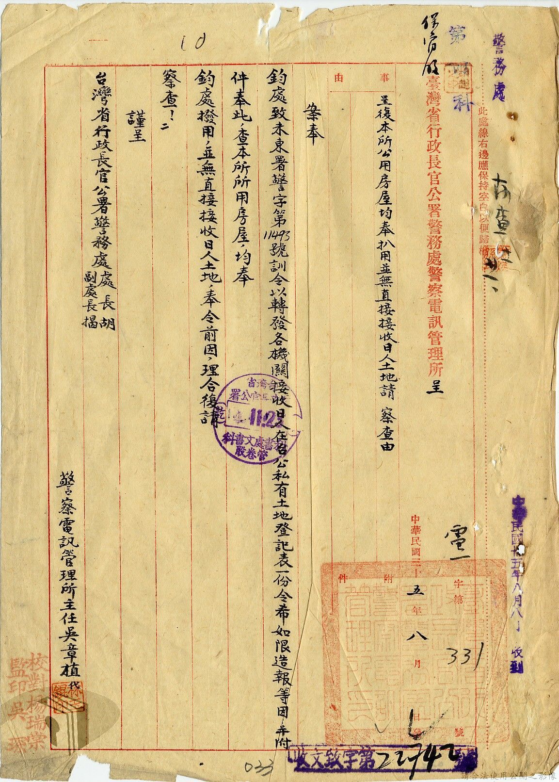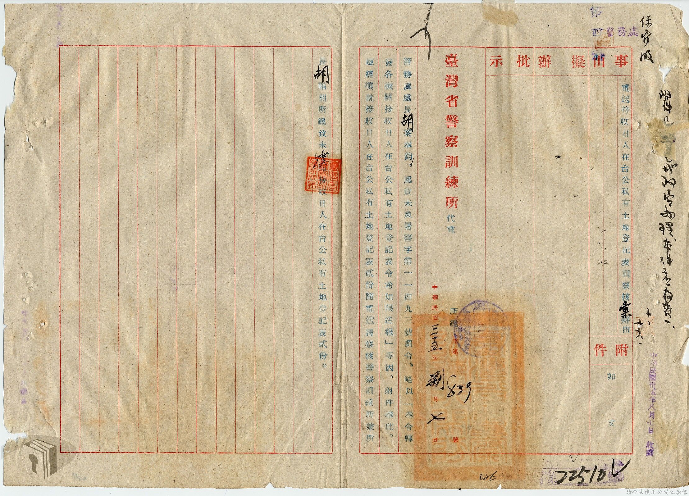 本案為35至36年間,臺灣省行政長官公署警務處辦理有關接收之日人房產土地之登記及申請留用之經過,以及轉發臺灣省行政長官公署所頒「臺灣省公有土地緊急清查辦法」至所屬各單位,以憑公地清查團執行清查任務時,各機關及縣市政府應指派人員協助辦理,方便明瞭公有土地接管收租及分布情形等。