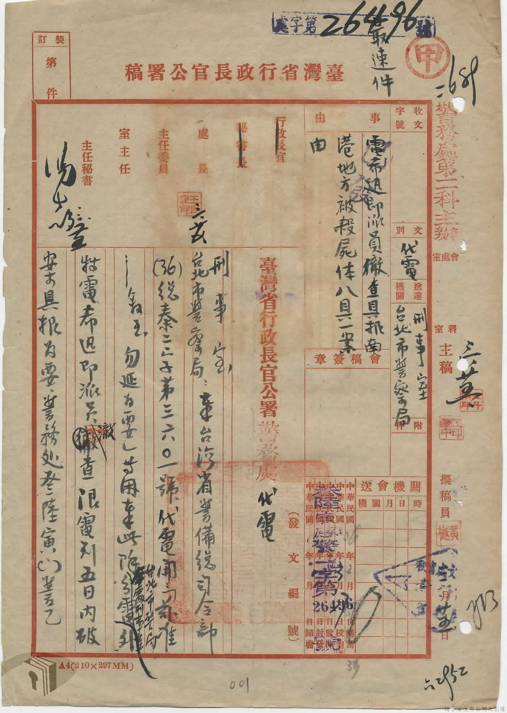 本案為36年間,臺灣省警備總司令部發電報請臺灣省行政長官公署警務處調查臺灣高等法院推事等人遇害案,警務處發電報請臺北市警察局等單位協助辦理,並獲臺北市警局回復,該處後將全案辦理經過情形陳報警備總部。附報告書等文件資料。