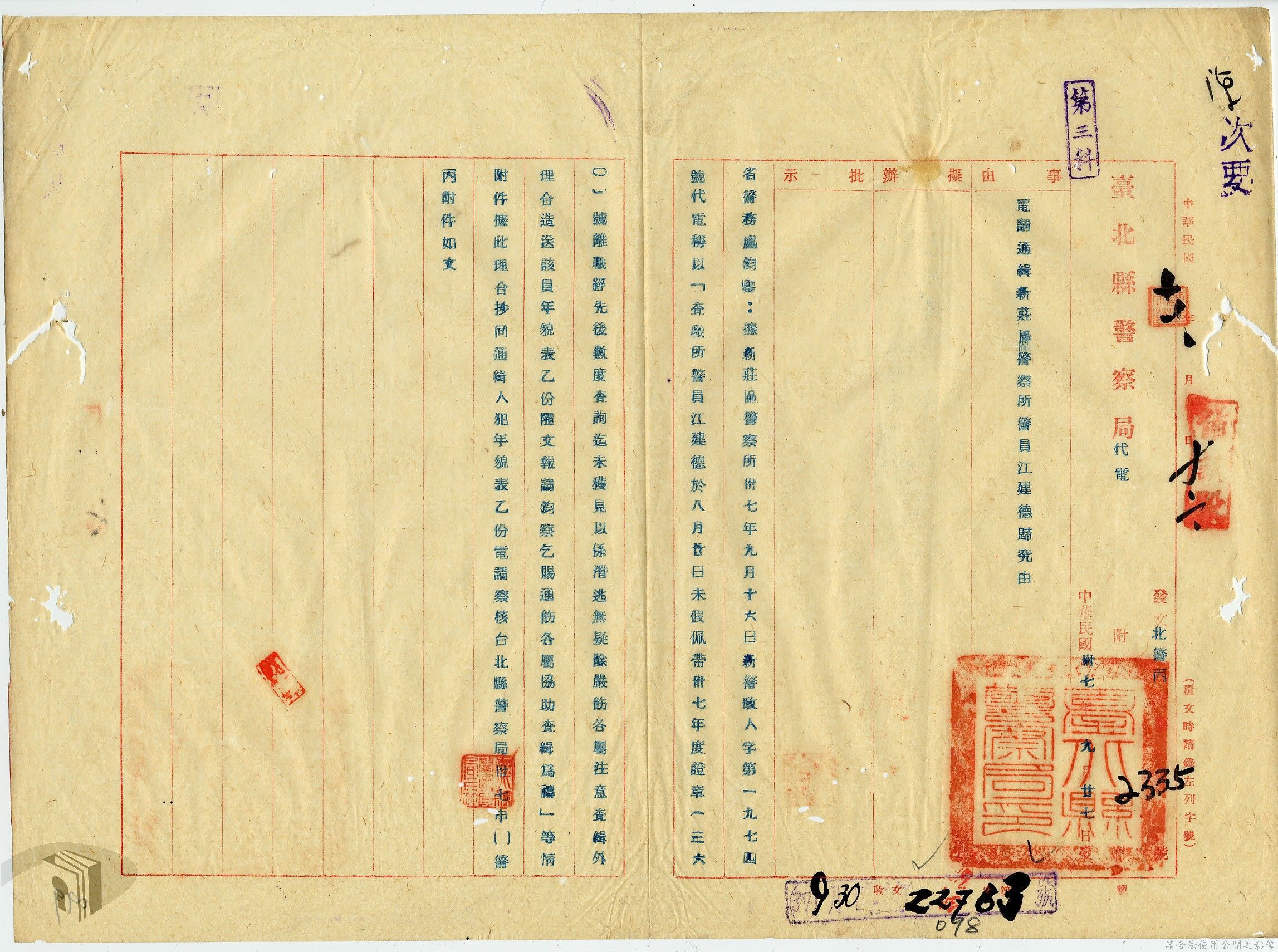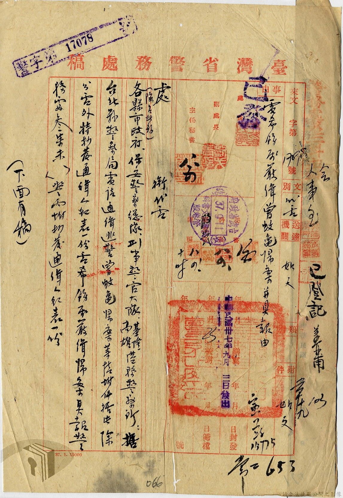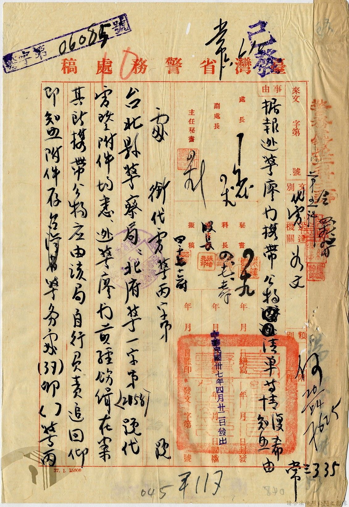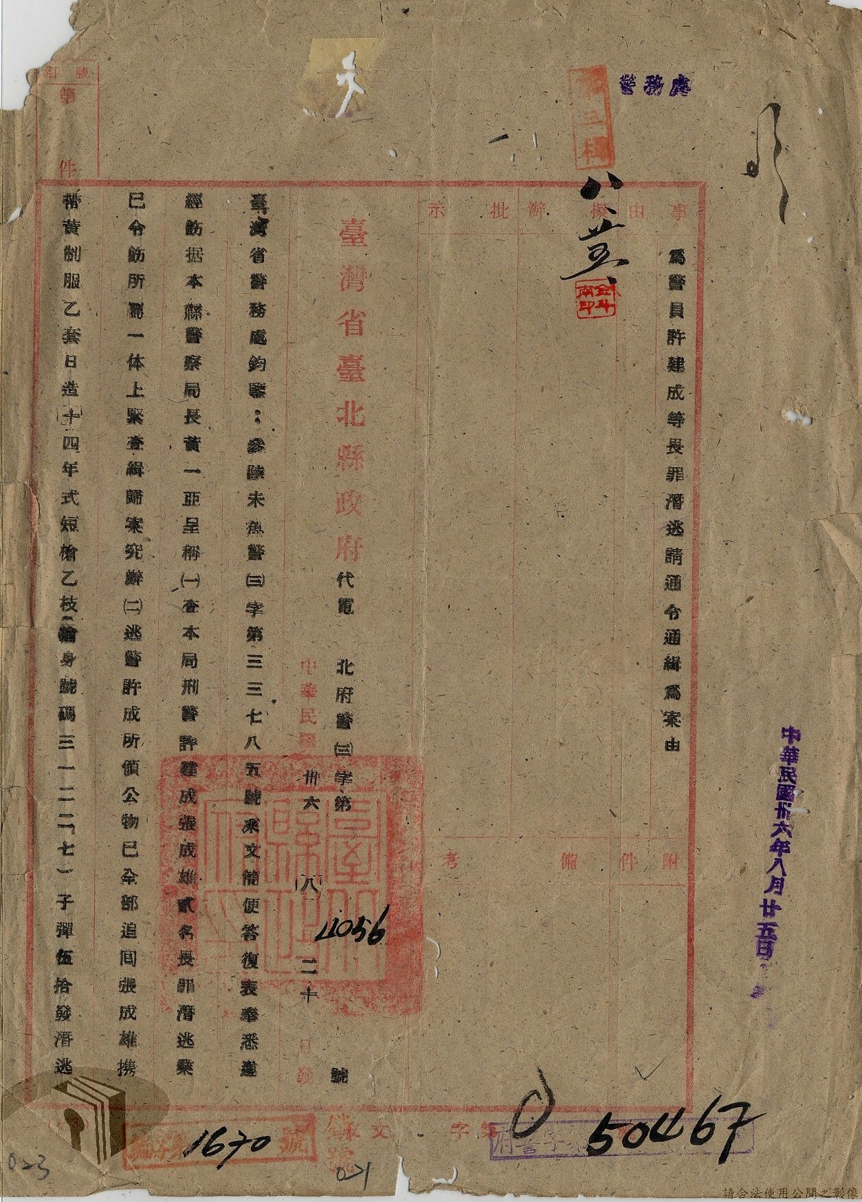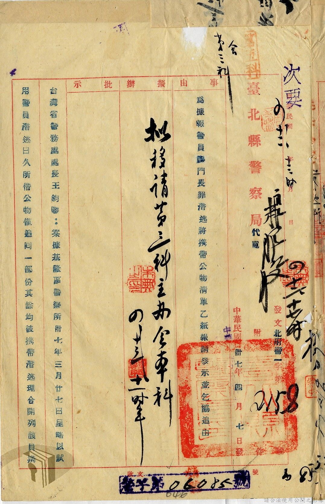 本案為36至37年間,臺北市政府因為臺北市警察局員警疑串通走私而畏罪潛逃、以及受訓期間意志薄弱趁機潛逃、未經請假便攜帶公物擅離職等案,陳請臺灣省警務處予以通緝,後臺灣省警務處發電報通知各相關單位將逃亡員警緝捕歸案;其中一員警因為二二八事件期間遭歐受傷住院,而未辦理請假的關係,遭致通緝,後警務處予以撤銷通緝,但該案仍應送法院辦理。