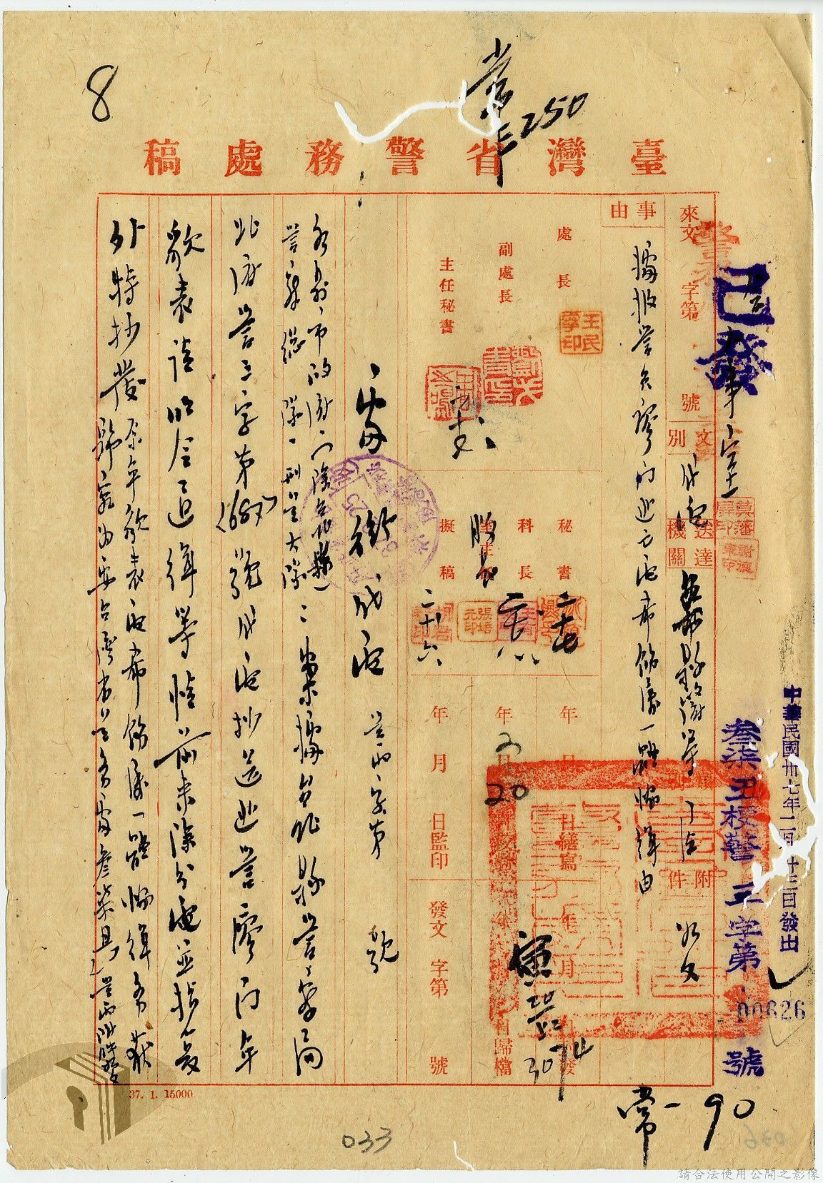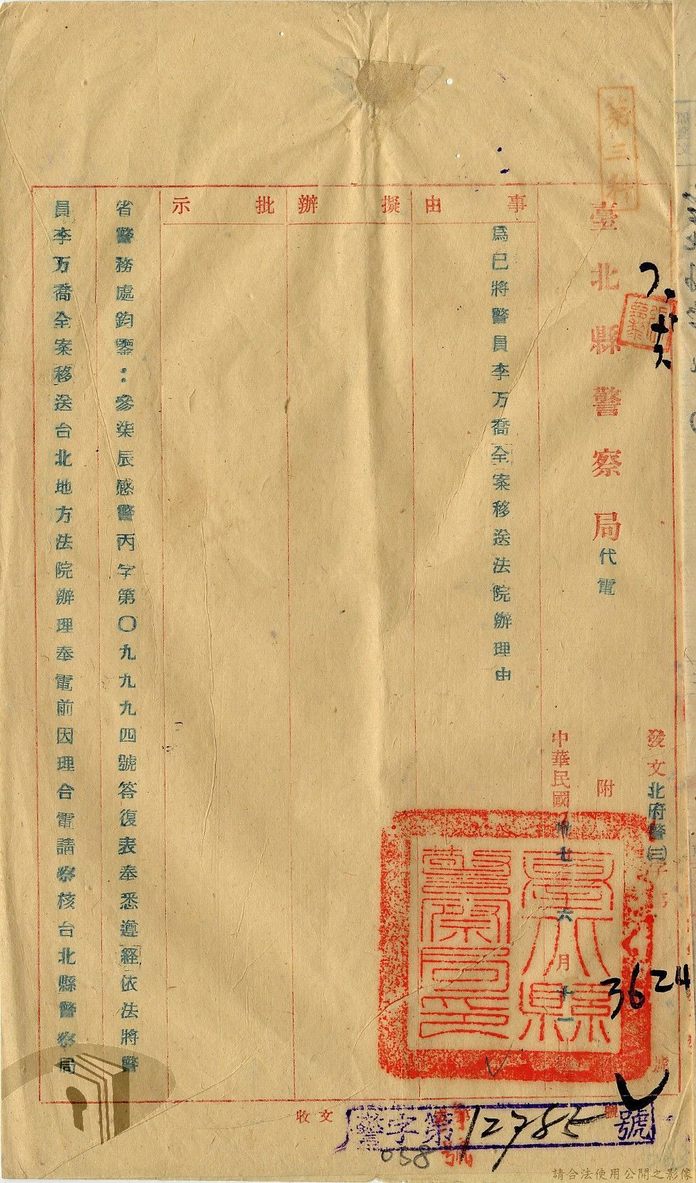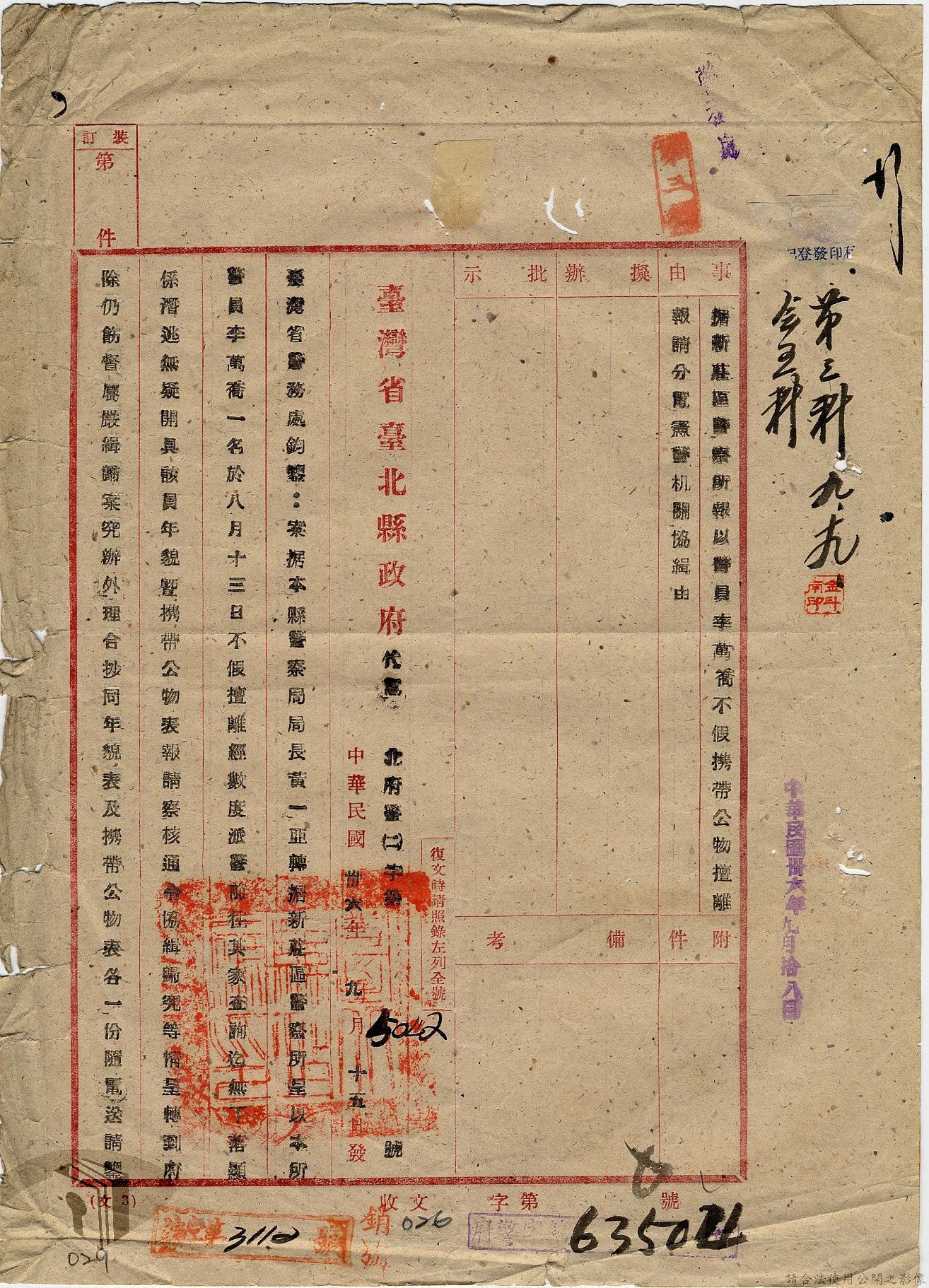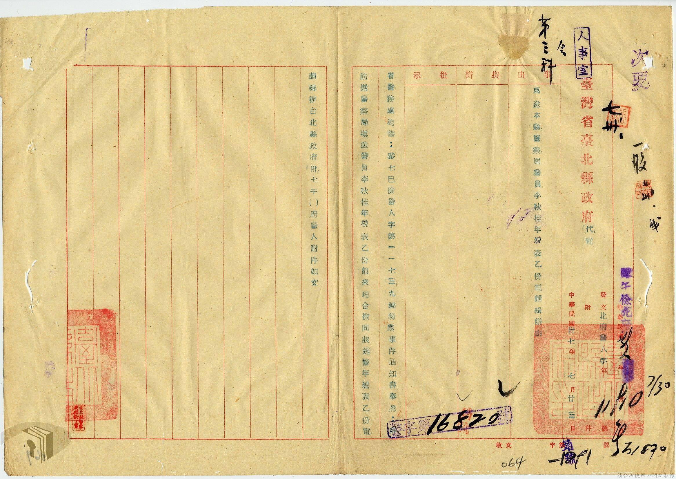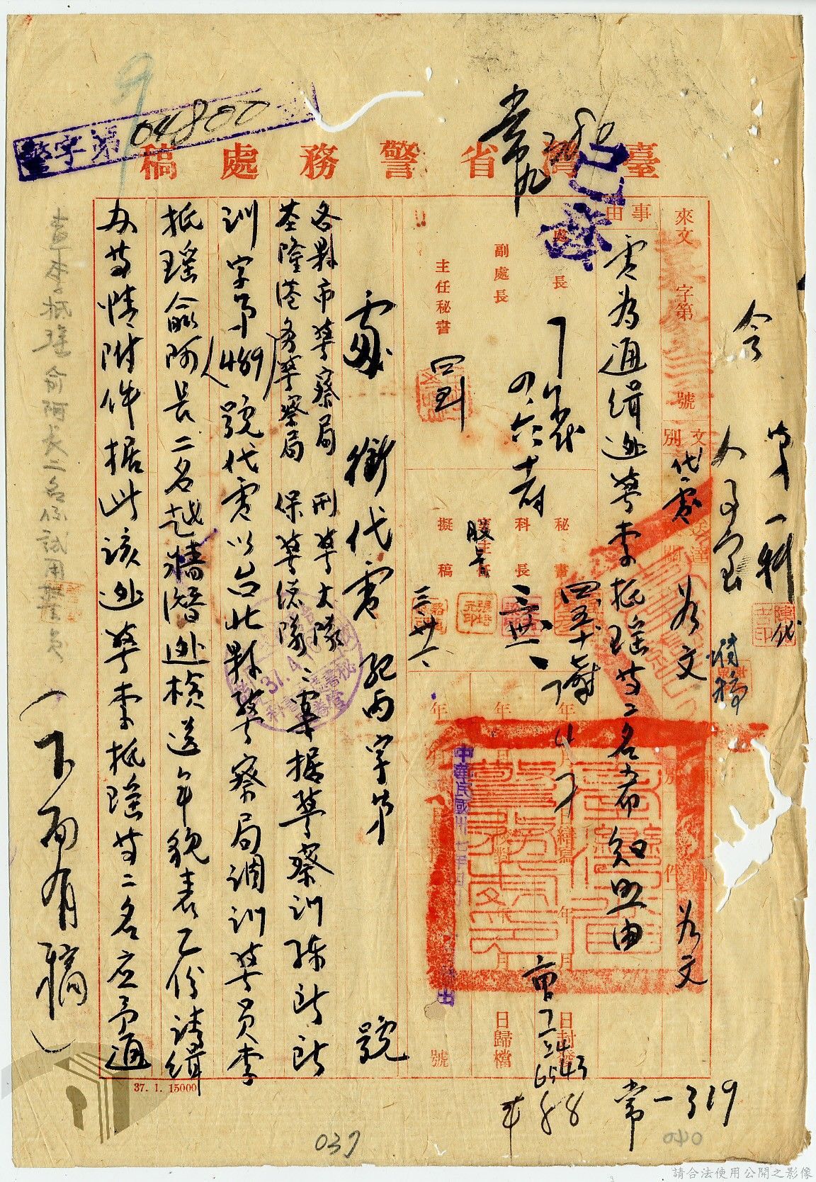 本案為36至37年間,臺北市政府因為臺北市警察局員警疑串通走私而畏罪潛逃、以及受訓期間意志薄弱趁機潛逃、未經請假便攜帶公物擅離職等案,陳請臺灣省警務處予以通緝,後臺灣省警務處發電報通知各相關單位將逃亡員警緝捕歸案;其中一員警因為二二八事件期間遭歐受傷住院,而未辦理請假的關係,遭致通緝,後警務處予以撤銷通緝,但該案仍應送法院辦理。