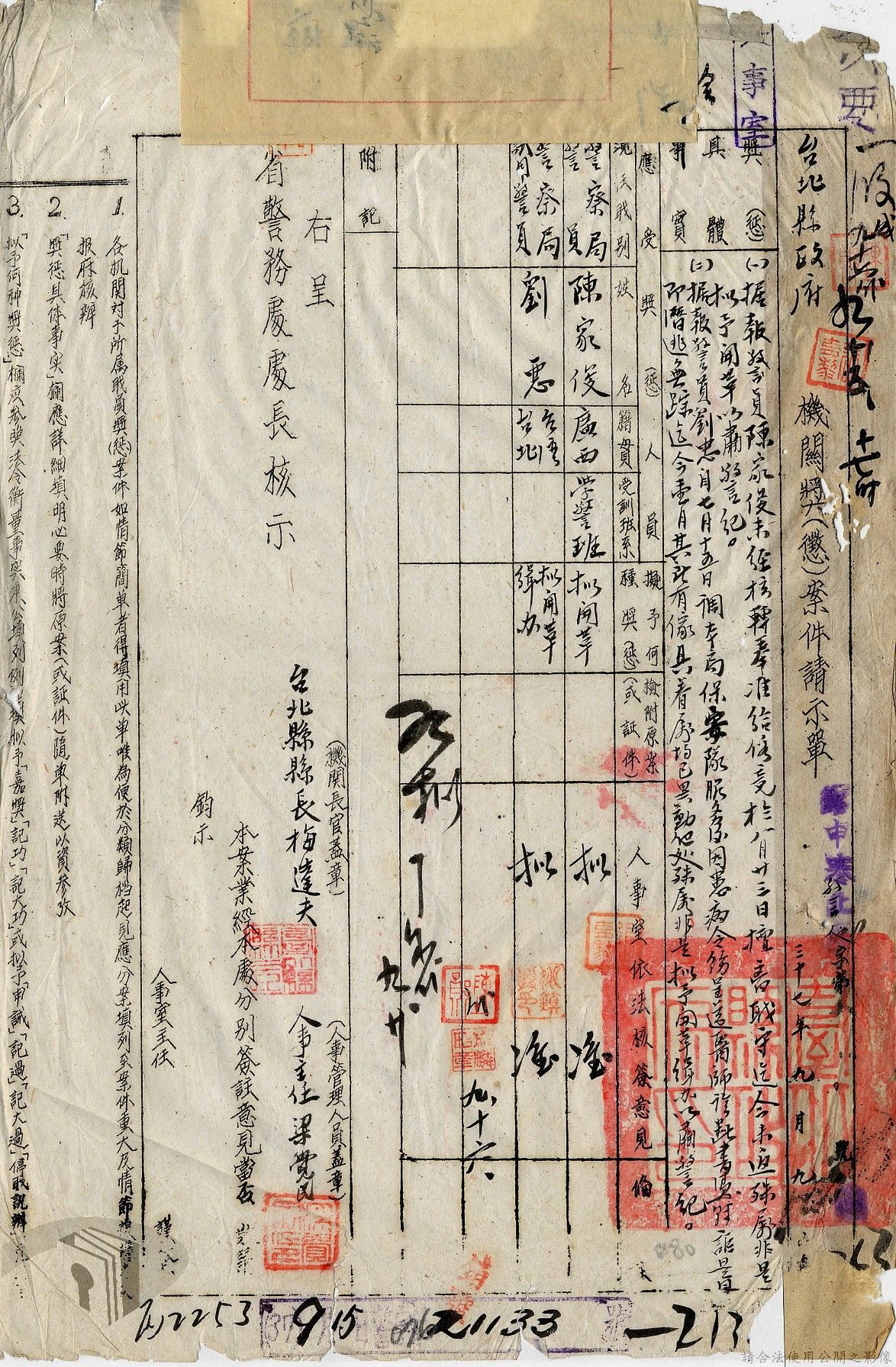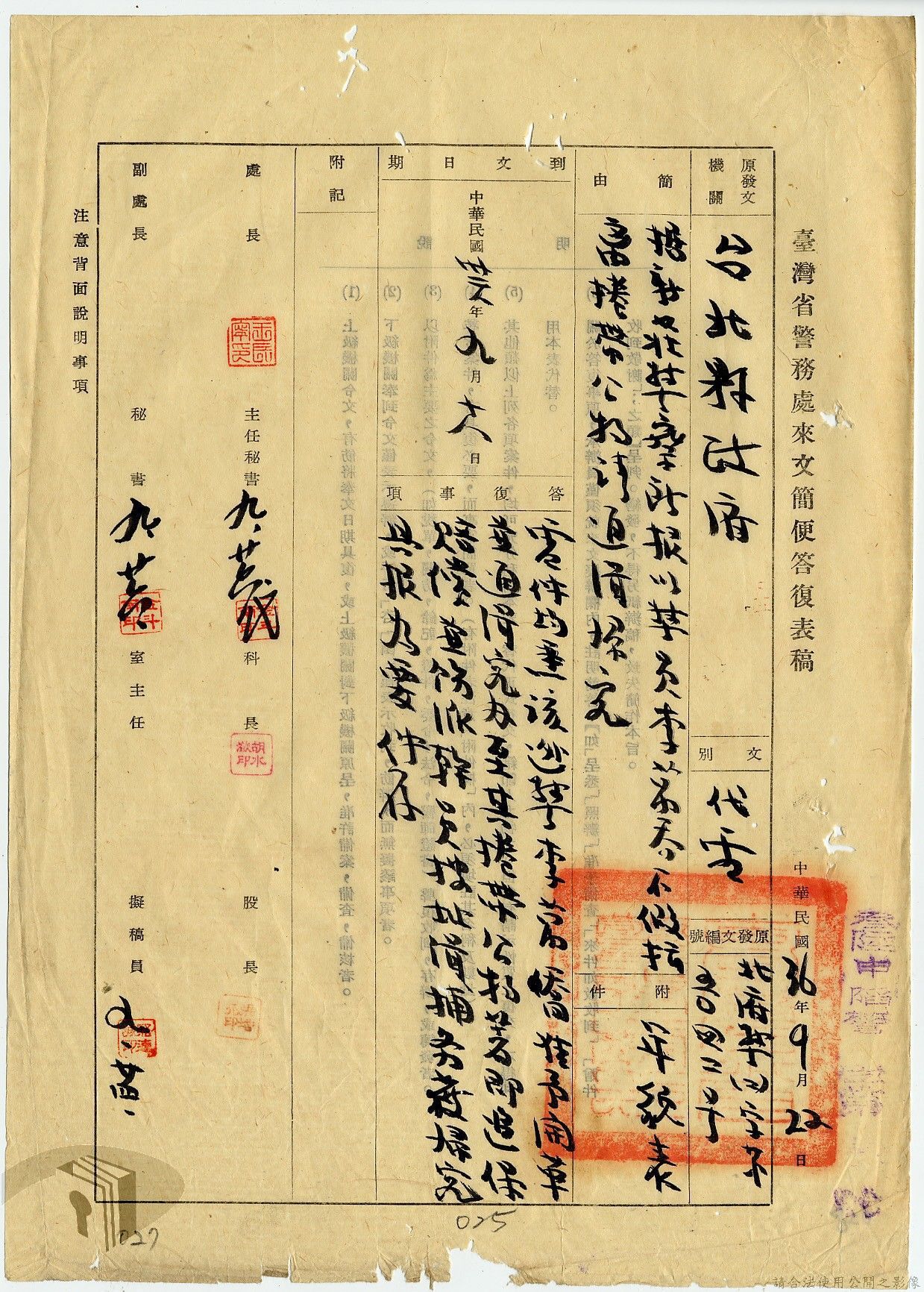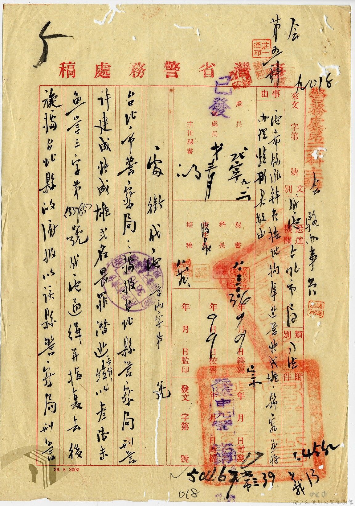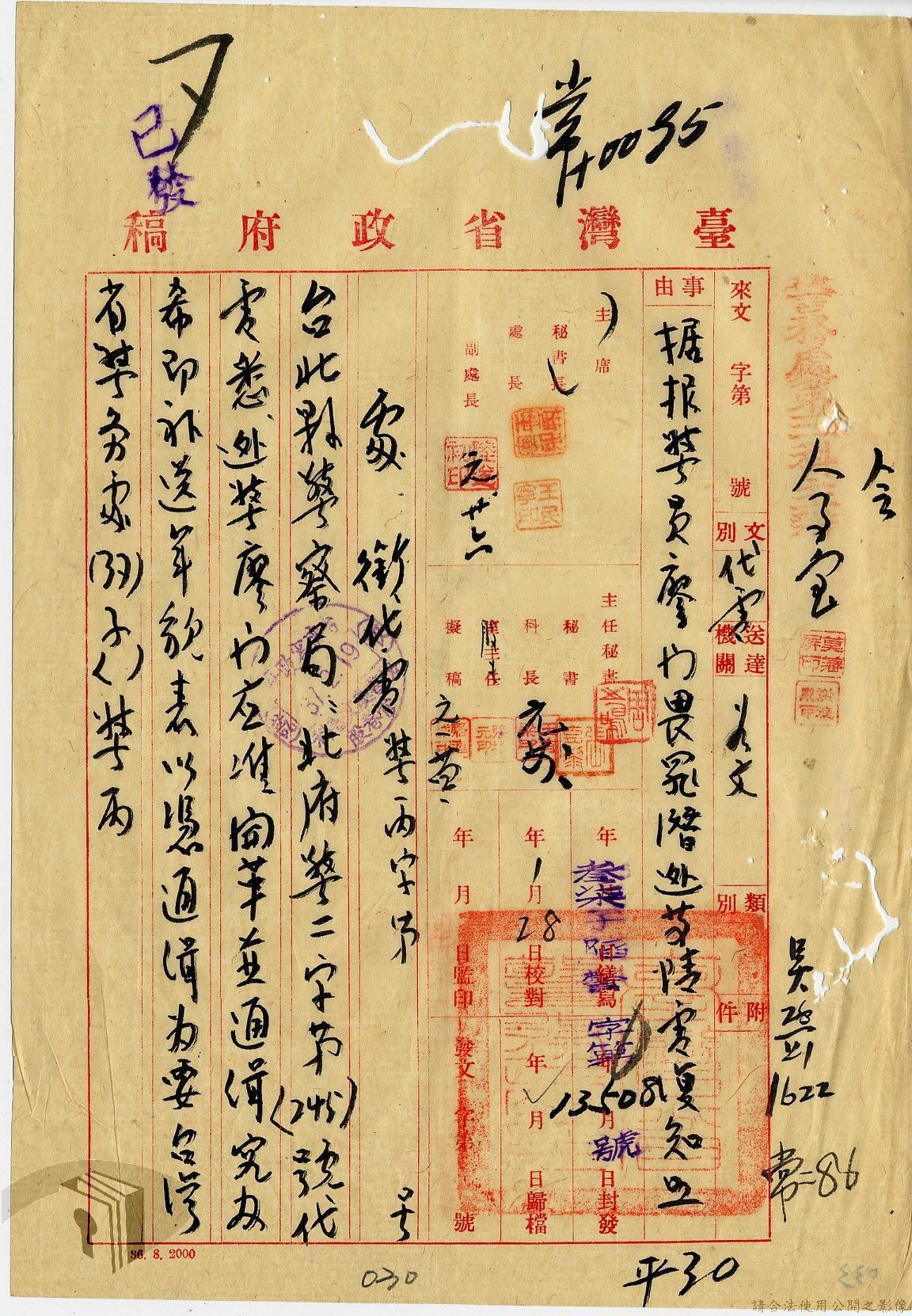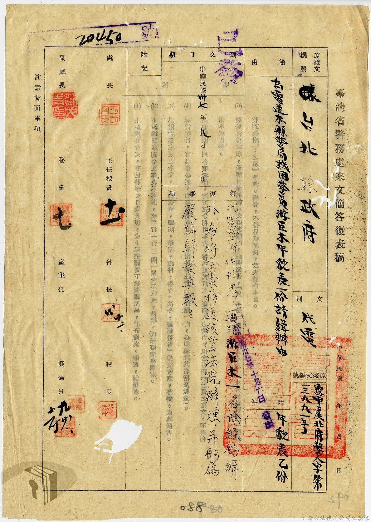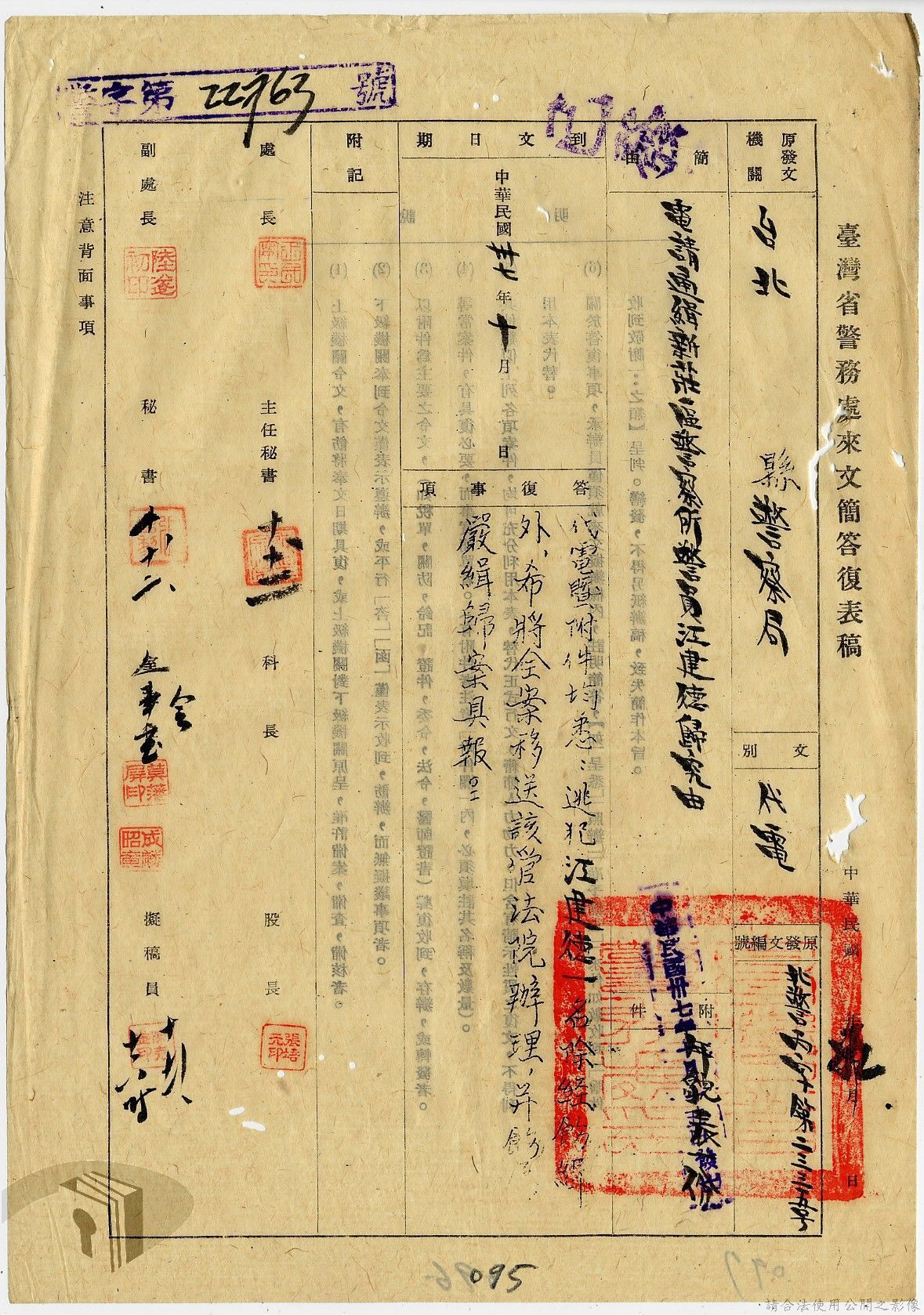 本案為36至37年間,臺北市政府因為臺北市警察局員警疑串通走私而畏罪潛逃、以及受訓期間意志薄弱趁機潛逃、未經請假便攜帶公物擅離職等案,陳請臺灣省警務處予以通緝,後臺灣省警務處發電報通知各相關單位將逃亡員警緝捕歸案;其中一員警因為二二八事件期間遭歐受傷住院,而未辦理請假的關係,遭致通緝,後警務處予以撤銷通緝,但該案仍應送法院辦理。