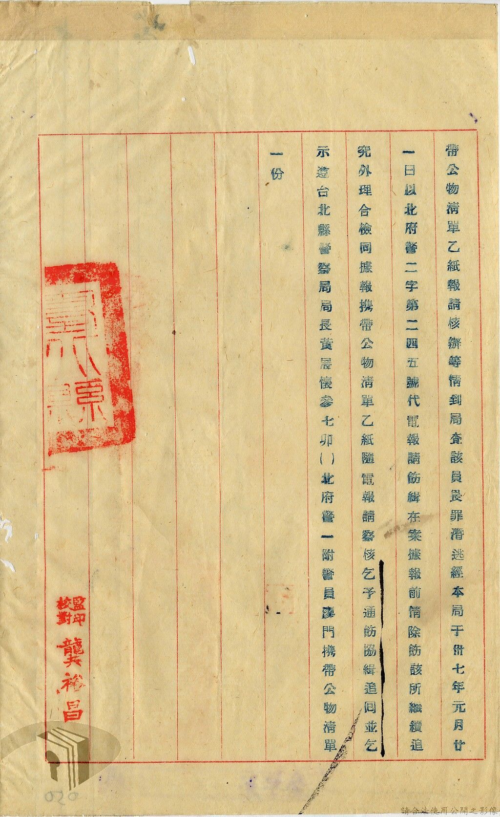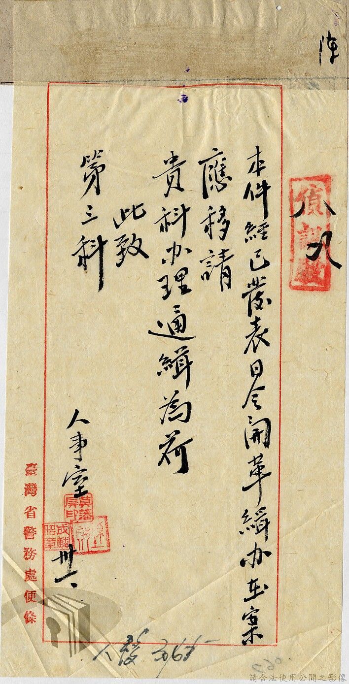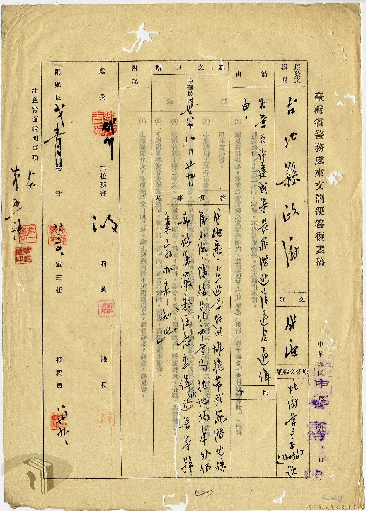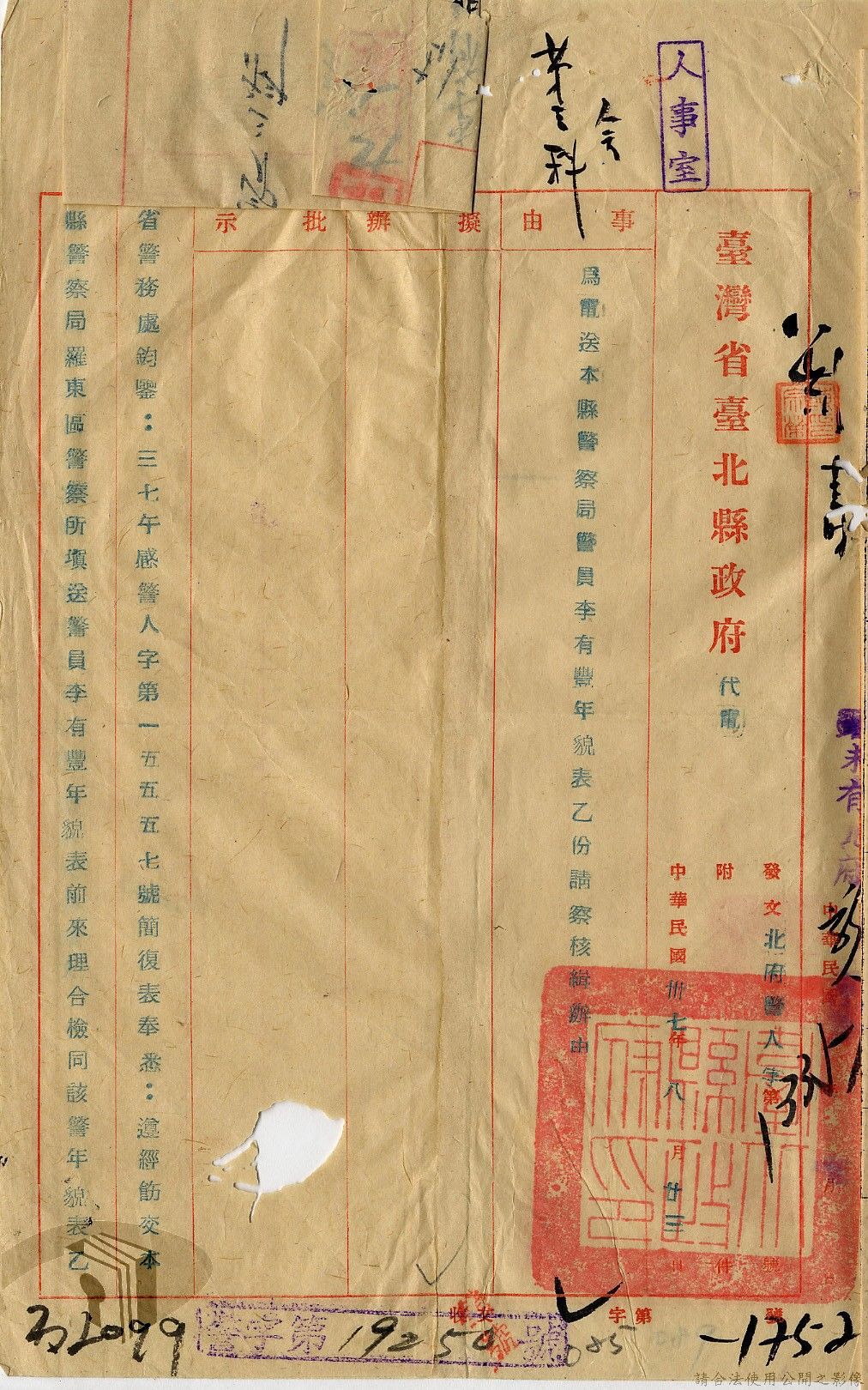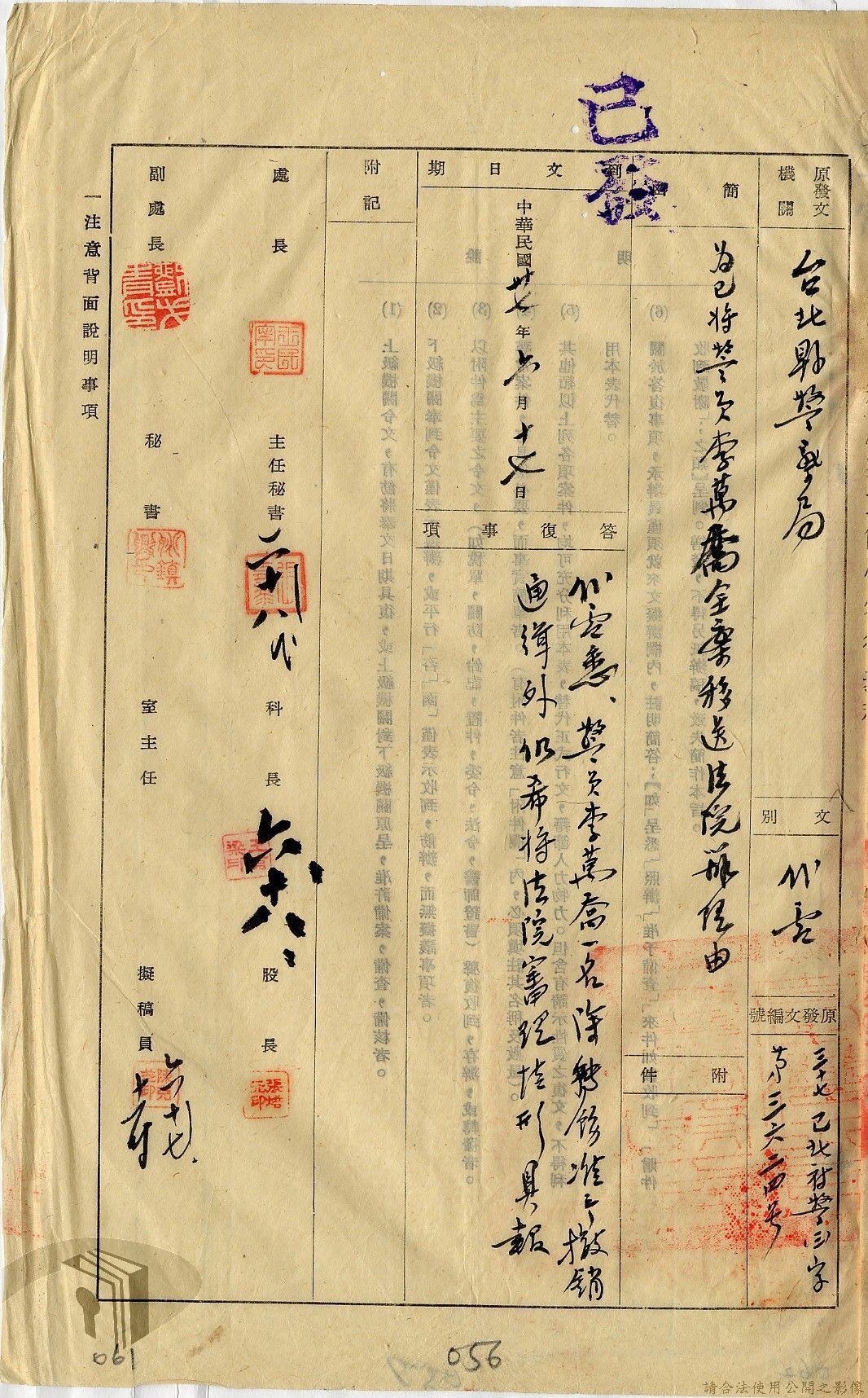 本案為36至37年間,臺北市政府因為臺北市警察局員警疑串通走私而畏罪潛逃、以及受訓期間意志薄弱趁機潛逃、未經請假便攜帶公物擅離職等案,陳請臺灣省警務處予以通緝,後臺灣省警務處發電報通知各相關單位將逃亡員警緝捕歸案;其中一員警因為二二八事件期間遭歐受傷住院,而未辦理請假的關係,遭致通緝,後警務處予以撤銷通緝,但該案仍應送法院辦理。