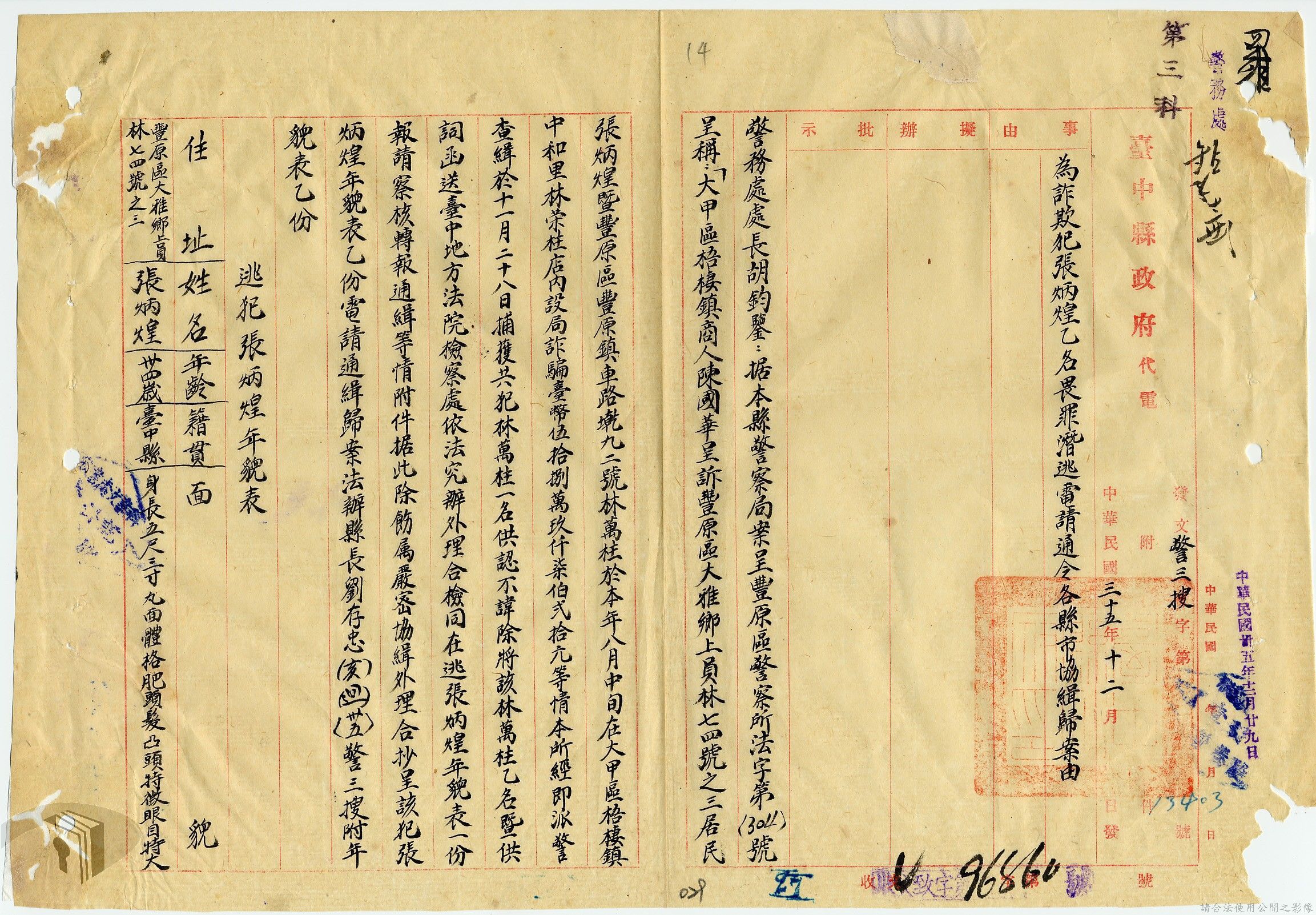 本案為35至36年間,臺中縣政府因為臺中縣警察局所屬員林區警察所、大屯區警察所之警員疏忽,導致拘留人犯逃逸,陳請臺灣省行政長官公署警務處予以通緝,後行政長官公署警務處發電報請各縣市政府、警察大隊、鐵路警察署將脫逃人犯緝捕歸案。