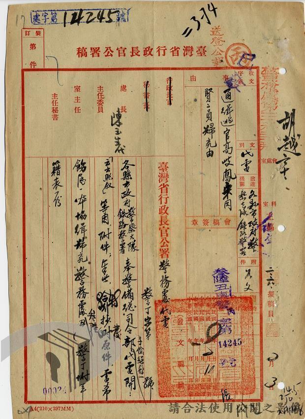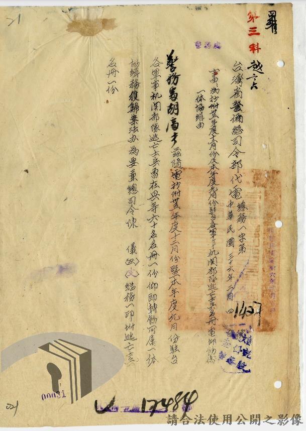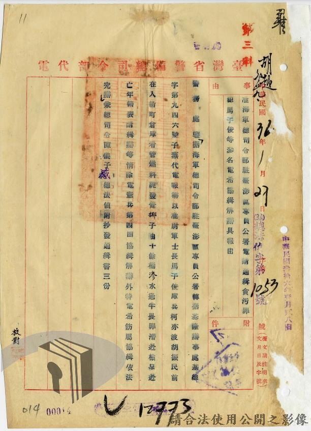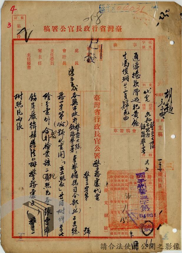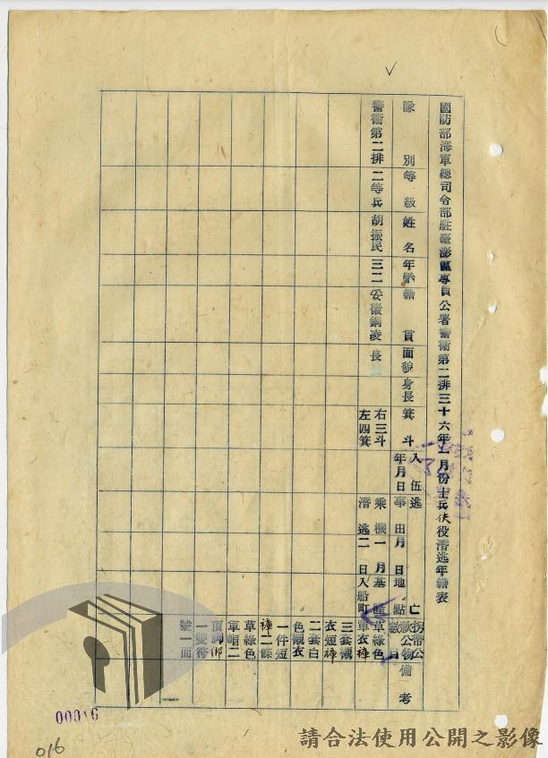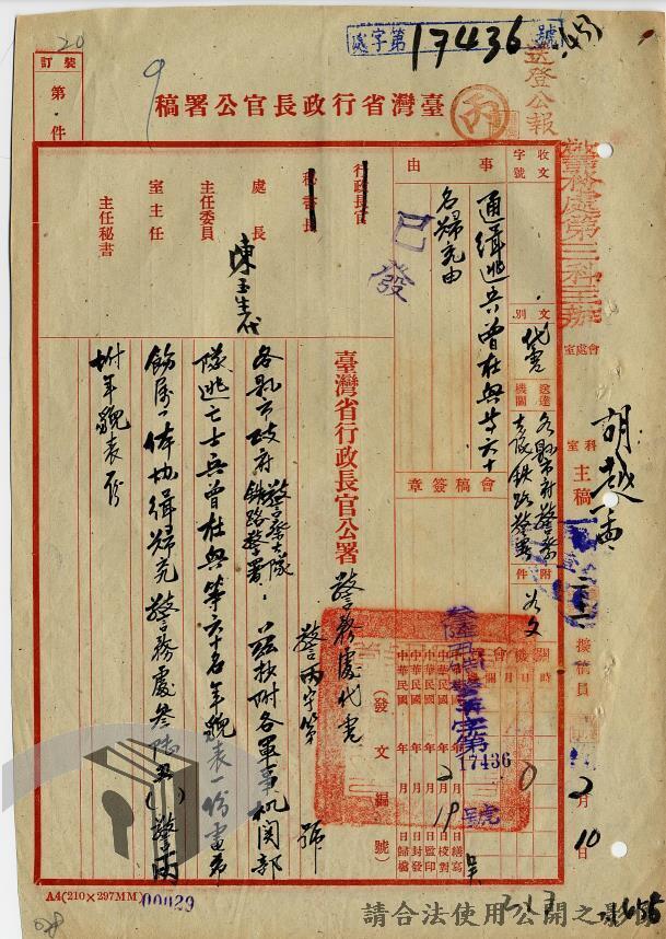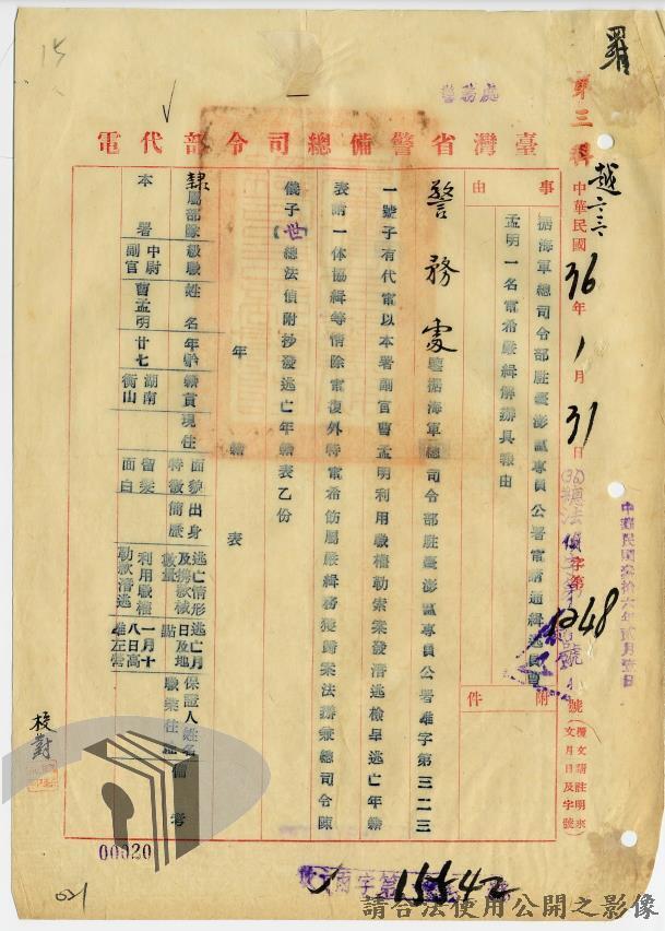 本案為36年間,臺灣警備總司令部轉發聯合勤務總司令部臺灣供應局、高雄要塞司令部、第六十二師、海軍總司令部駐臺澎軍區專員公署等各軍事機關陳請通緝逃兵逃員之經過情形,逃亡情形包括:軍官捲款潛逃、盜賣汽油於押解時逃亡,以及其他逃官、逃兵等相關案件;臺灣警備總司令部電請臺灣省行長官公署警務處發令通緝;臺灣省行長官公署警務處據以發文各相關單位協助其將該員等歸案究辦,並緝獲逃兵十員,將其解送臺灣警備總司令部偵辦。附年籍表。