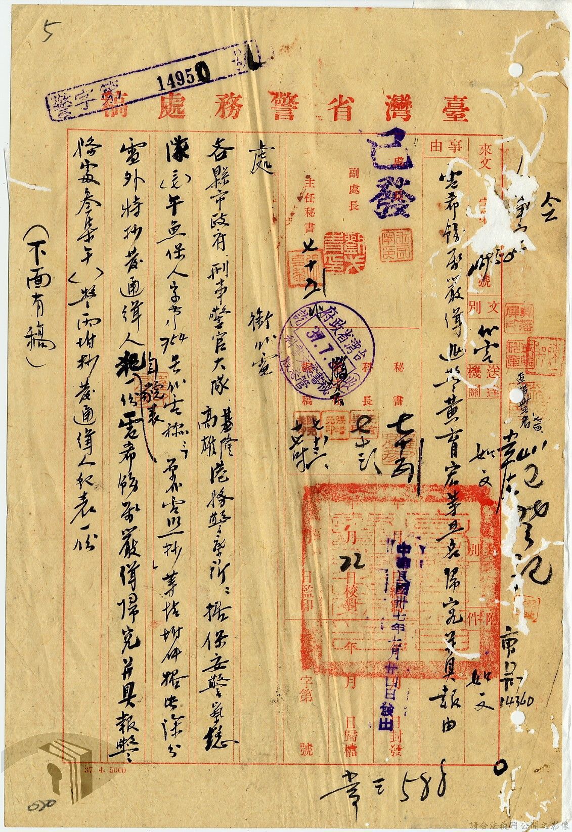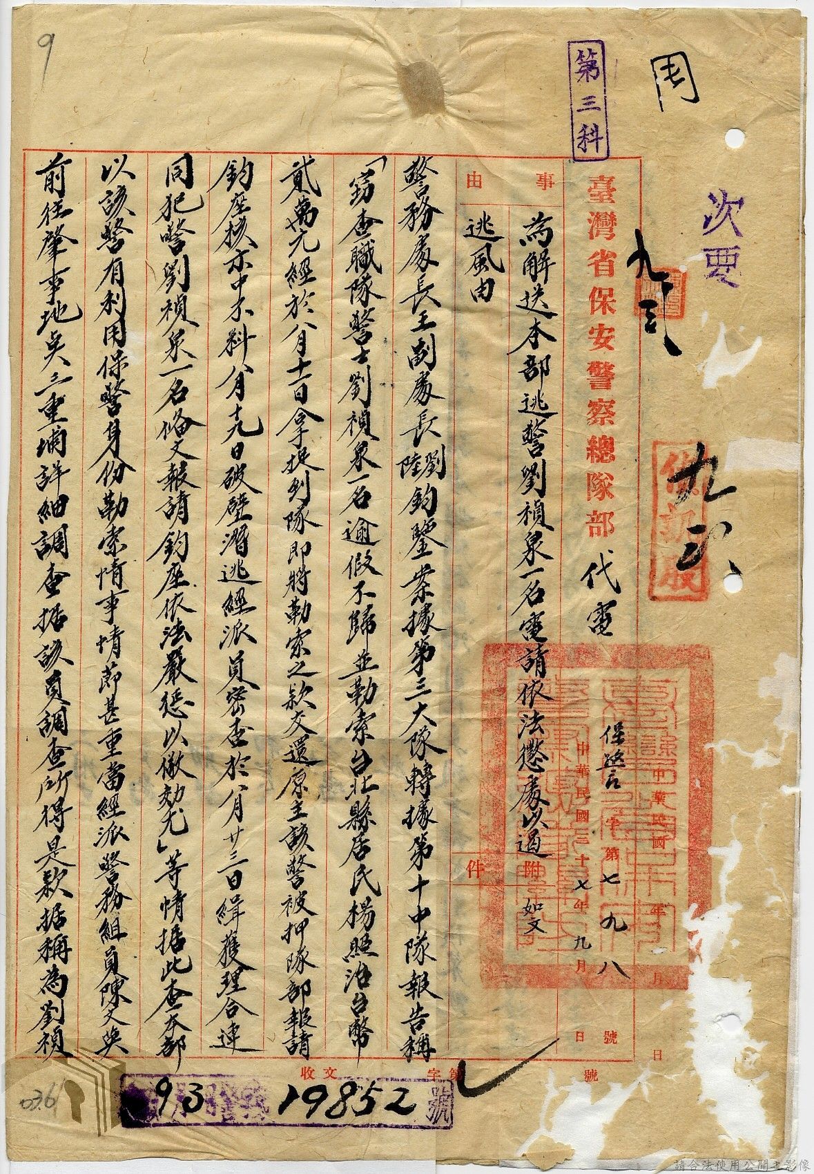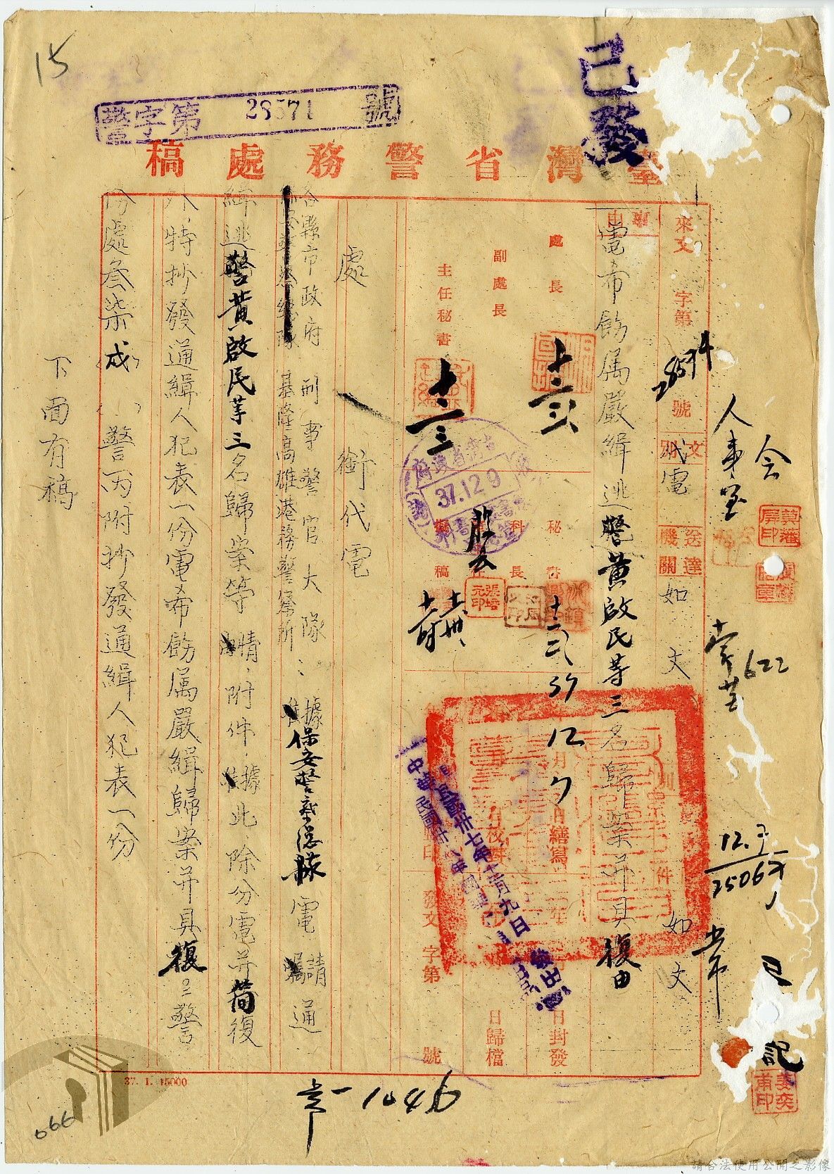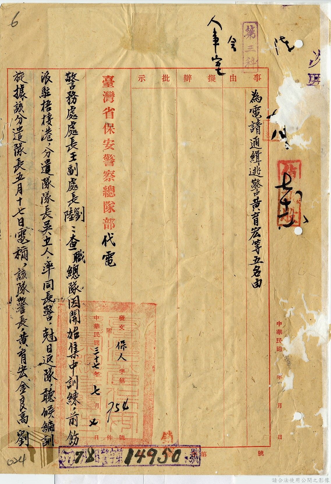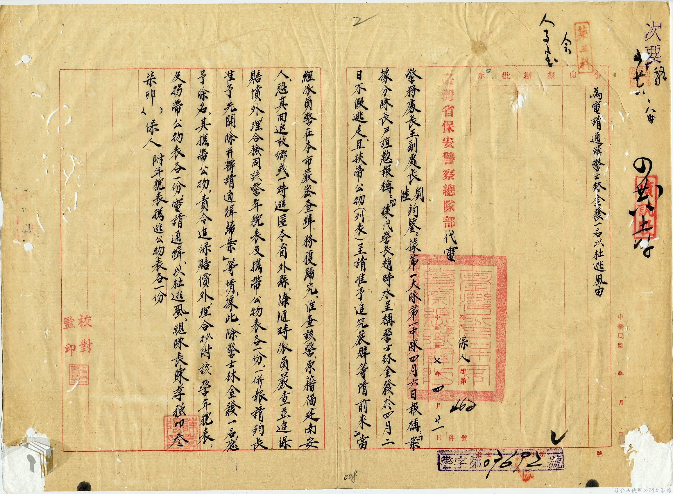 本案為37年間,臺灣省保安警察總隊部等單位發電報請臺灣省警務處通緝涉案員警,警務處發電報請各縣市政府、基隆港務警察所、高雄港務警察所等單位協助辦理;臺灣省職業訓導總隊將涉案員警及相關資料移送至警務處,該處後將當事人發交保安警察總隊部處理。