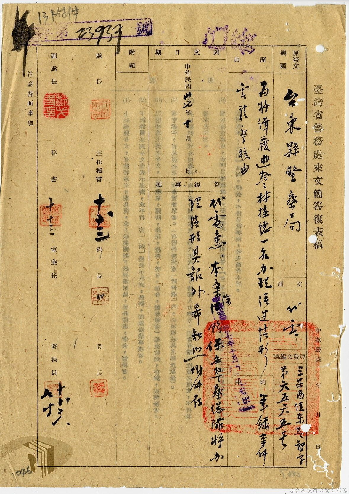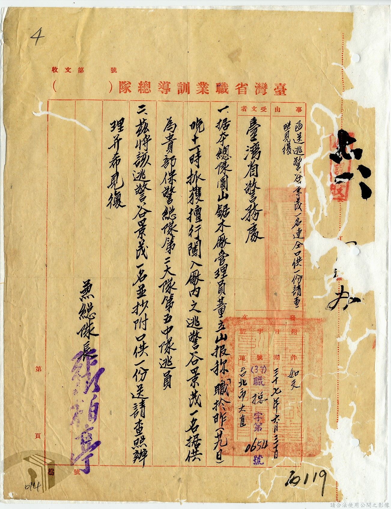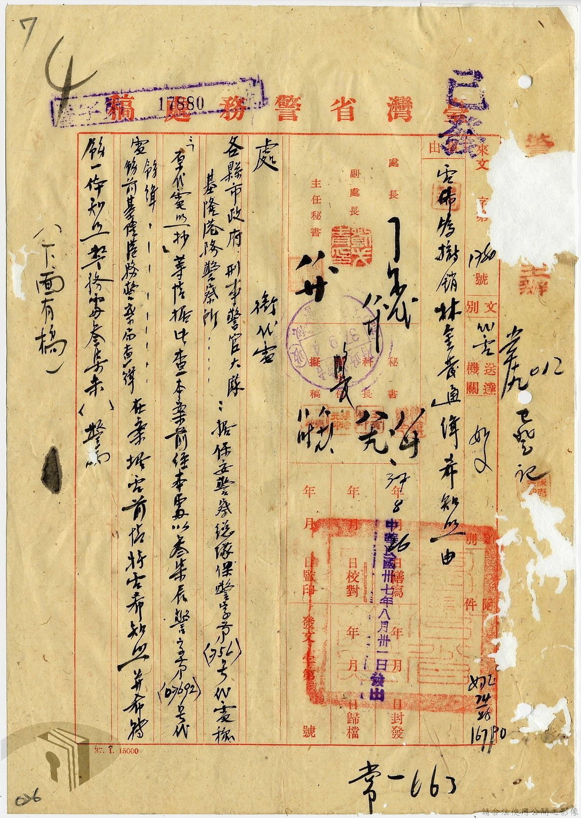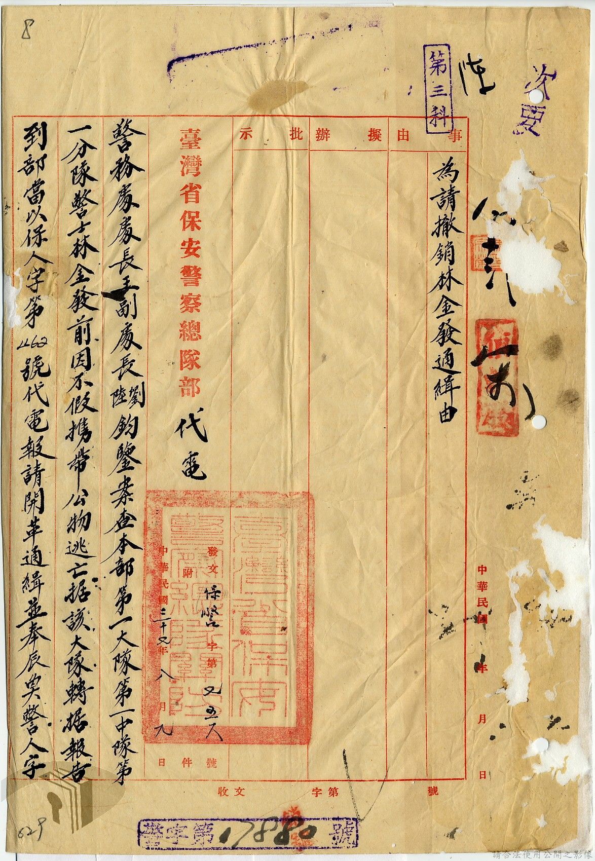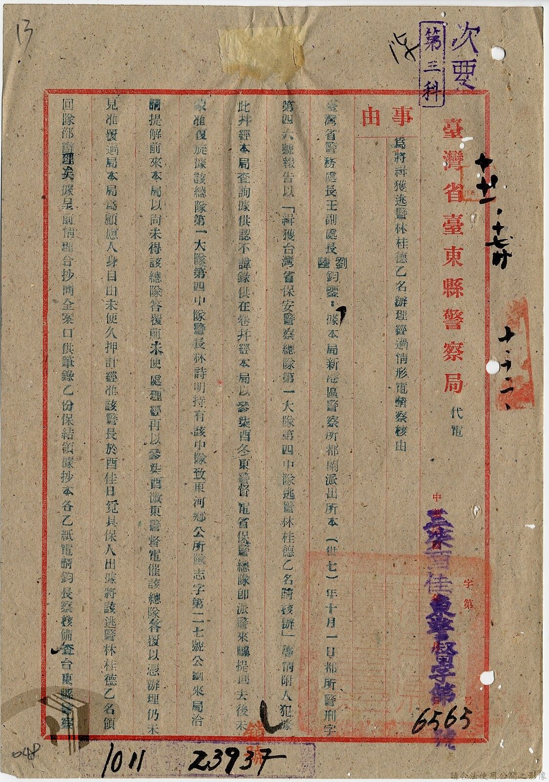 本案為37年間,臺灣省保安警察總隊部等單位發電報請臺灣省警務處通緝涉案員警,警務處發電報請各縣市政府、基隆港務警察所、高雄港務警察所等單位協助辦理;臺灣省職業訓導總隊將涉案員警及相關資料移送至警務處,該處後將當事人發交保安警察總隊部處理。