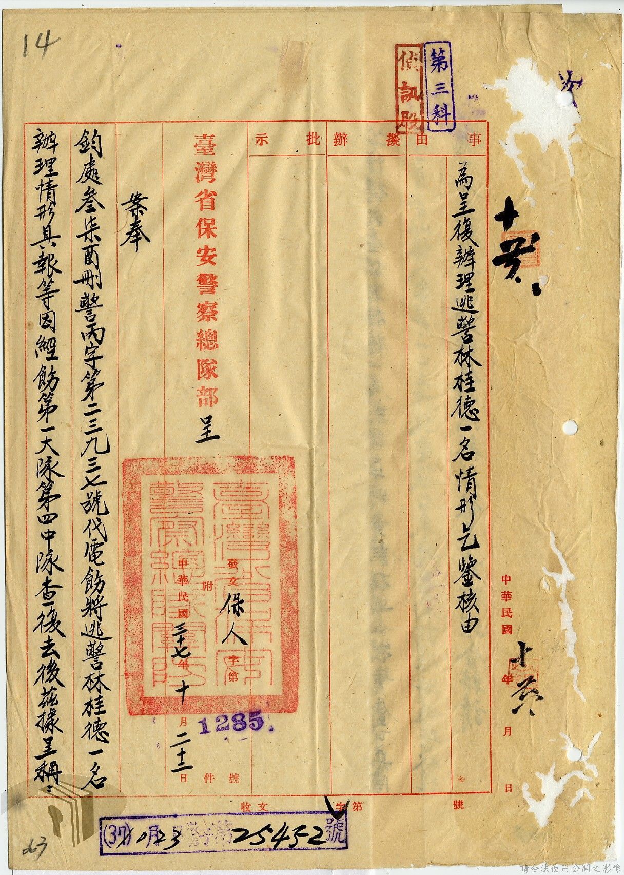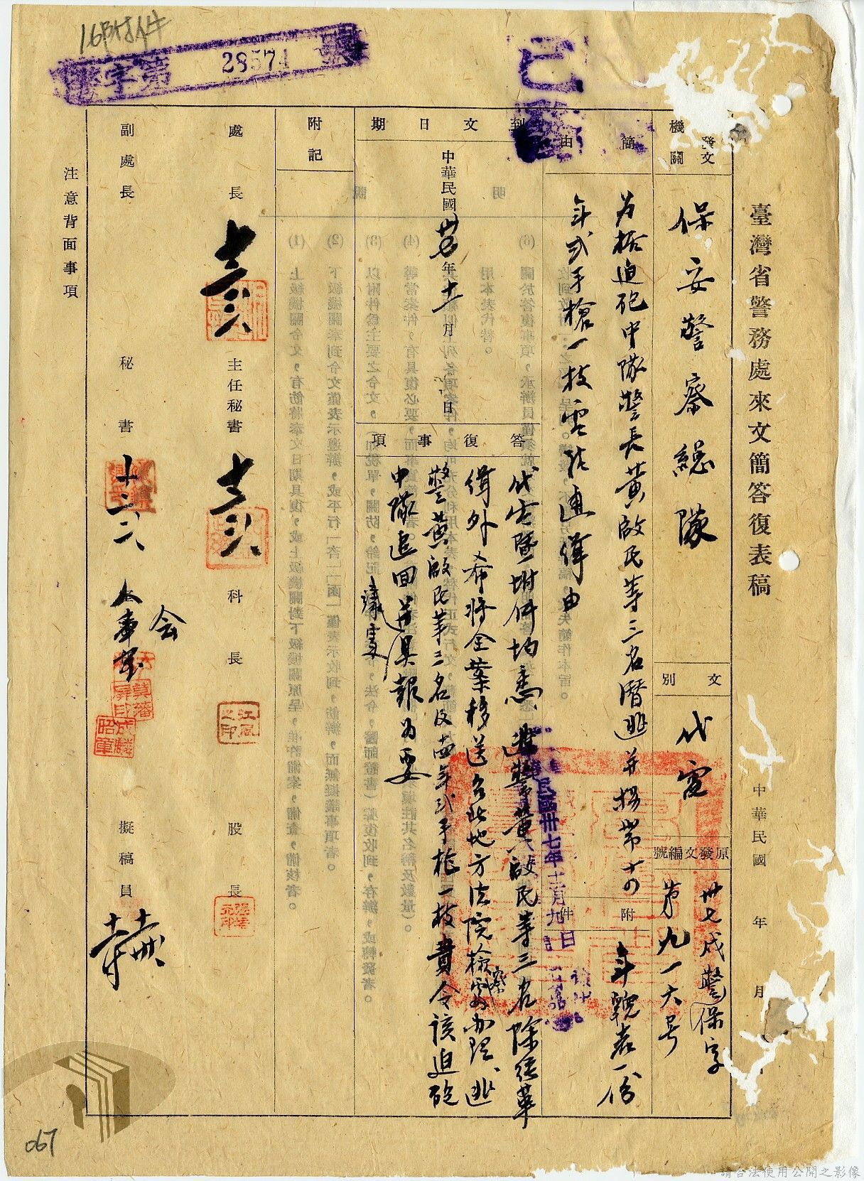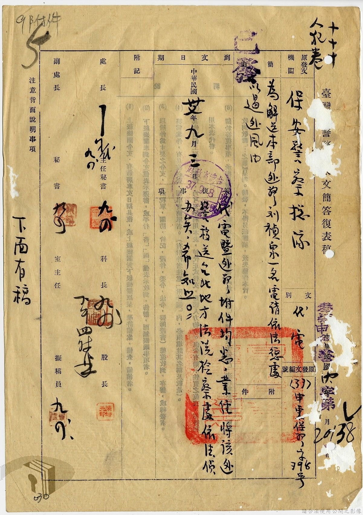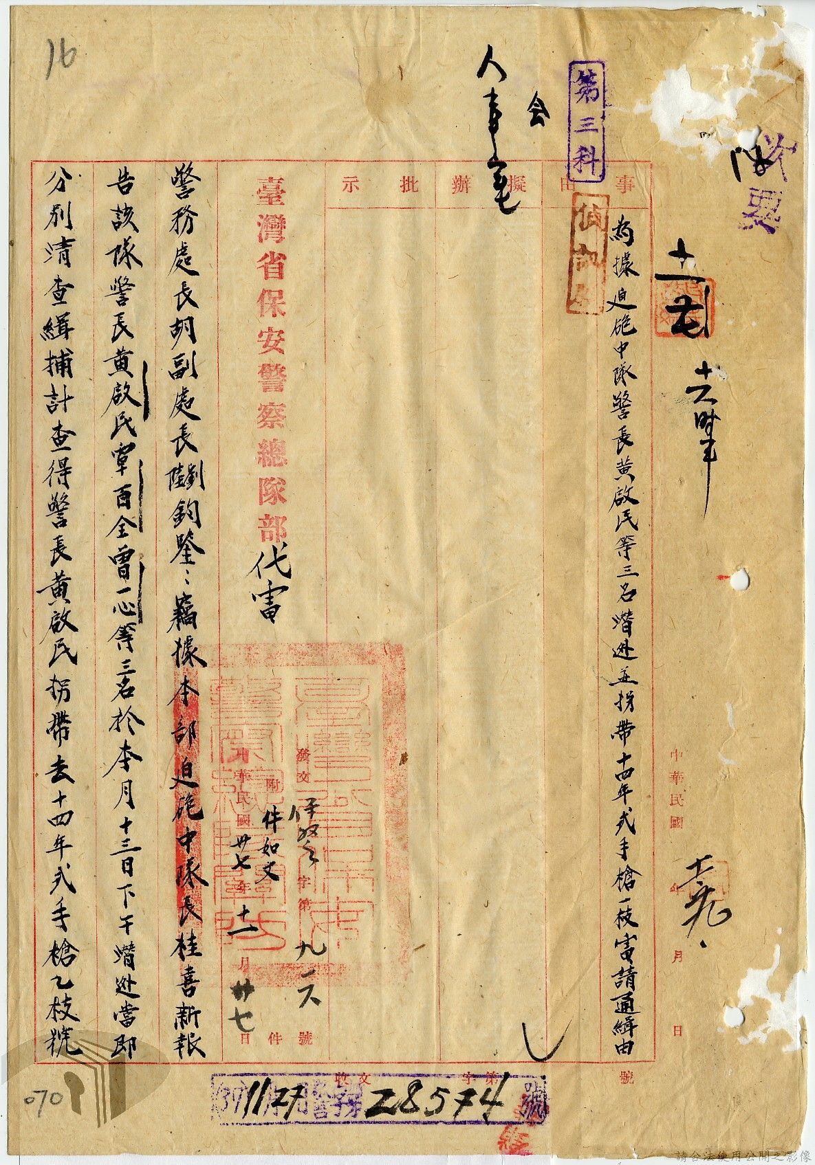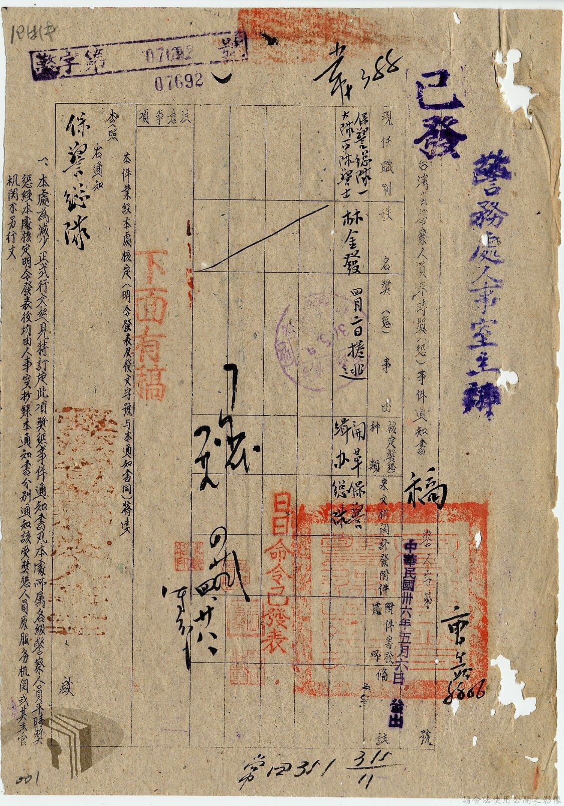 本案為37年間,臺灣省保安警察總隊部等單位發電報請臺灣省警務處通緝涉案員警,警務處發電報請各縣市政府、基隆港務警察所、高雄港務警察所等單位協助辦理;臺灣省職業訓導總隊將涉案員警及相關資料移送至警務處,該處後將當事人發交保安警察總隊部處理。