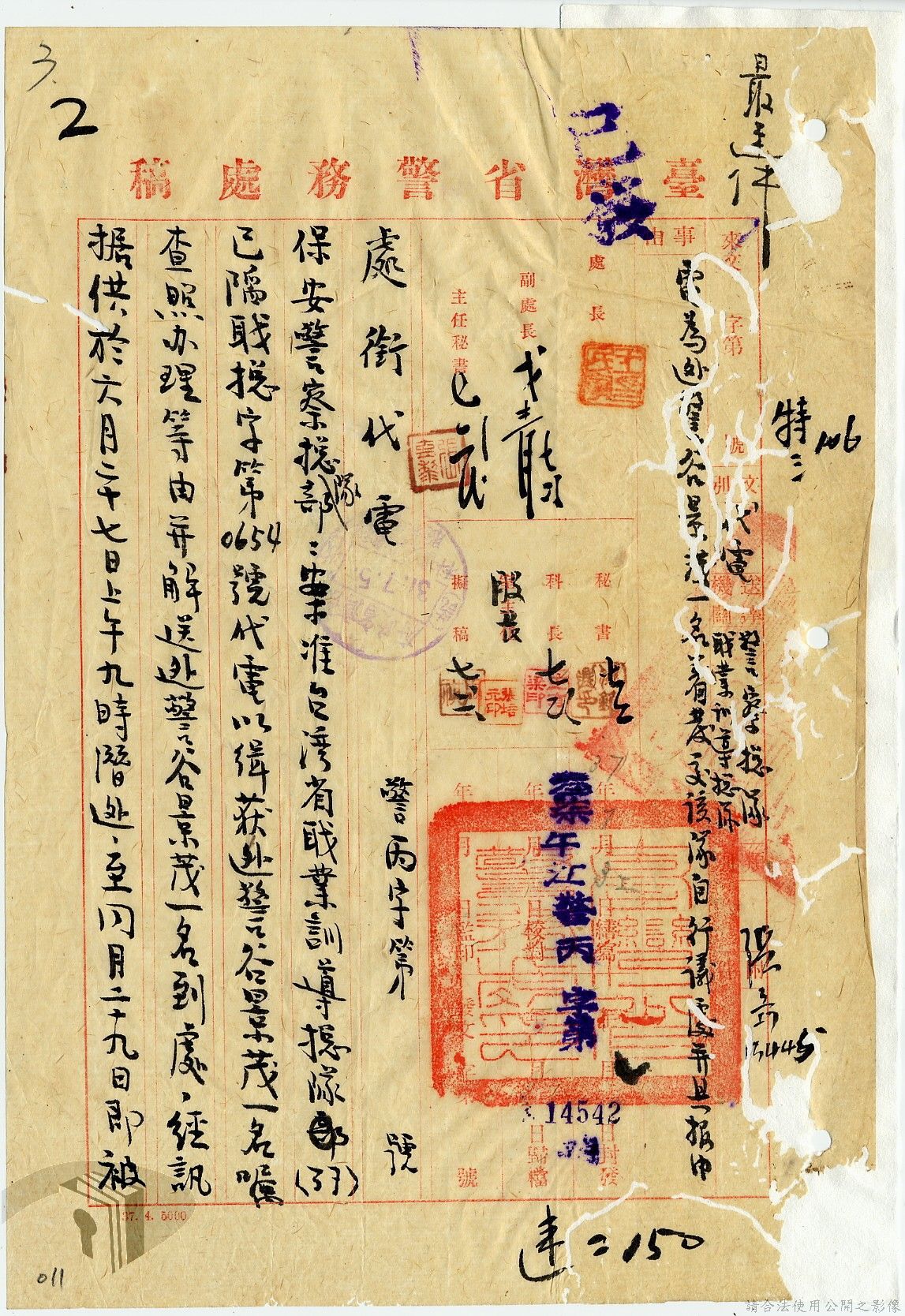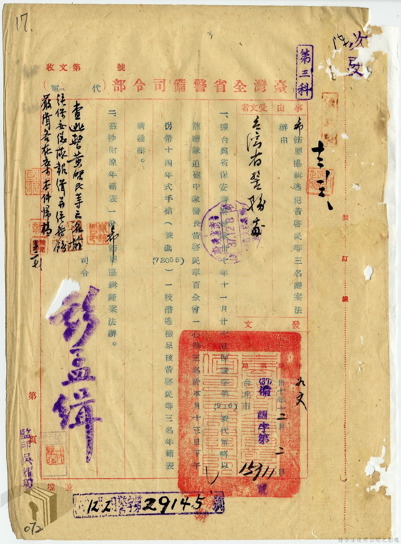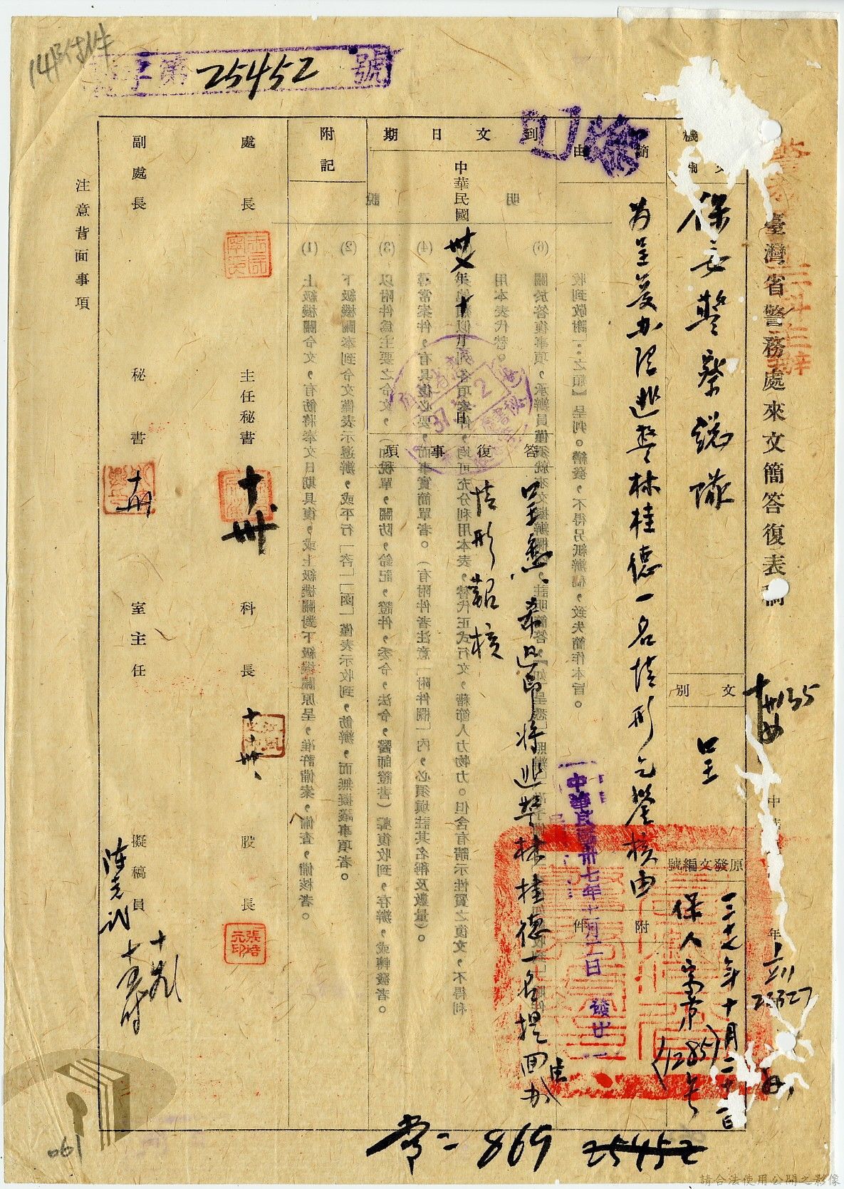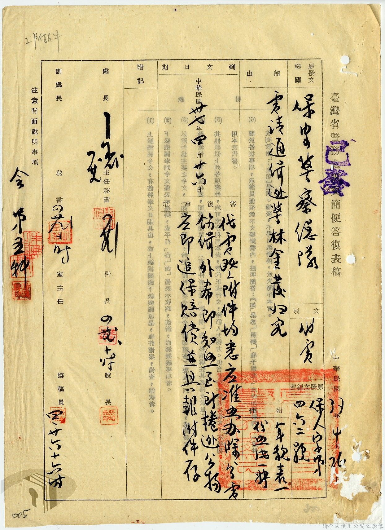 本案為37年間,臺灣省保安警察總隊部等單位發電報請臺灣省警務處通緝涉案員警,警務處發電報請各縣市政府、基隆港務警察所、高雄港務警察所等單位協助辦理;臺灣省職業訓導總隊將涉案員警及相關資料移送至警務處,該處後將當事人發交保安警察總隊部處理。