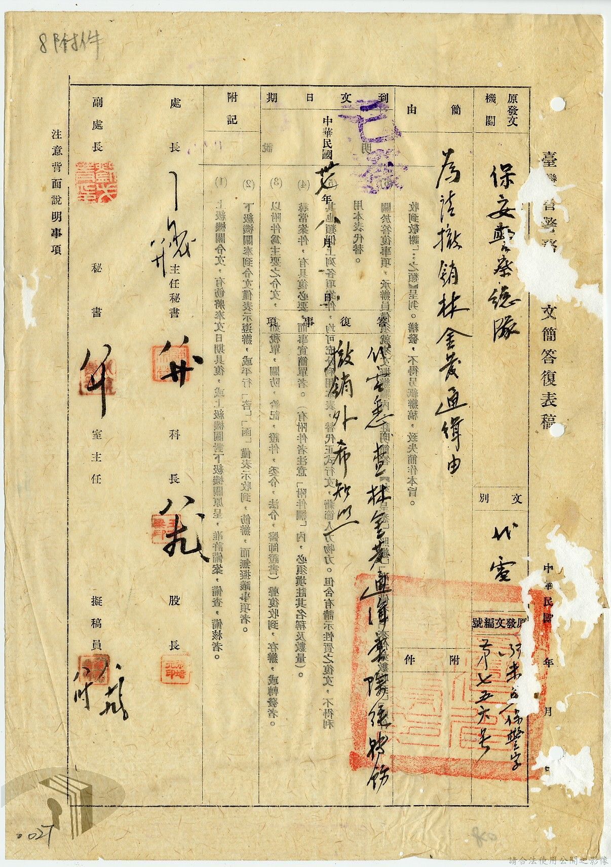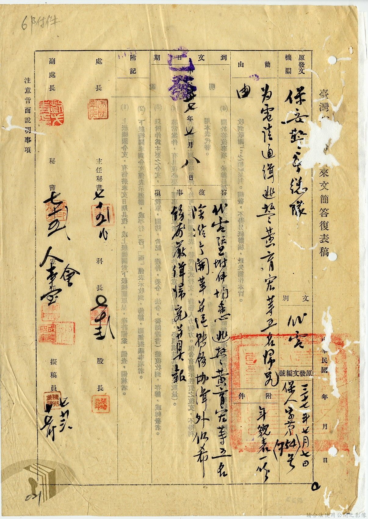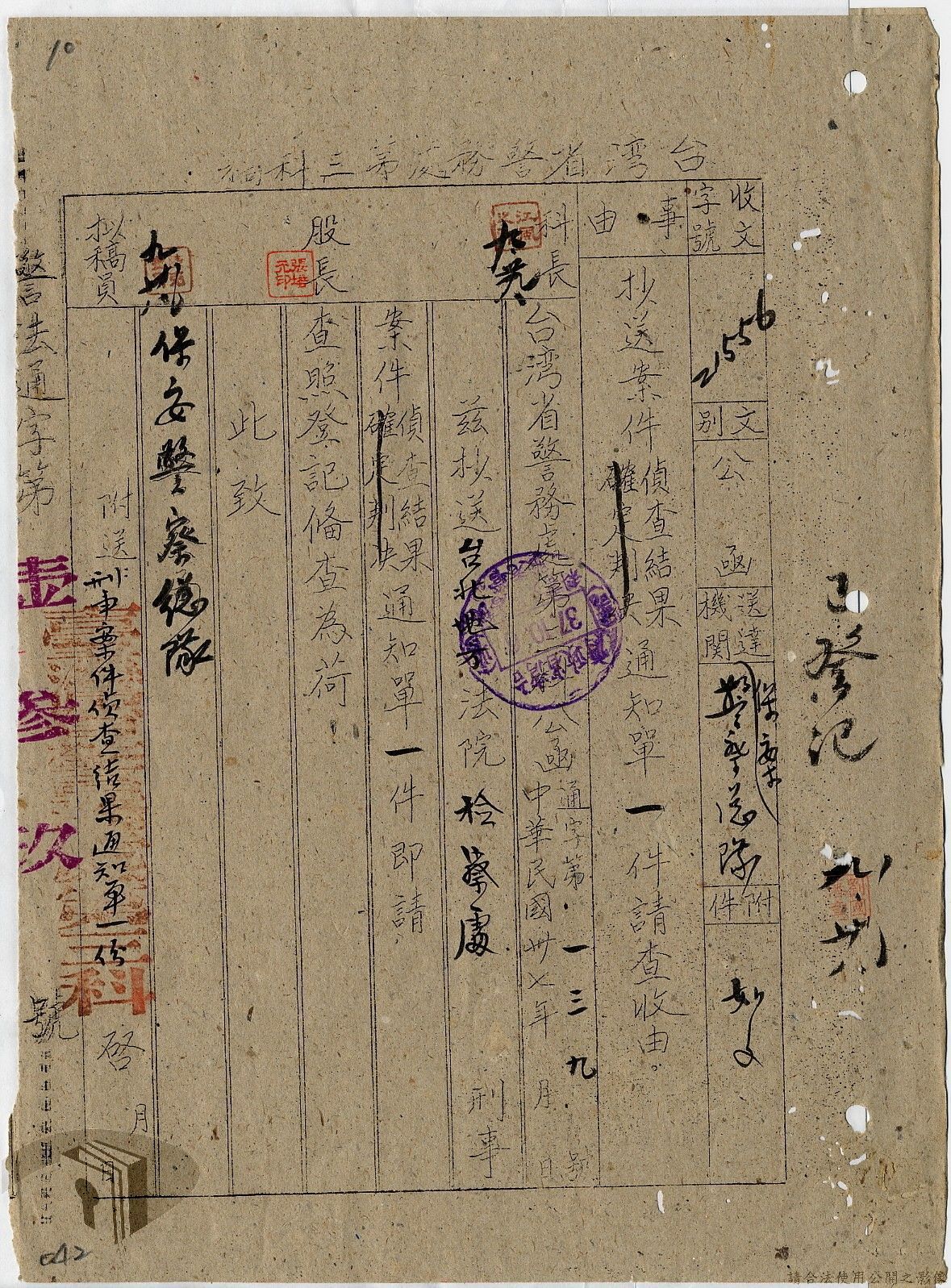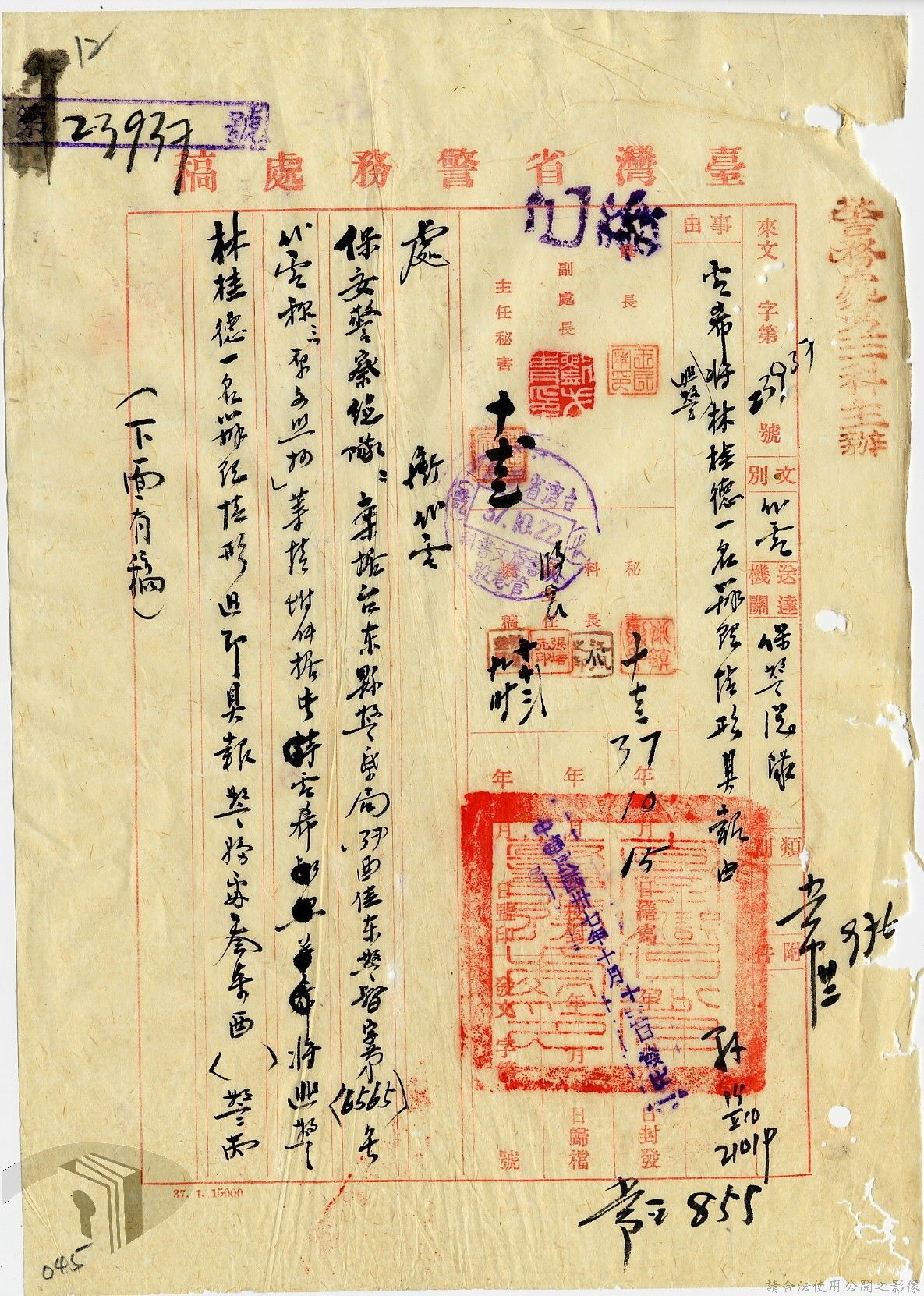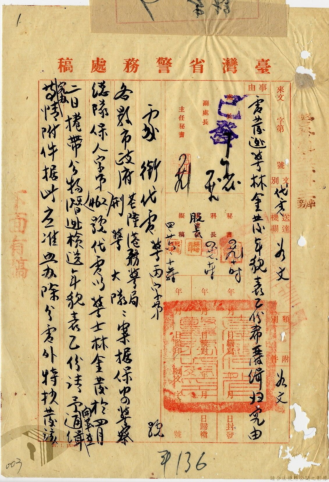 本案為37年間,臺灣省保安警察總隊部等單位發電報請臺灣省警務處通緝涉案員警,警務處發電報請各縣市政府、基隆港務警察所、高雄港務警察所等單位協助辦理;臺灣省職業訓導總隊將涉案員警及相關資料移送至警務處,該處後將當事人發交保安警察總隊部處理。