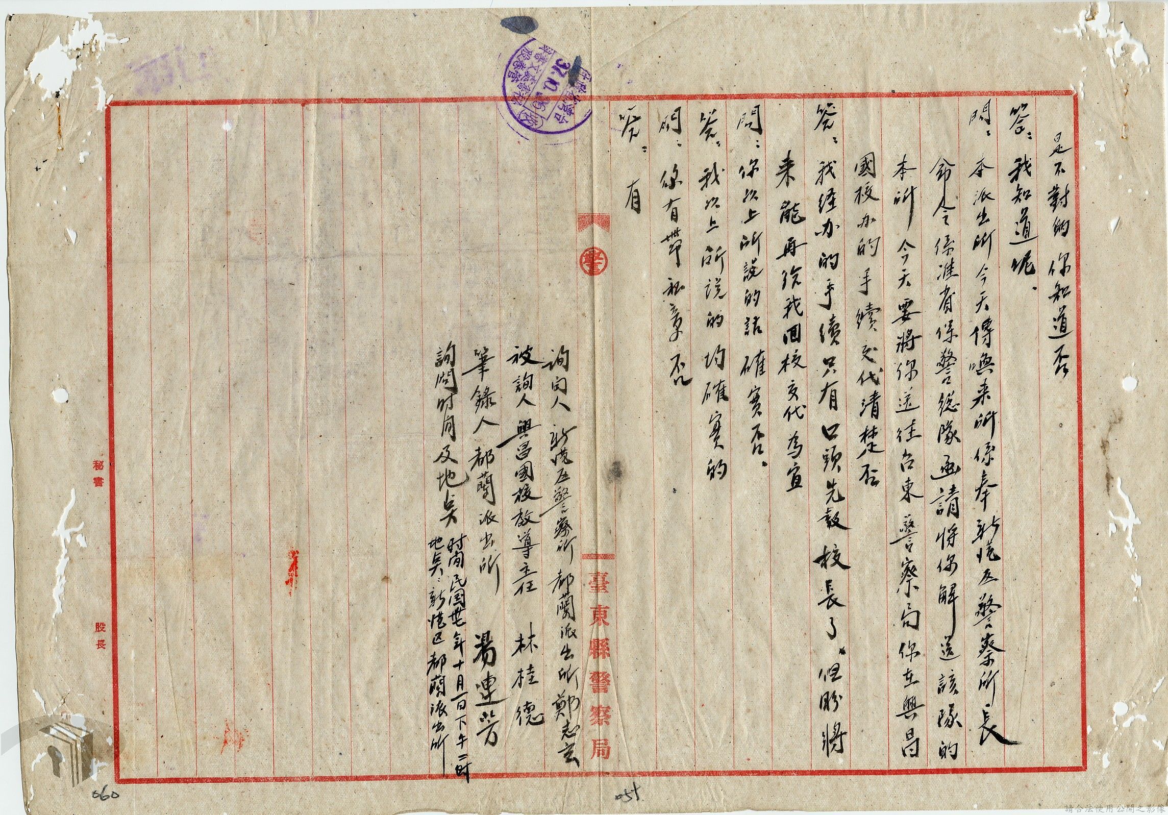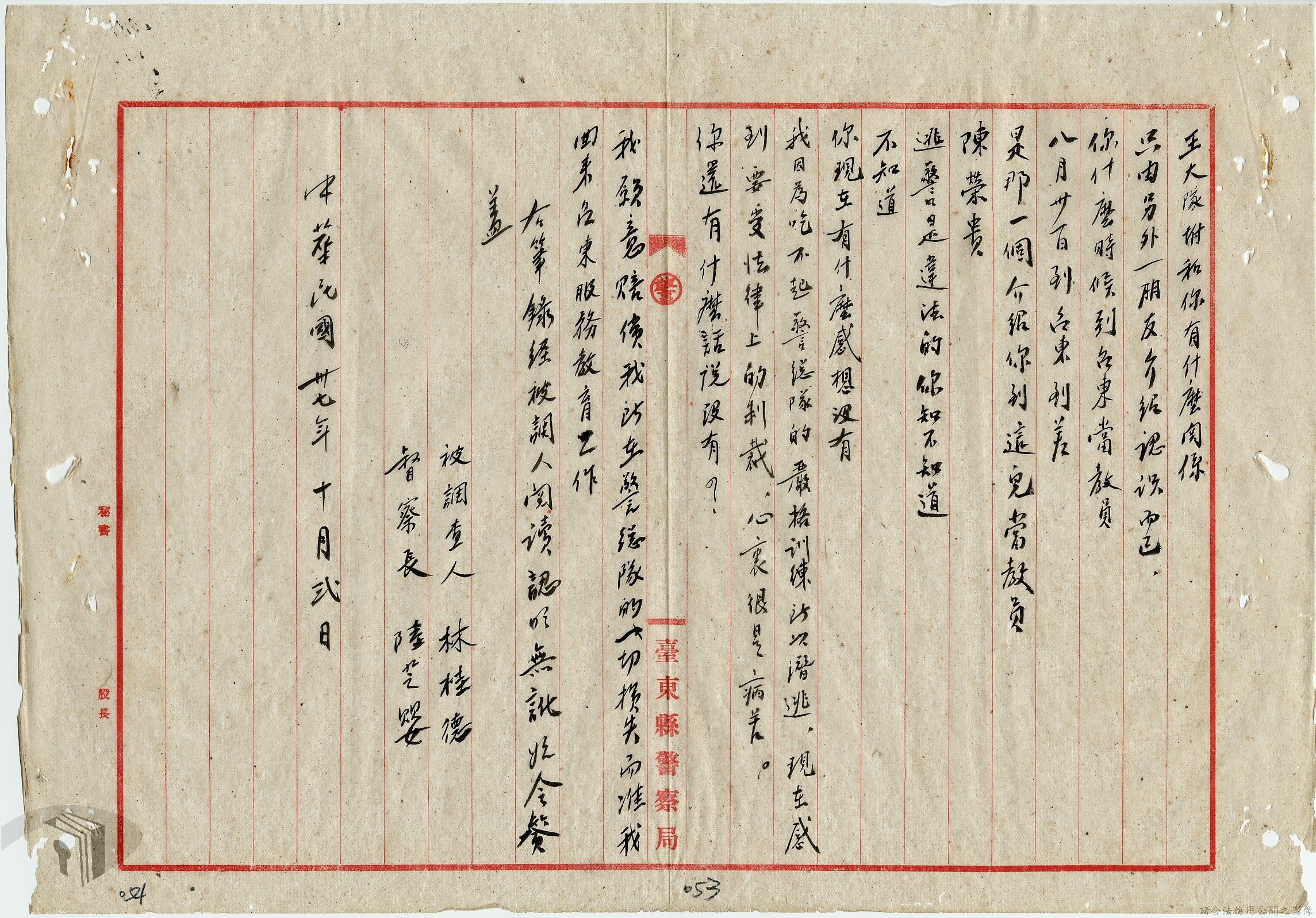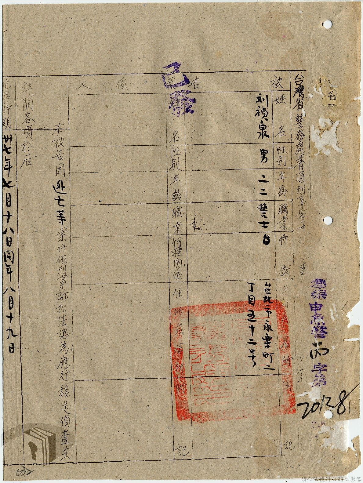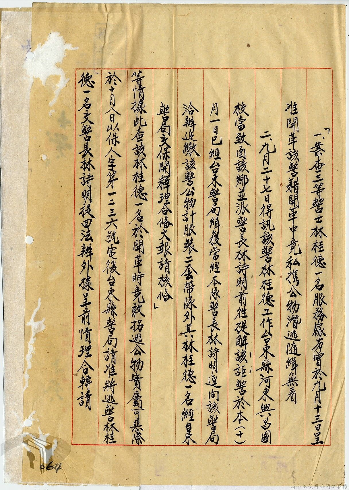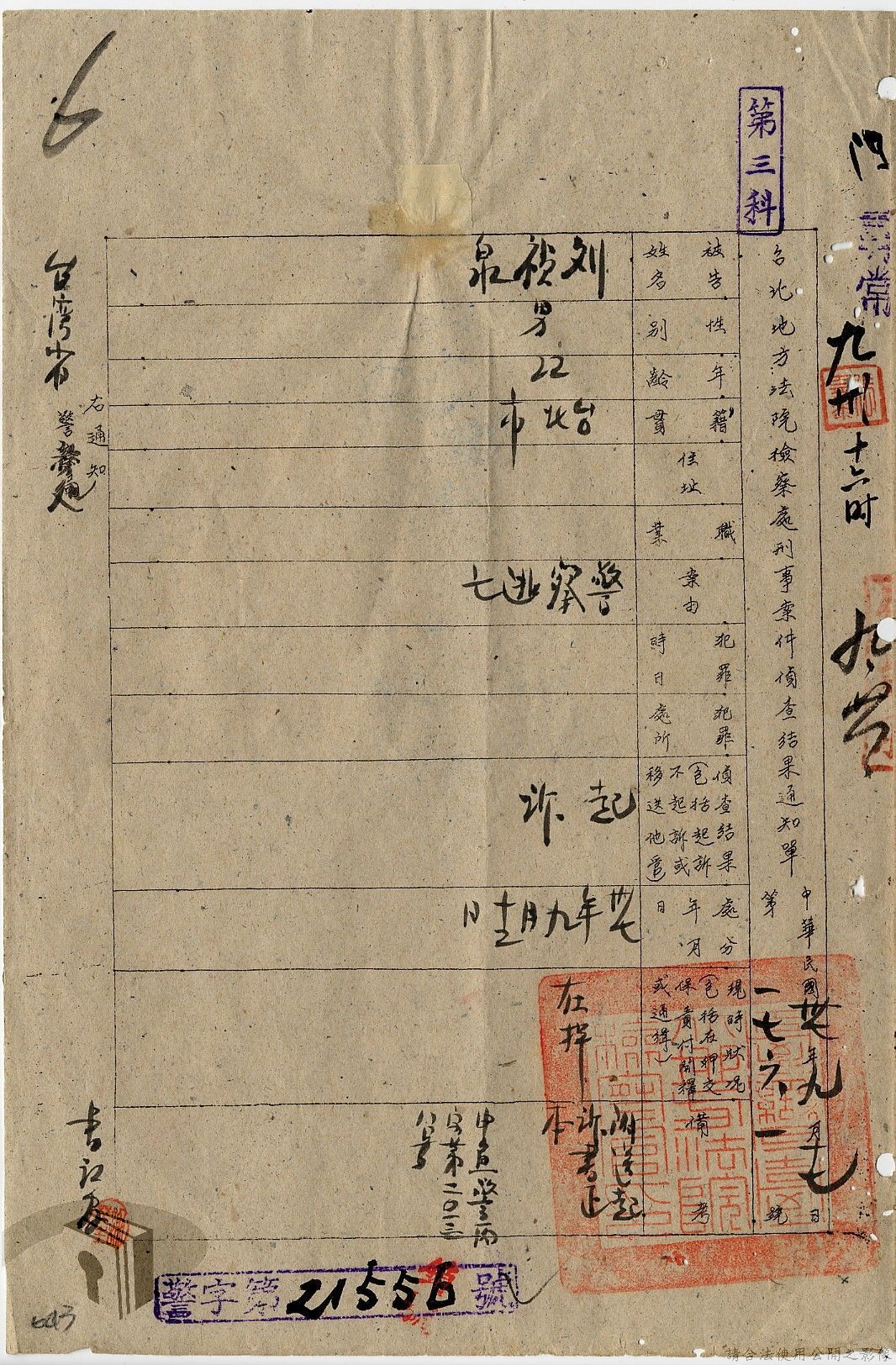 本案為37年間,臺灣省保安警察總隊部等單位發電報請臺灣省警務處通緝涉案員警,警務處發電報請各縣市政府、基隆港務警察所、高雄港務警察所等單位協助辦理;臺灣省職業訓導總隊將涉案員警及相關資料移送至警務處,該處後將當事人發交保安警察總隊部處理。
