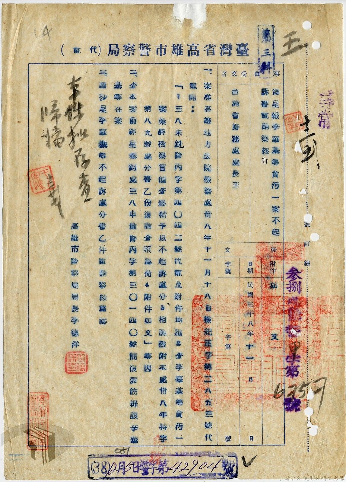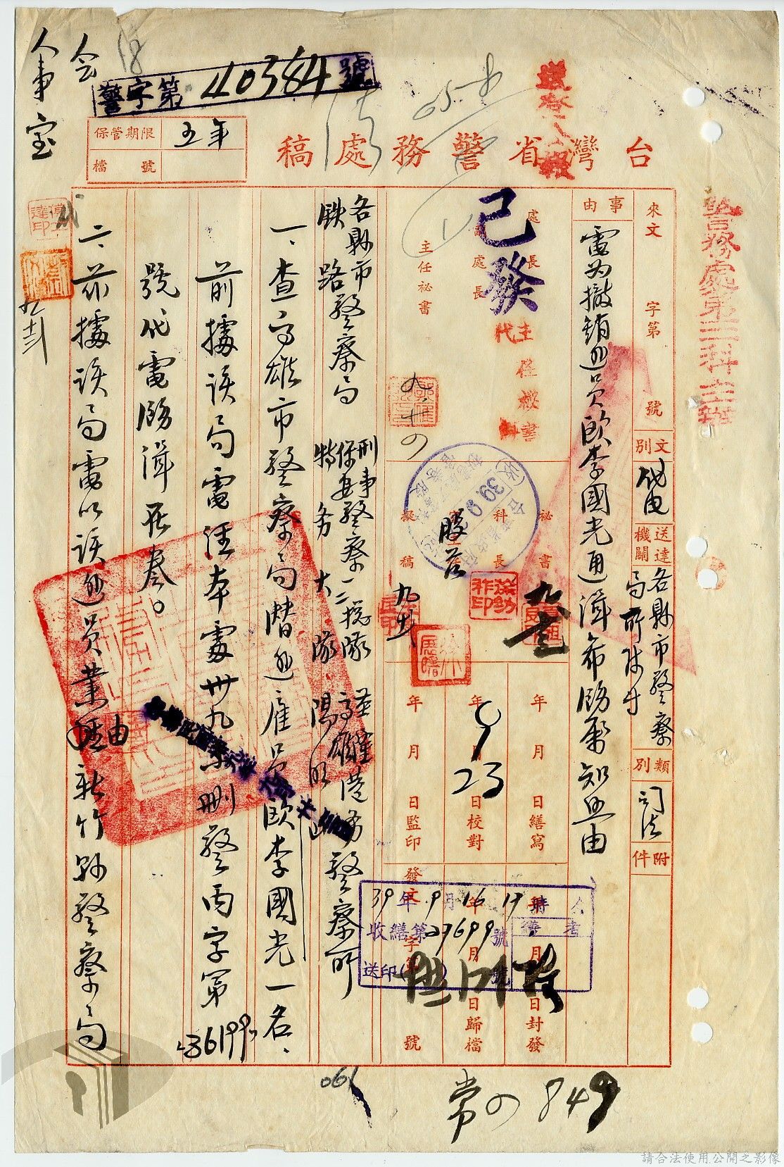 本案為38至39年間協緝逃警事宜,臺灣省高雄市政府及警察局為該局警員棄職潛逃及涉案情事而檢送其年貌表予臺灣省政府警務處請指示所屬單位人員協助緝拿歸案,警務處轉請各縣市政府、保安警察總隊、刑事警官大隊、基隆及高雄港務警察所等單位配合辦理,後來警務處依高雄市警察局來函聲稱已捕獲部分嫌犯而辦理撤銷通緝事宜。附通緝人犯年貌表。
