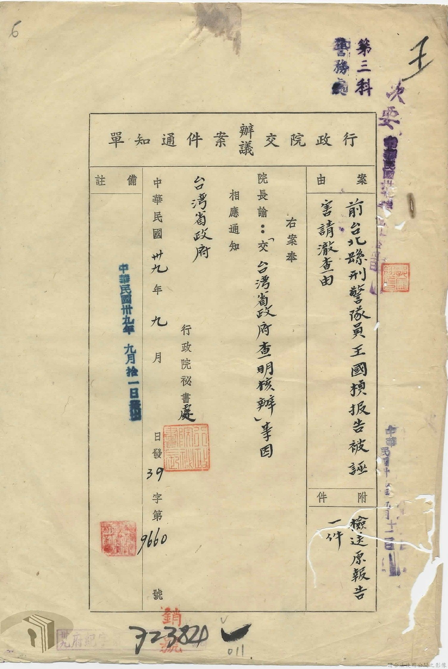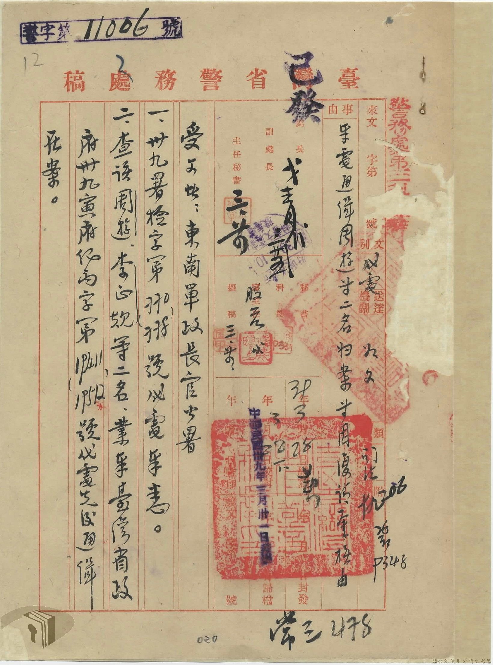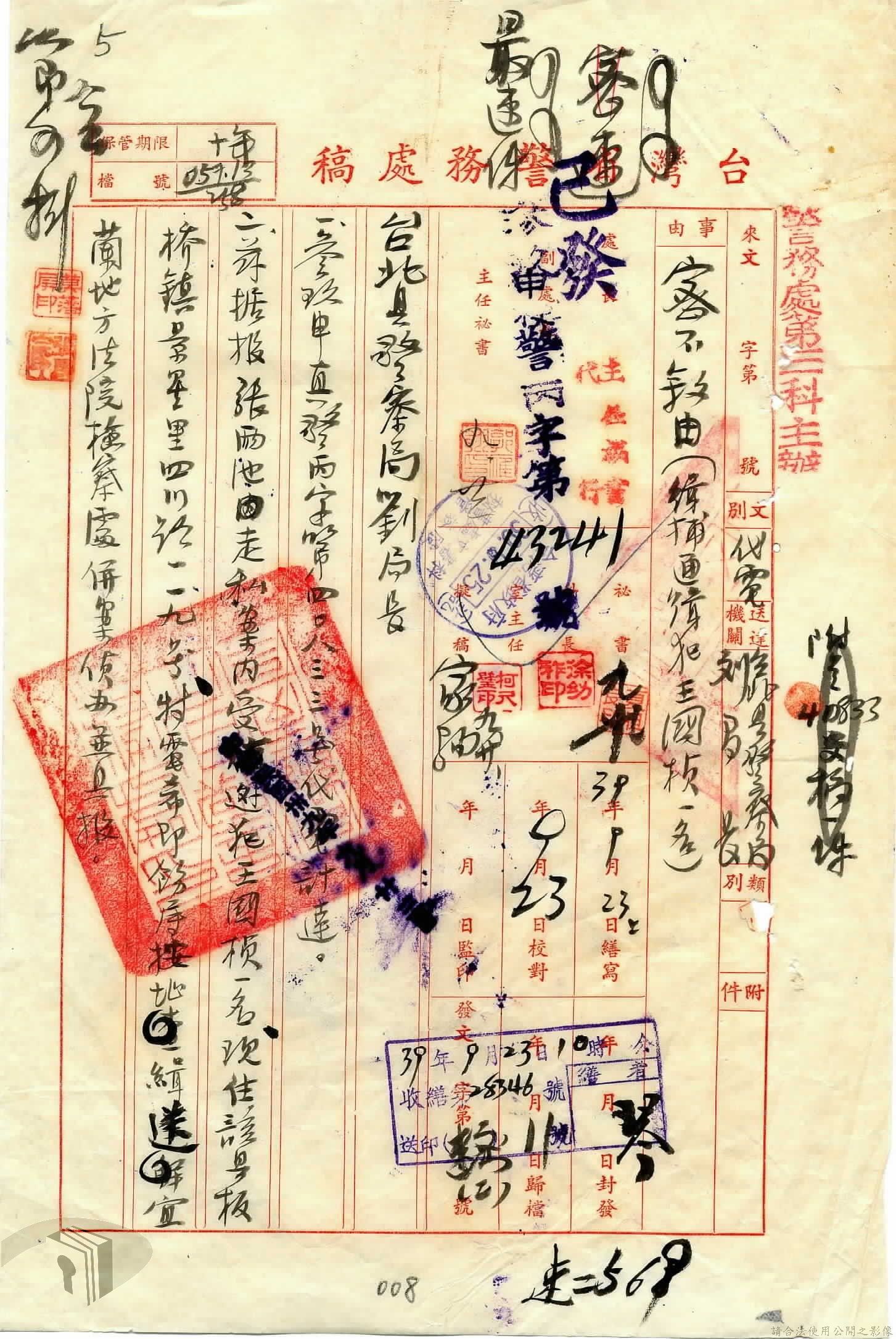 本案為39年間,臺灣省政府警務處依據國民黨總裁辦公室通報稱蘇澳警察局刑事警官被控收受賄賂縱放走私犯並畏罪潛逃一事,要求各所屬機關將其協緝歸案,該員向行政院陳情稱係被誣陷害,行政院秘書室據以要求省府核辦,省警務處回復有關該員涉案查證屬實,依然要求下屬嚴緝,後各縣市警察局電稱並無發現該員蹤跡;東南軍政長官公署為國防部經理署高雄被服廠職員因貪污案畏罪潛逃事,請省府予以協緝,省警務處發文至各警署機關要求協緝該員歸案。