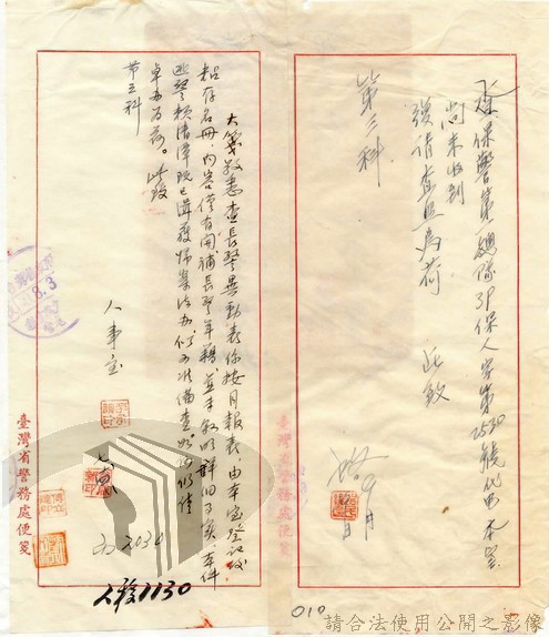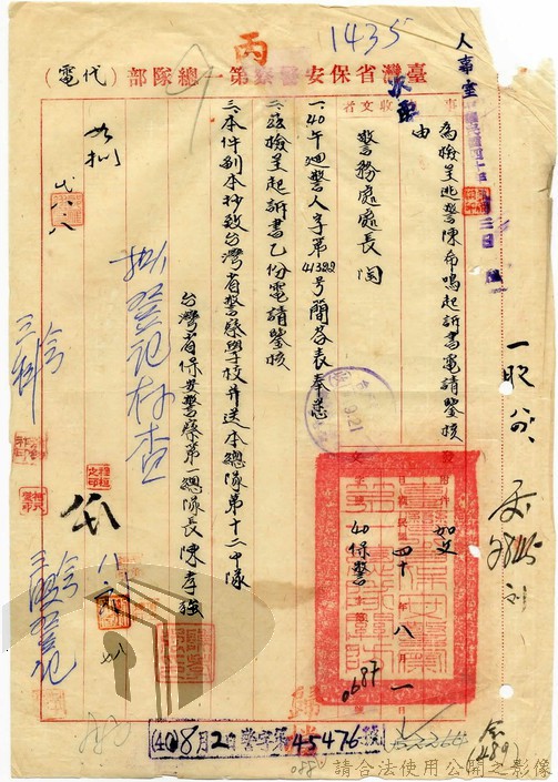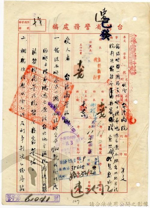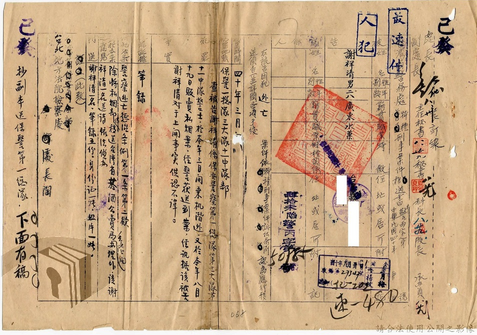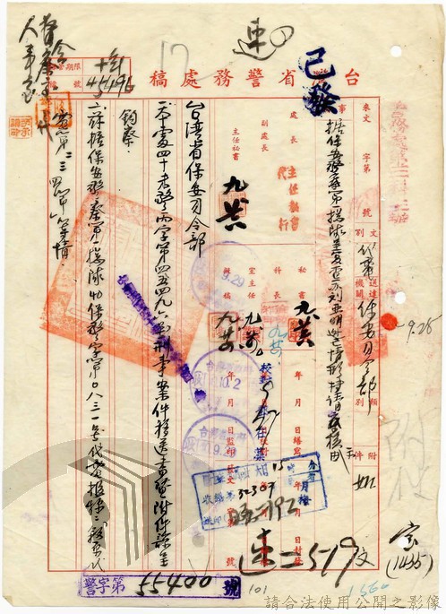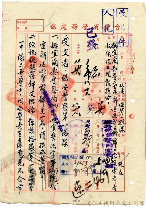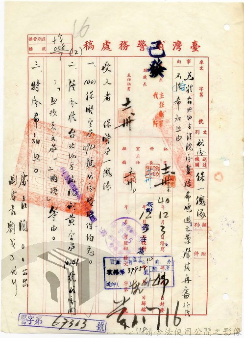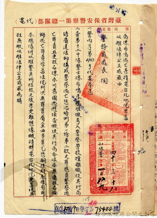 本案為40至41年間緝拿逃警事宜,臺灣省保安警察第一總隊為該隊員警無故或涉案潛逃而檢送其年籍表及照片予臺灣省政府警務處請協助緝拿歸案,警務處轉請臺北地方法院、各縣市警察局等單位配合辦理,後來各地警局向警務處報告查緝情形,並將緝獲之逃警移送臺北地方法院檢察處偵辦。附訊問筆錄、判決書等文件資料。