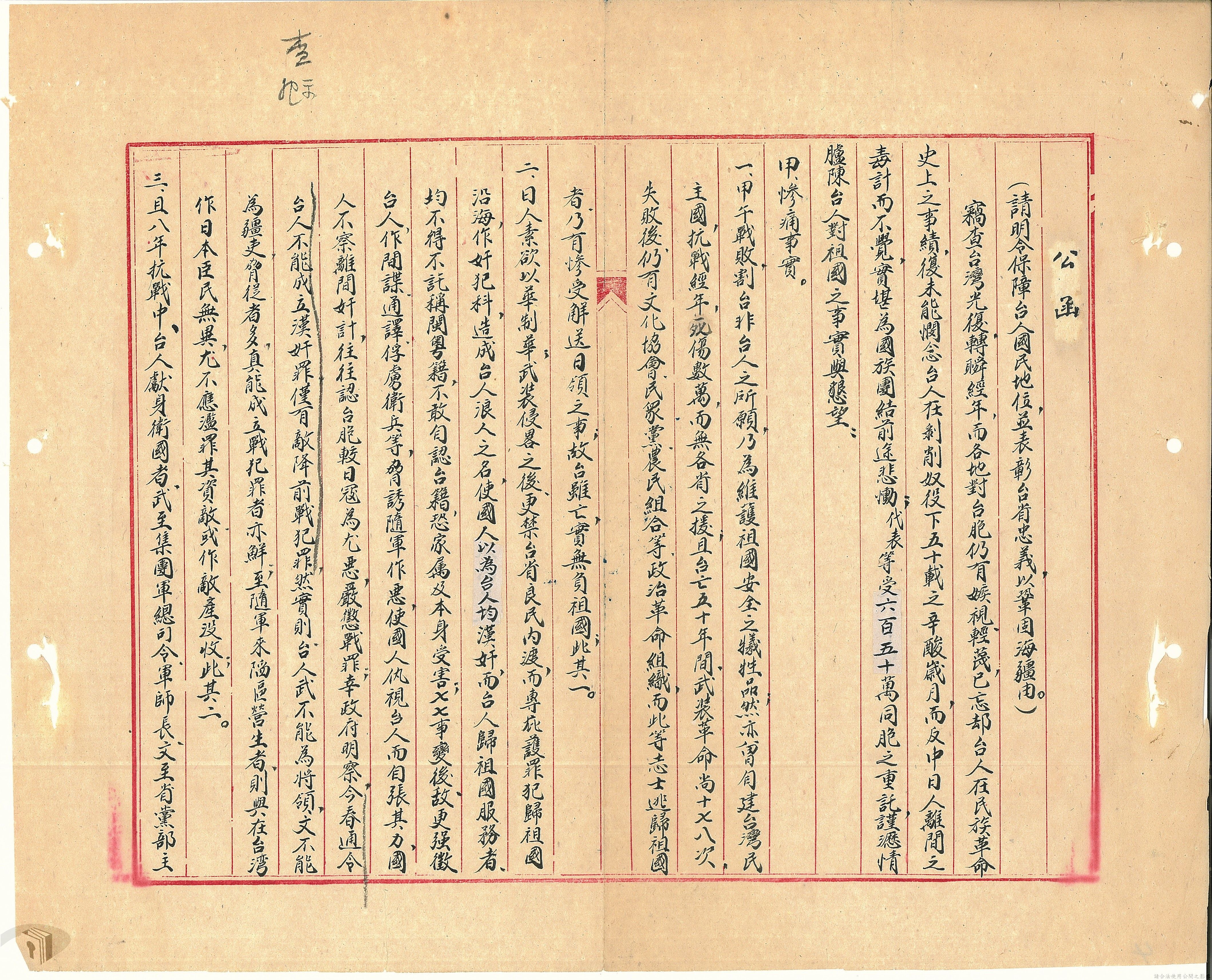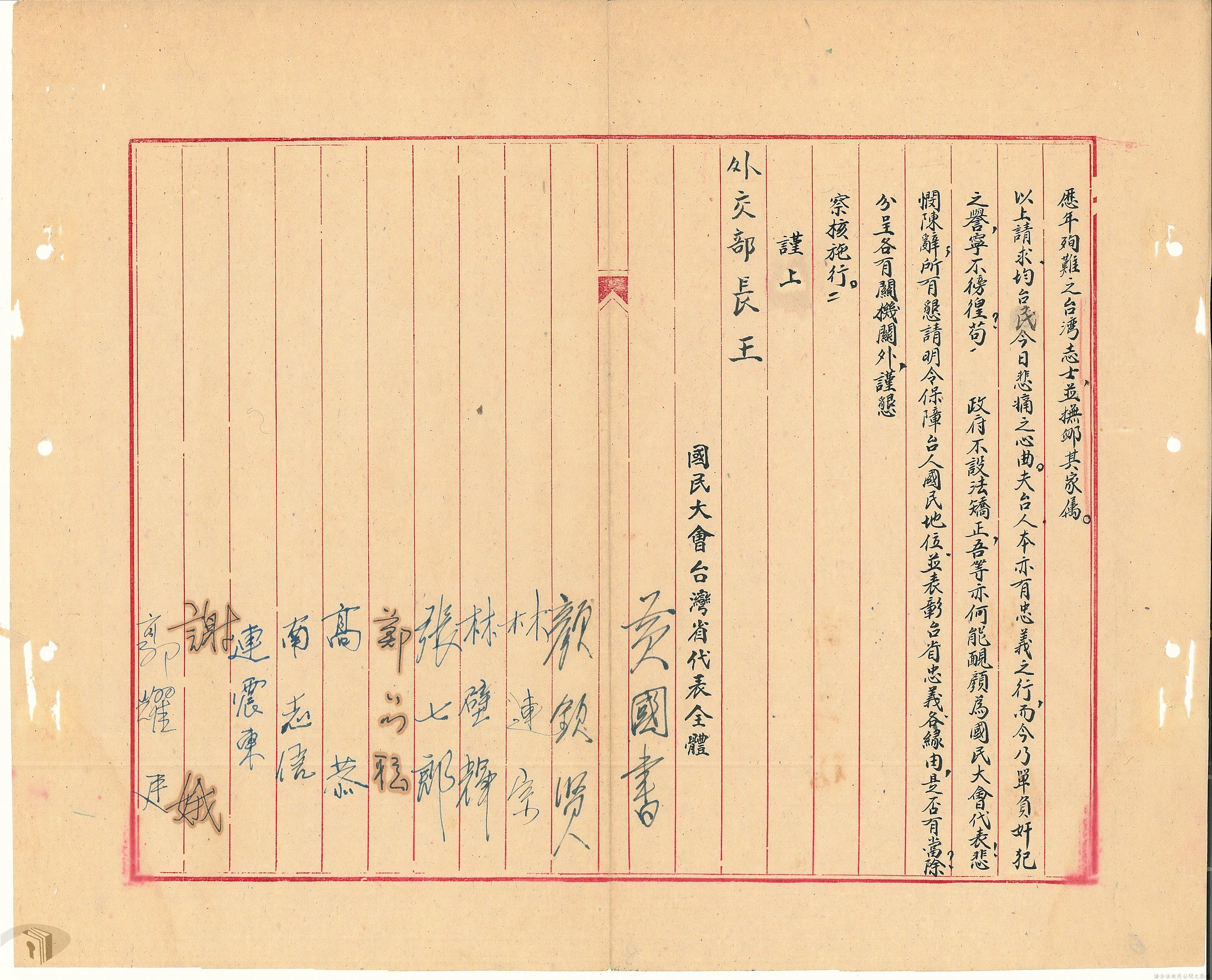本案為35至36年間,國大代表函請外交部保障臺灣人國民地位,以及表彰忠義人士,以鞏固海疆,外交部後檢送該信函予行政院秘書處,並回復該員已轉陳行政院秘書處辦理;臺灣省行政長官公署警務處發電報告知外交部有關各國考察團及友邦高級人員來臺考察一事。