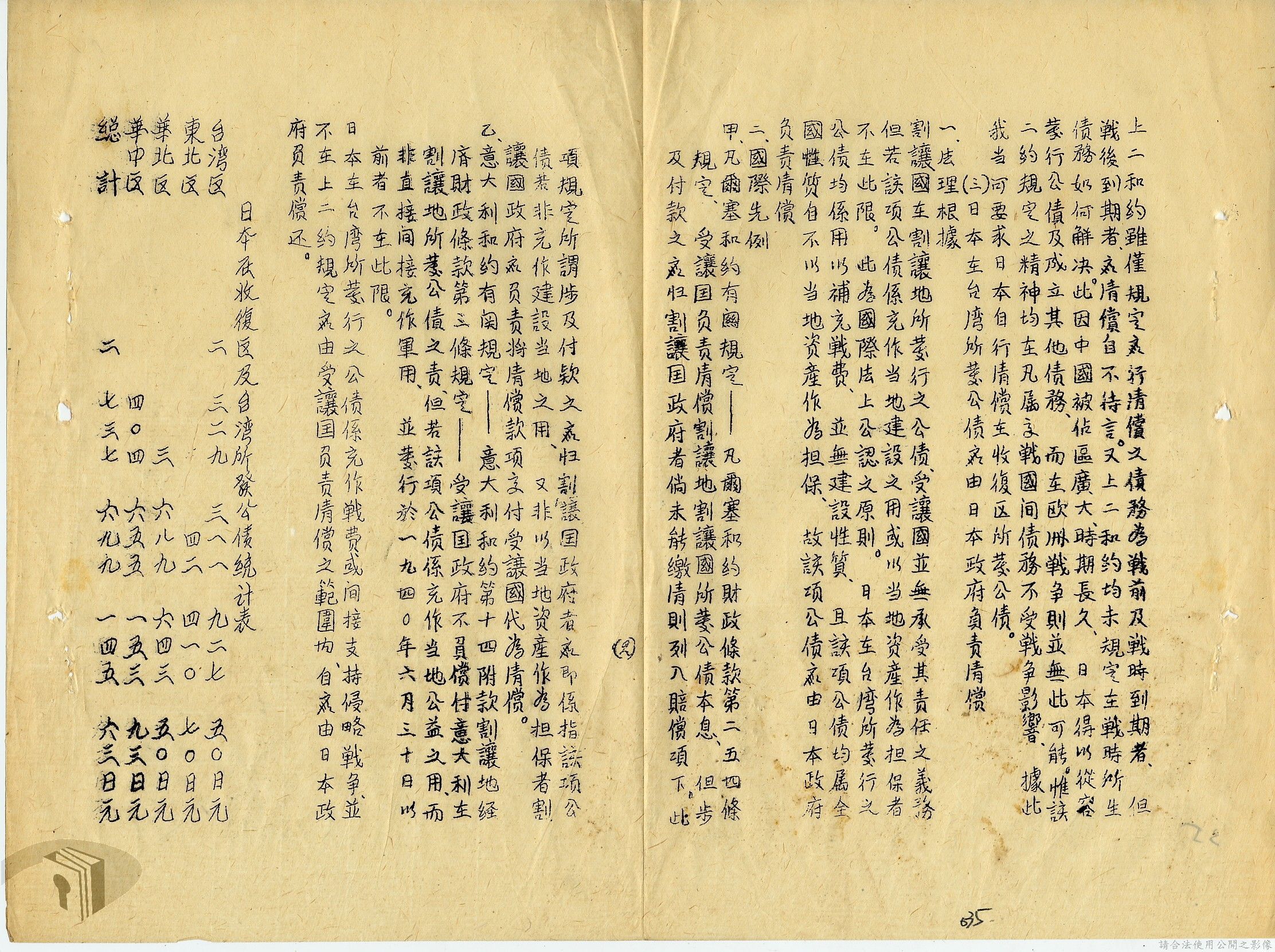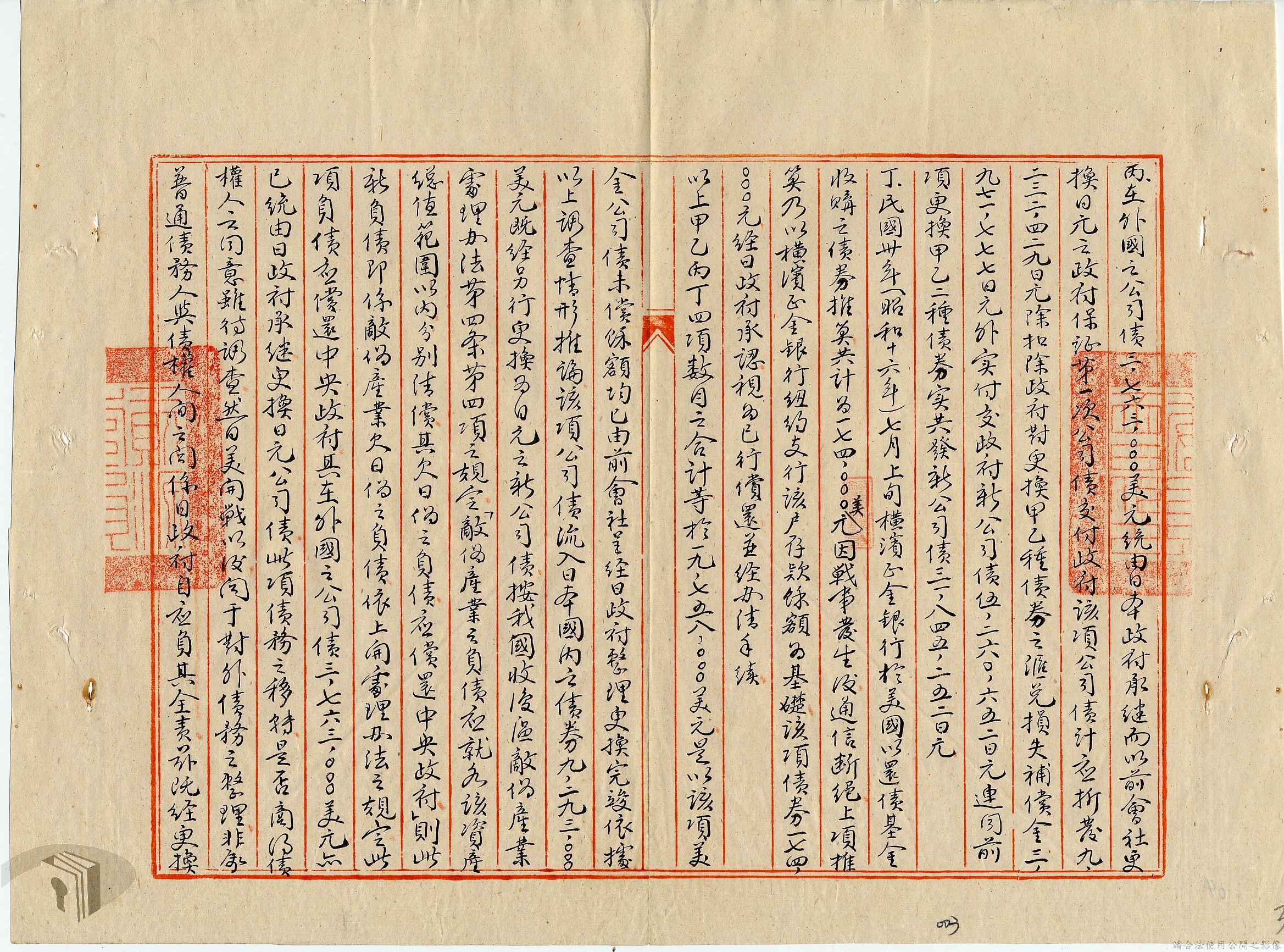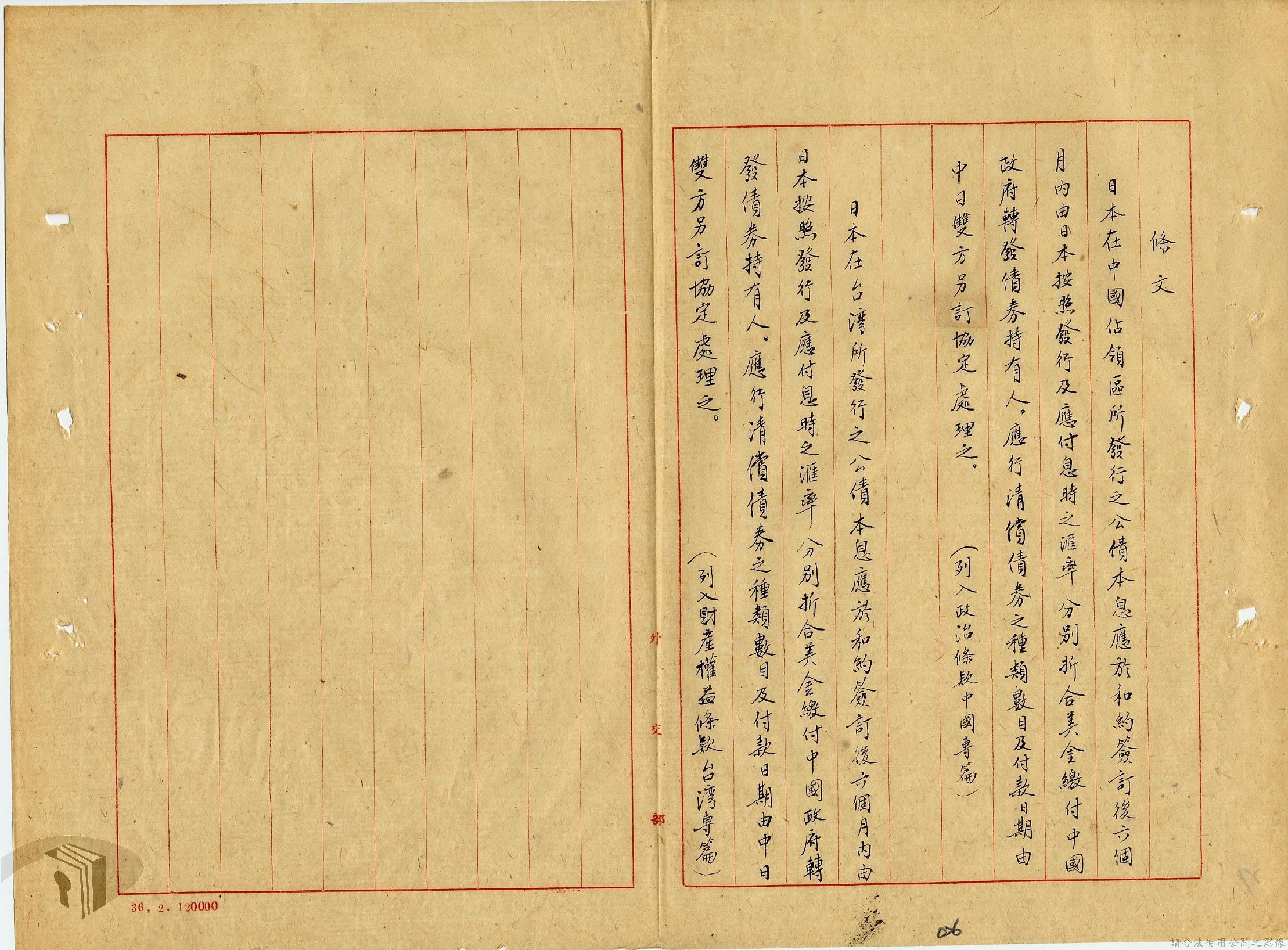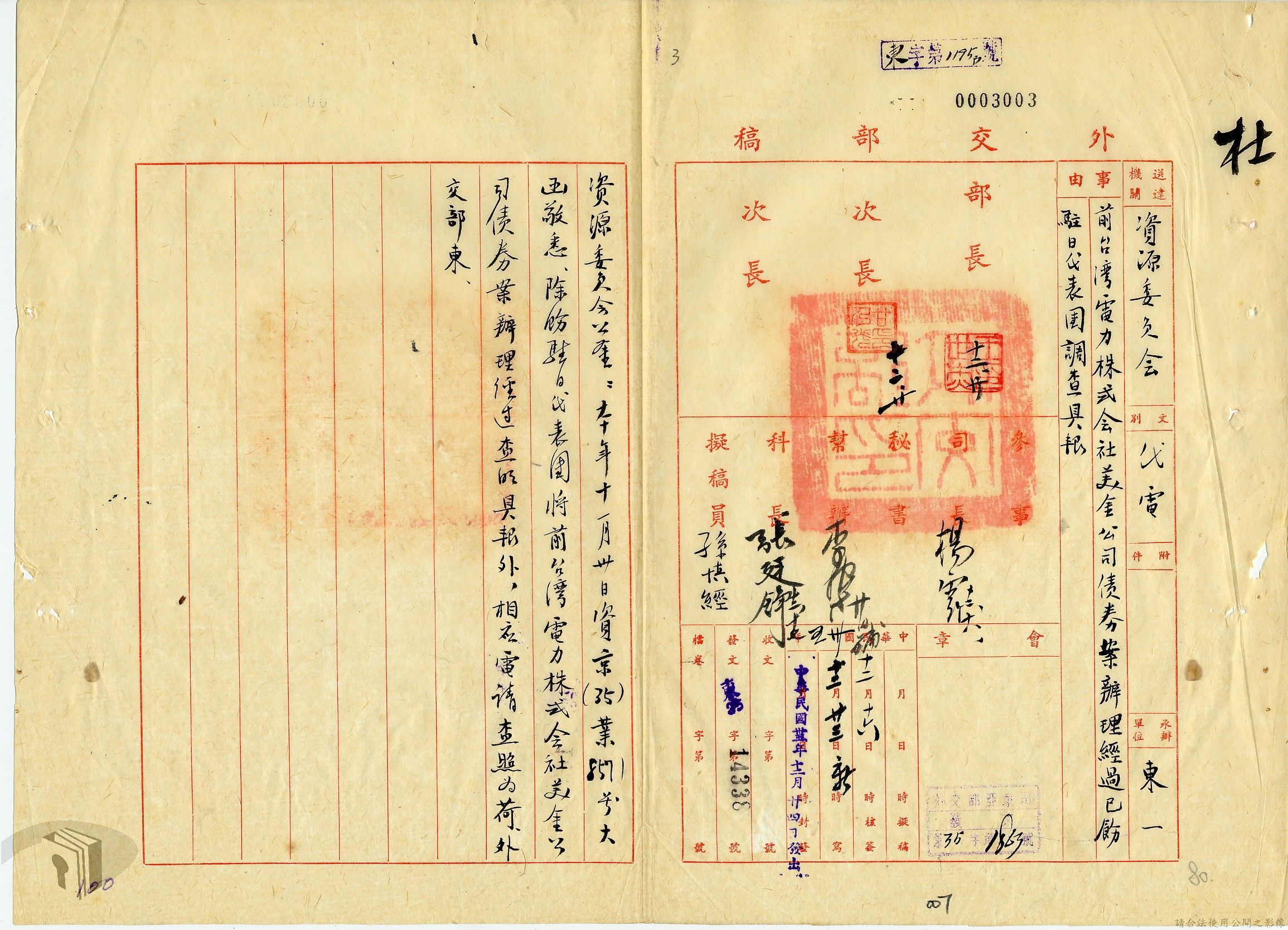 本案為35至36年間,外交部發函請資源委員會調查前臺灣電力株式會社美金公司債券問題,該委員會將調查情形告知外交部,外交部後令駐日代表團查明該案辦理情形,並擬儘早召開對日和會及商訂日本賠償盟國攤額問題等。附日本在收復區及臺灣所發公債應在合約中列入條文責令負責清償說帖等文件資料。