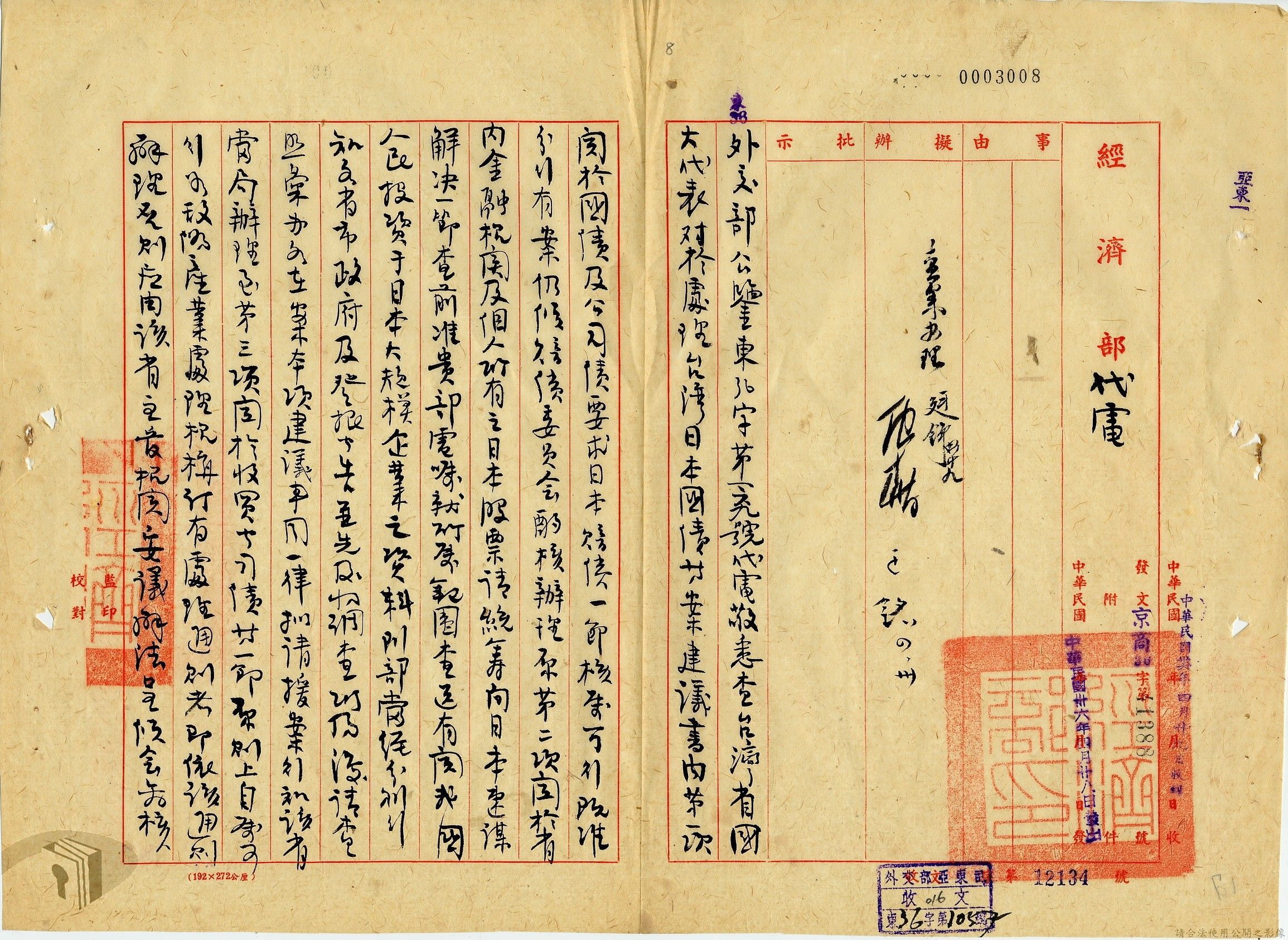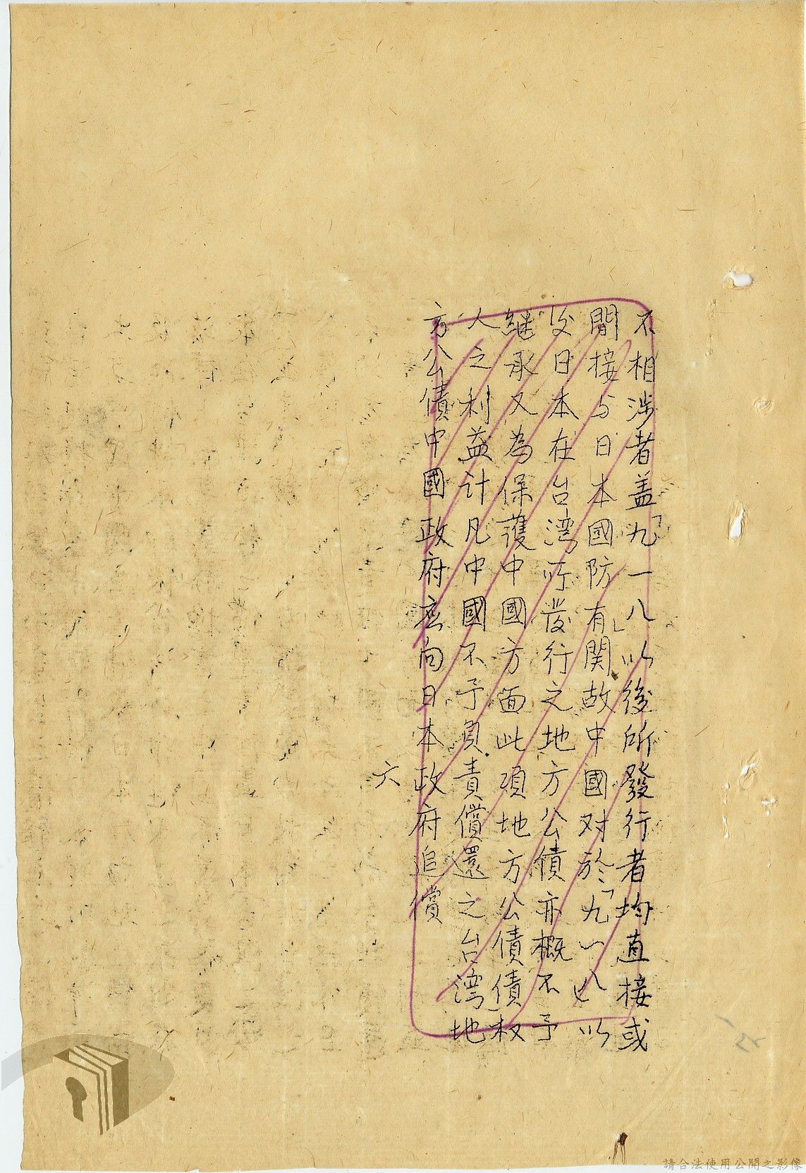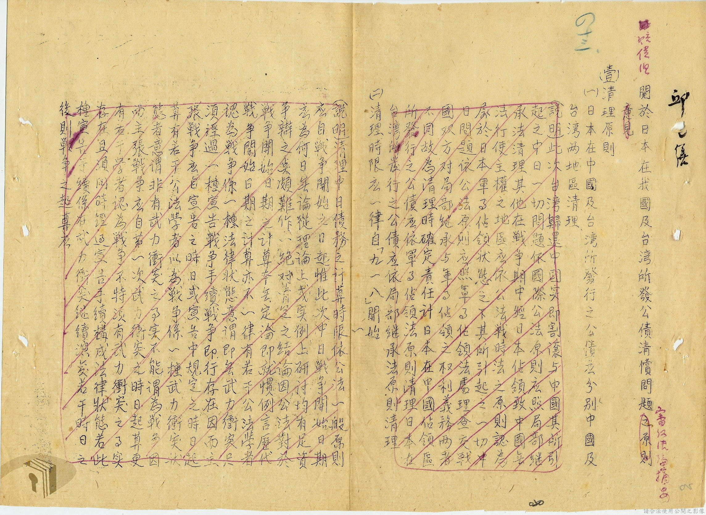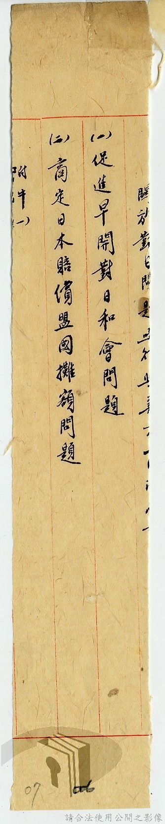 本案為35至36年間,外交部發函請資源委員會調查前臺灣電力株式會社美金公司債券問題,該委員會將調查情形告知外交部,外交部後令駐日代表團查明該案辦理情形,並擬儘早召開對日和會及商訂日本賠償盟國攤額問題等。附日本在收復區及臺灣所發公債應在合約中列入條文責令負責清償說帖等文件資料。