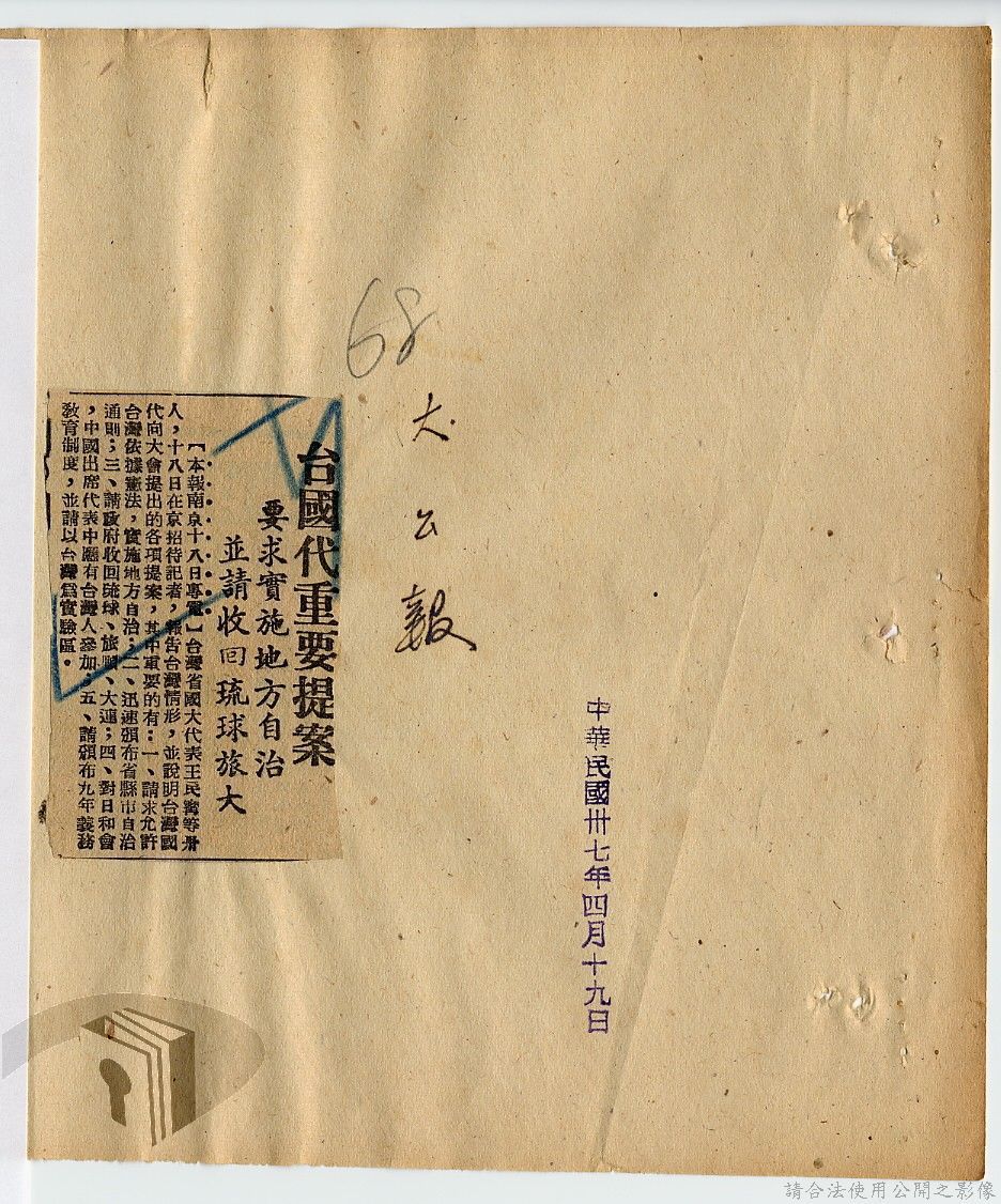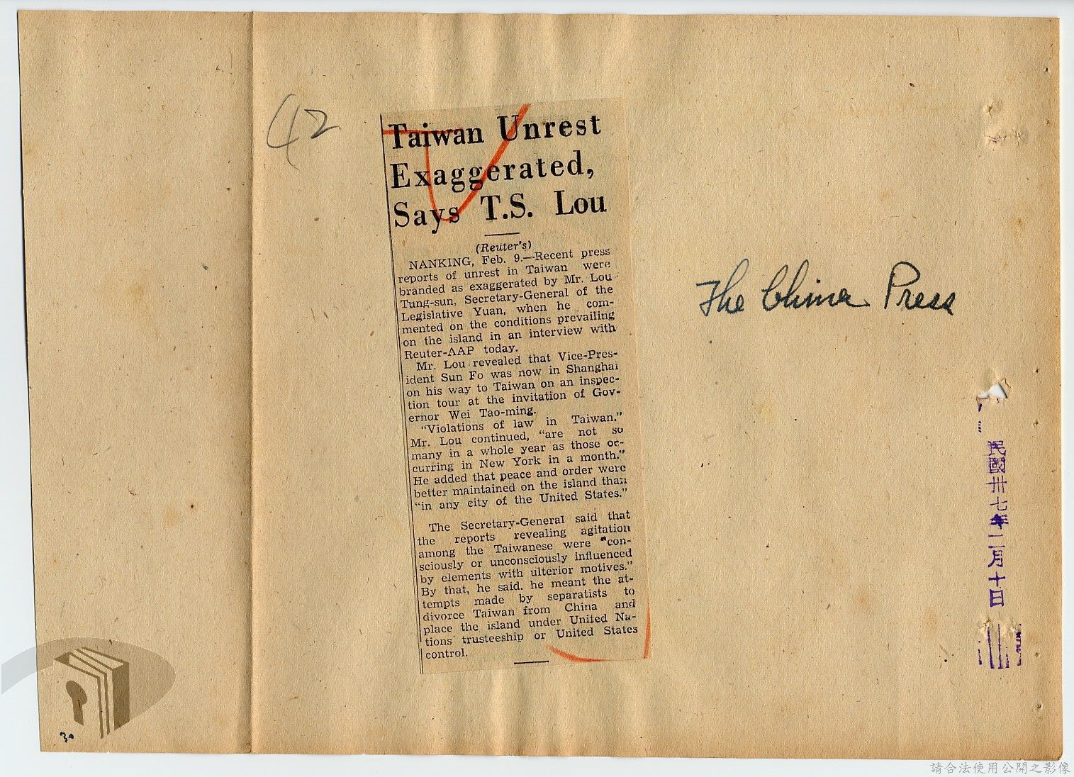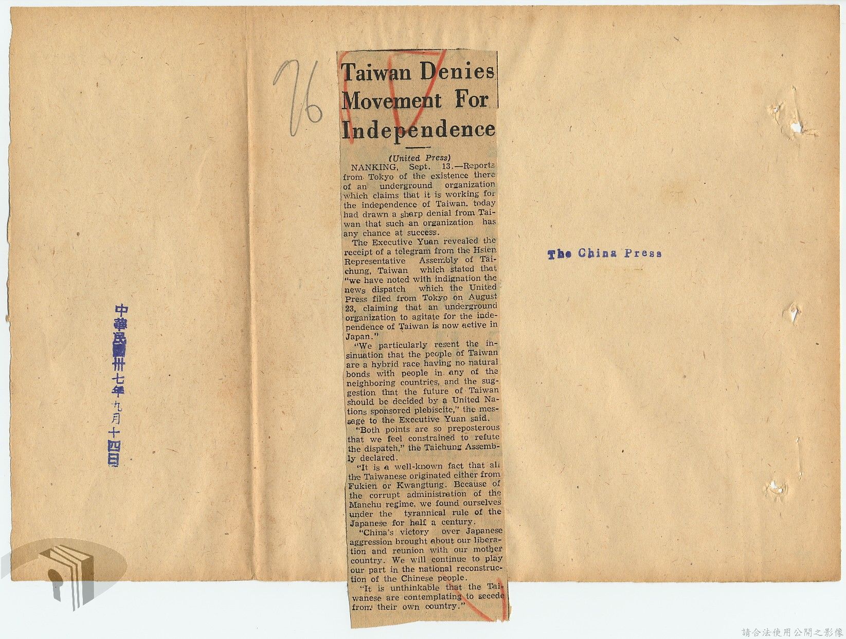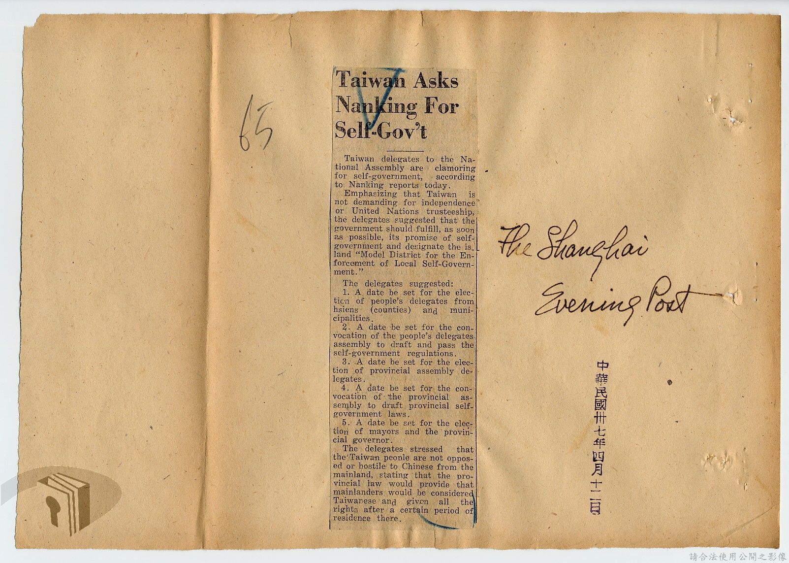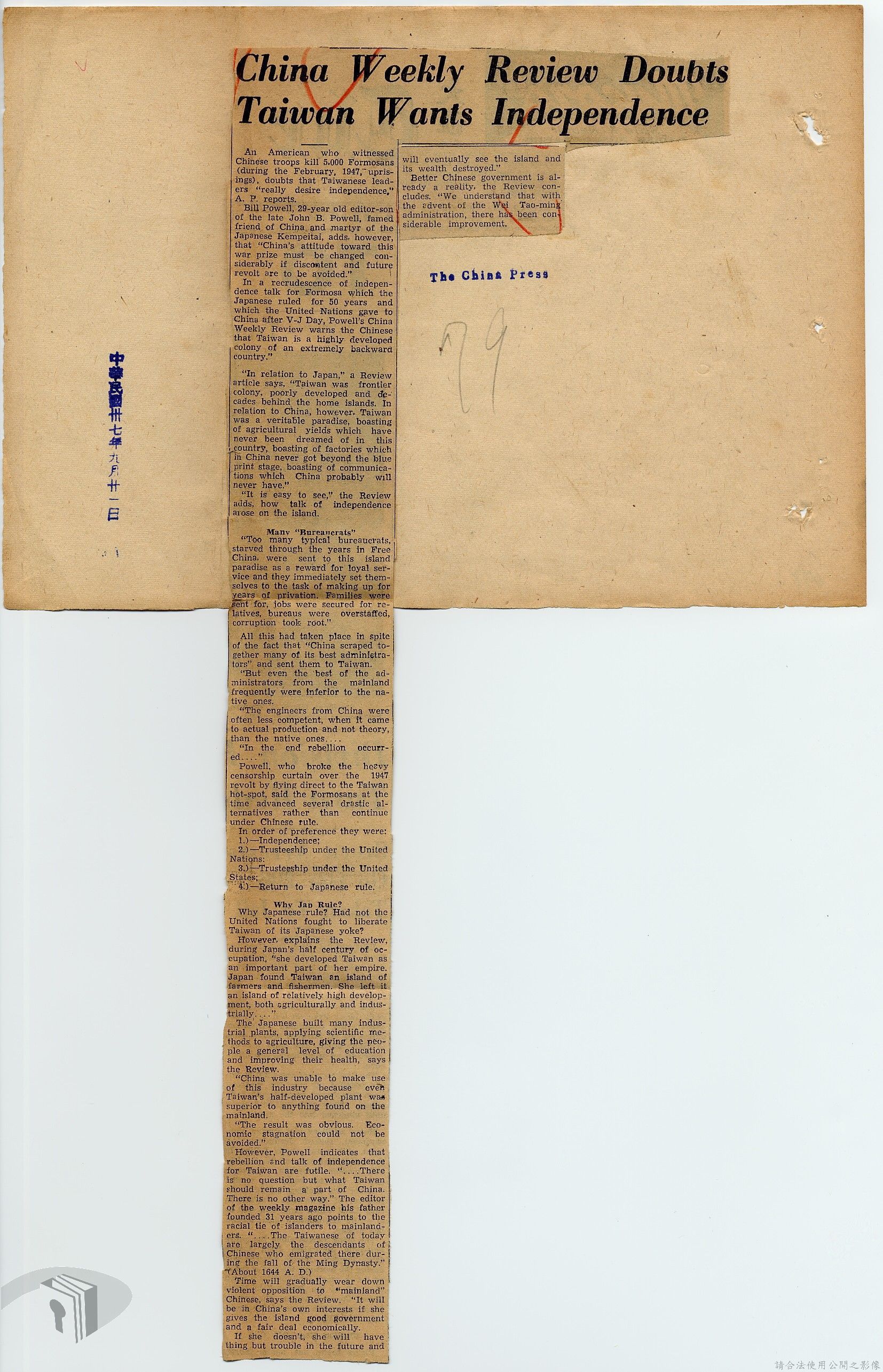 本案為36至37年間,外交部所摘臺灣問題剪報,包括中央日報、大公報、大剛報、和平日報、The China Press等報紙,內容則有關臺省政治、經濟、交通等現狀,以及二二八事件一週年之政治風氣比較、臺灣主權定位及獨立自治運動的相關報導等。