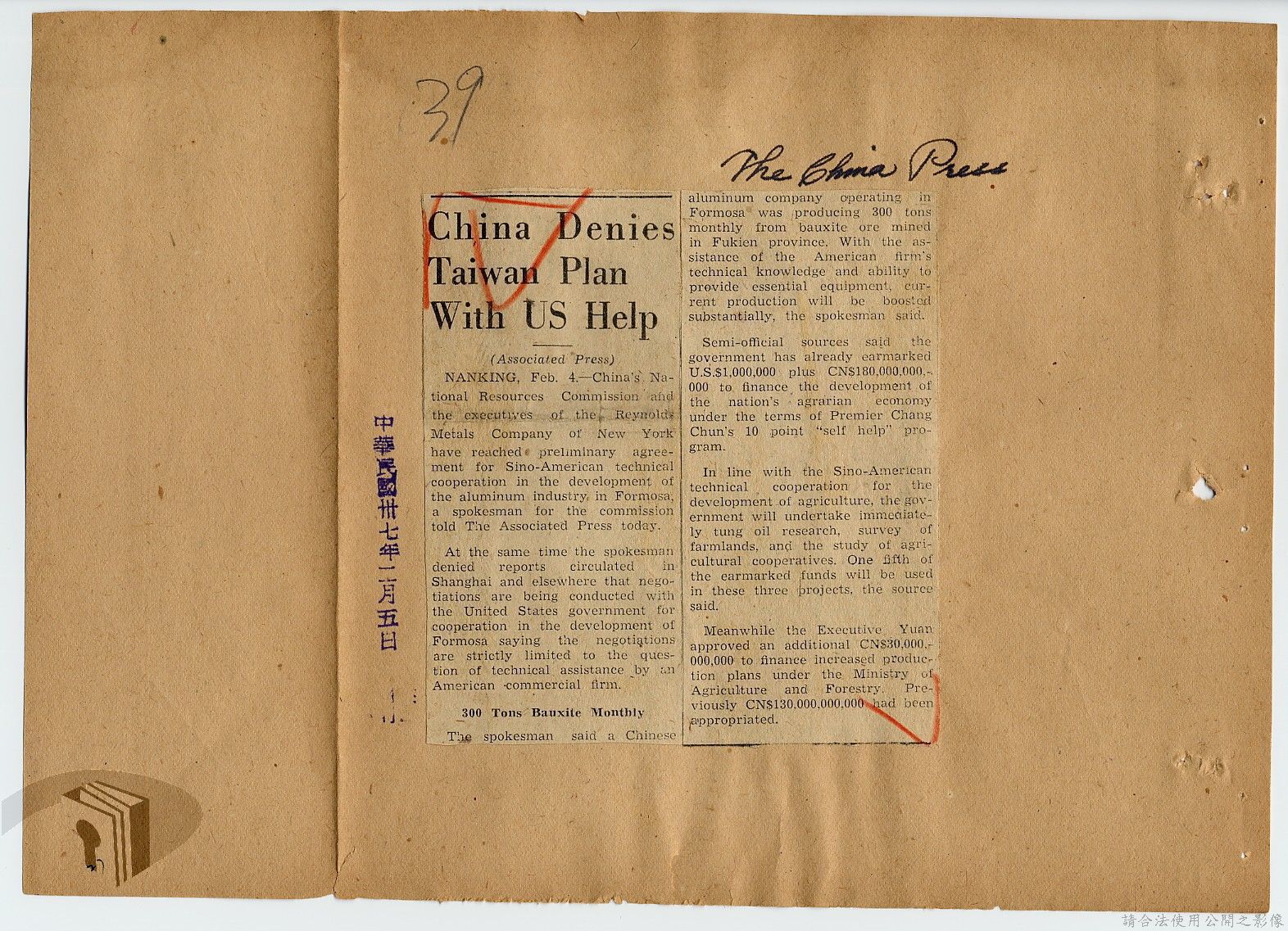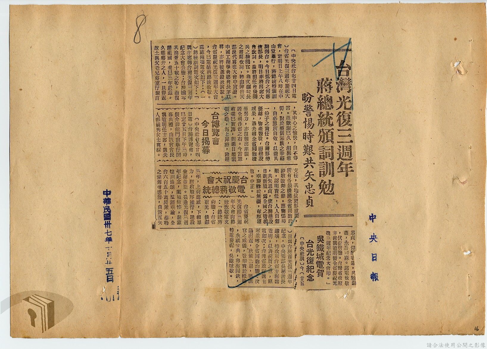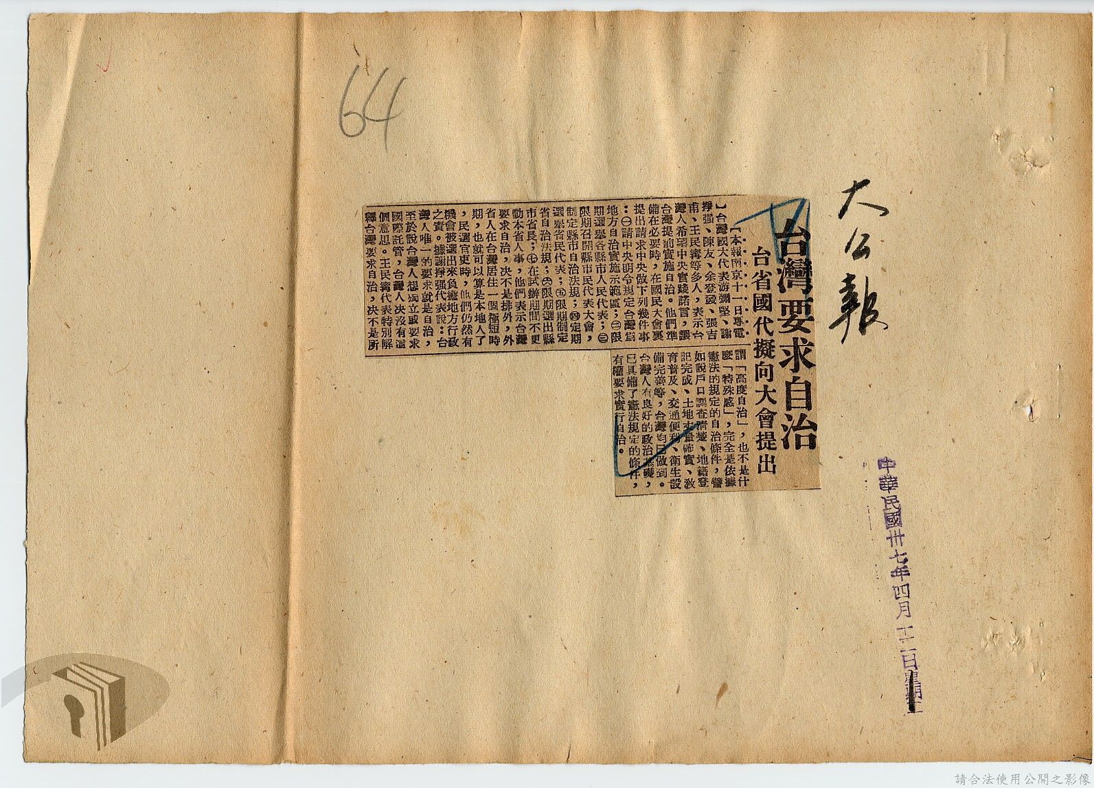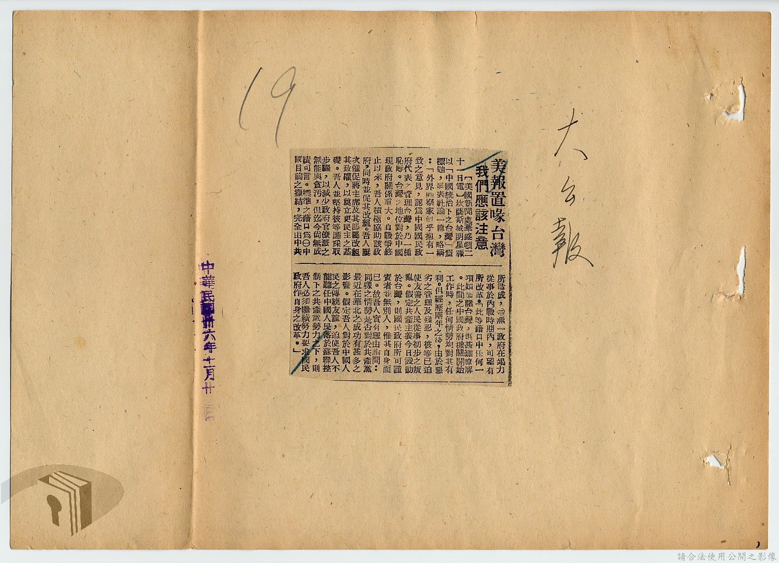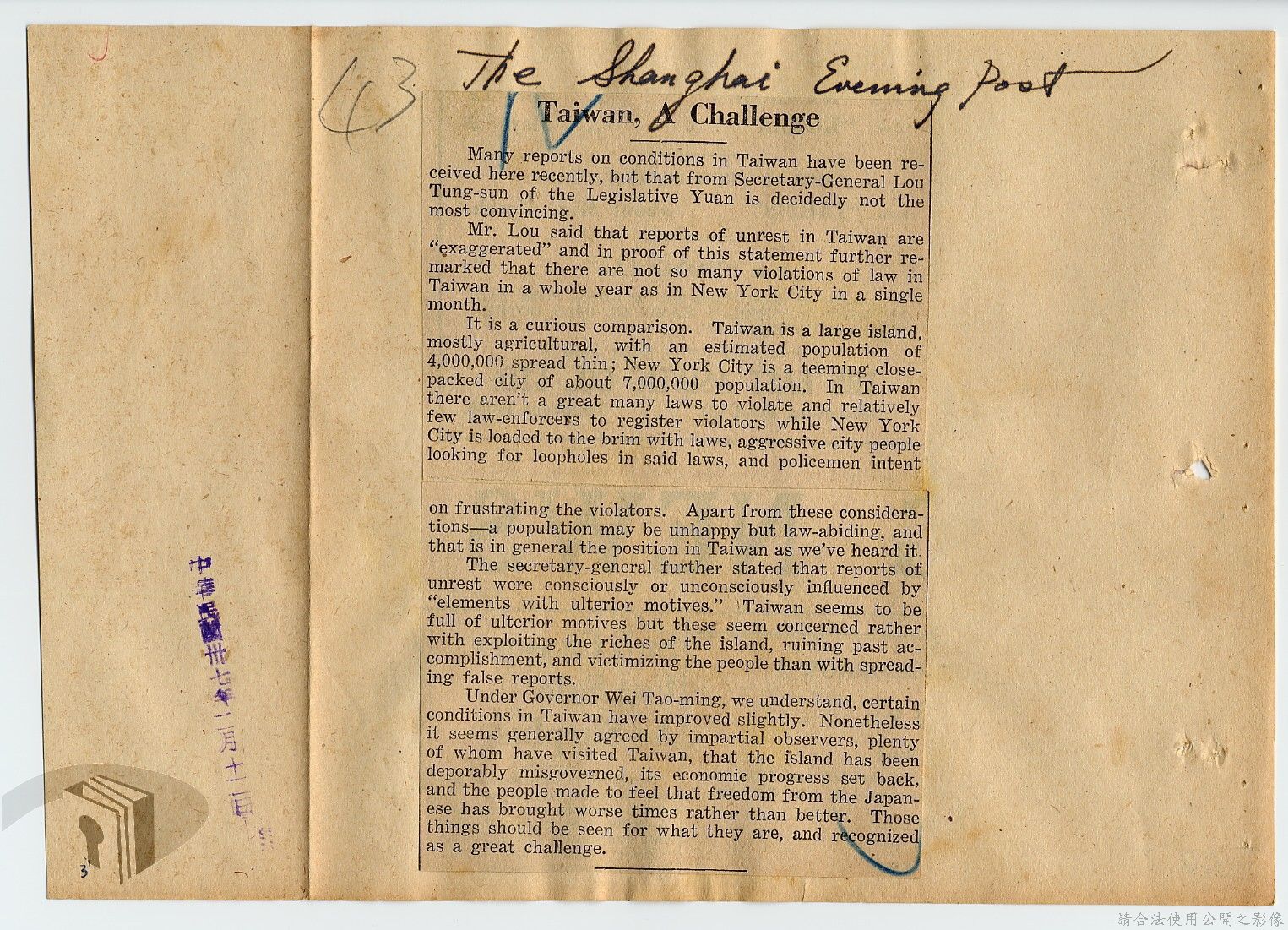 本案為36至37年間,外交部所摘臺灣問題剪報,包括中央日報、大公報、大剛報、和平日報、The China Press等報紙,內容則有關臺省政治、經濟、交通等現狀,以及二二八事件一週年之政治風氣比較、臺灣主權定位及獨立自治運動的相關報導等。