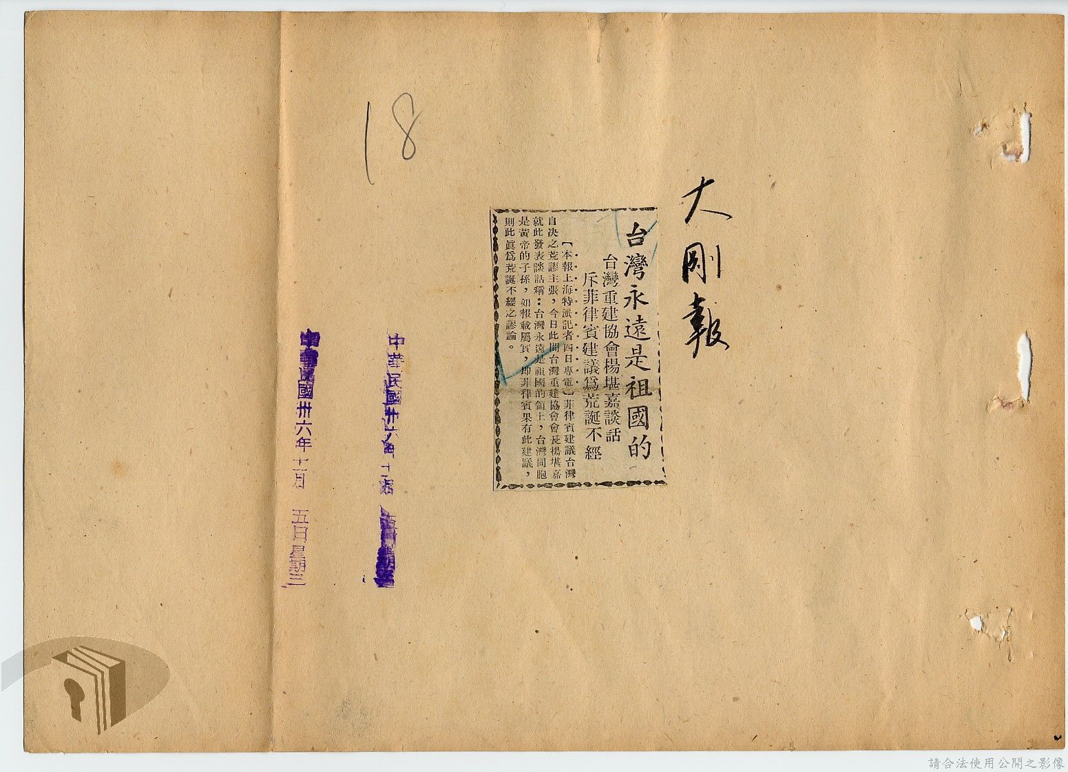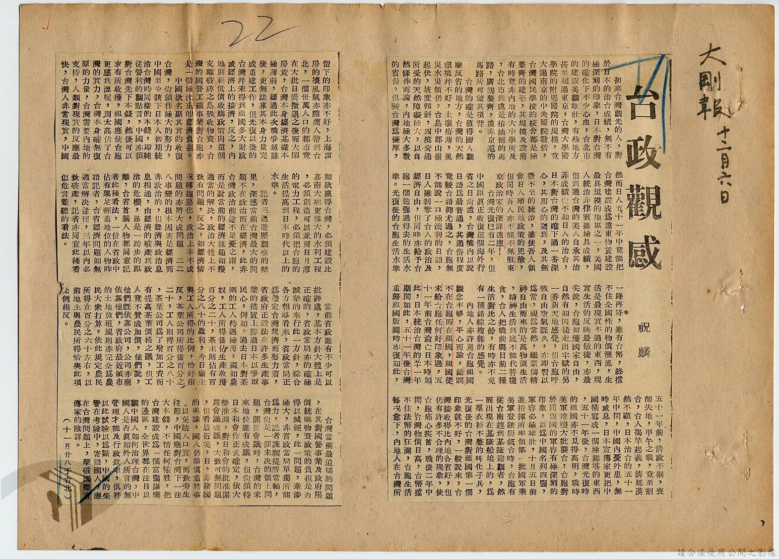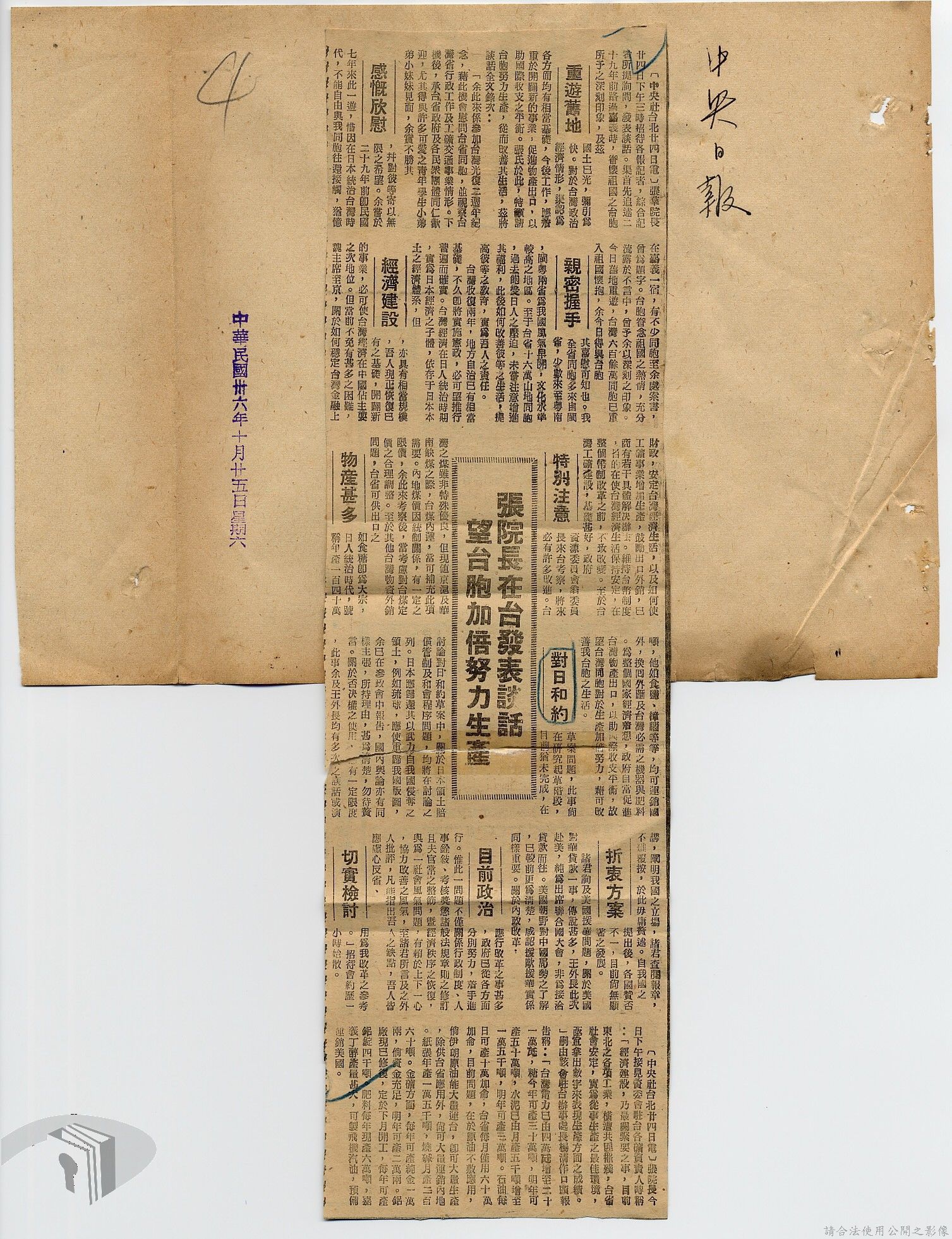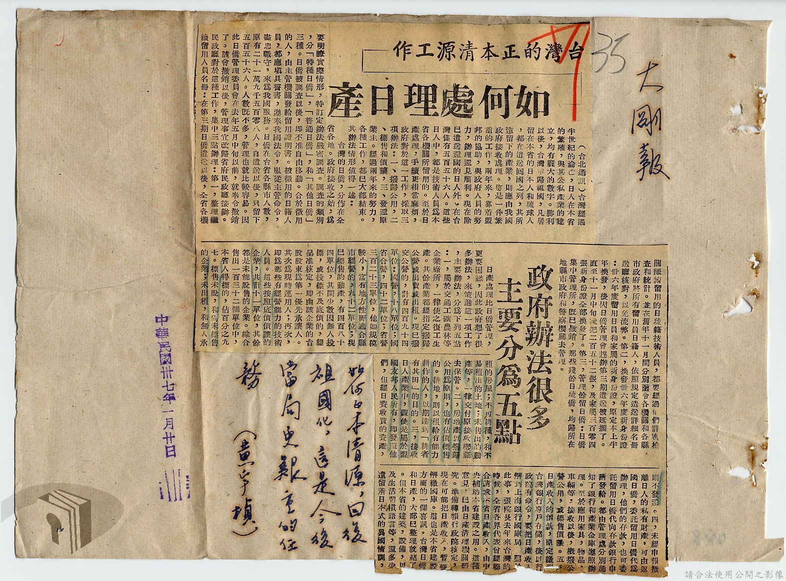 本案為36至37年間,外交部所摘臺灣問題剪報,包括中央日報、大公報、大剛報、和平日報、The China Press等報紙,內容則有關臺省政治、經濟、交通等現狀,以及二二八事件一週年之政治風氣比較、臺灣主權定位及獨立自治運動的相關報導等。