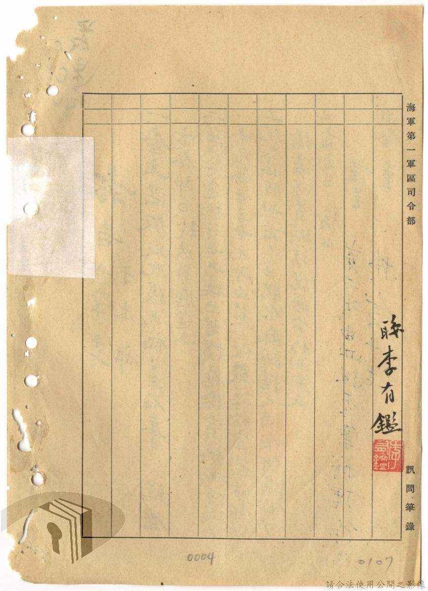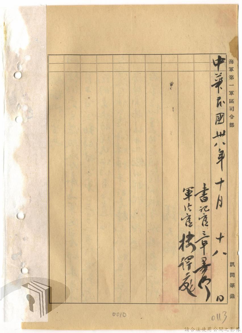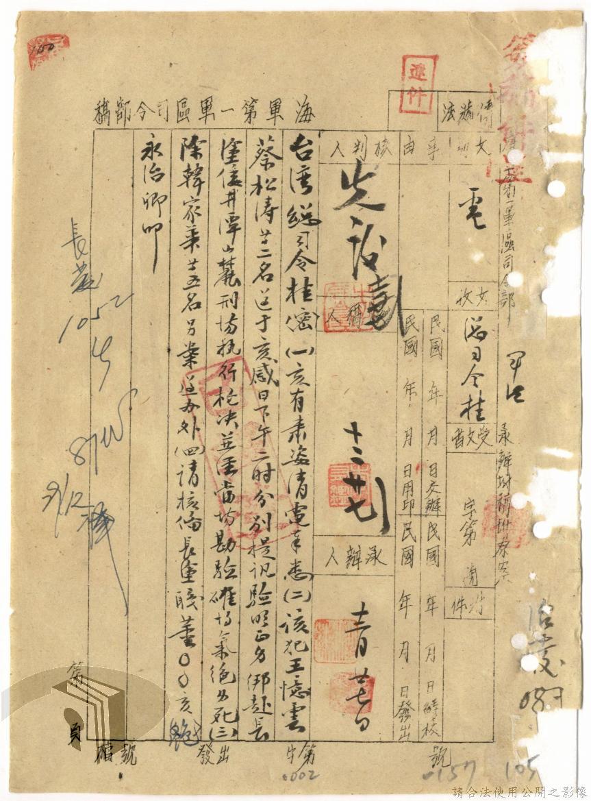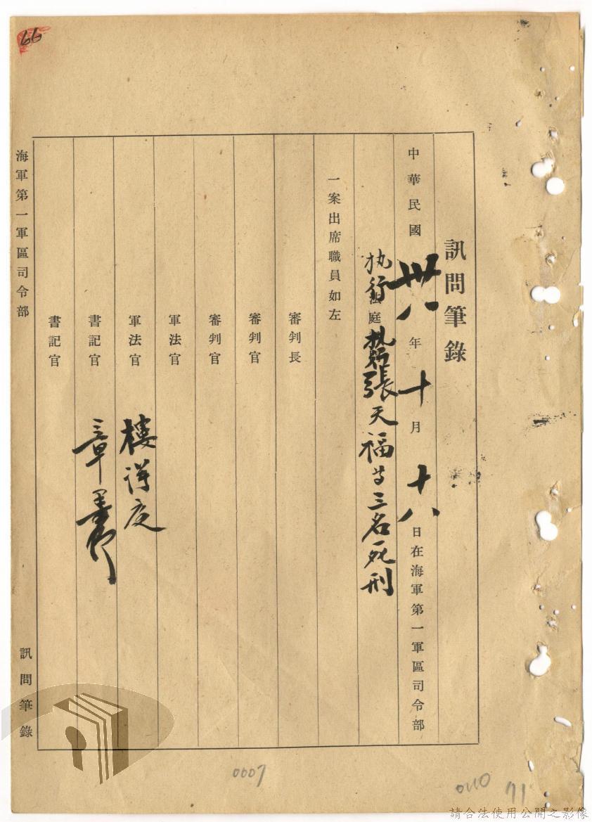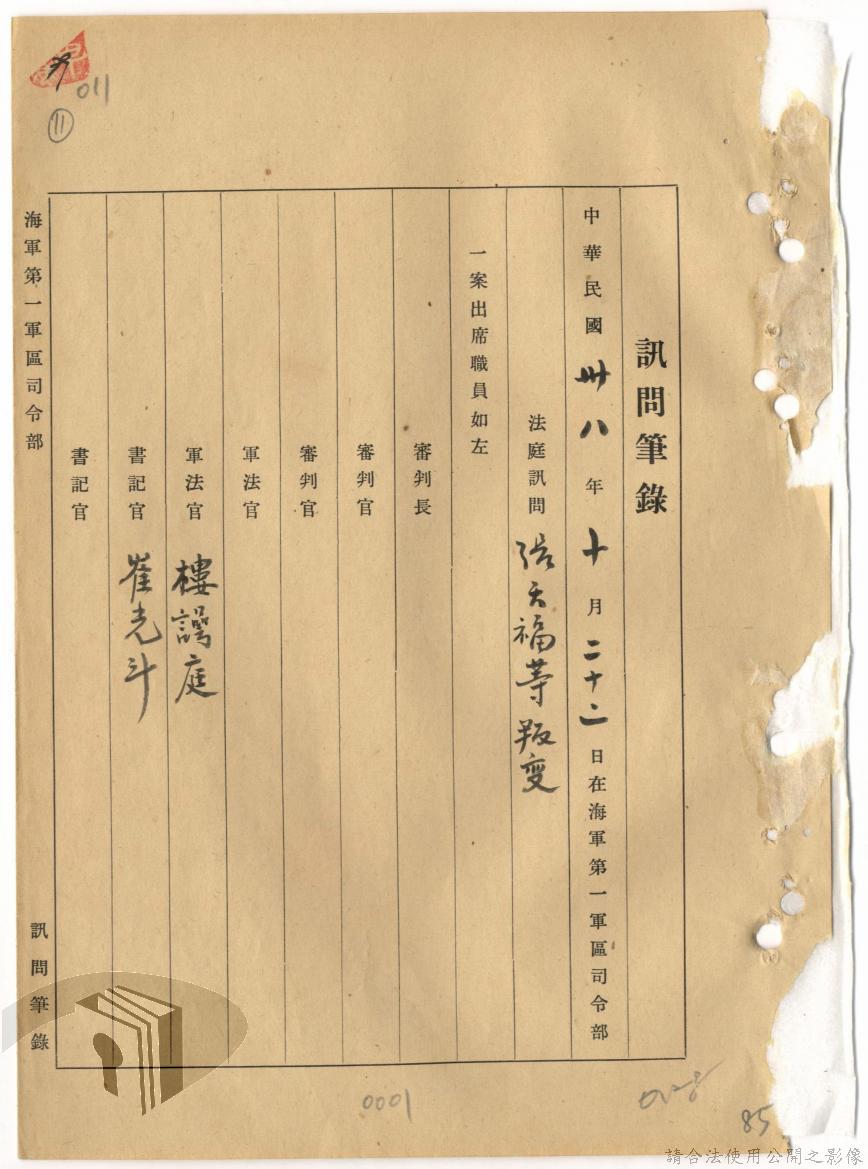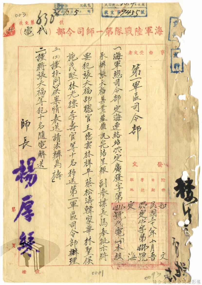 本案為38至39年間,海軍總司令部定海聯絡站、海軍陸戰隊第一師司令部將涉案軍人及相關資料移送第一軍區司令部審理,第一軍區司令部後依照海軍總司令部的指示對部分當事人執行相關手續,並對其他涉案人作出判決。附訊問筆錄、點名單、判決書等文件資料。