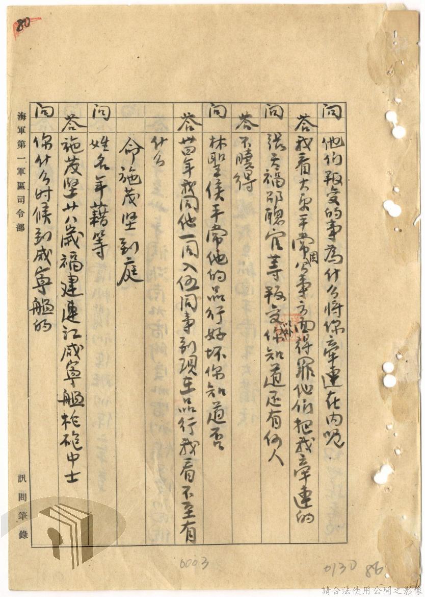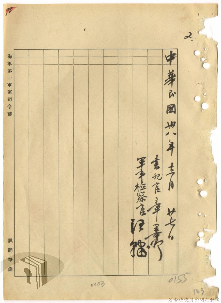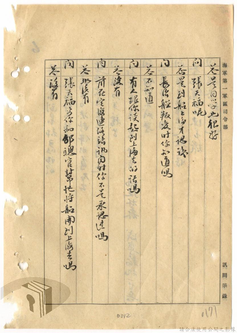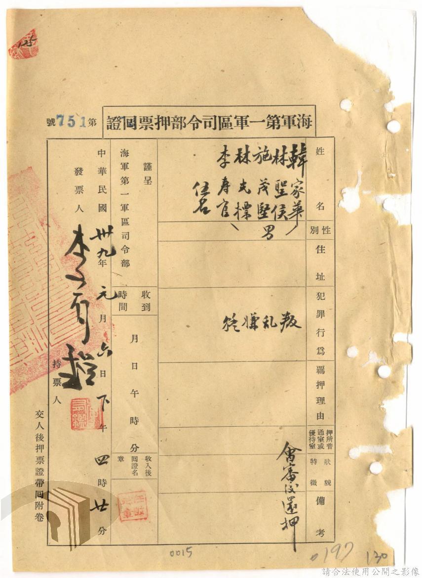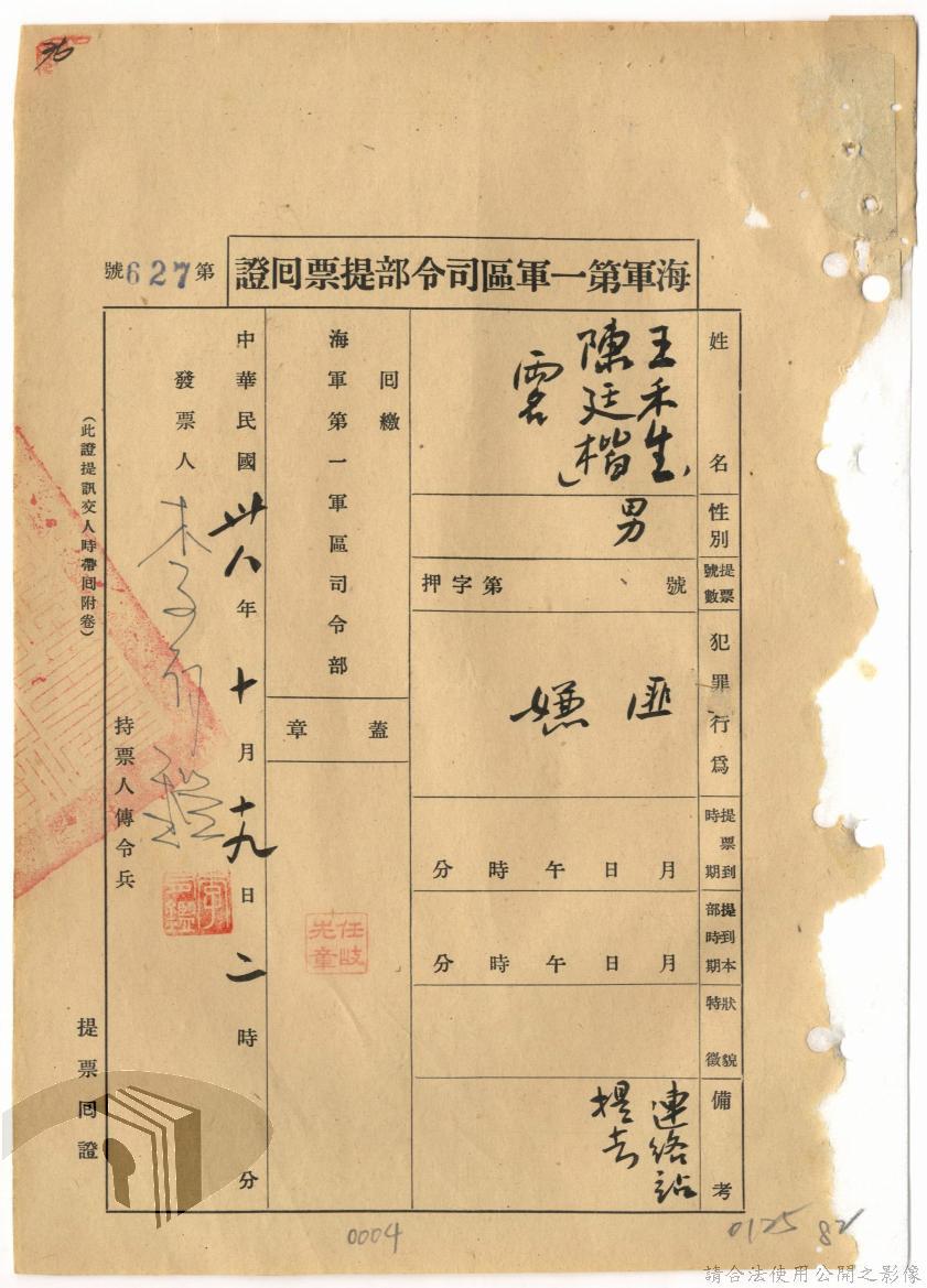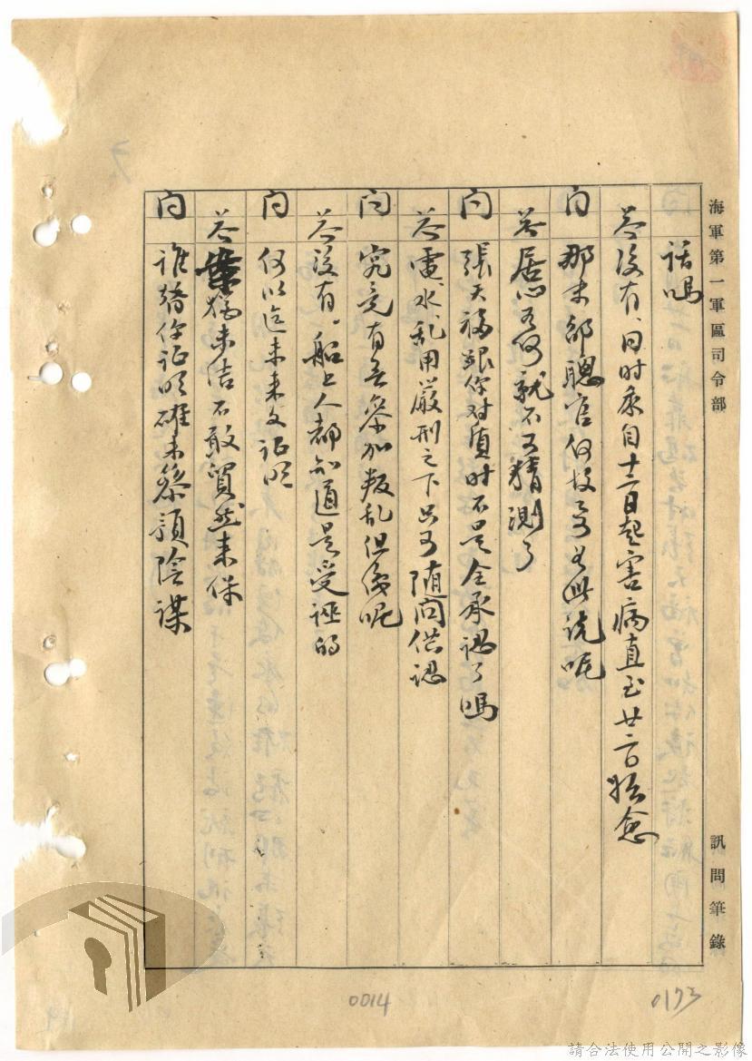 本案為38至39年間,海軍總司令部定海聯絡站、海軍陸戰隊第一師司令部將涉案軍人及相關資料移送第一軍區司令部審理,第一軍區司令部後依照海軍總司令部的指示對部分當事人執行相關手續,並對其他涉案人作出判決。附訊問筆錄、點名單、判決書等文件資料。