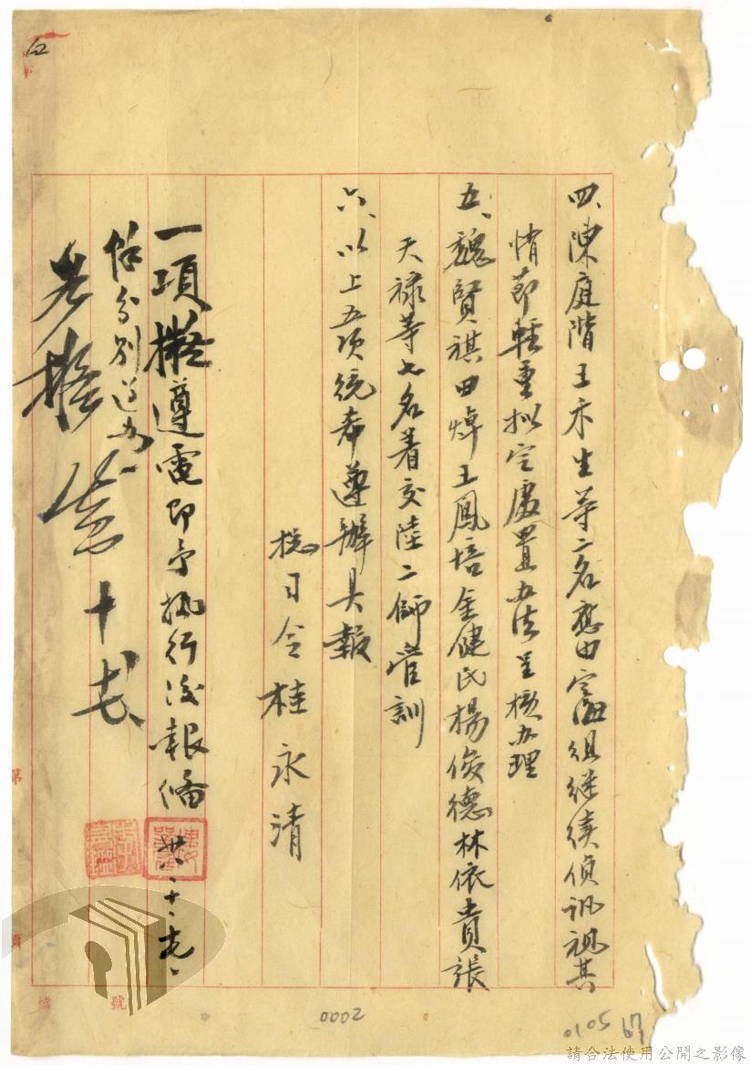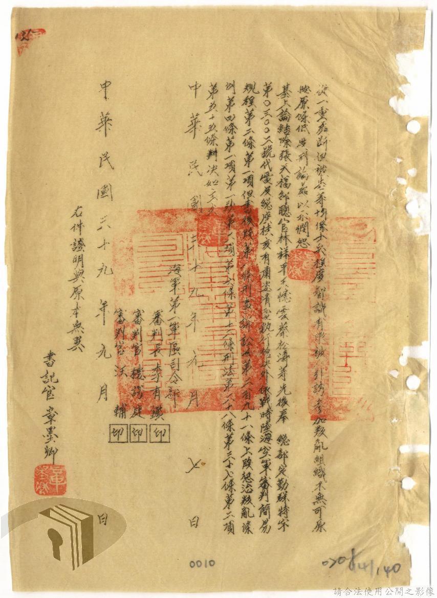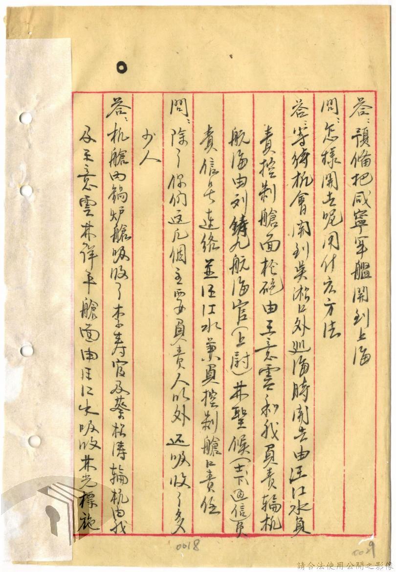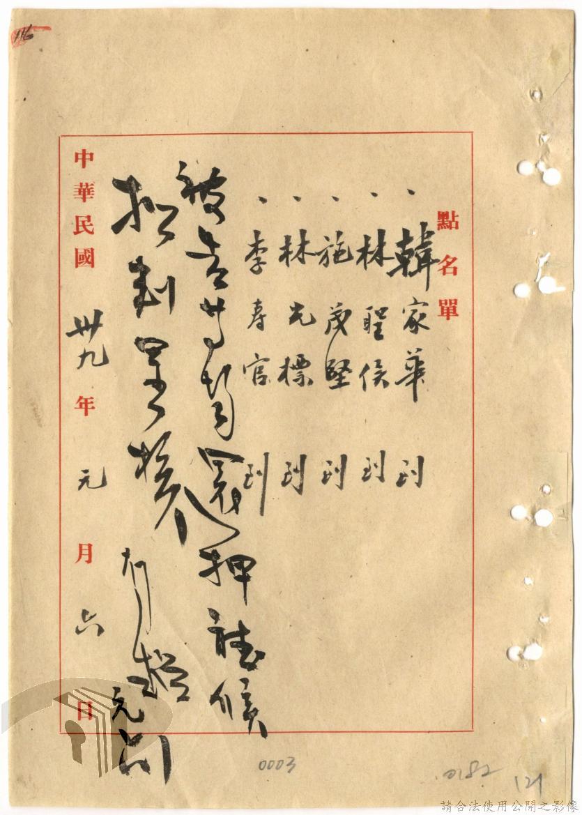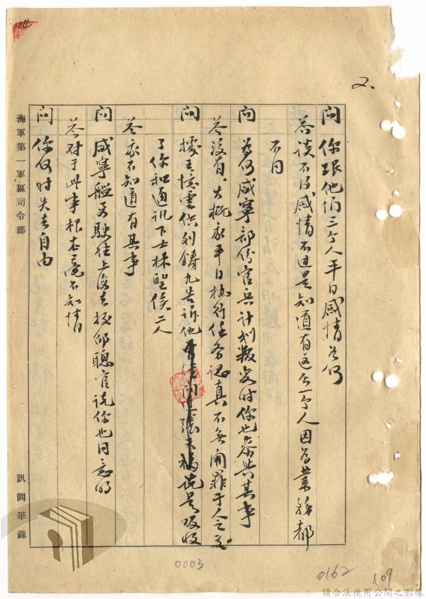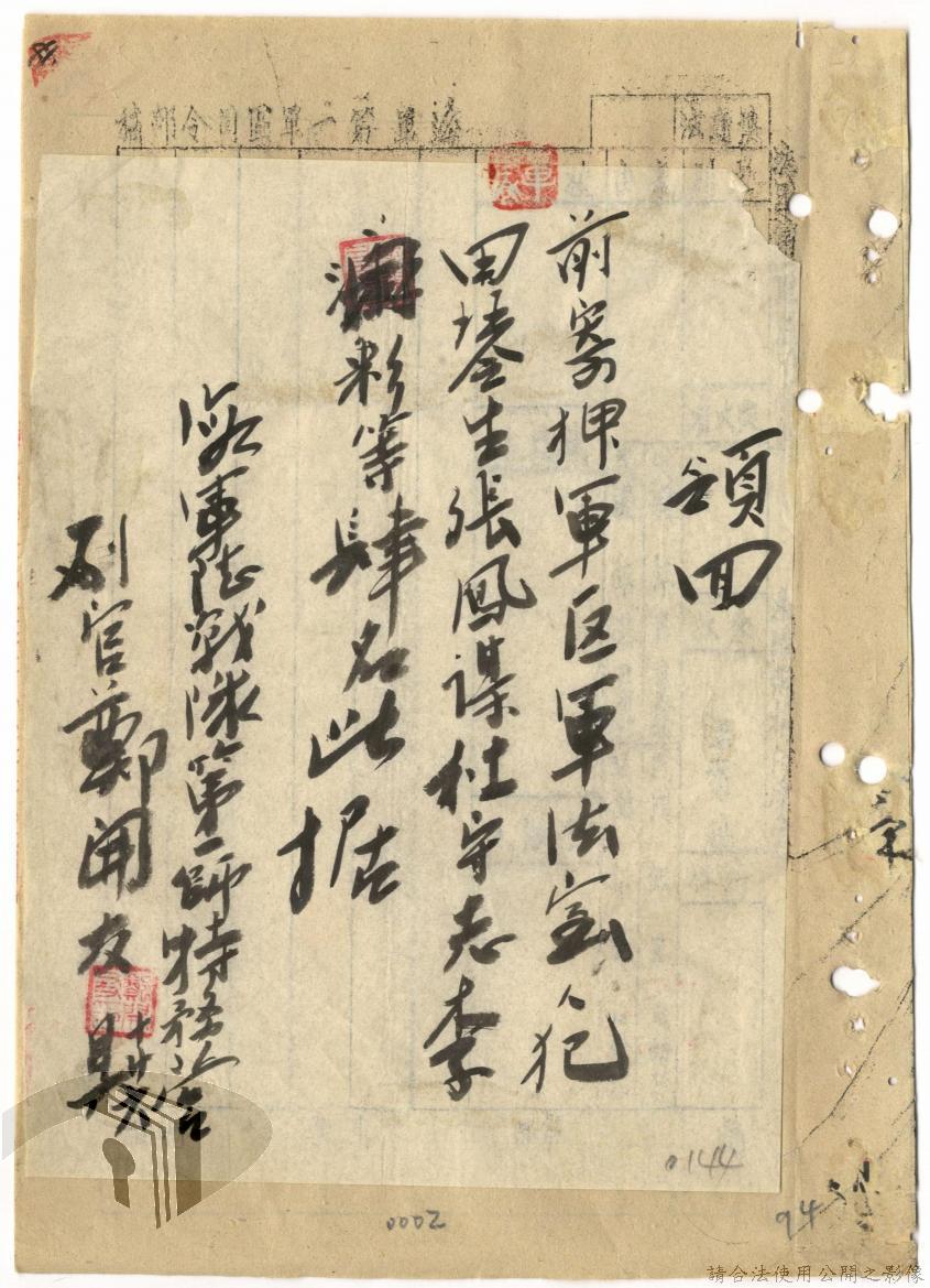 本案為38至39年間,海軍總司令部定海聯絡站、海軍陸戰隊第一師司令部將涉案軍人及相關資料移送第一軍區司令部審理,第一軍區司令部後依照海軍總司令部的指示對部分當事人執行相關手續,並對其他涉案人作出判決。附訊問筆錄、點名單、判決書等文件資料。