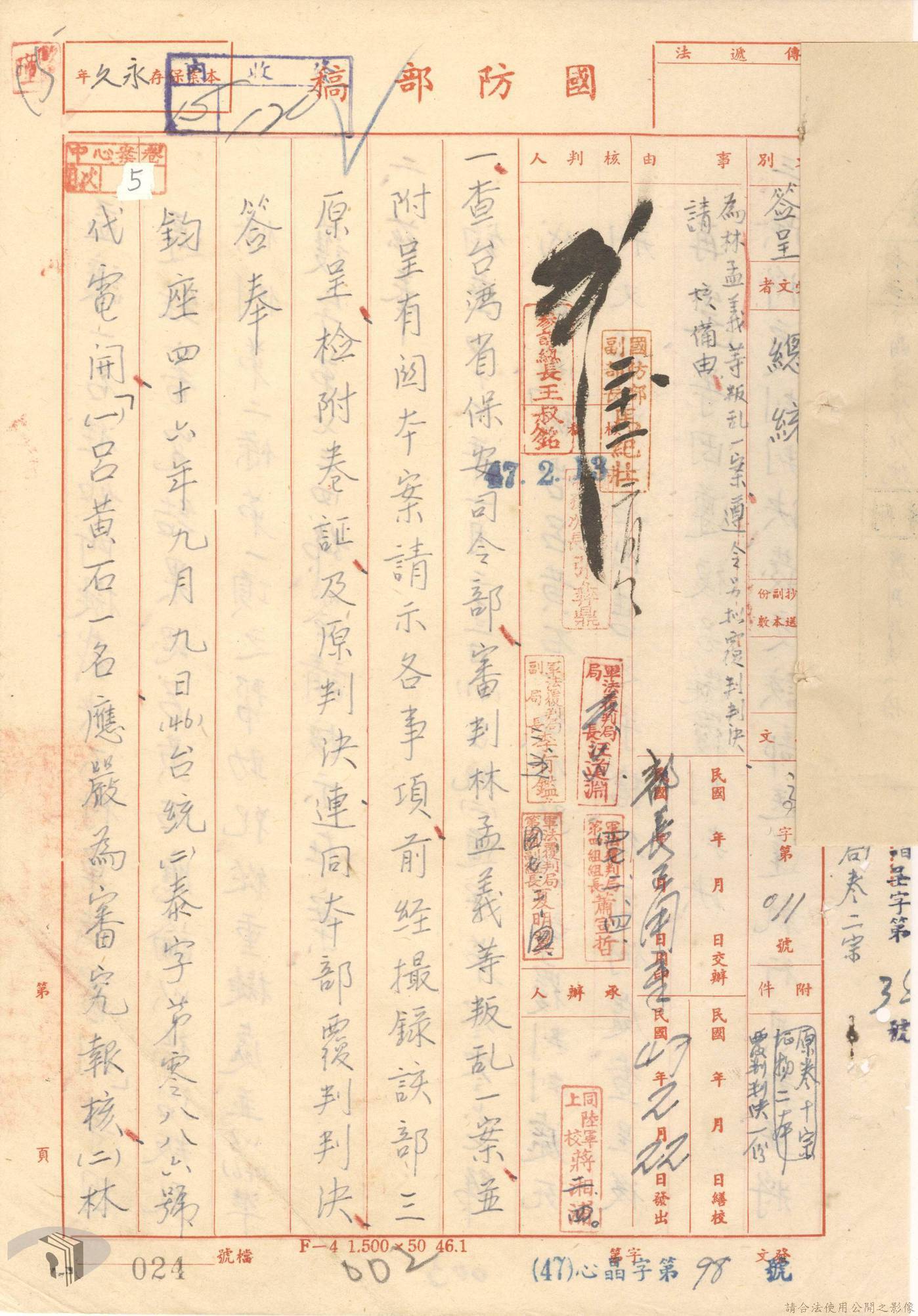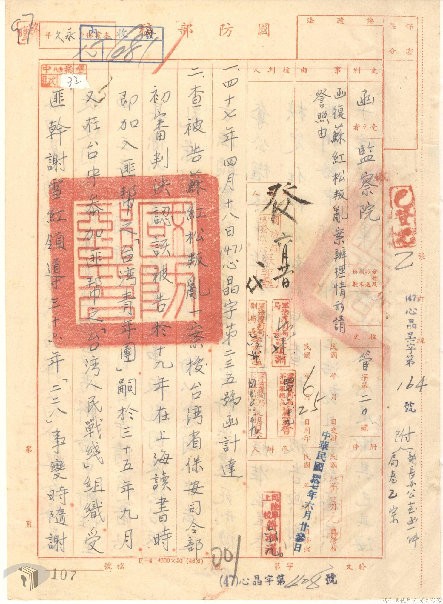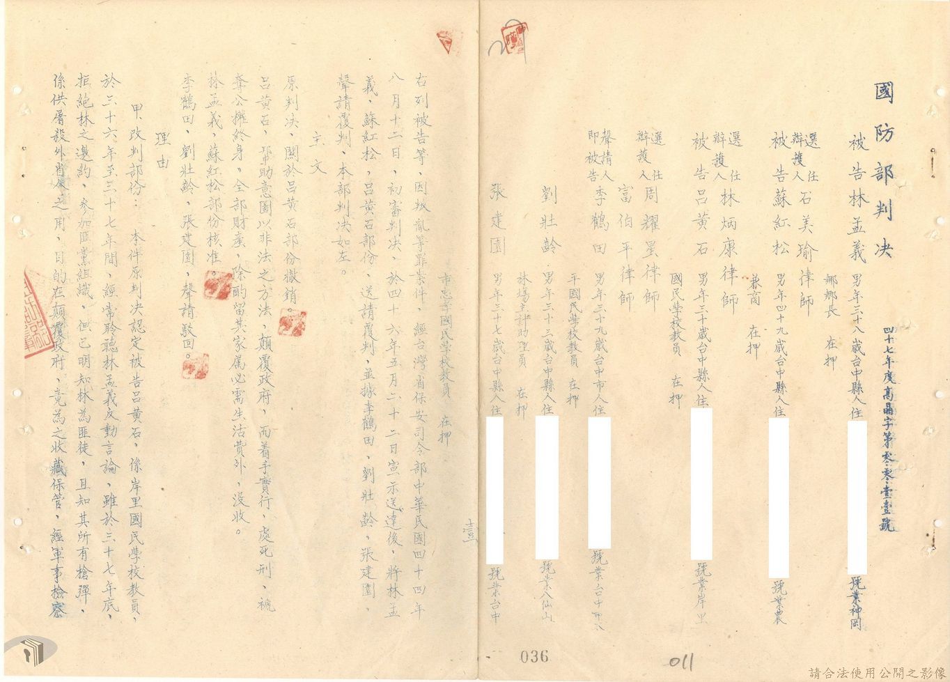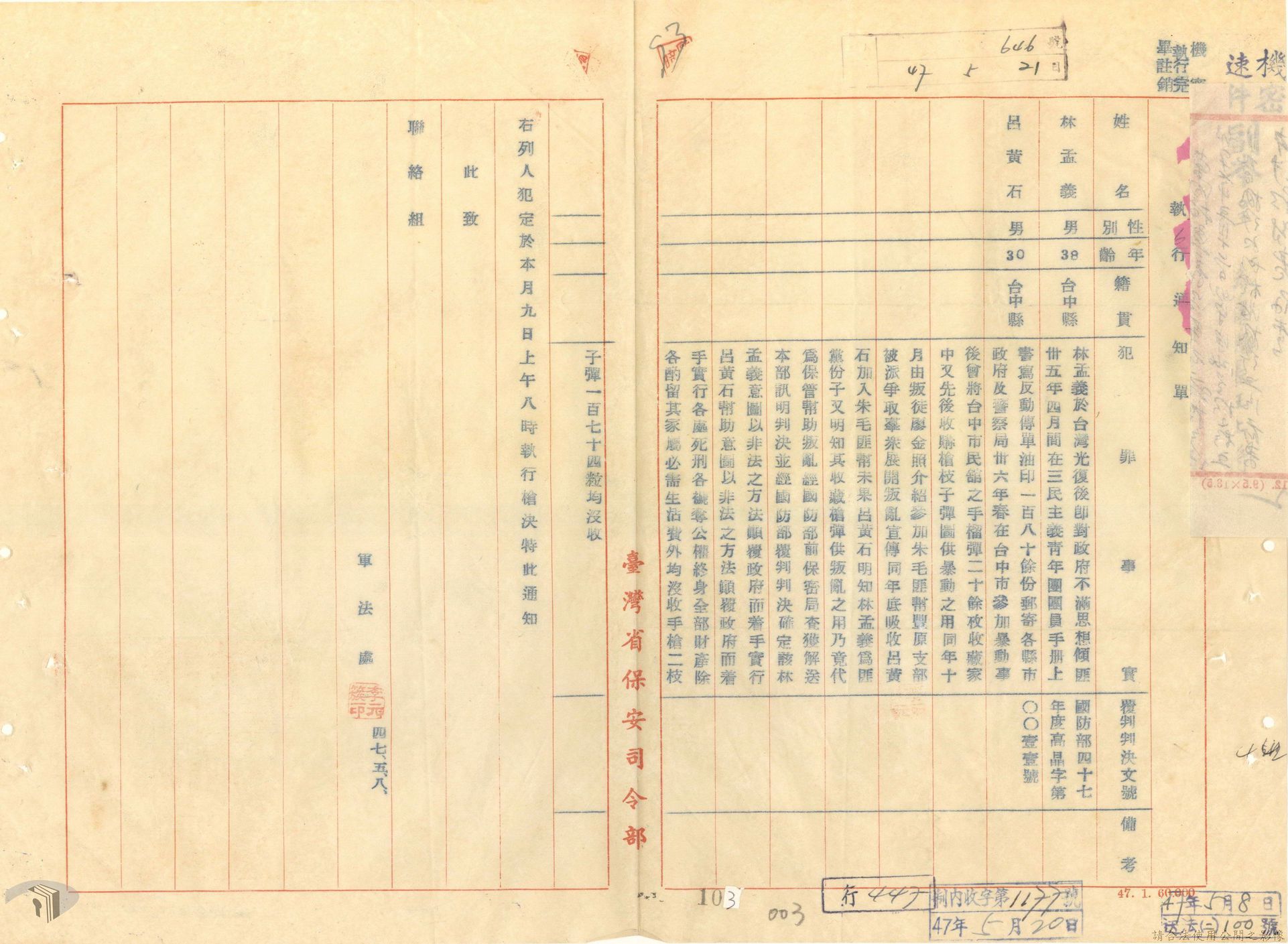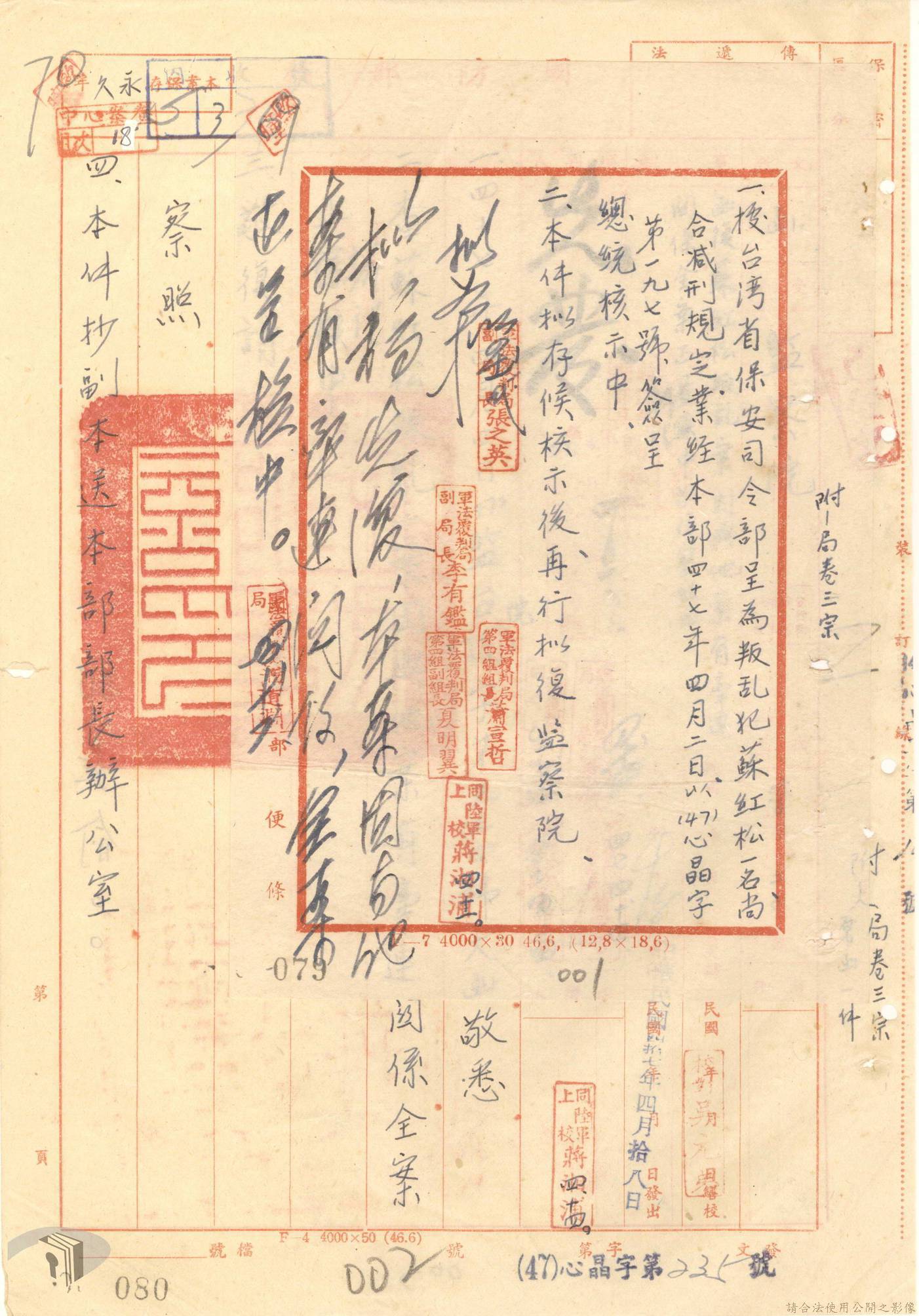本案為44至48年間,原臺中縣神岡鄉鄉長等8人被臺灣省保安司令部軍事檢察官提起公訴,並被軍法合議庭判決有罪後之案情後續發展與處理情形。內容包括臺灣省保安司令部向參謀總長說明案情摘要,參謀總長復轉請總統表示意見、臺灣省保安司令部對衍生其他人員疑似涉入相關案件之事展開後續偵辦並建請參謀總長同意暫緩執行判決刑度、被告家屬陳情希望能獲再審機會、國防部軍法覆判局對部分被告之原審結果是否覆判加以評議、執行部分受刑人之判決、國防部對部分被告展開再審作業並判決等事項。本案包括臺灣省保安司令部判決、臺灣省保安司令部不付軍法審判裁決書、臺灣省保安司令部聲請書、國防部評議筆錄、國防部判決正本、臺灣省保安司令部軍事檢察官意見書等文件。