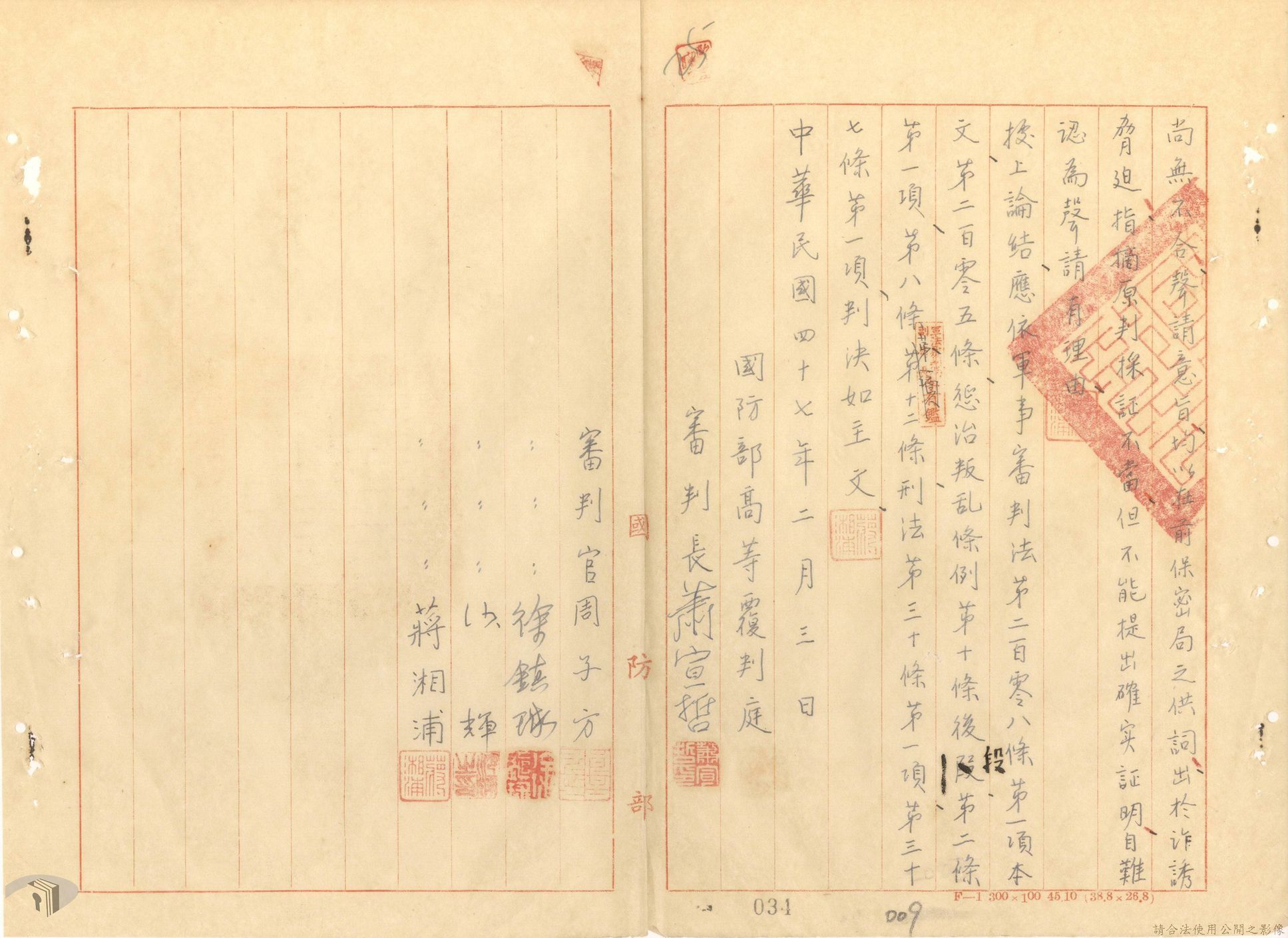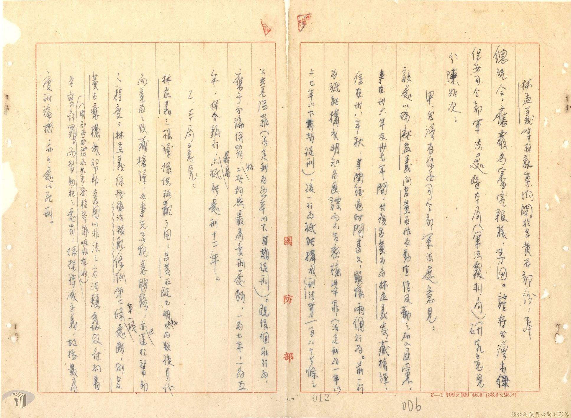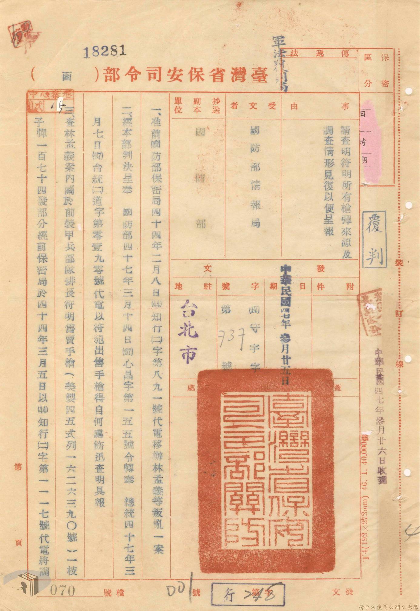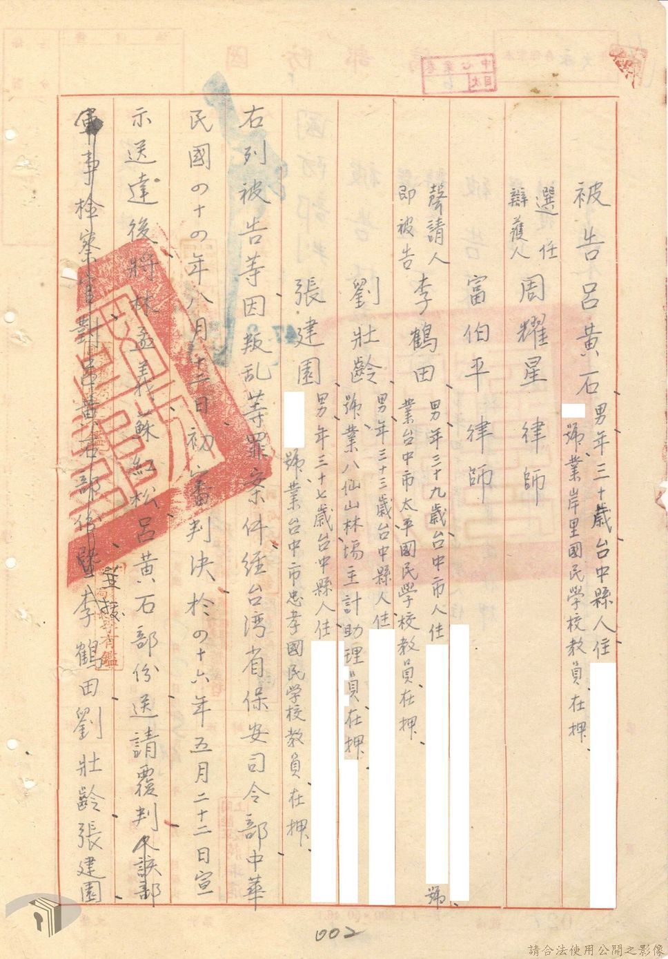 本案為44至48年間,原臺中縣神岡鄉鄉長等8人被臺灣省保安司令部軍事檢察官提起公訴,並被軍法合議庭判決有罪後之案情後續發展與處理情形。內容包括臺灣省保安司令部向參謀總長說明案情摘要,參謀總長復轉請總統表示意見、臺灣省保安司令部對衍生其他人員疑似涉入相關案件之事展開後續偵辦並建請參謀總長同意暫緩執行判決刑度、被告家屬陳情希望能獲再審機會、國防部軍法覆判局對部分被告之原審結果是否覆判加以評議、執行部分受刑人之判決、國防部對部分被告展開再審作業並判決等事項。本案包括臺灣省保安司令部判決、臺灣省保安司令部不付軍法審判裁決書、臺灣省保安司令部聲請書、國防部評議筆錄、國防部判決正本、臺灣省保安司令部軍事檢察官意見書等文件。