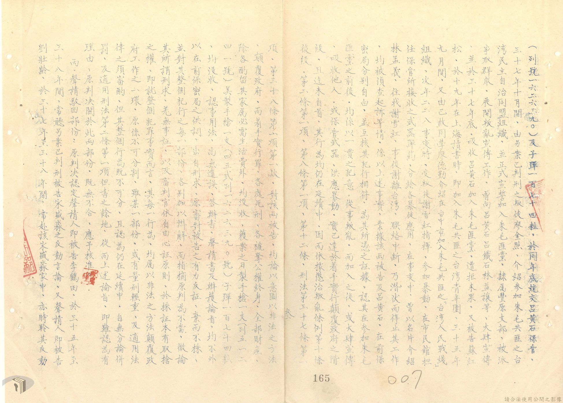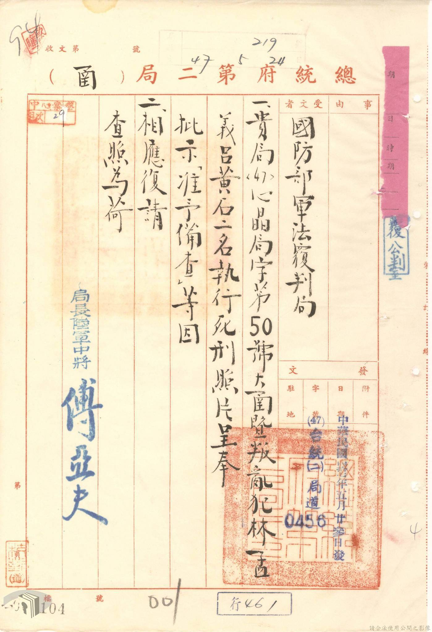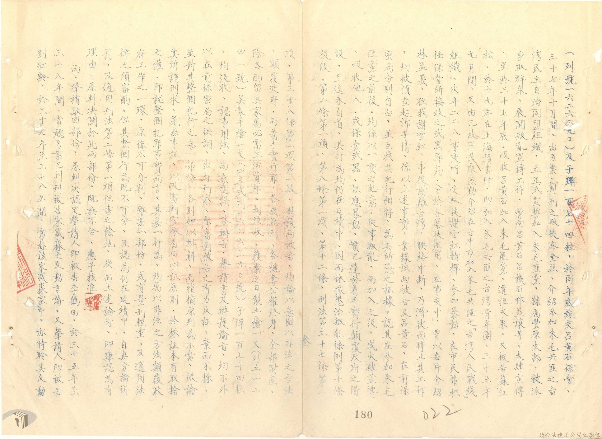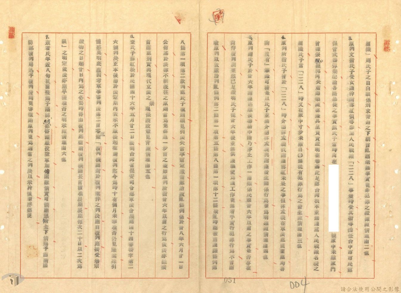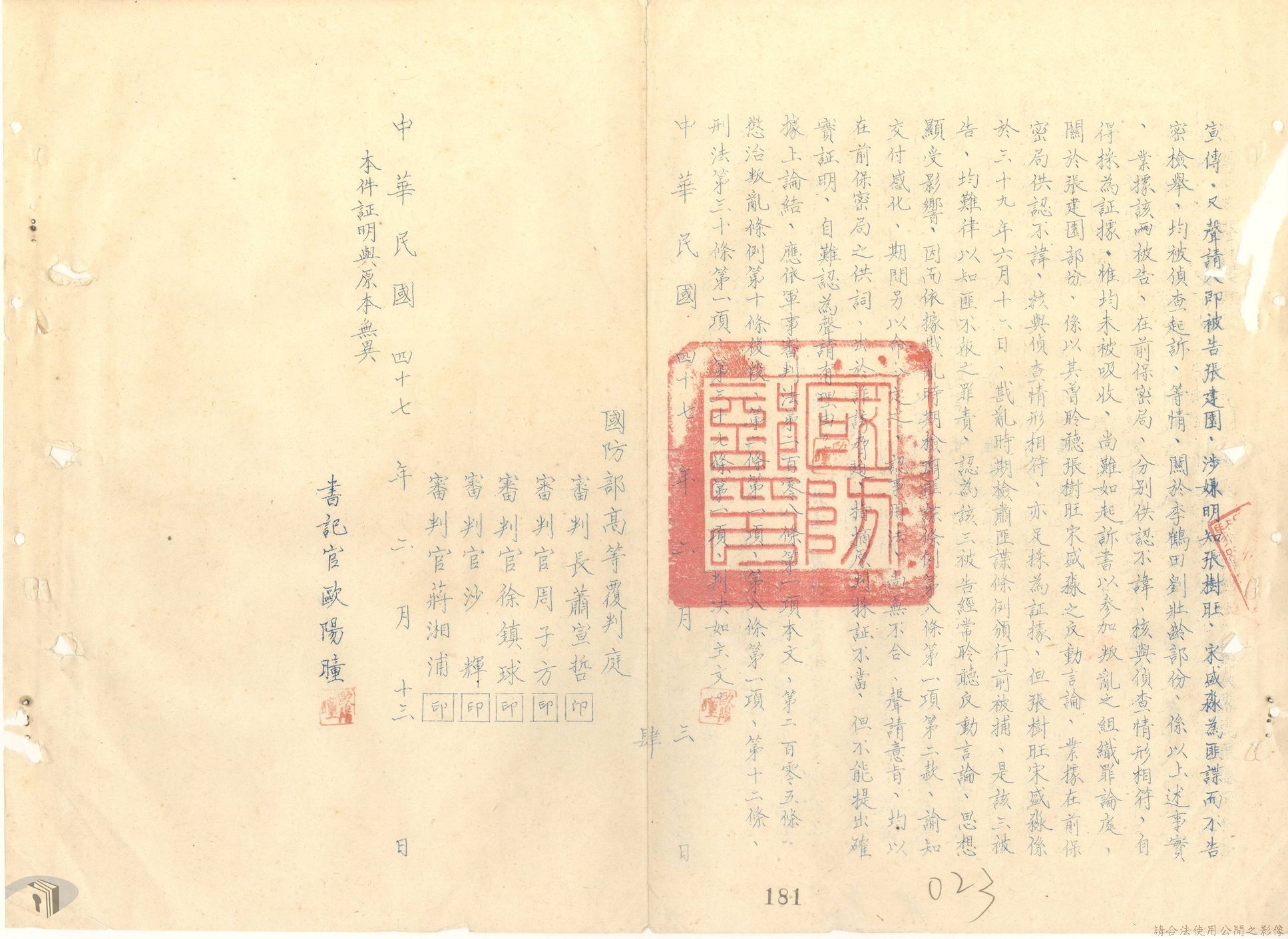 本案為44至48年間,原臺中縣神岡鄉鄉長等8人被臺灣省保安司令部軍事檢察官提起公訴,並被軍法合議庭判決有罪後之案情後續發展與處理情形。內容包括臺灣省保安司令部向參謀總長說明案情摘要,參謀總長復轉請總統表示意見、臺灣省保安司令部對衍生其他人員疑似涉入相關案件之事展開後續偵辦並建請參謀總長同意暫緩執行判決刑度、被告家屬陳情希望能獲再審機會、國防部軍法覆判局對部分被告之原審結果是否覆判加以評議、執行部分受刑人之判決、國防部對部分被告展開再審作業並判決等事項。本案包括臺灣省保安司令部判決、臺灣省保安司令部不付軍法審判裁決書、臺灣省保安司令部聲請書、國防部評議筆錄、國防部判決正本、臺灣省保安司令部軍事檢察官意見書等文件。