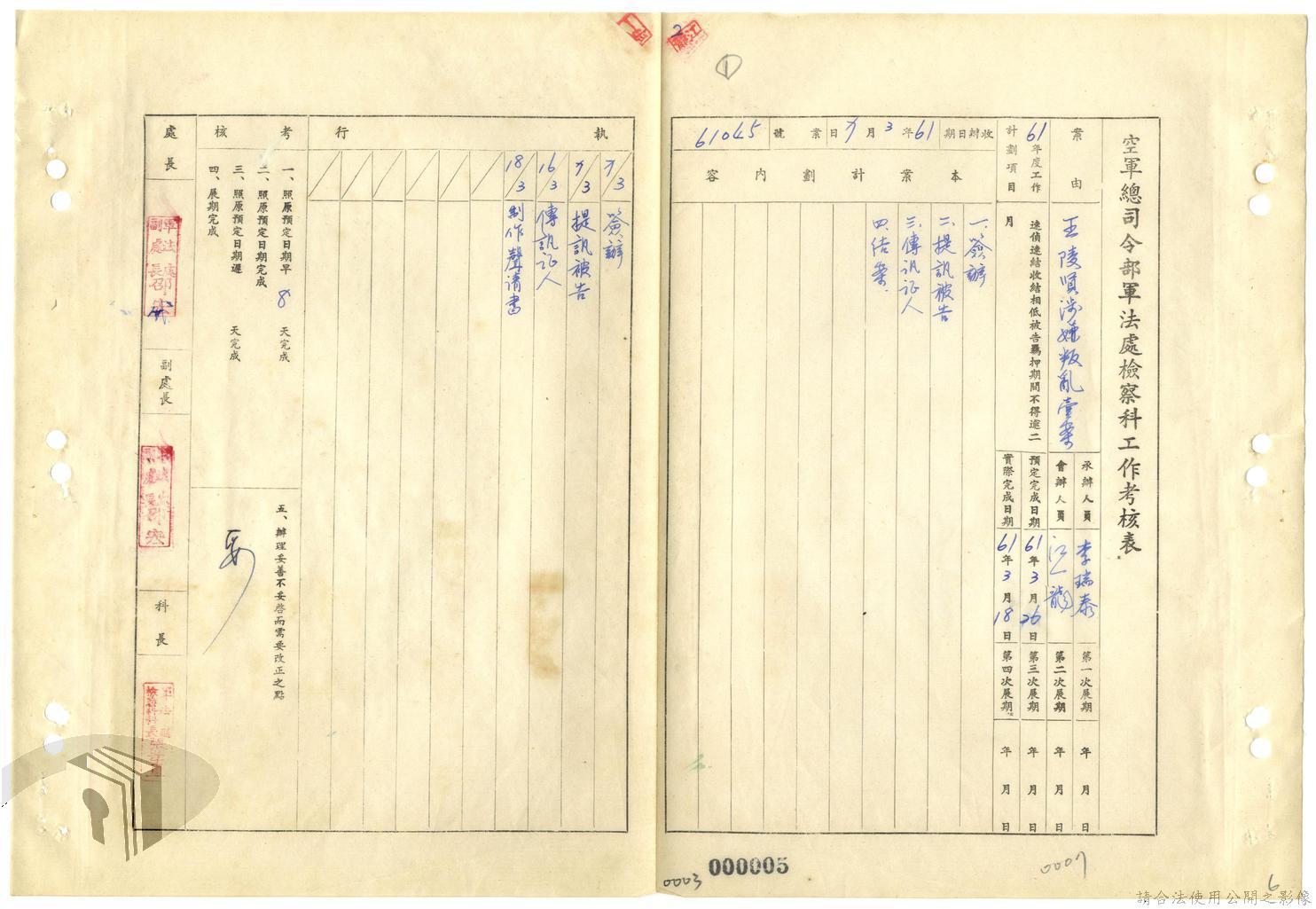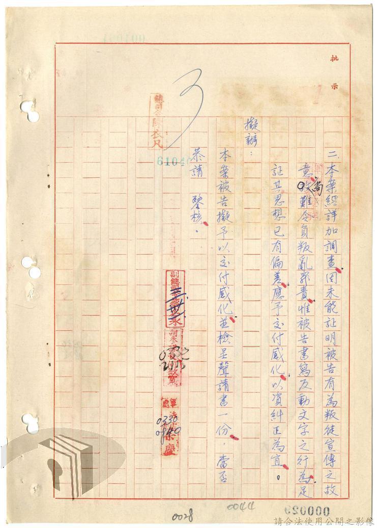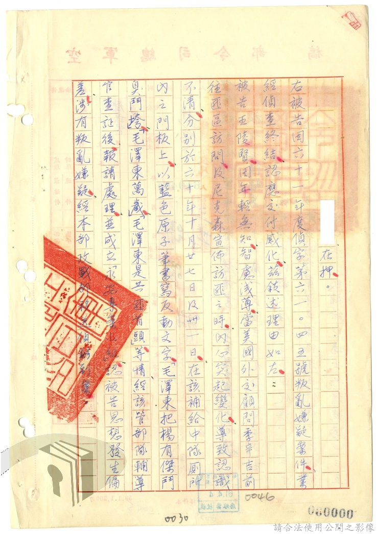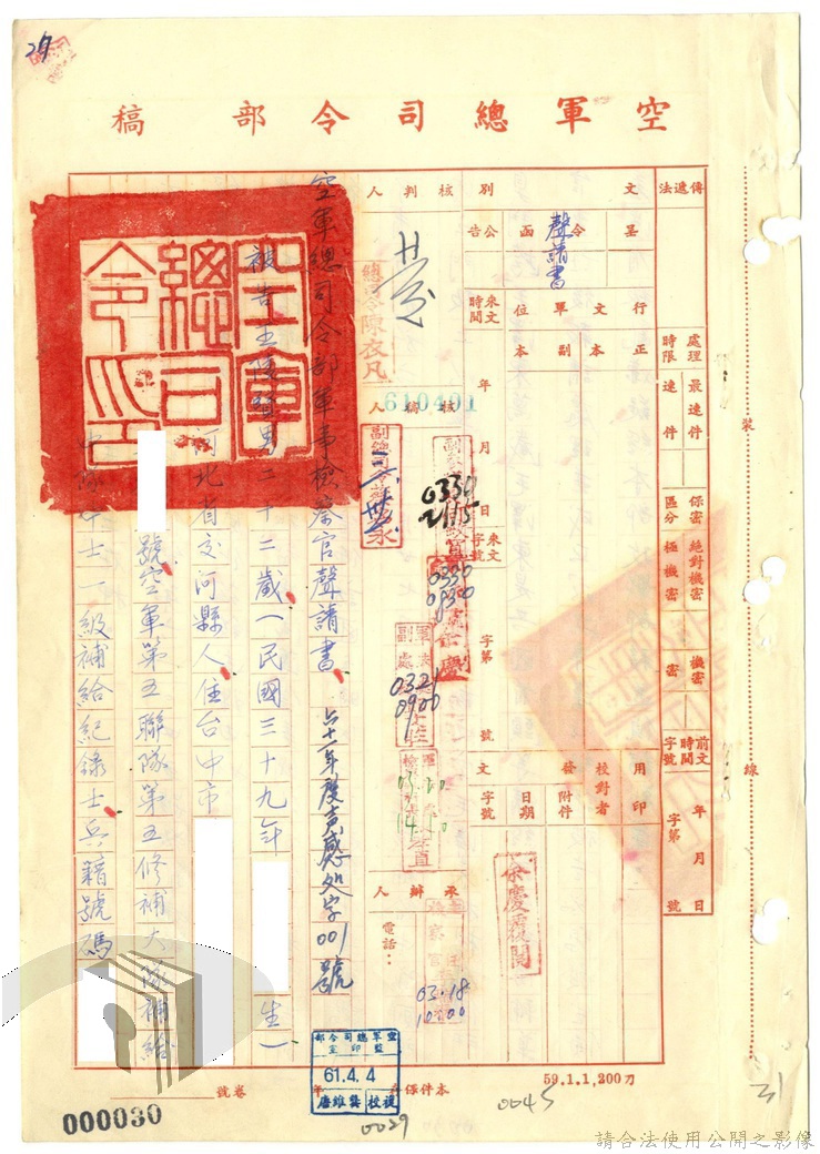 本案為61至64年間,空軍總司令部檢察官因為軍人書寫不妥文字的關係聲請將當事人交付感化,並獲該部裁定,該員後移送至臺灣省生產教育實驗所執行;臺灣警備總司令部檢送民眾所涉案件判決書給空總。附偵查筆錄、聲請書、裁定書、判決書等文件資料。
