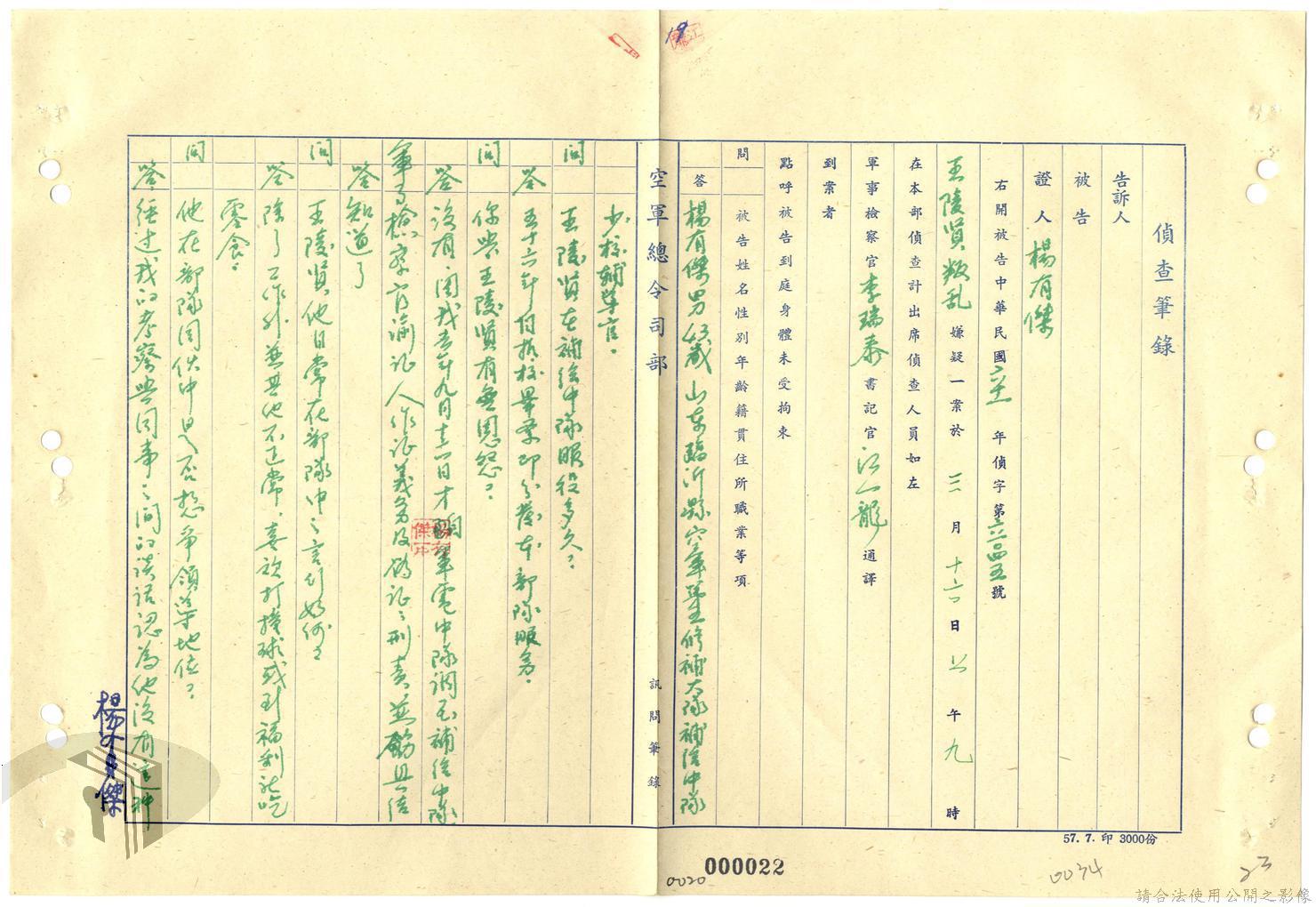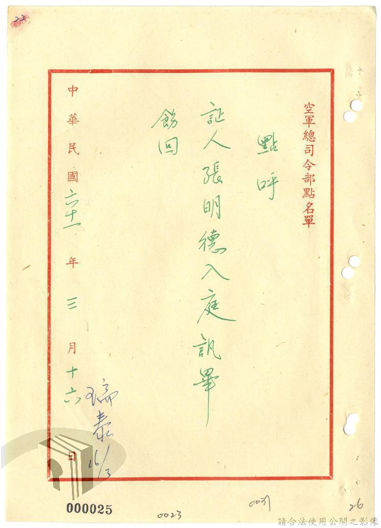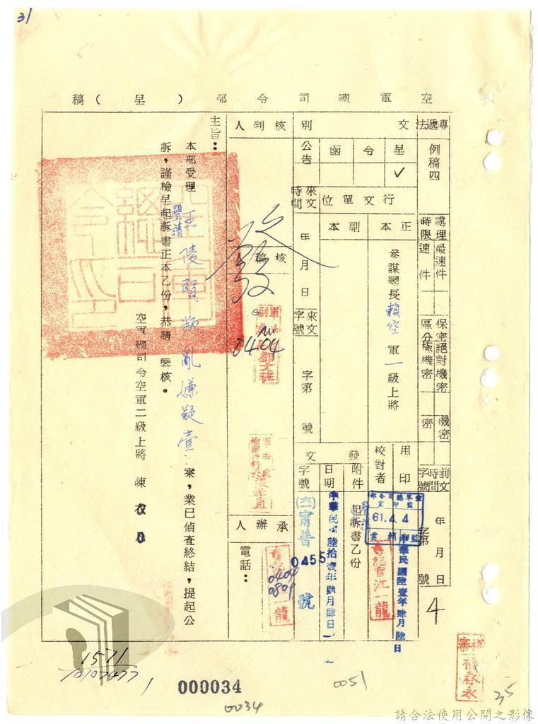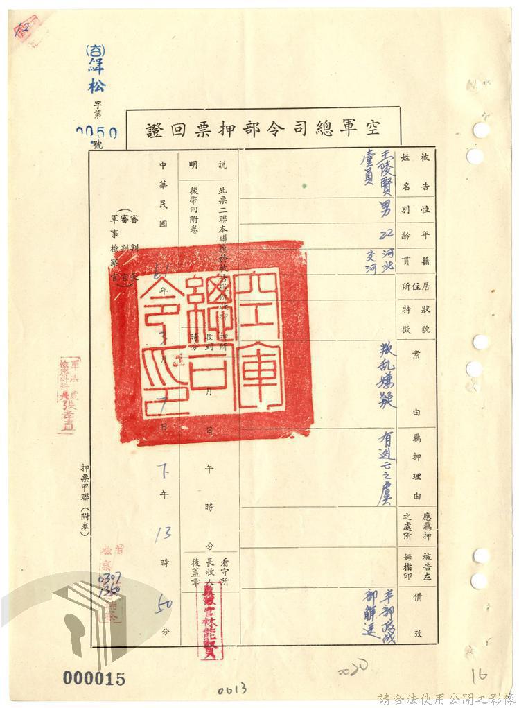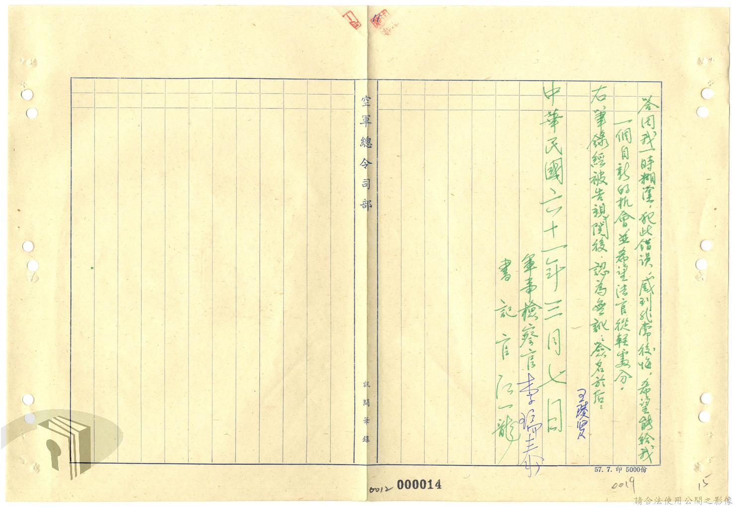 本案為61至64年間,空軍總司令部檢察官因為軍人書寫不妥文字的關係聲請將當事人交付感化,並獲該部裁定,該員後移送至臺灣省生產教育實驗所執行;臺灣警備總司令部檢送民眾所涉案件判決書給空總。附偵查筆錄、聲請書、裁定書、判決書等文件資料。