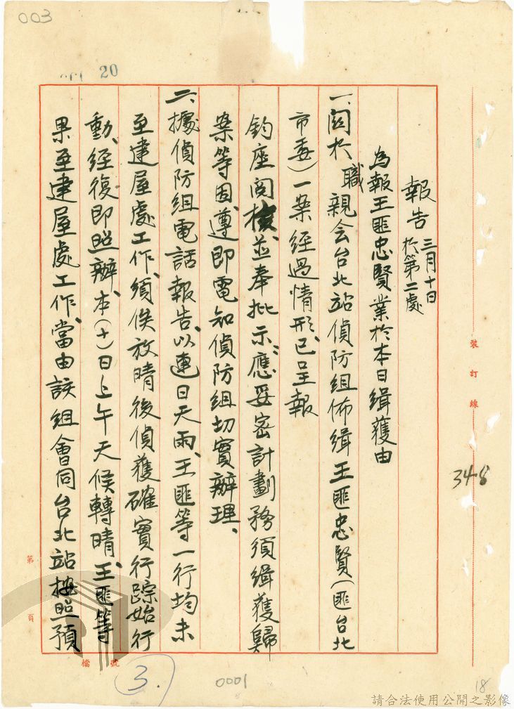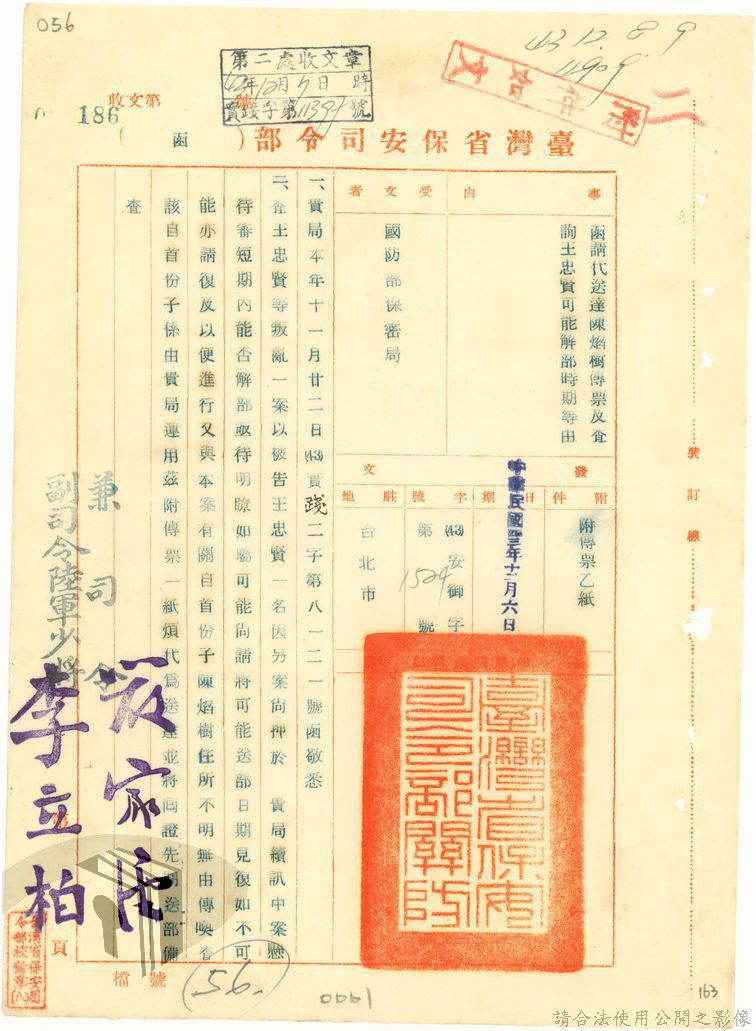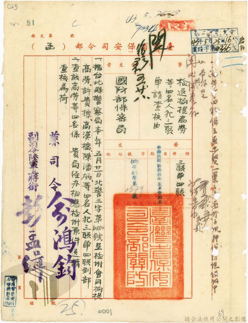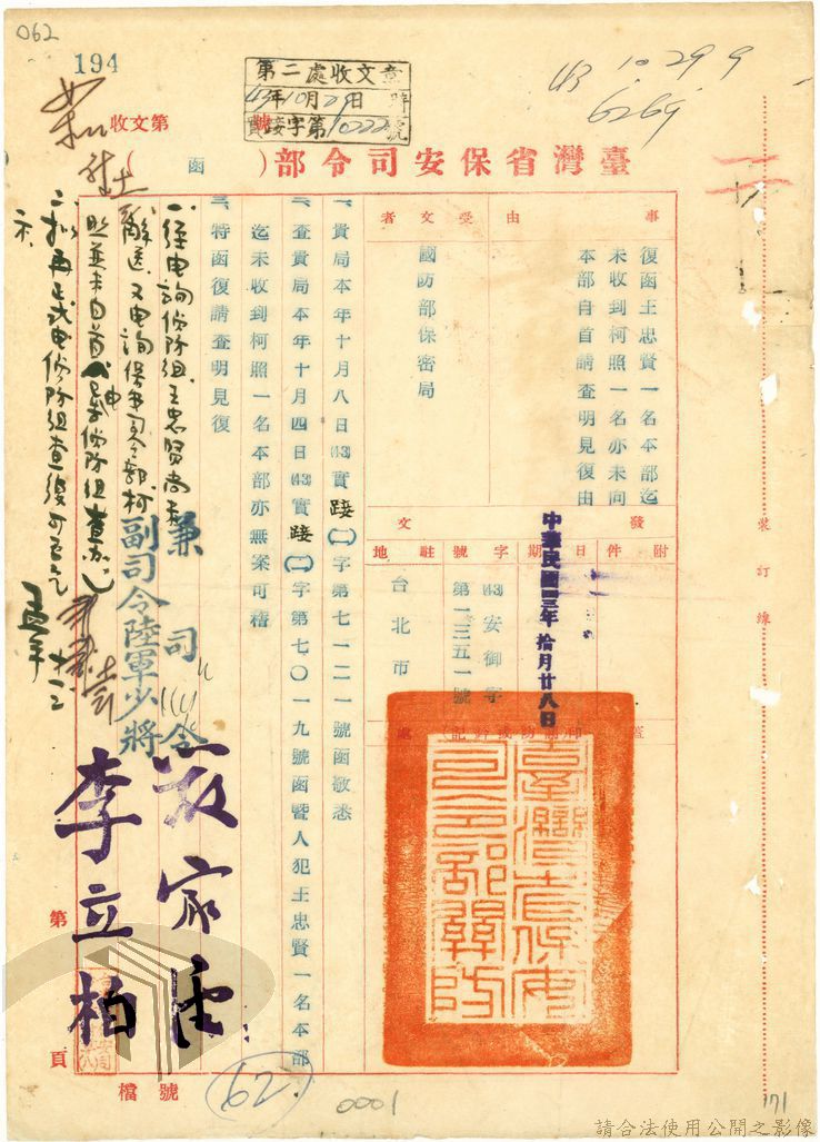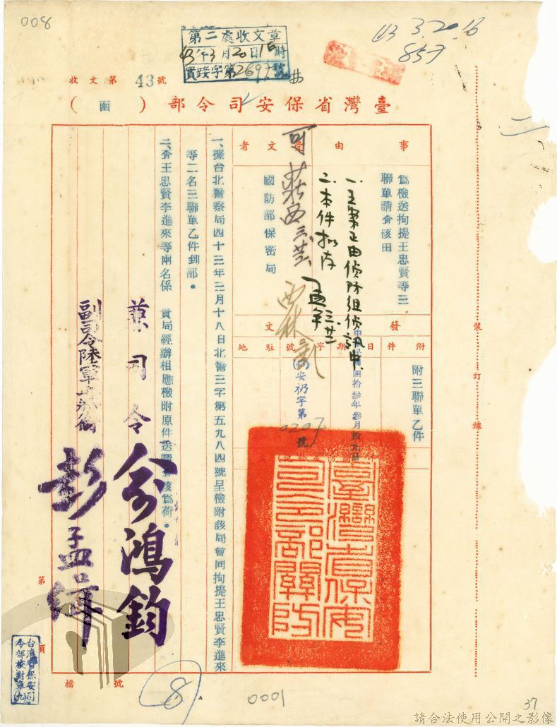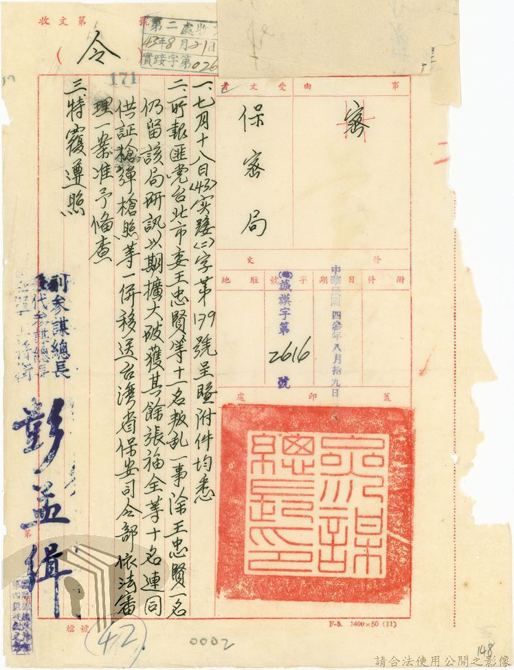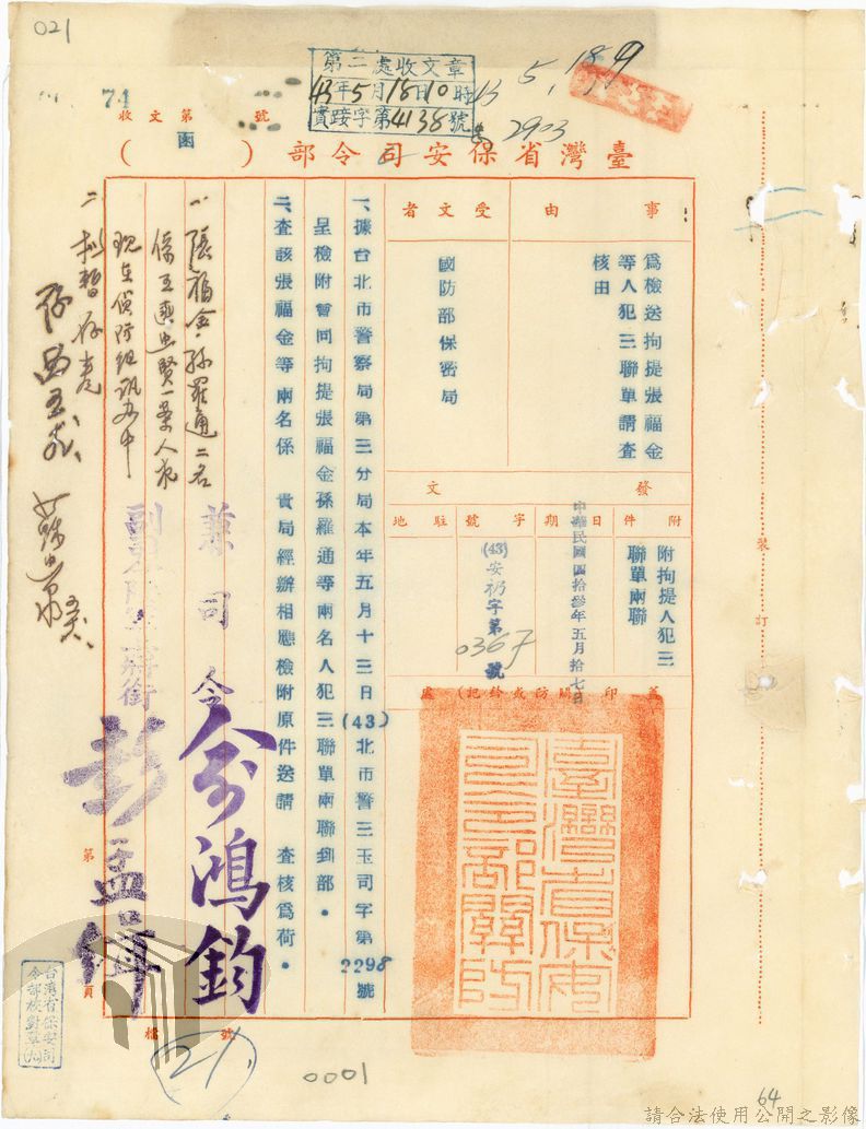 本案為43至47年間,國防部保密局所屬人員為偵辦民眾所涉案件而向上級長官及相關人員報告偵查情形,臺灣省保安司令部亦會同該局及警局人員緝拿嫌疑人,保密局則向總統府機要室資料組、國防部陳報偵辦進度,當事人經該局訊問完畢後,移送保安司令部審判。附訊問筆錄、醫師證明書等文件資料。